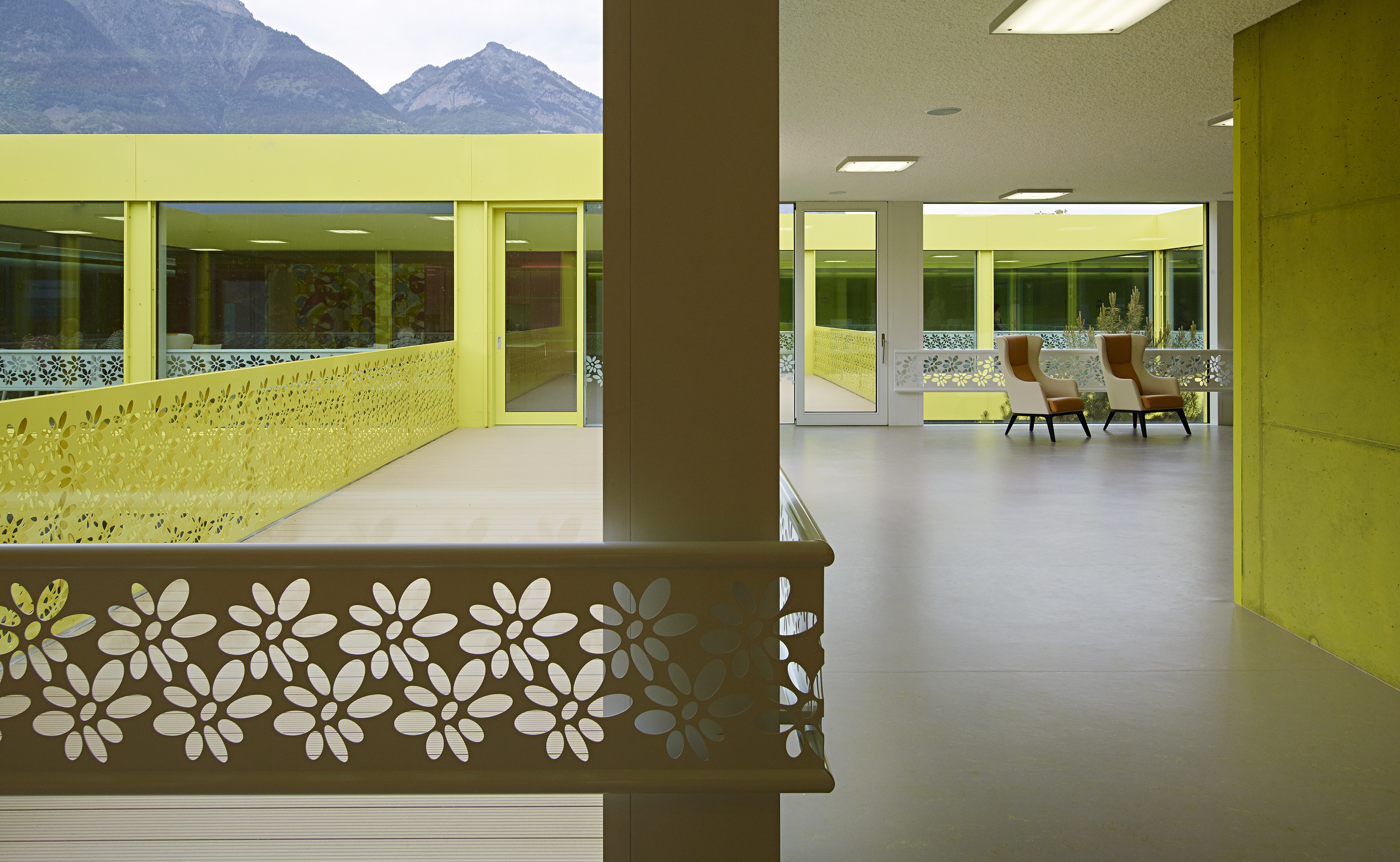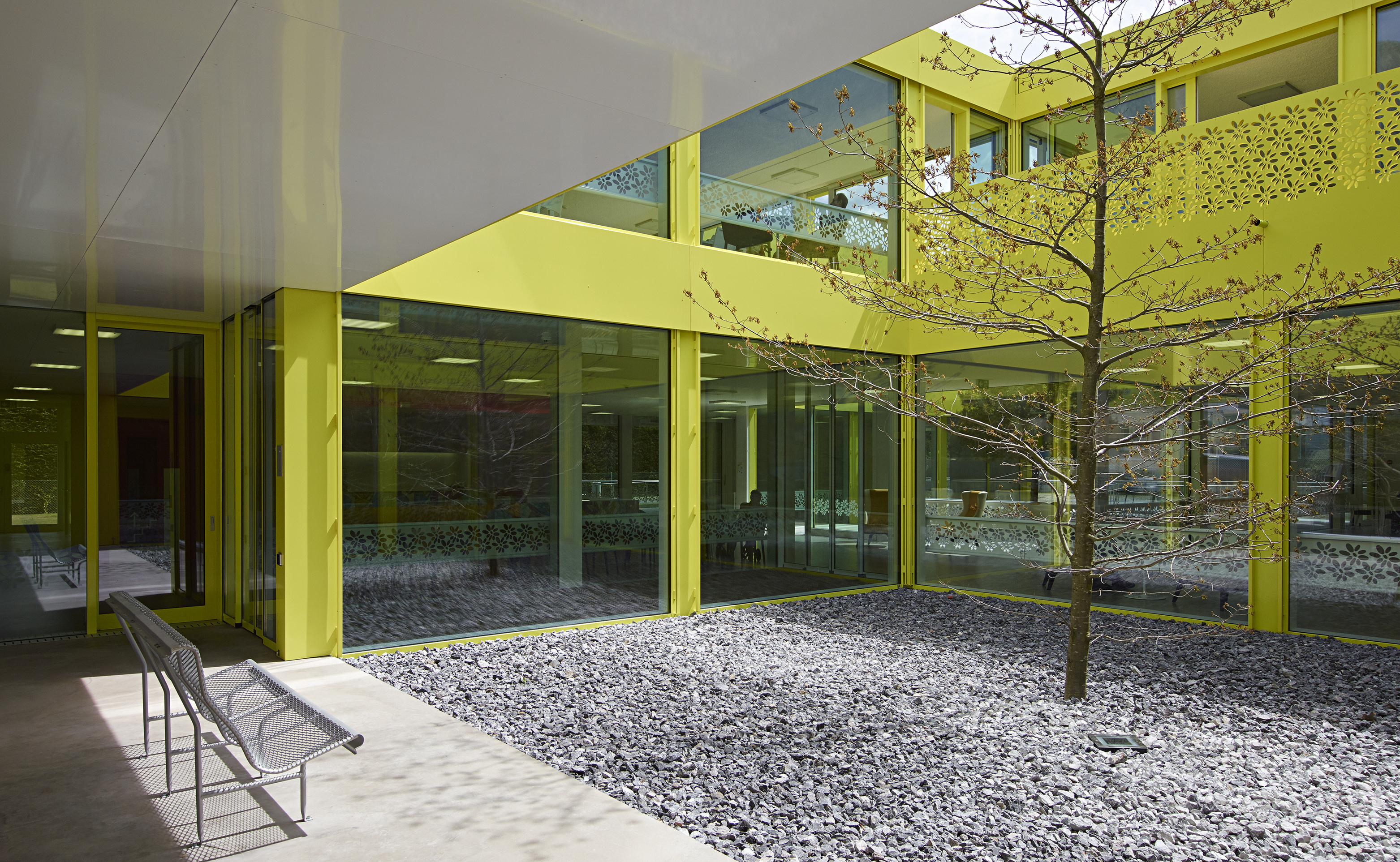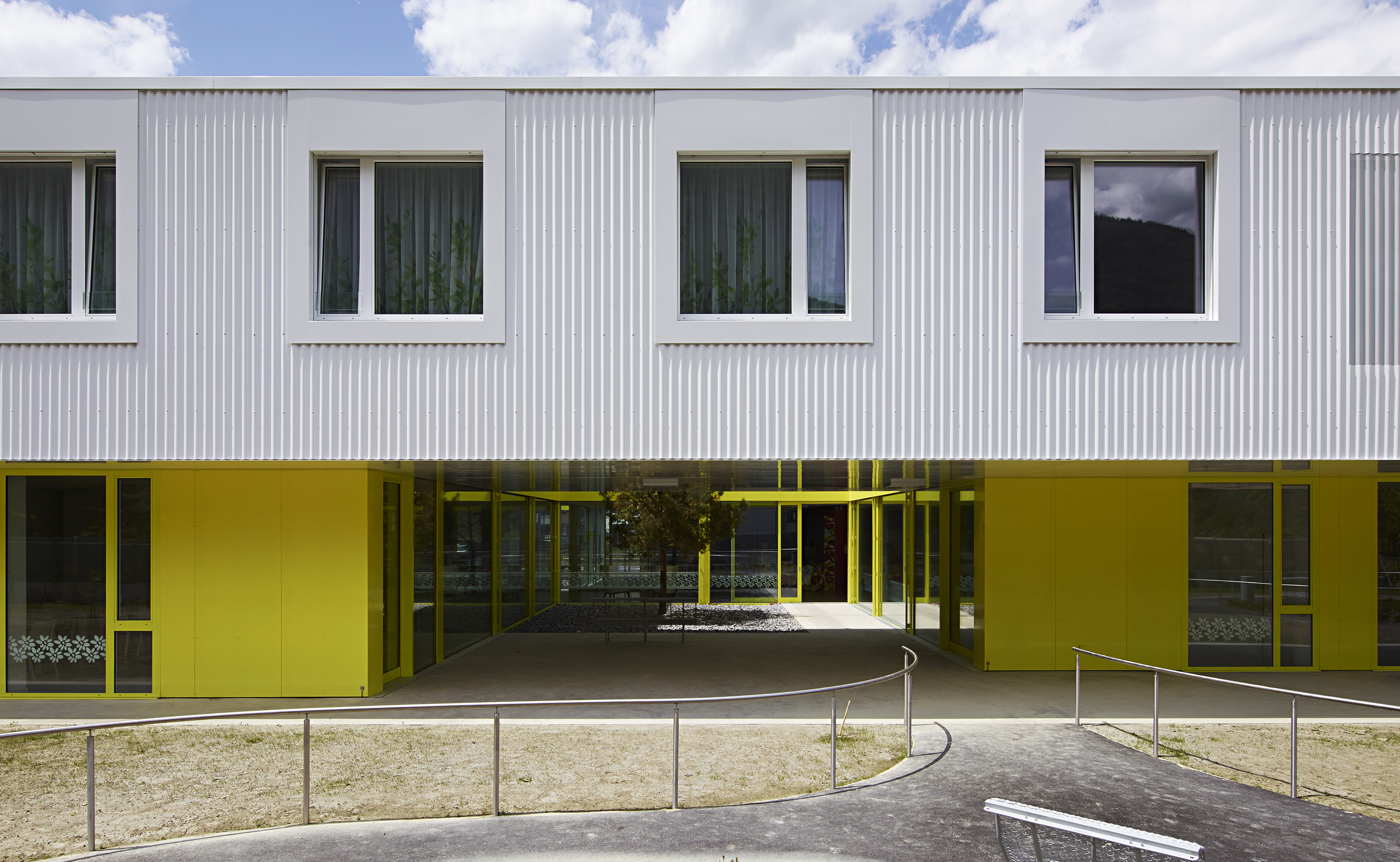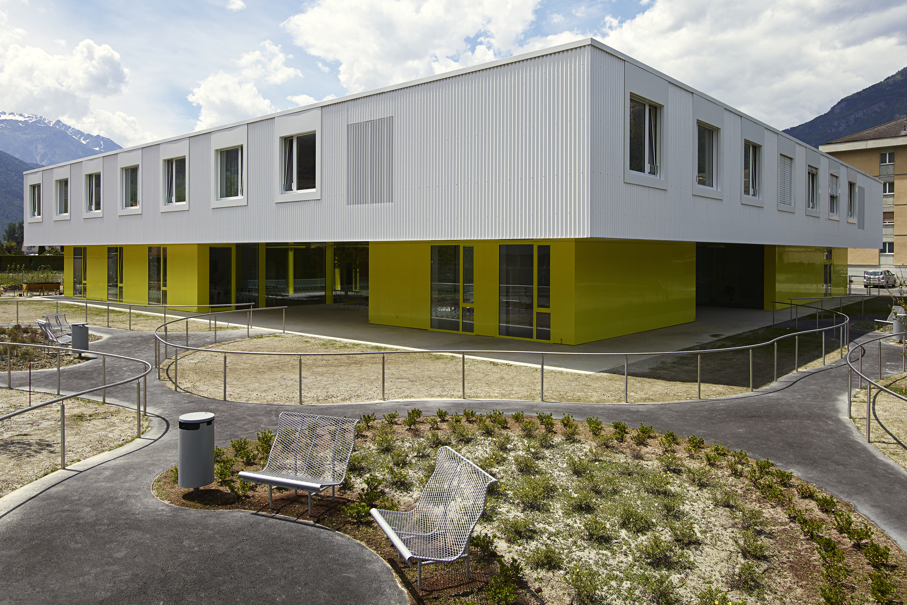 Comme clin d’œil aux entrepôts fruitiers voisins, le bâtiment est revêtu d’une peau d’aluminium ondulée, laquée blanc et rythmée par le percement régulier des fenêtres des chambres, alors que le soubassement est décliné en jaune acidulé. Un ton identique colore les vitrages et les habillages des patios comme un soleil permanent. Le motif de la fleur emblématique du village, l’adonis, apporte une touche décorative autour des patios. A l’intérieur, l’emploi de la couleur, une teinte par aile de chambre, facilite l’orientation des résidents.