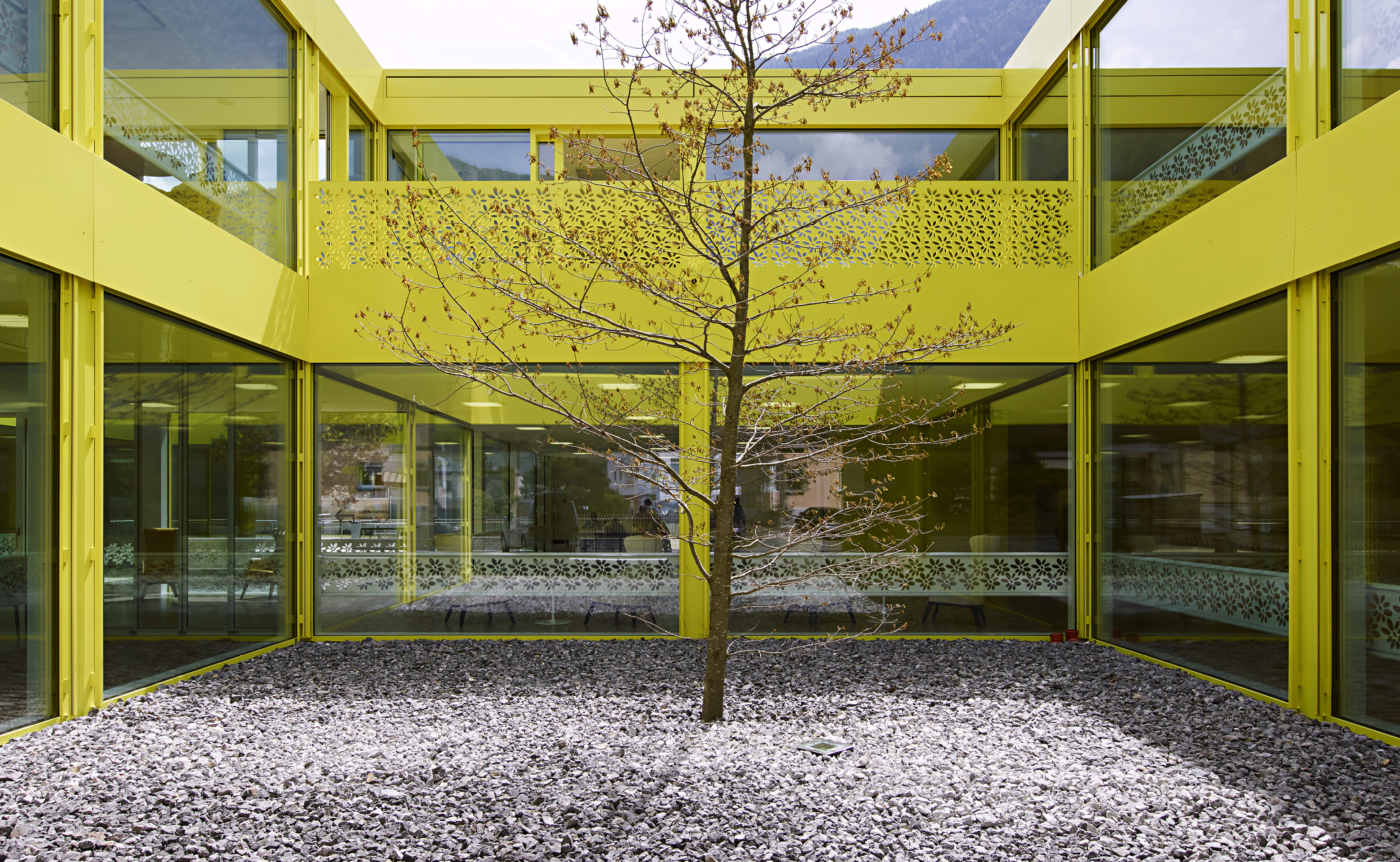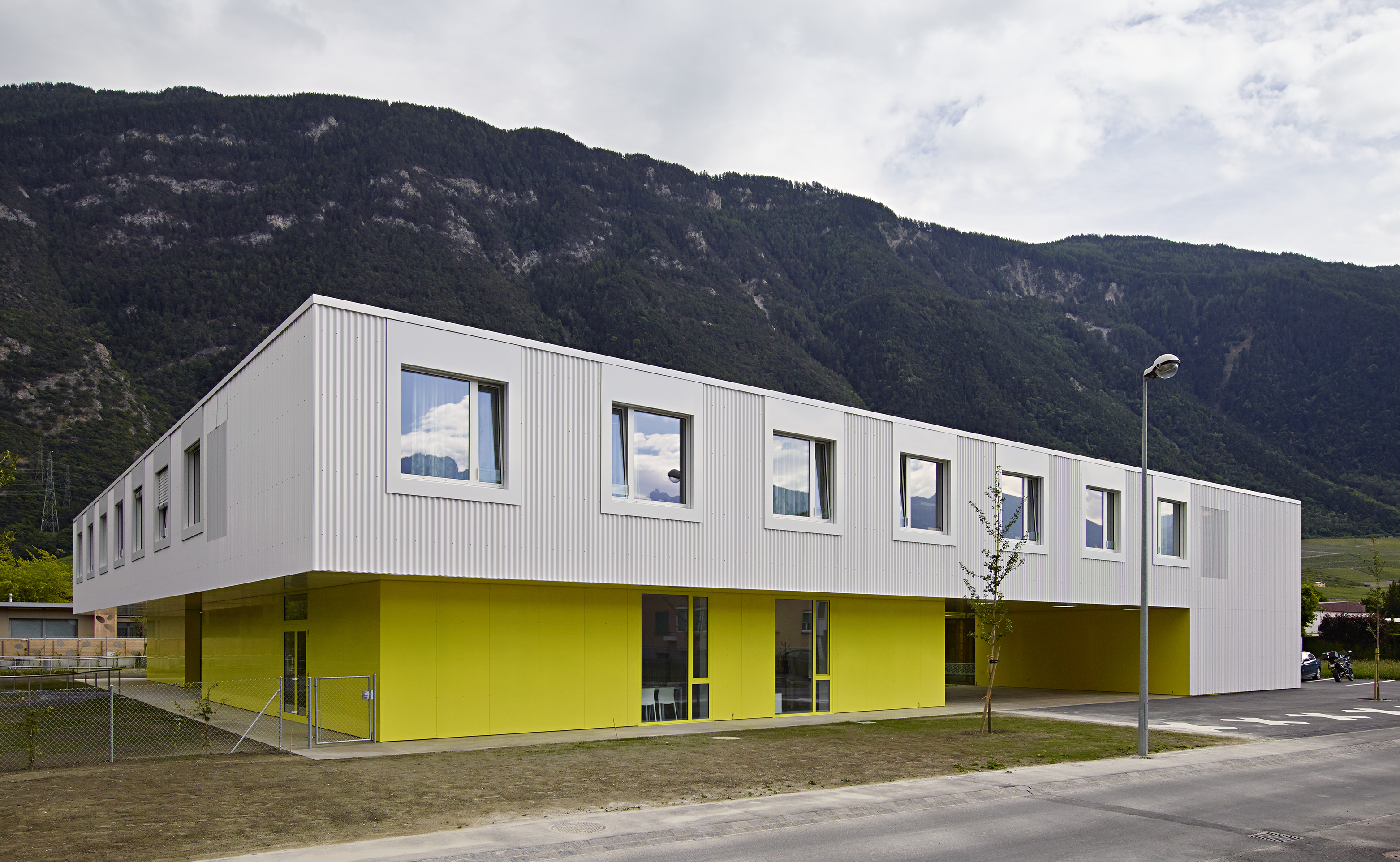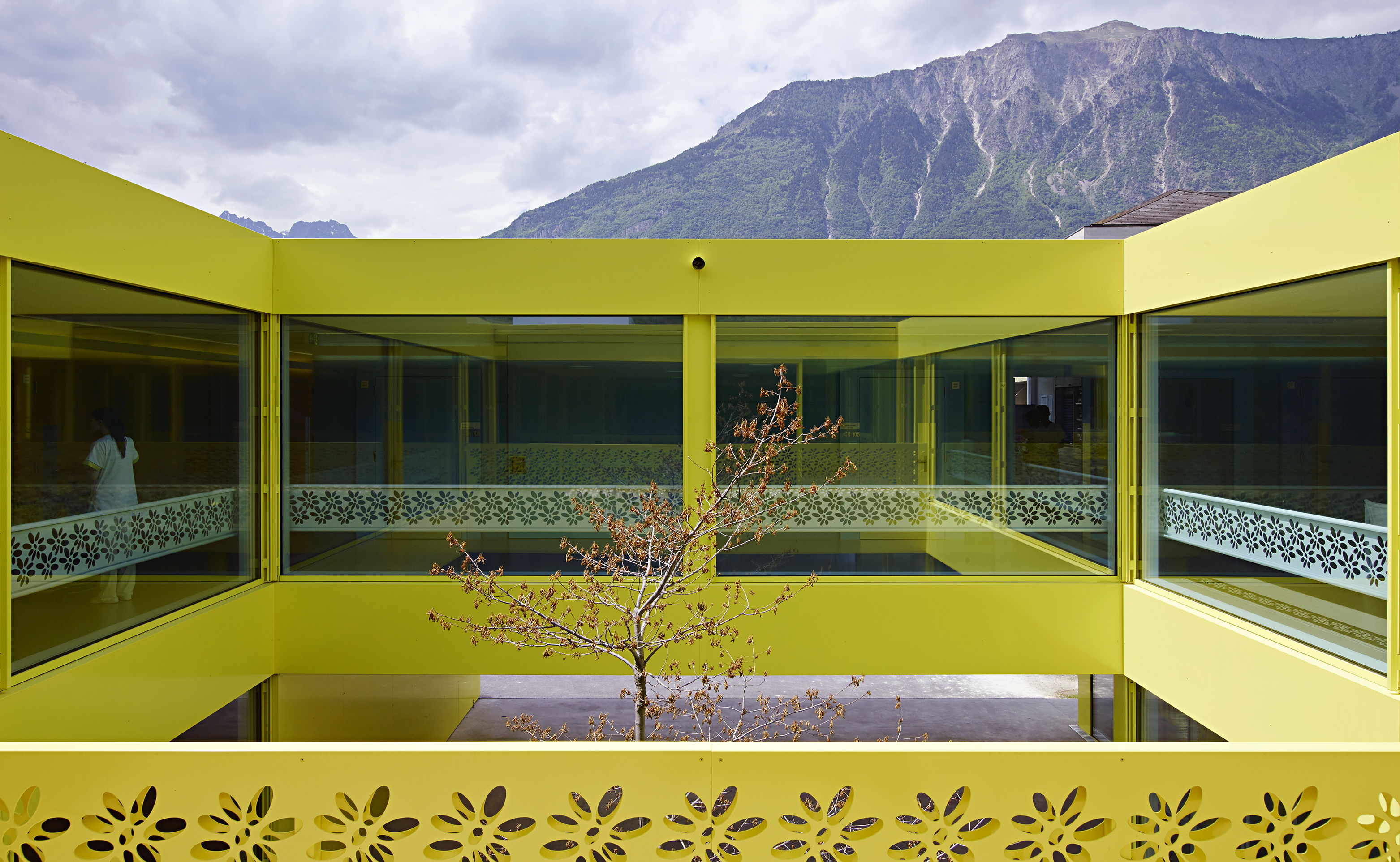 Comme clin d’œil aux entrepôts fruitiers voisins, le bâtiment est revêtu d’une peau d’aluminium ondulée, laquée blanc et rythmée par le percement régulier des fenêtres des chambres, alors que le soubassement est décliné en jaune acidulé. Un ton identique colore les vitrages et les habillages des patios comme un soleil permanent. Le motif de la fleur emblématique du village, l’adonis, apporte une touche décorative autour des patios. A l’intérieur, l’emploi de la couleur, une teinte par aile de chambre, facilite l’orientation des résidents.