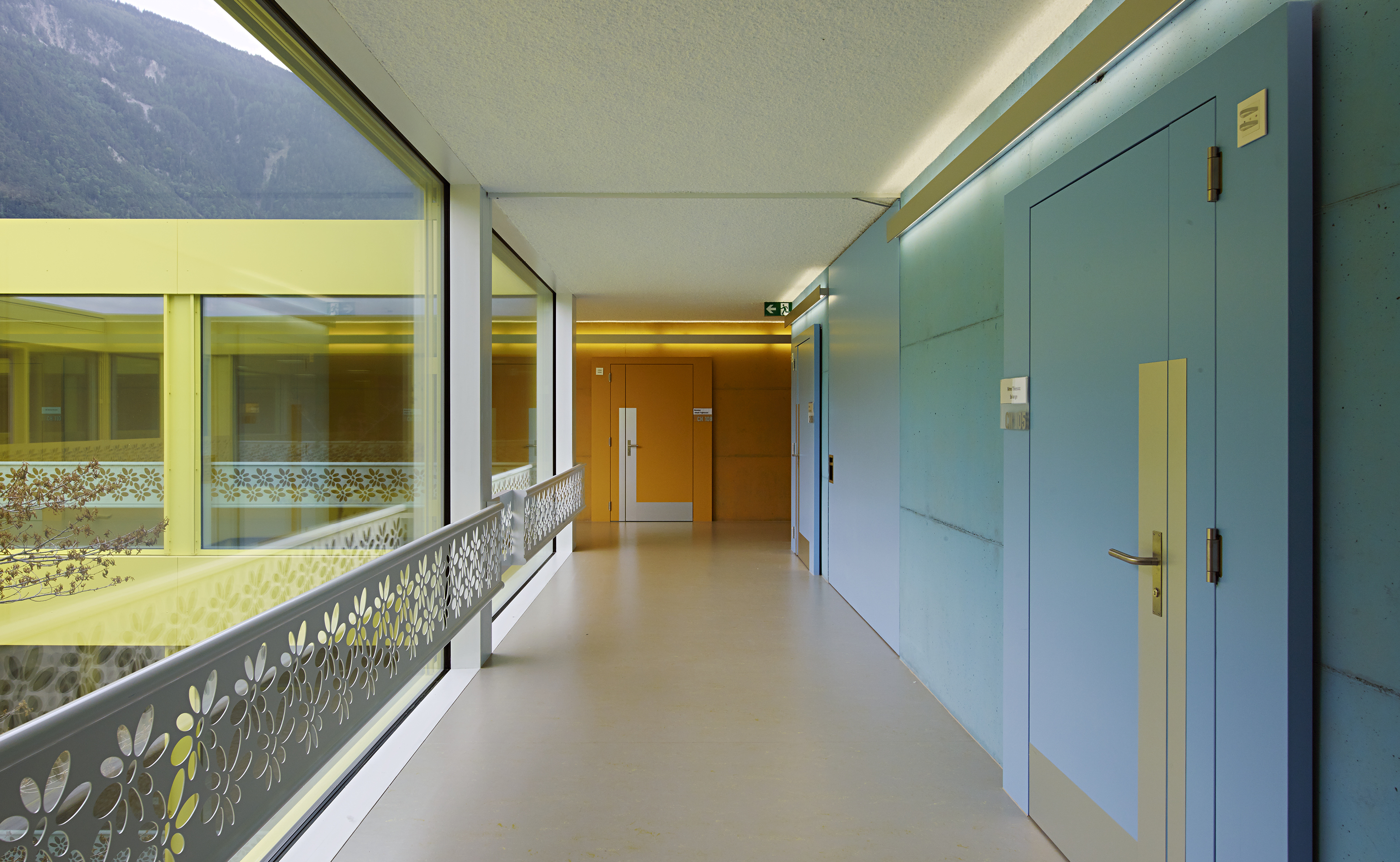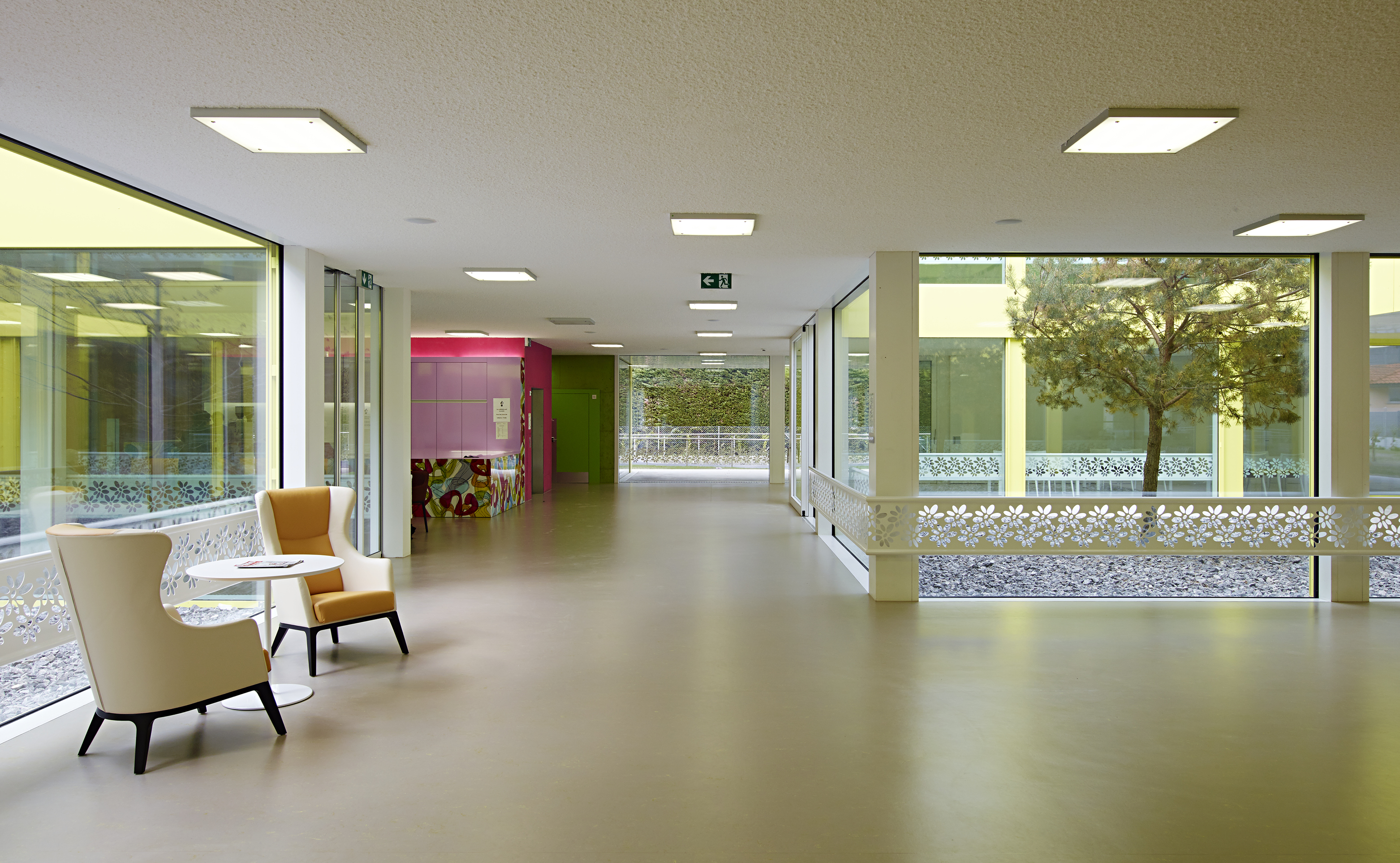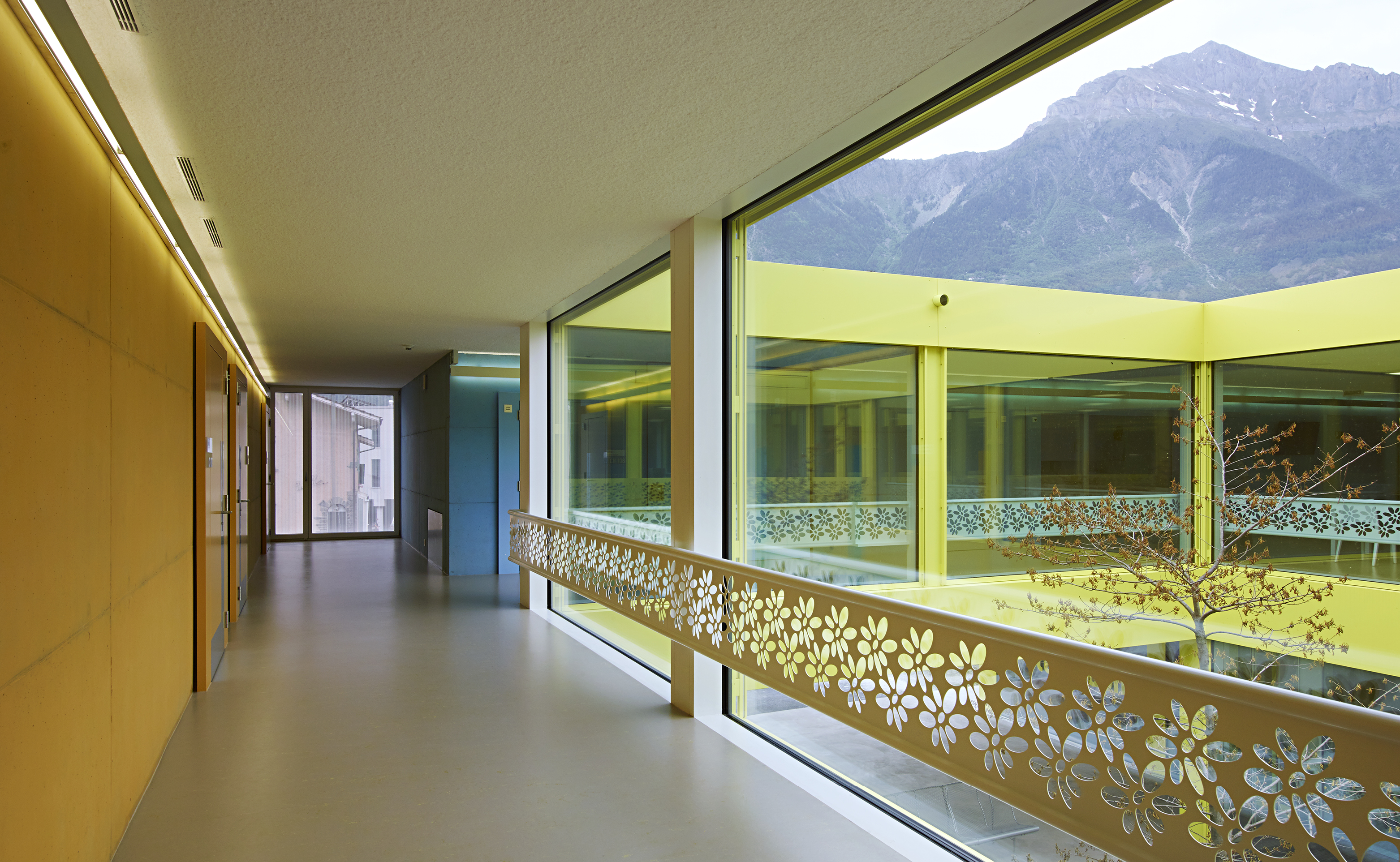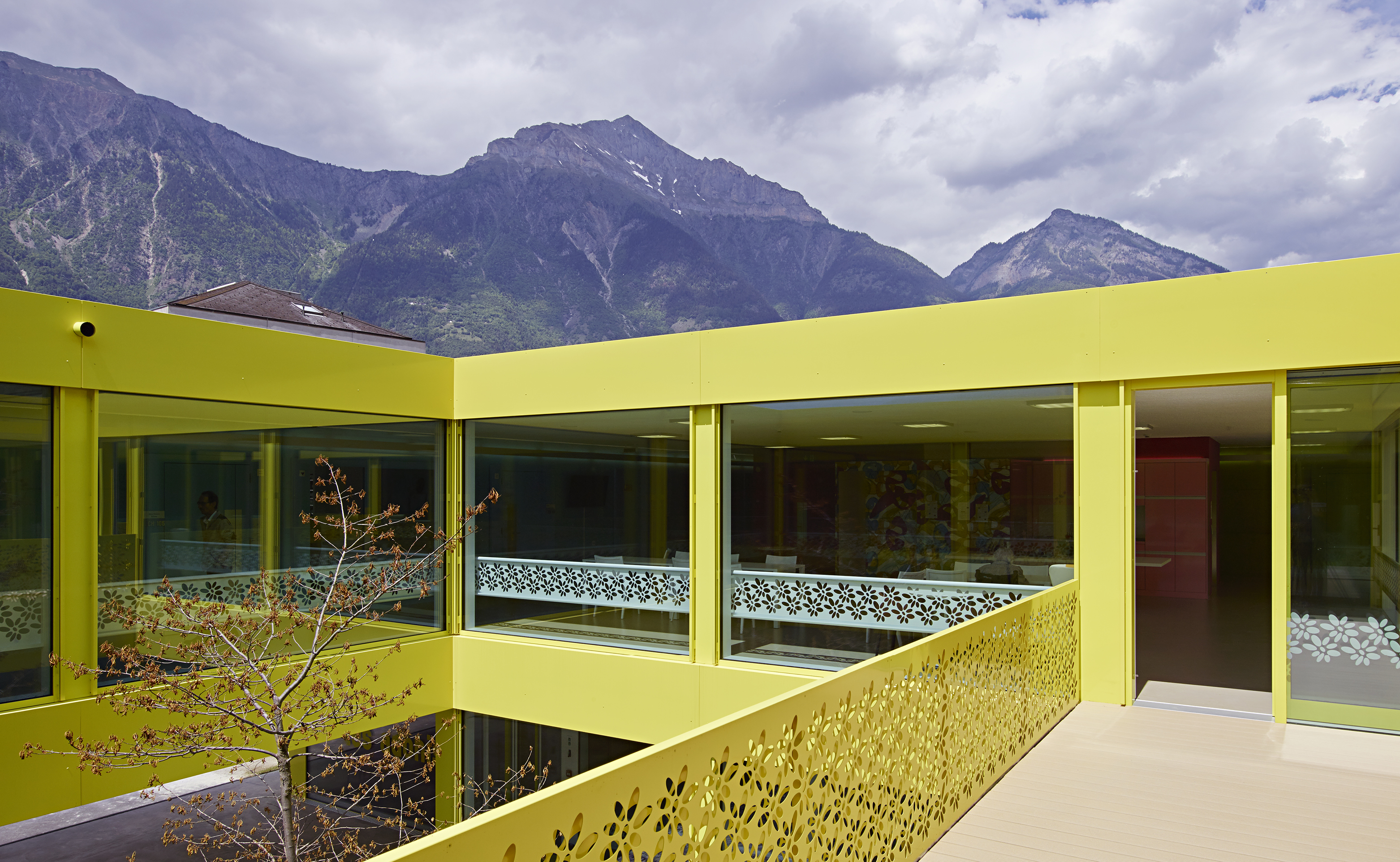 Comme clin d’œil aux entrepôts fruitiers voisins, le bâtiment est revêtu d’une peau d’aluminium ondulée, laquée blanc et rythmée par le percement régulier des fenêtres des chambres, alors que le soubassement est décliné en jaune acidulé. Un ton identique colore les vitrages et les habillages des patios comme un soleil permanent. Le motif de la fleur emblématique du village, l’adonis, apporte une touche décorative autour des patios. A l’intérieur, l’emploi de la couleur, une teinte par aile de chambre, facilite l’orientation des résidents.