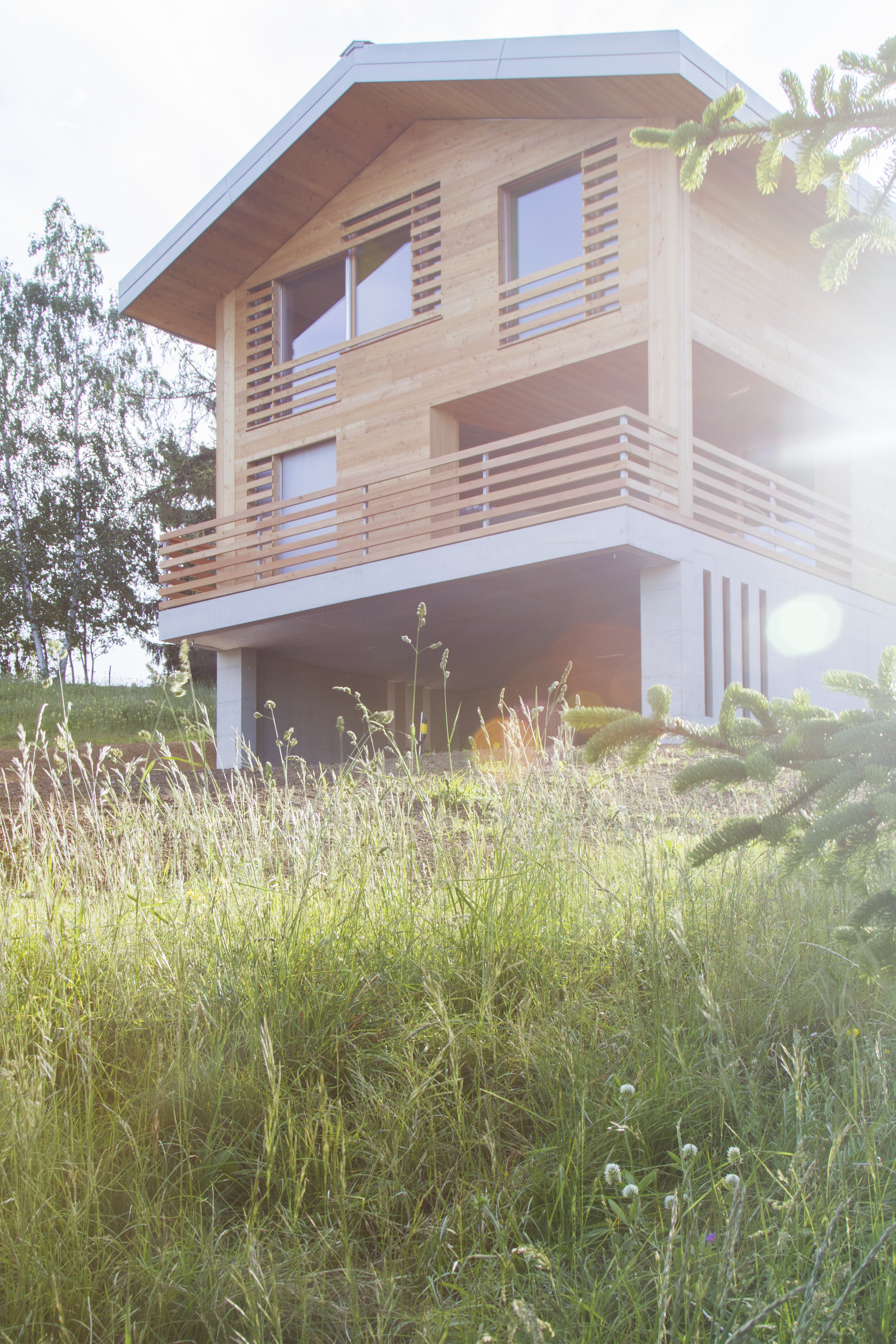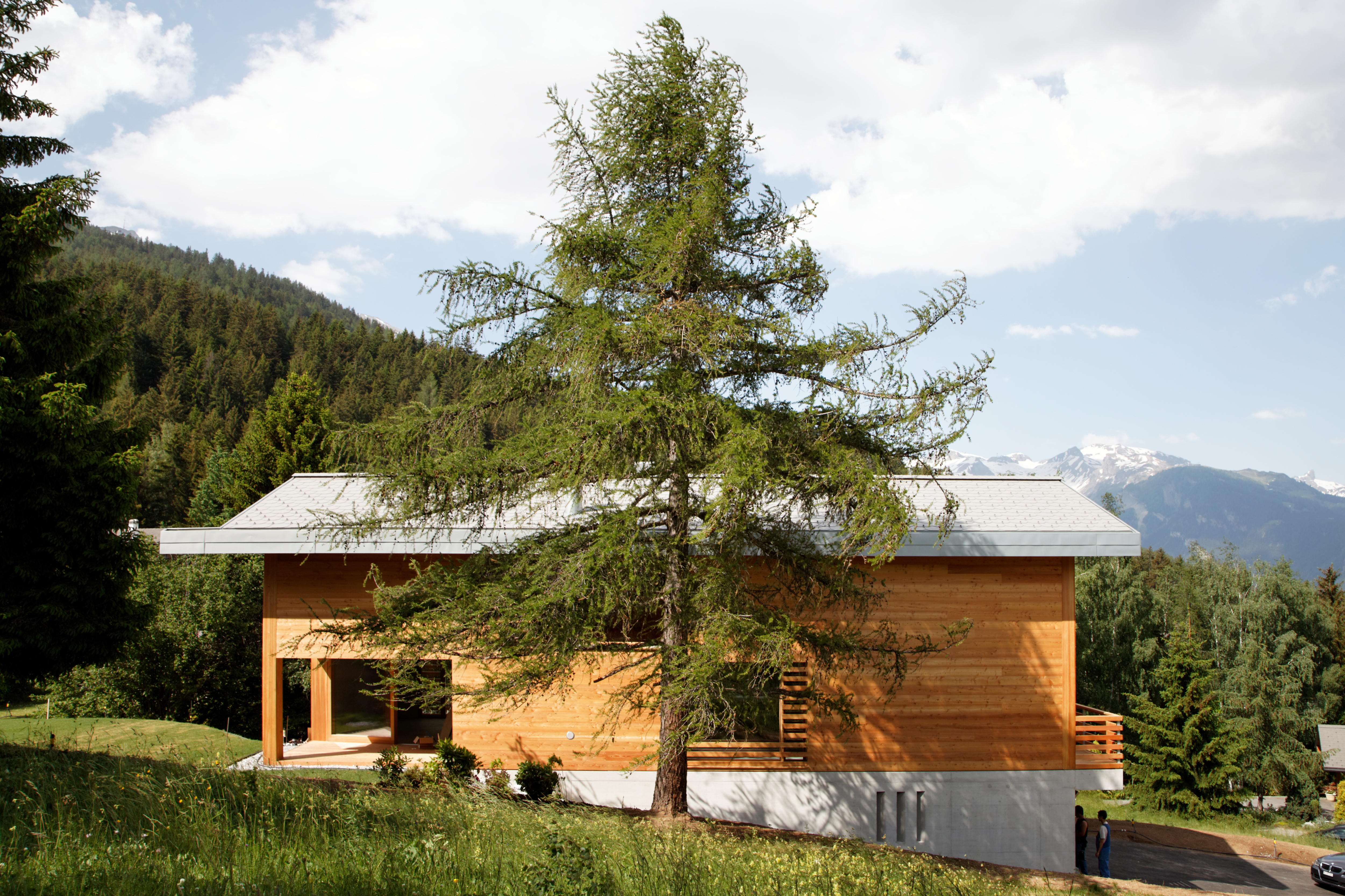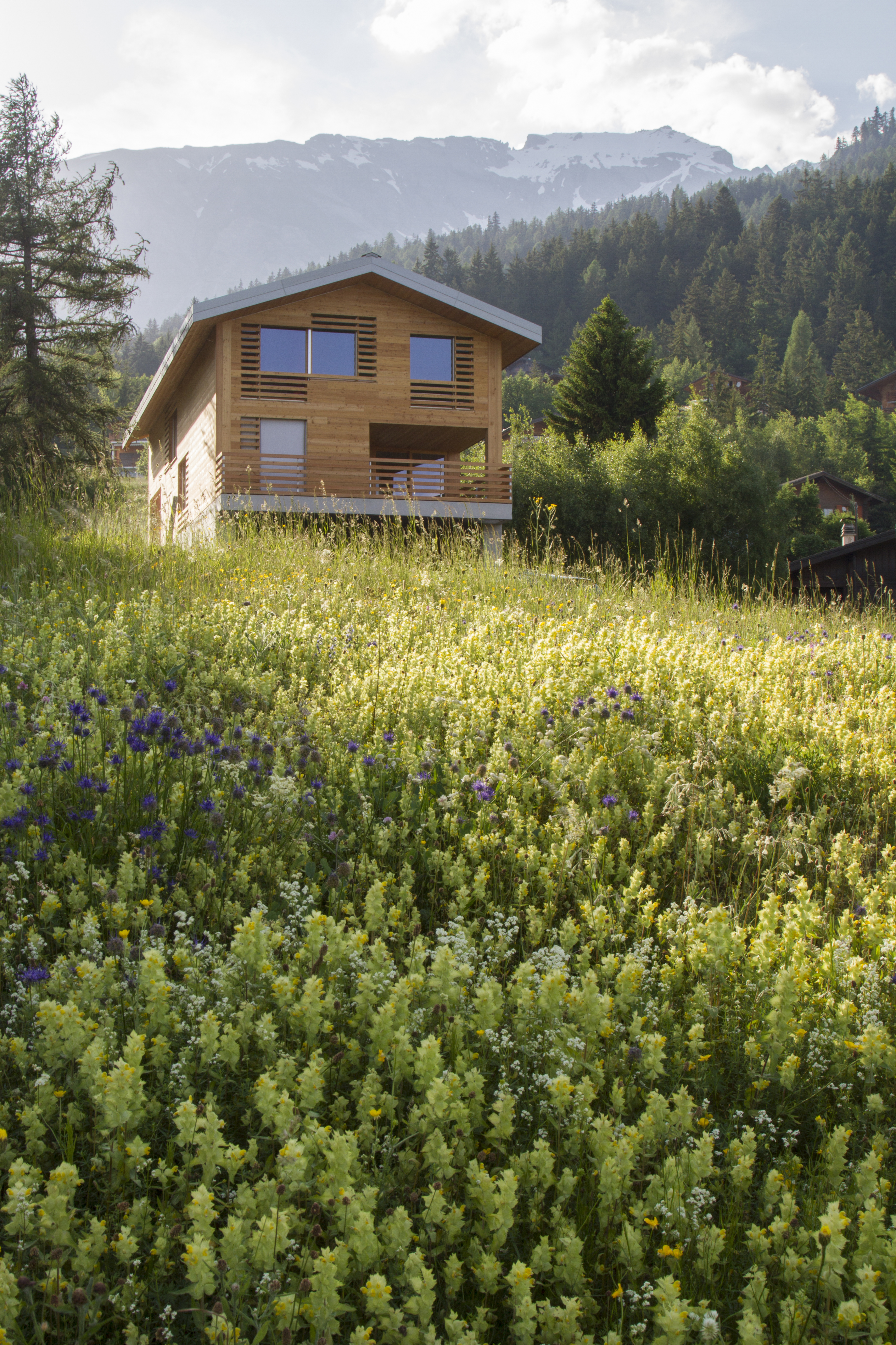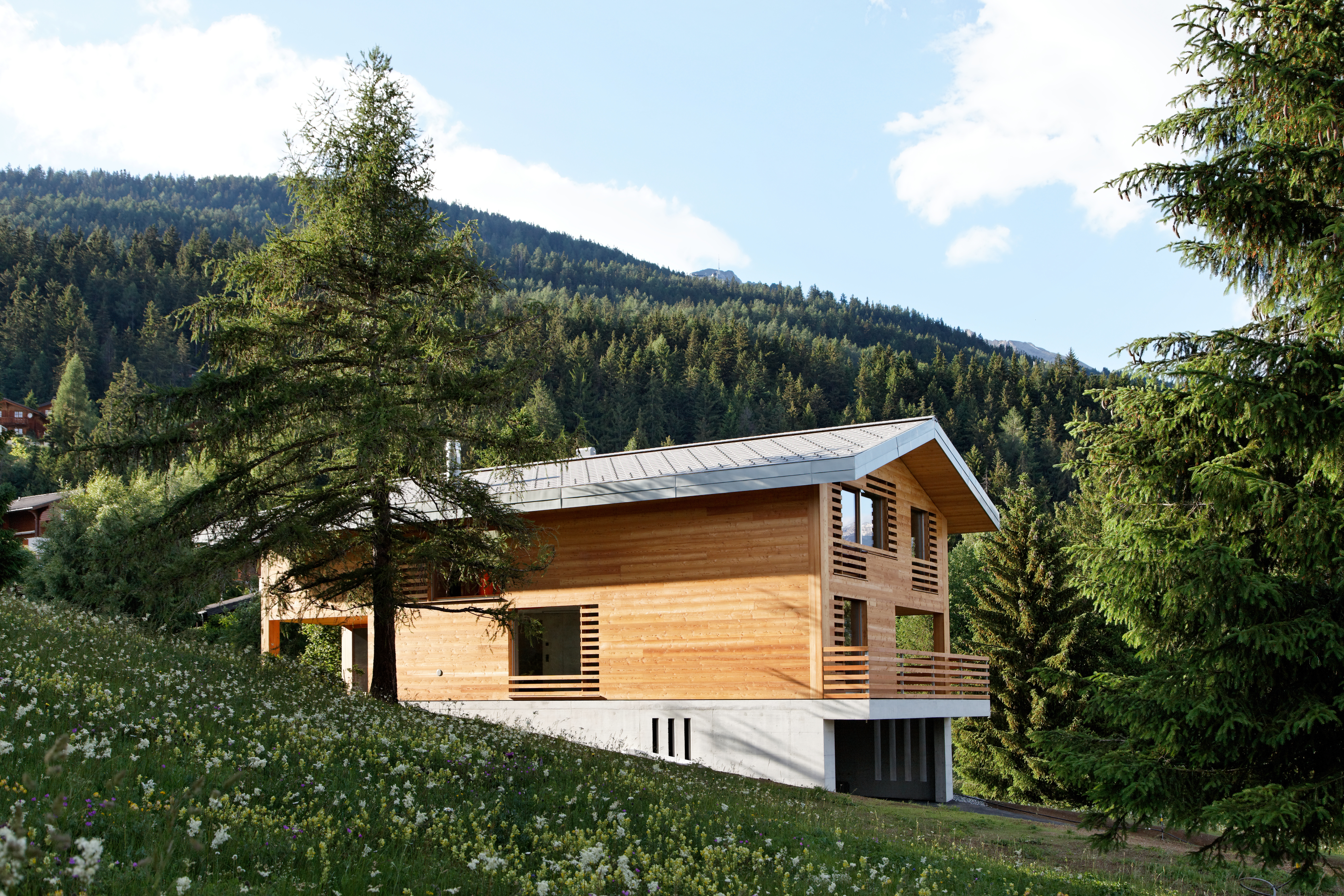 Dans le village d’Arbaz, ce chalet légèrement isolé de ses semblables abrite une famille vivant à l’année. Ce chalet est situé dans une zone de mayens, où le règlement est particulièrement restrictif. Pour ce projet, le thème des "Falsche Chalet" a été adopté. Sa morphologie traduit une expression plus ou moins traditionnelle de chalet, tout en dissimulant à l’intérieur une interprétation contemporaine brutaliste avec un emploi marqué du béton.