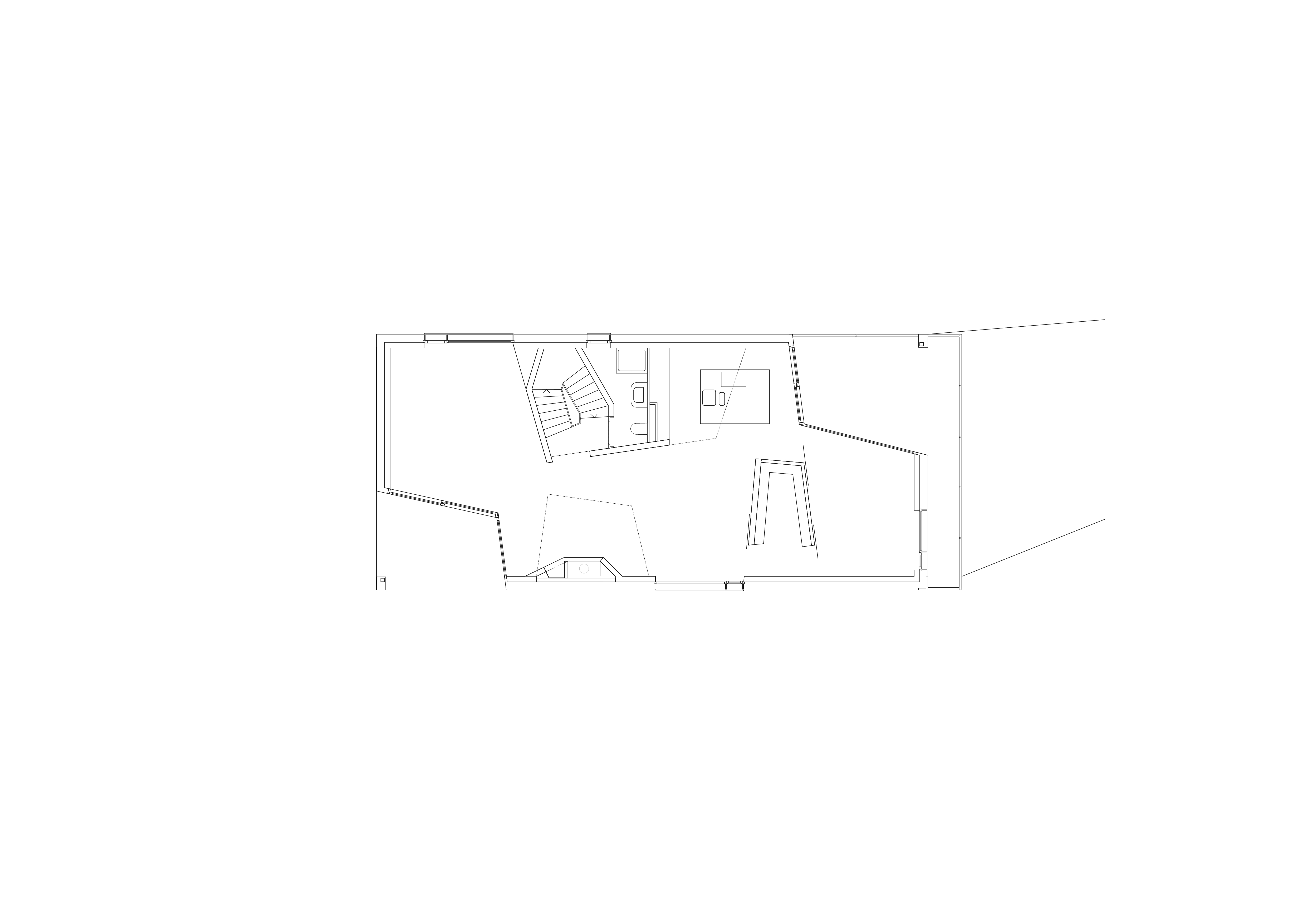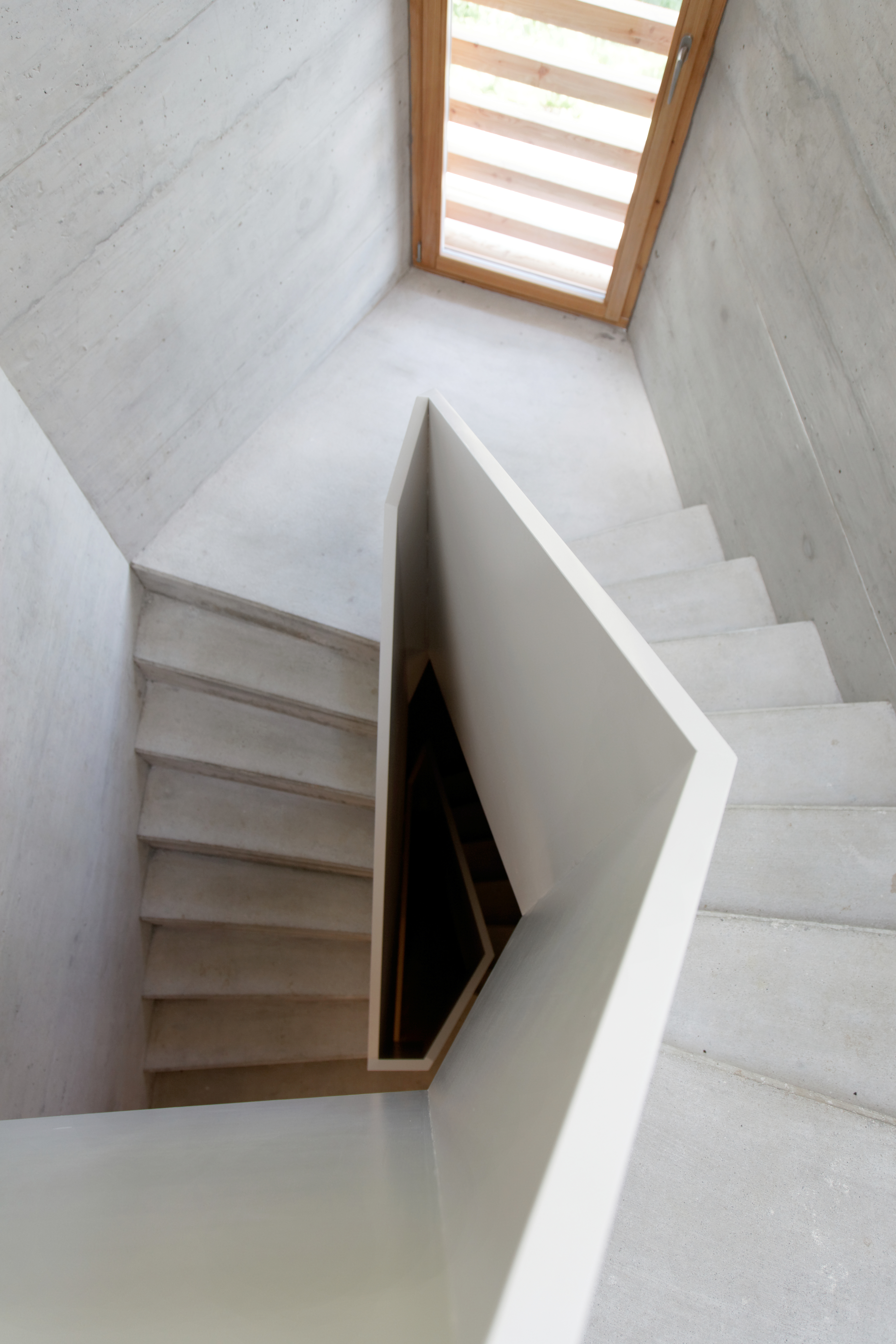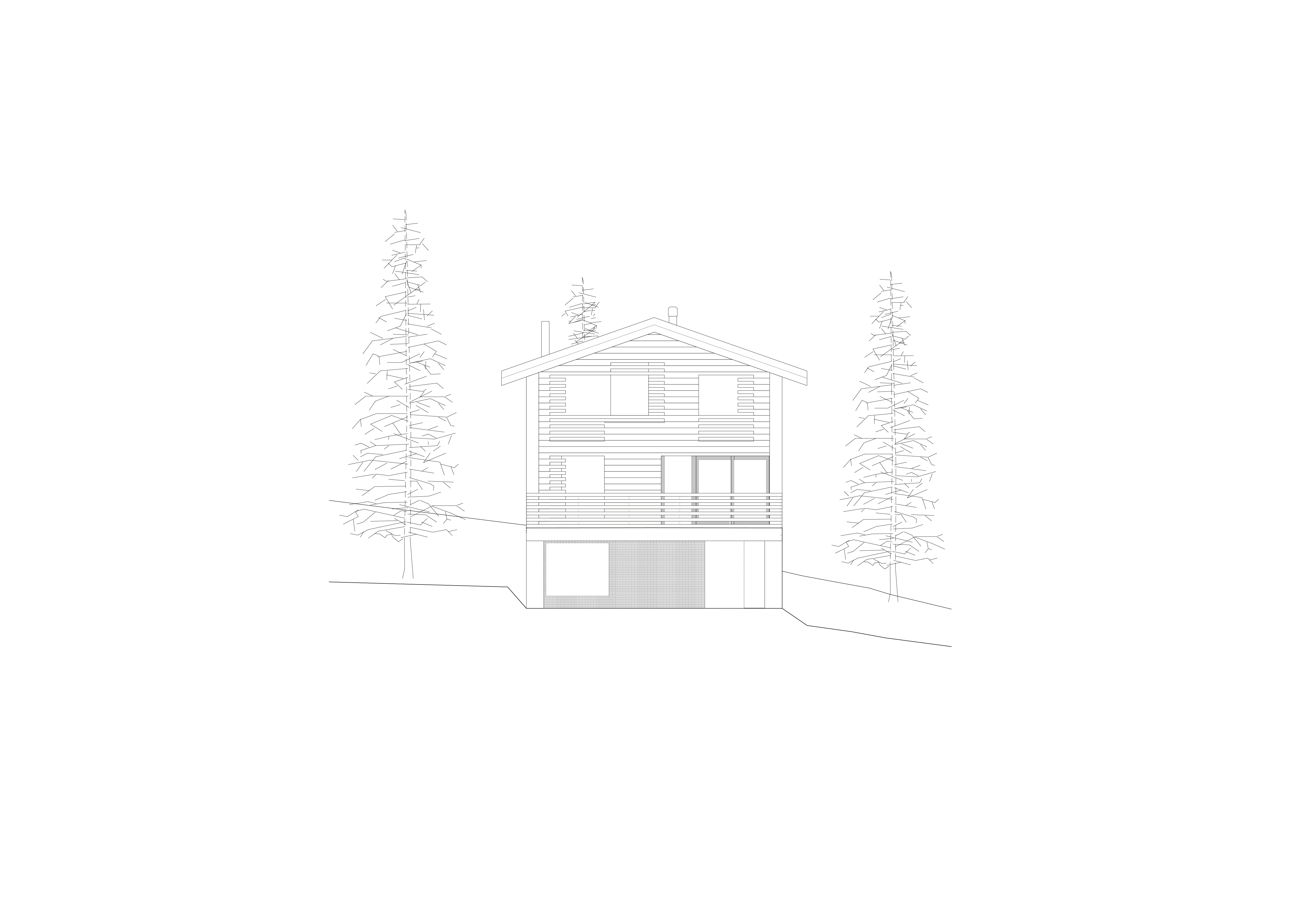 Des doubles hauteurs caractérisent la cuisine et l’espace cheminée, tout en organisant, à l’étage supérieur, les circulations entre la chambre parentale au sud et les trois chambres au nord. En contraste avec la géométrie simple du chalet, le projet s’exprime de l’intérieur par les angles obliques des murs et cloisons ainsi que par les découpes asymétriques des hauteurs.