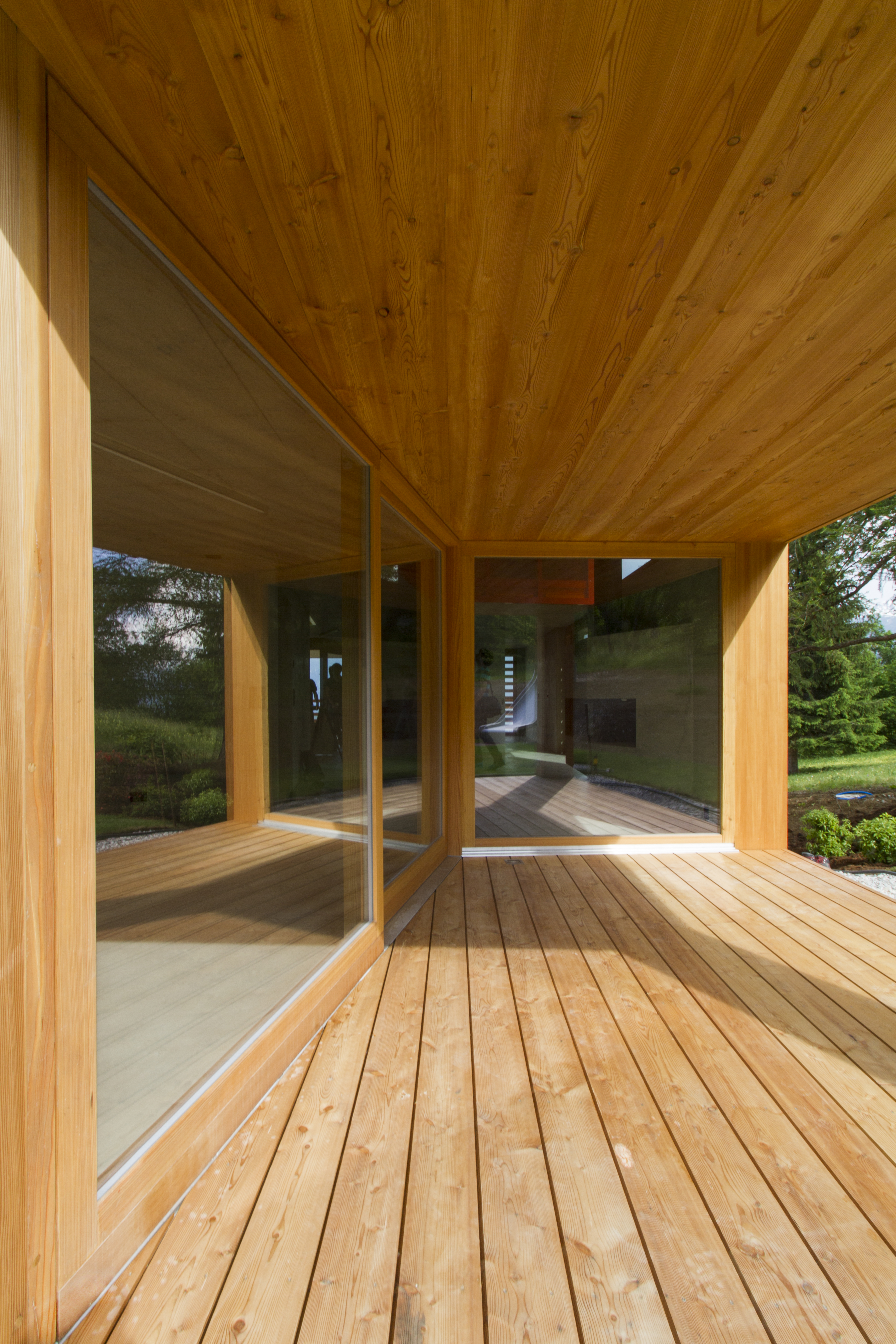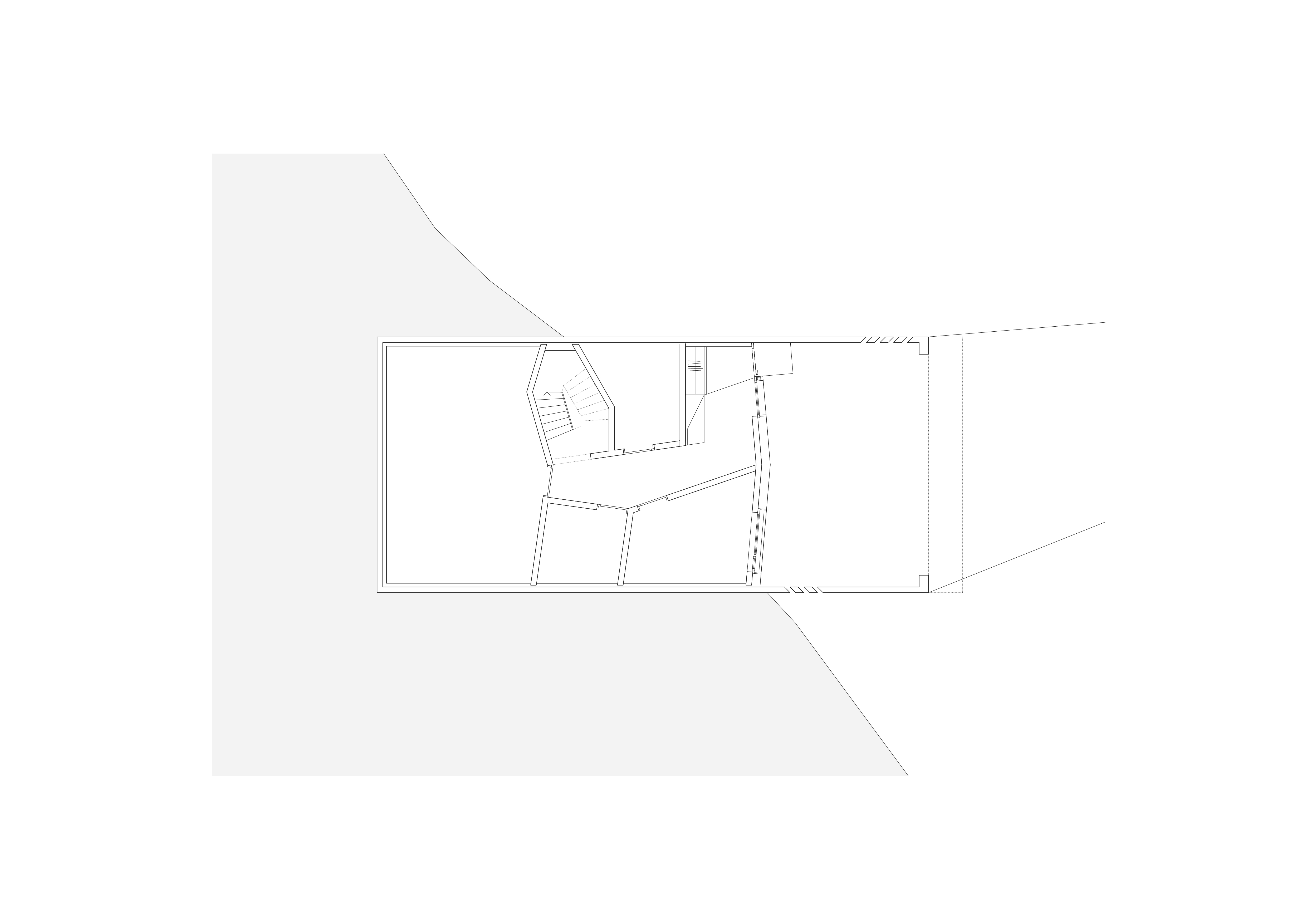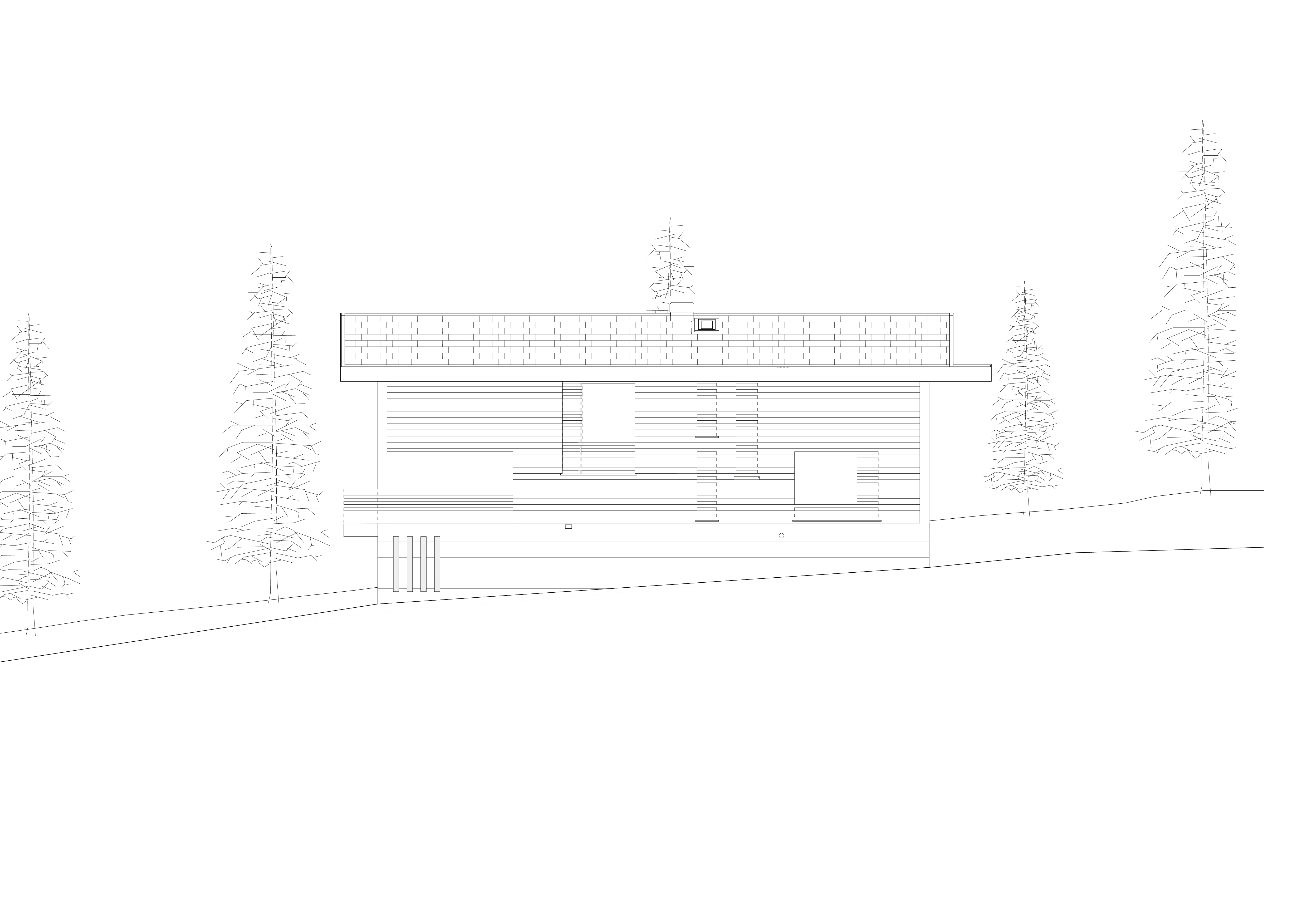 Des doubles hauteurs caractérisent la cuisine et l’espace cheminée, tout en organisant, à l’étage supérieur, les circulations entre la chambre parentale au sud et les trois chambres au nord. En contraste avec la géométrie simple du chalet, le projet s’exprime de l’intérieur par les angles obliques des murs et cloisons ainsi que par les découpes asymétriques des hauteurs.