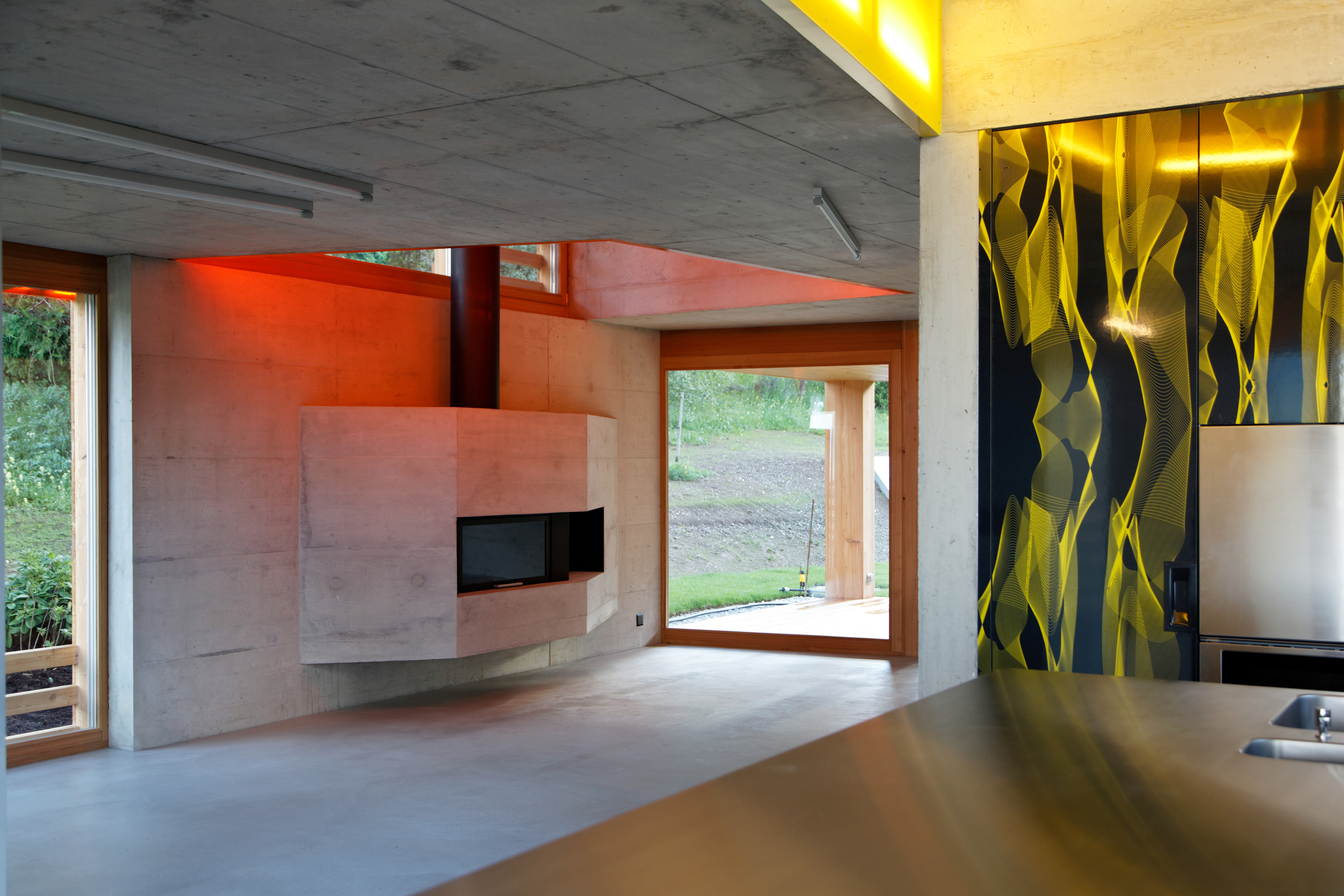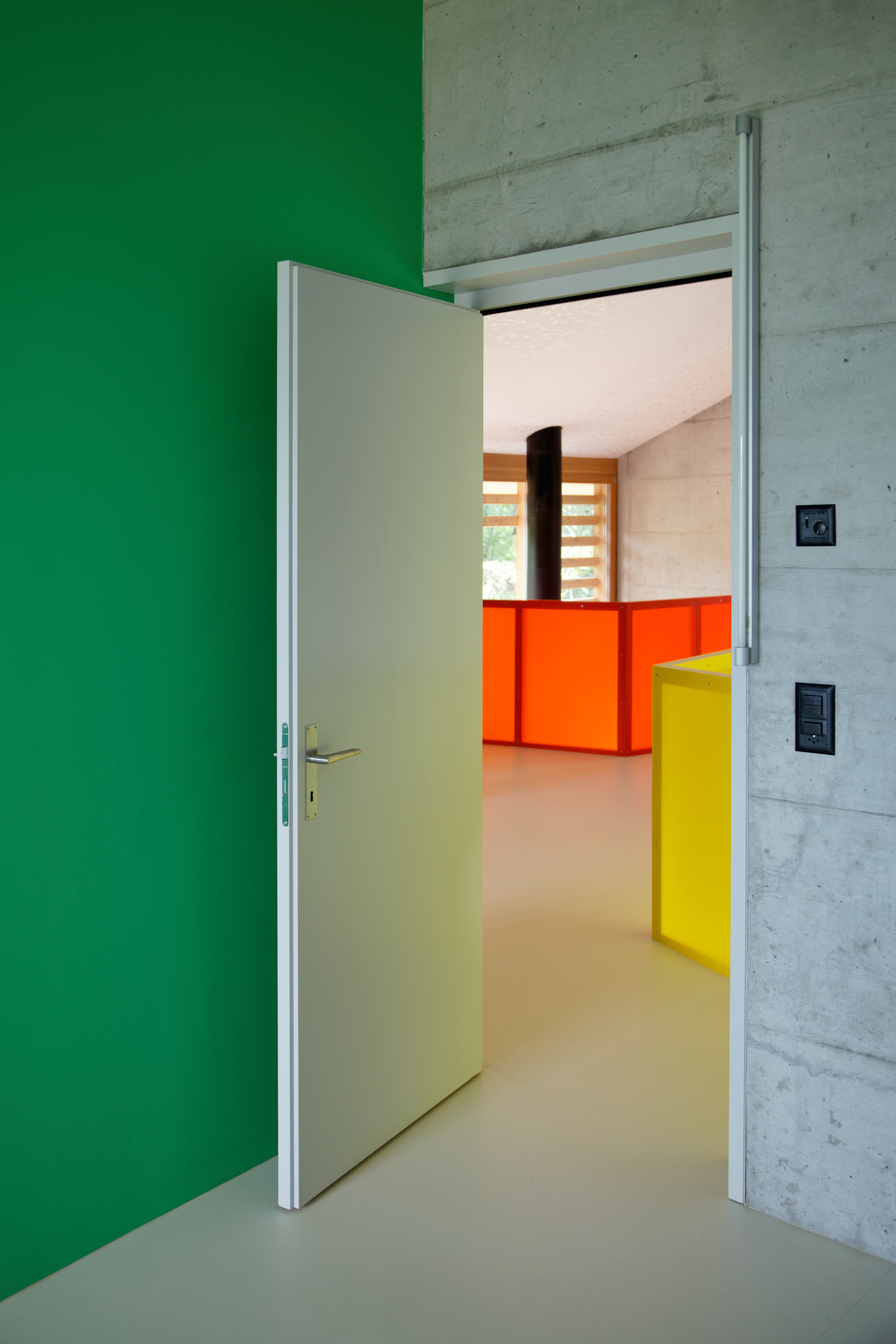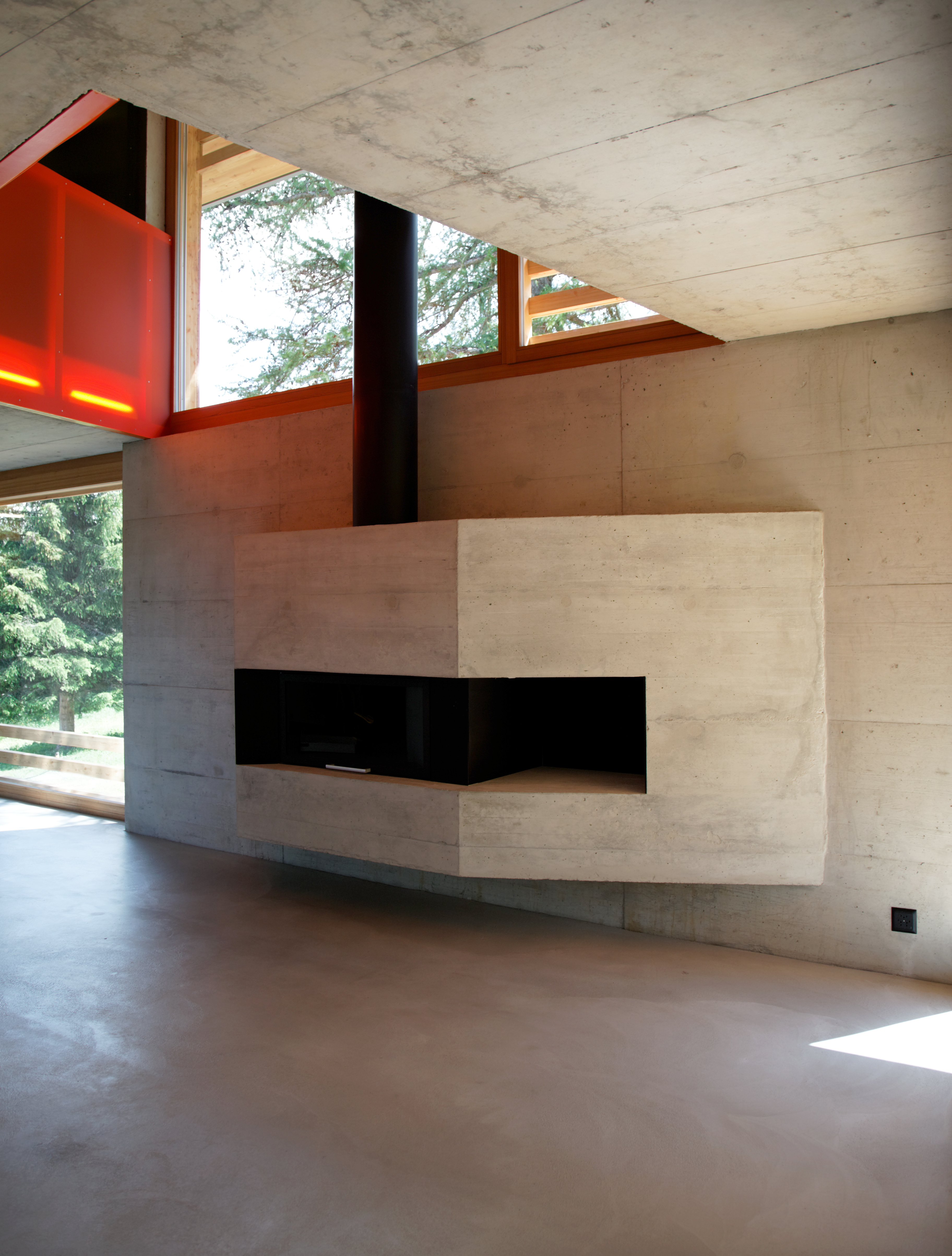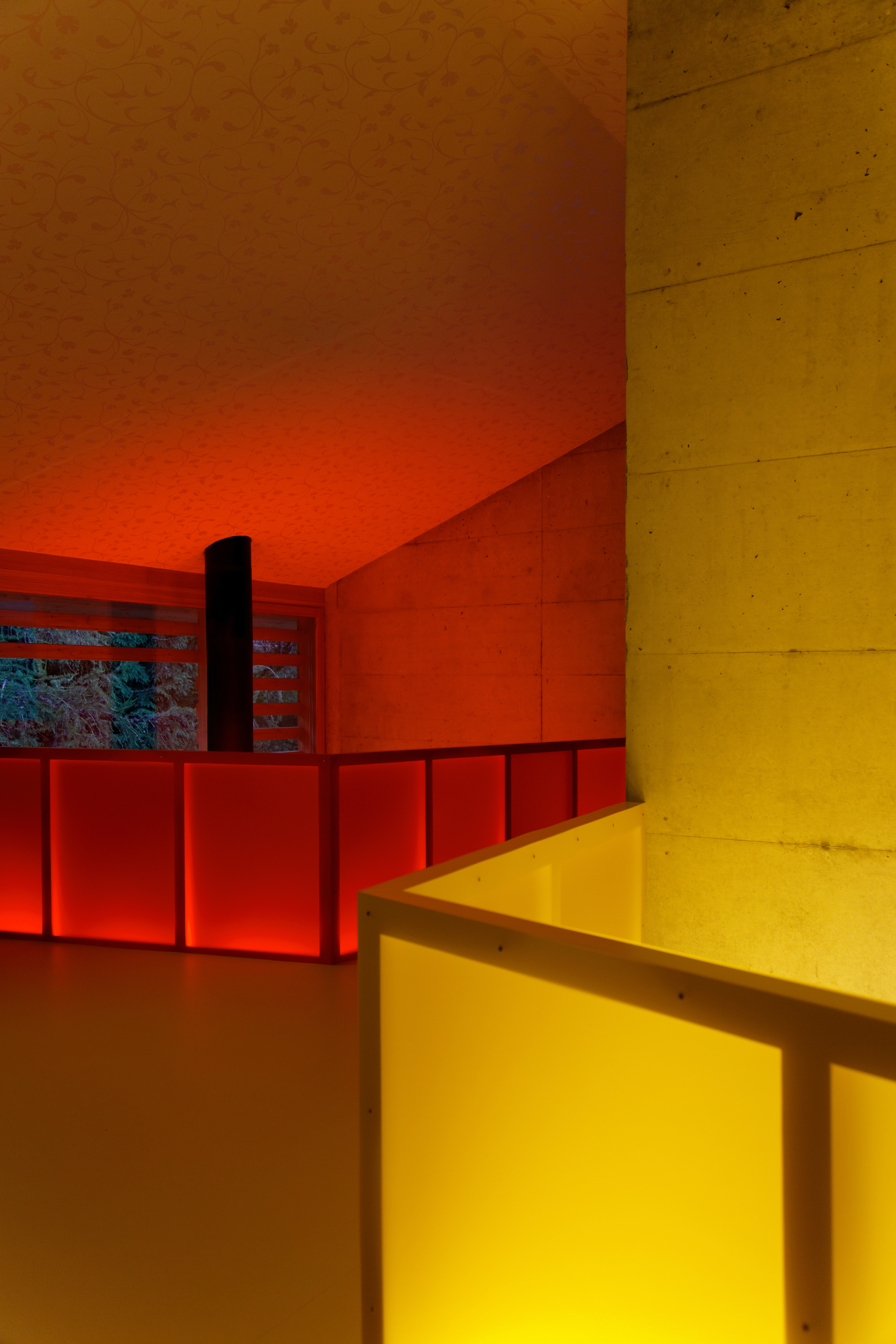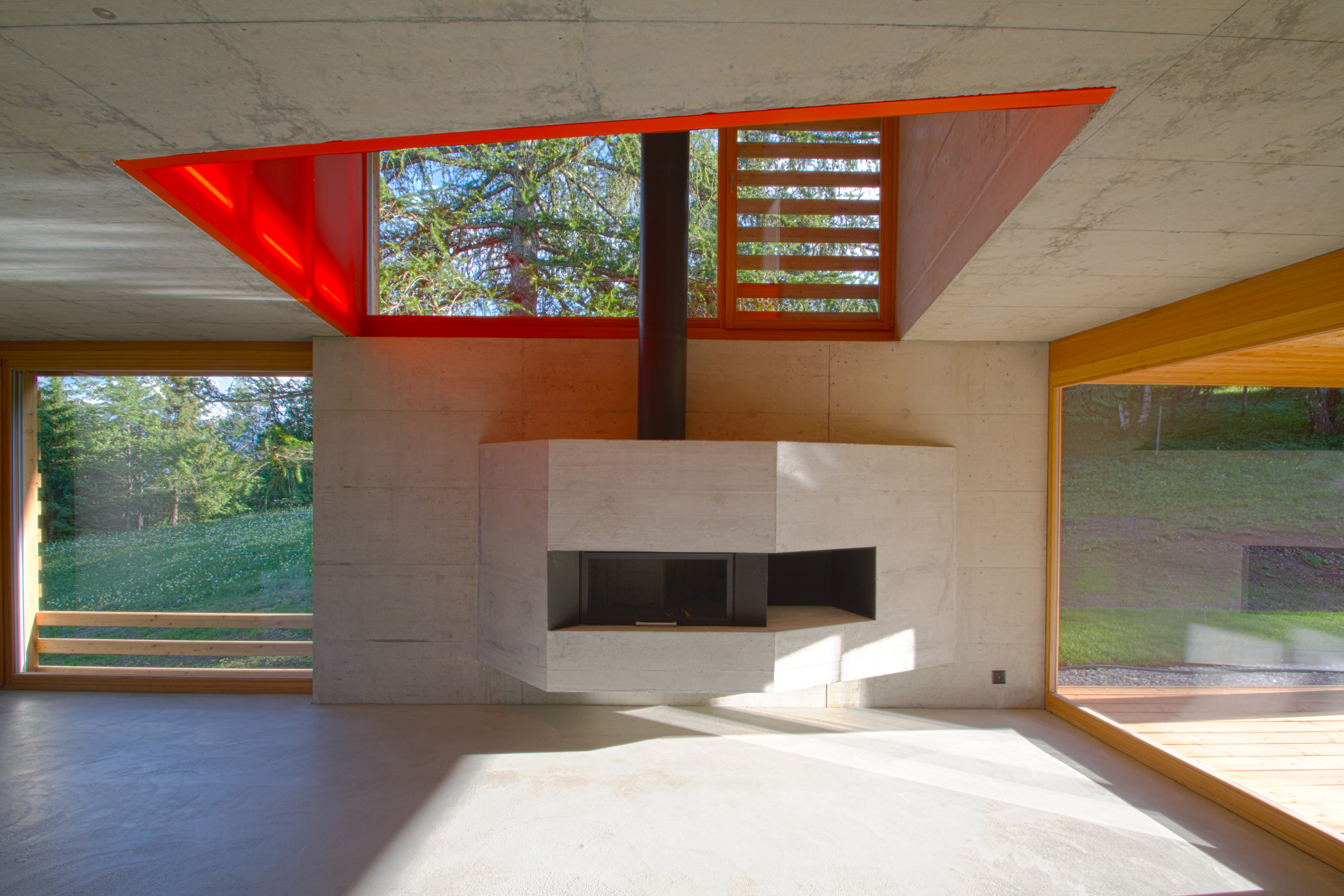 Le bardage en mélèze de la façade joue avec les dimensions des larges baies vitrées, recadrant les ouvertures tout en laissant passer la lumière. À l'intérieur, les murs en béton restent apparents. Une sélection de couleurs vives interagit dans ces espaces minéraux de par leur rayonnement et leur jeu de transparence et de lumière.