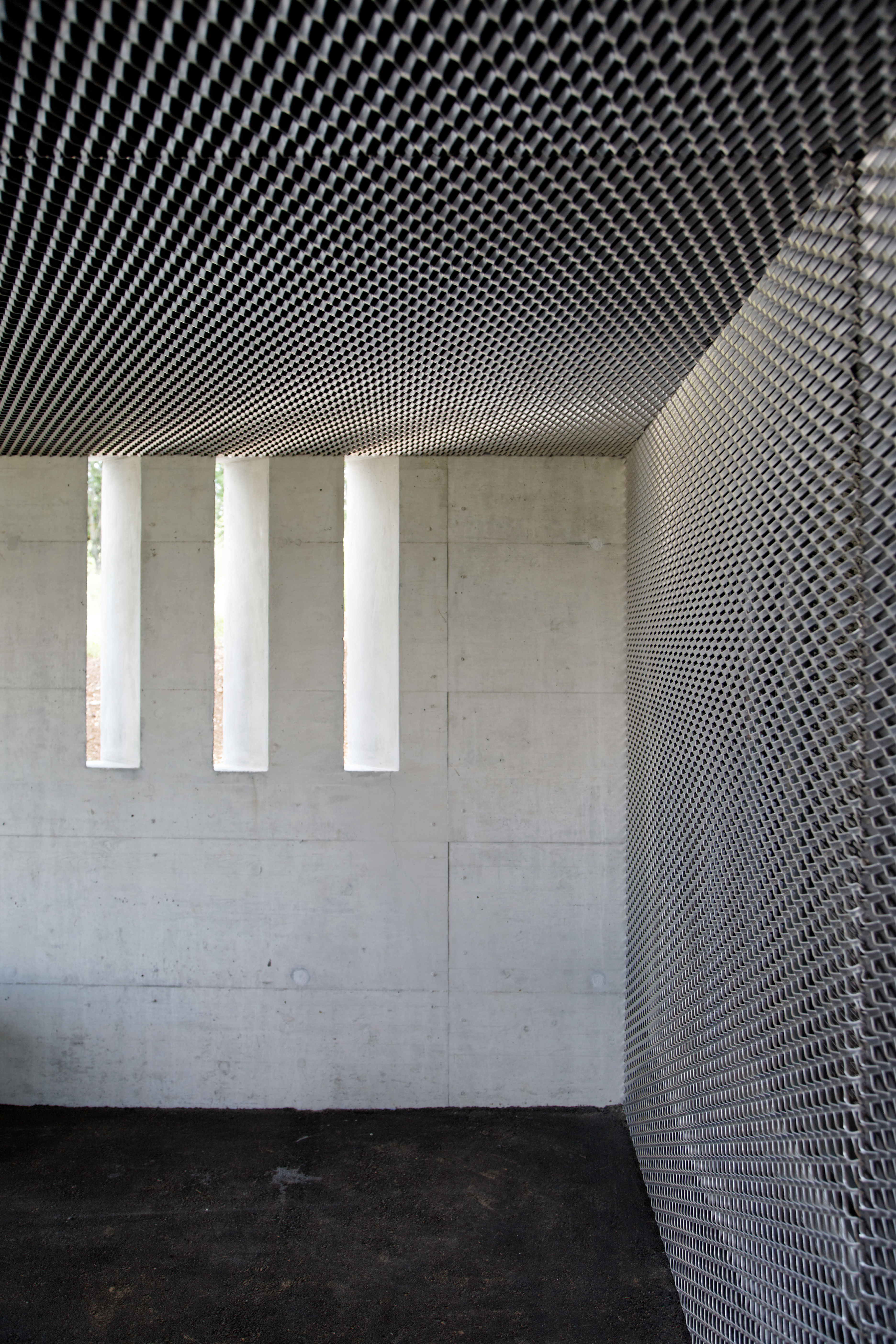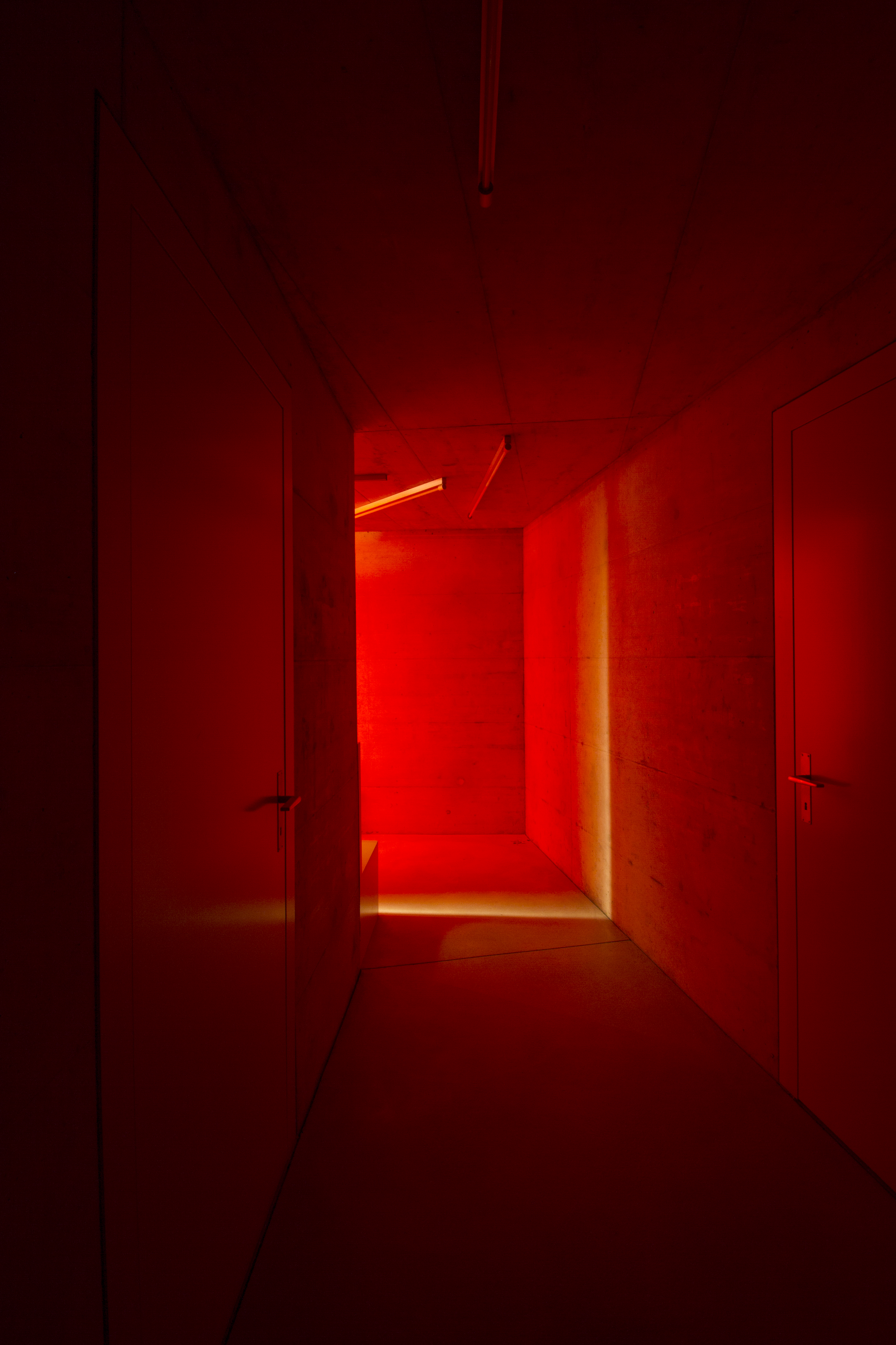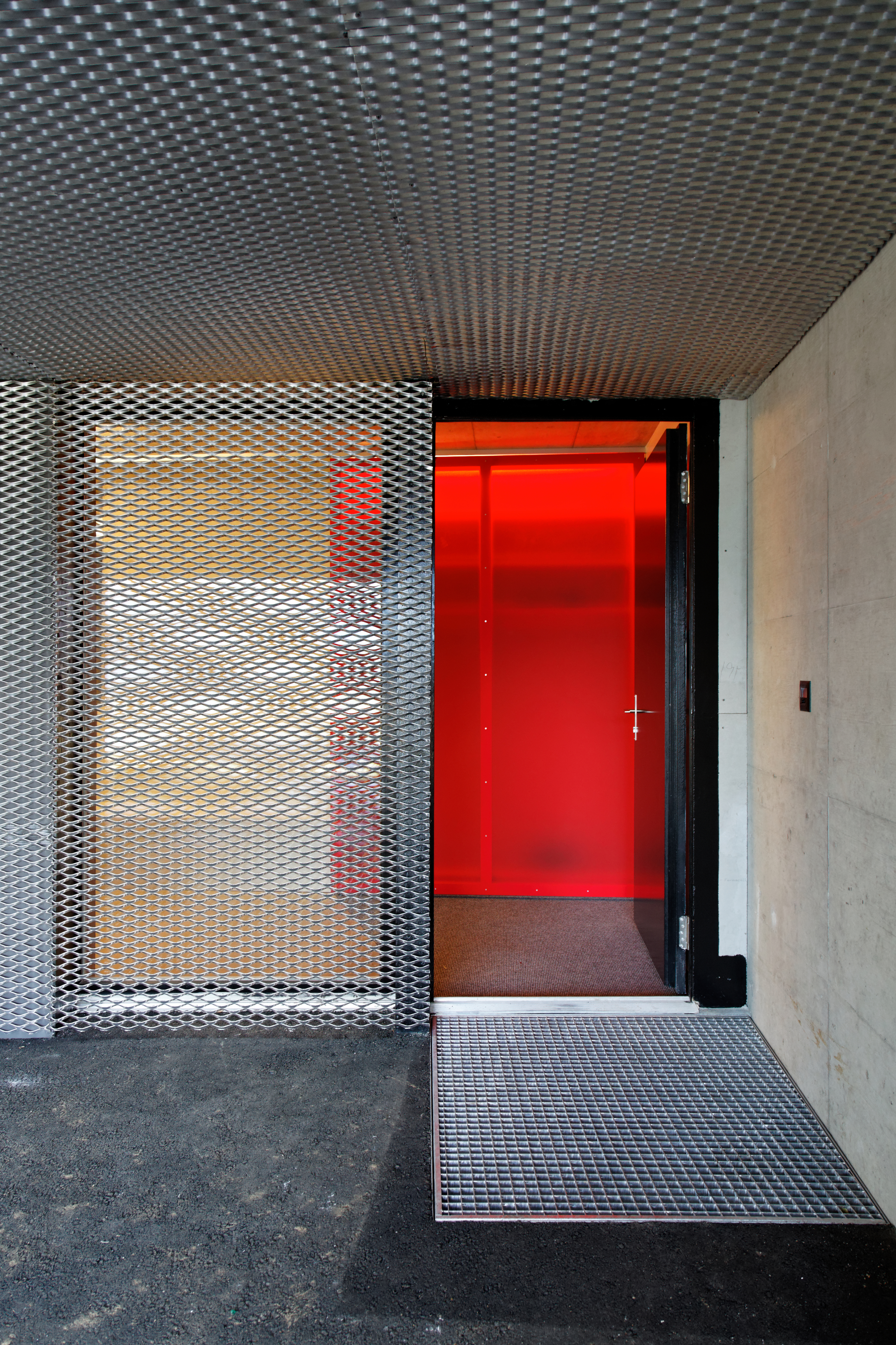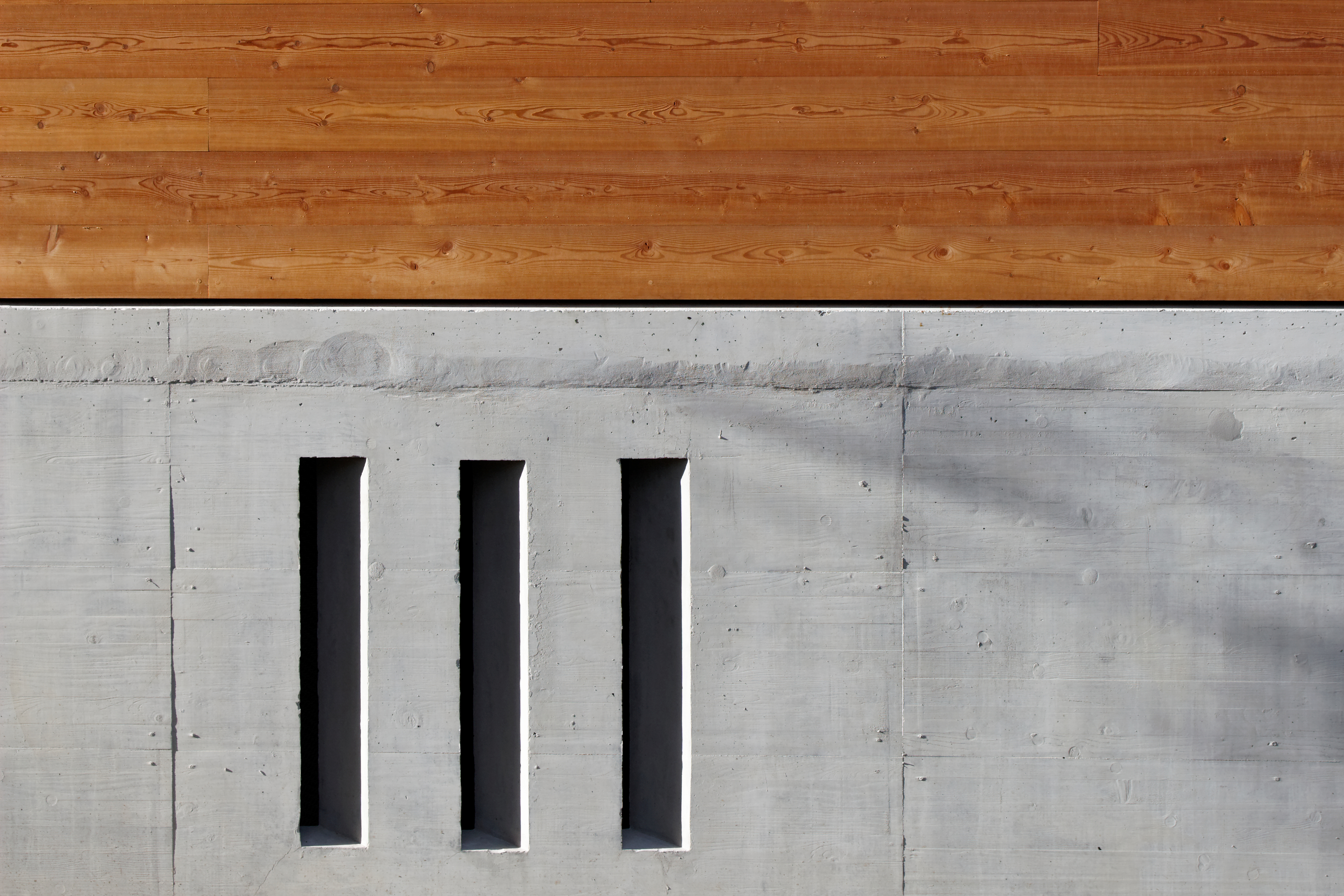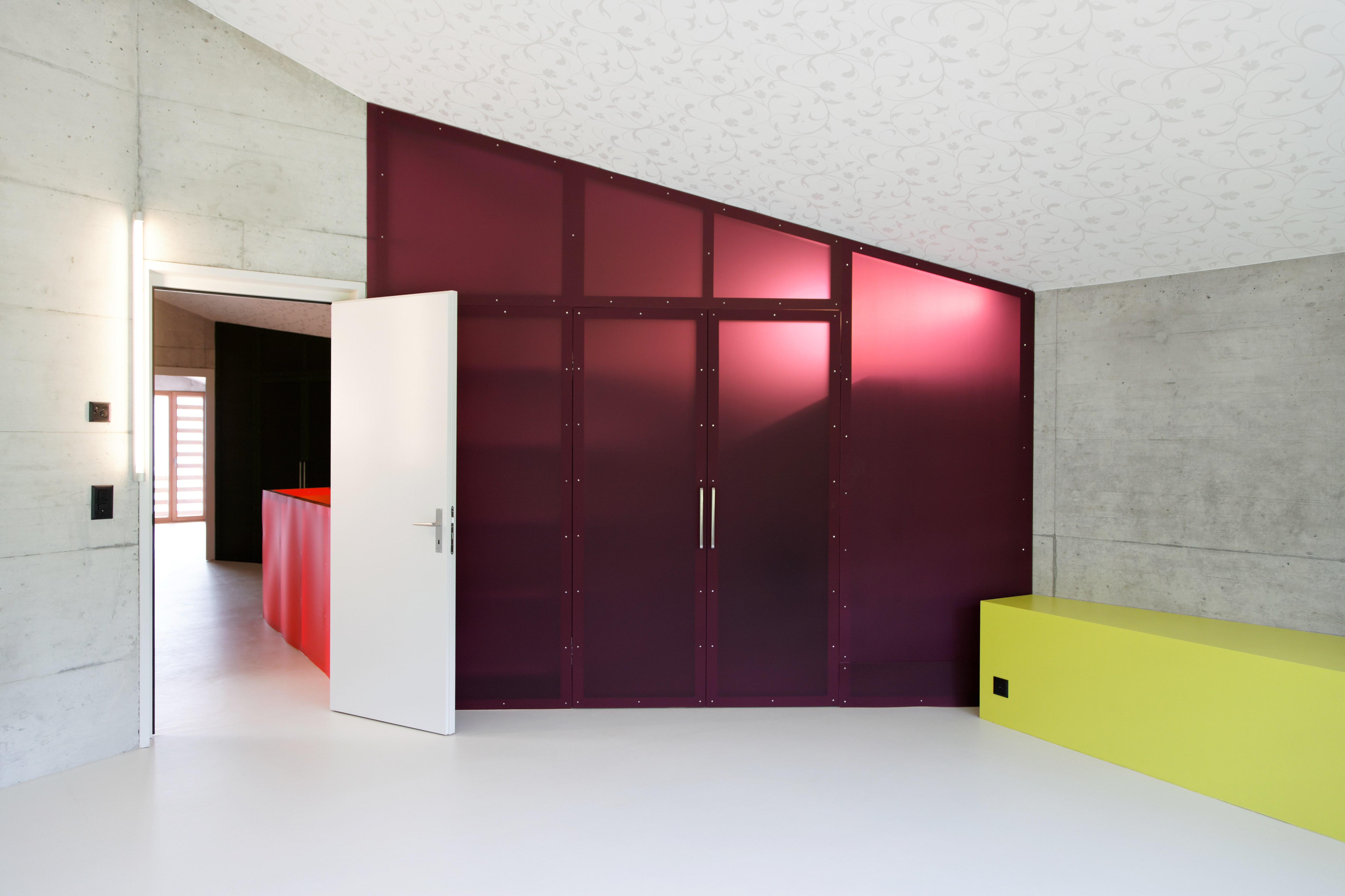 Le bardage en mélèze de la façade joue avec les dimensions des larges baies vitrées, recadrant les ouvertures tout en laissant passer la lumière. À l'intérieur, les murs en béton restent apparents. Une sélection de couleurs vives interagit dans ces espaces minéraux de par leur rayonnement et leur jeu de transparence et de lumière.