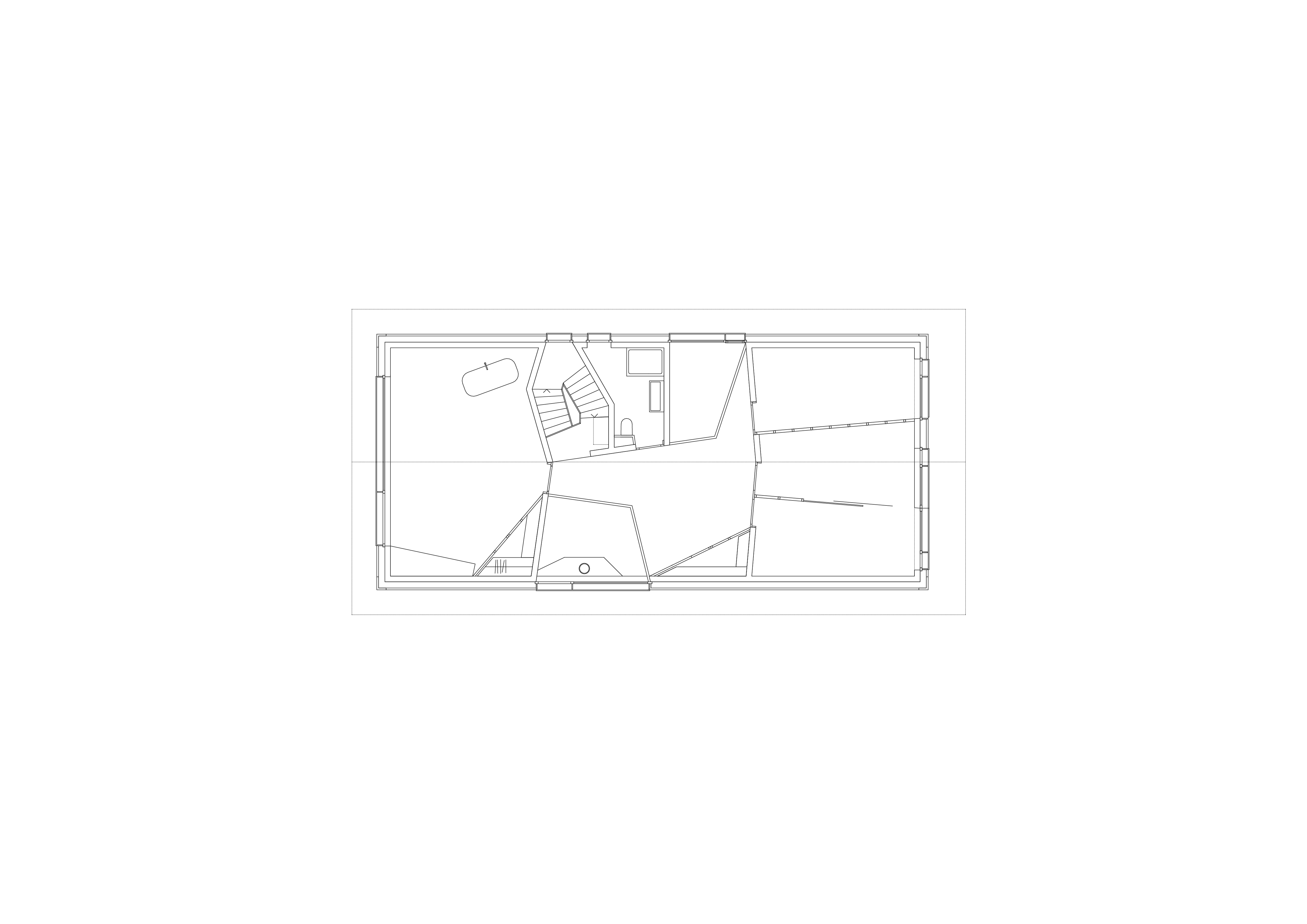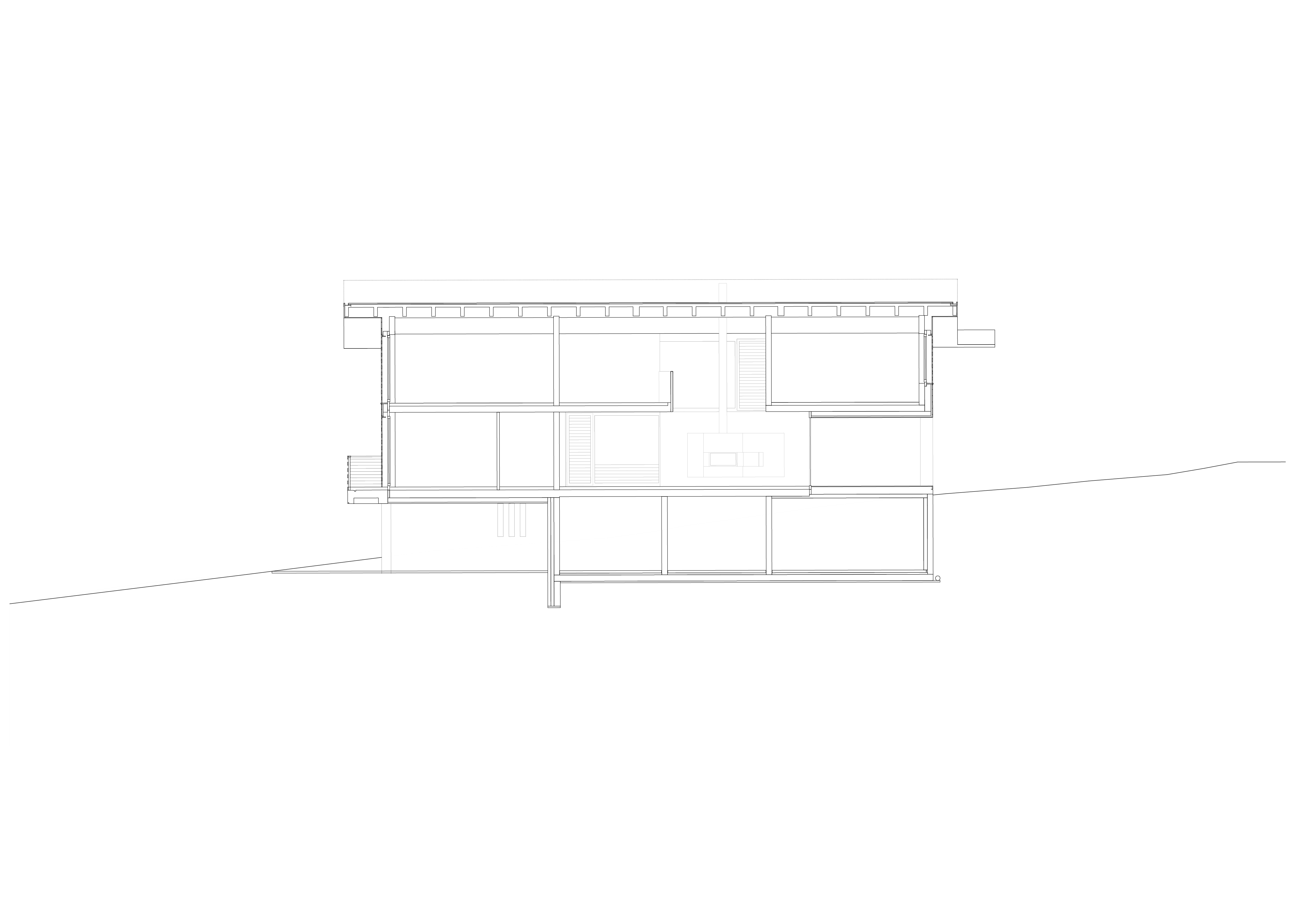 À l’arrivée de l’escalier du rez-de-chaussée supérieur, une cheminée monumentale se dresse dans un vaste espace ouvert rythmé par deux loggias situées aux extrémités opposées. Orienté sur les espaces de vie, cet étage est doté de deux volumes qui structurent l’intérieur. Le premier volume englobe les escaliers et les toilettes, séparant la cuisine du salon et créant, en baïonnette, un coin salle à manger. Le second volume, quant à lui, est constitué d'un mobilier en U intégrant une bibliothèque, délimitant ainsi le bureau.