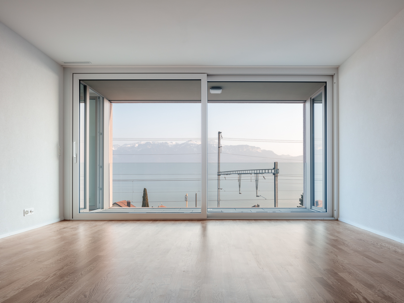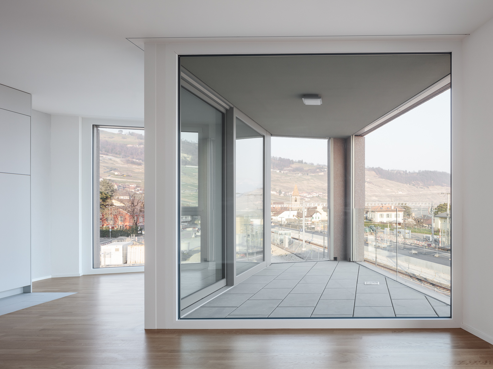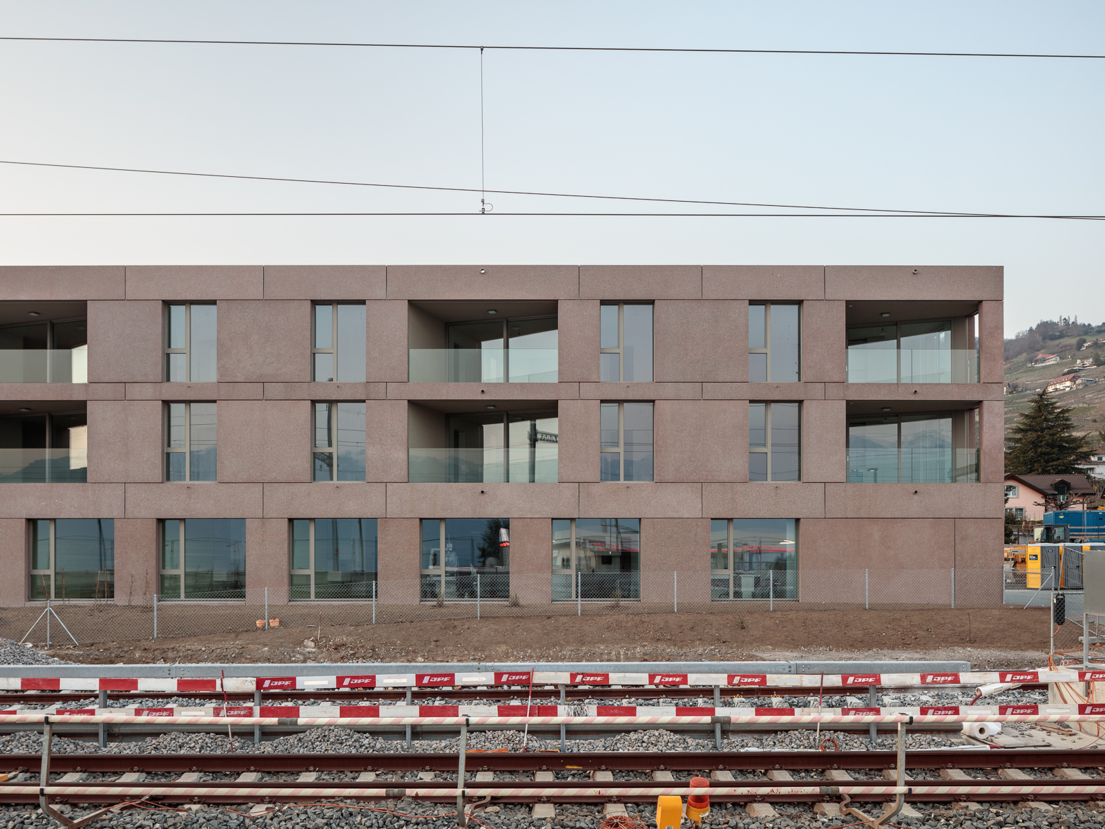 Installé le long des voies ferrées, le bâtiment bénéficie de deux orientations principales : au sud, une vue privilégiée sur le lac Léman, et au nord le panorama du Lavaux, ainsi qu’un ancrage sur la place de la gare et son activité. L’ancienne friche industrielle est métamorphosée et prodigue désormais : une structuration de l’espace public avec deux immeubles mixtes, un parking + rail, un parc au pied de l’école et une place de la gare. Des lieux de rencontre clairs, marqués par une arborisation généreuse et un revêtement de sol en asphalte et graviers concassés. Le batiment implanté à l’ouest du site reçoit des services, avec notamment une série de cabinets médicaux accessibles de plain-pied ; des logements aux typologies variées, tirant pleinement parti de la large surface occupée par le projet ; et un vaste parking souterrain connectant trois bâtiments.
