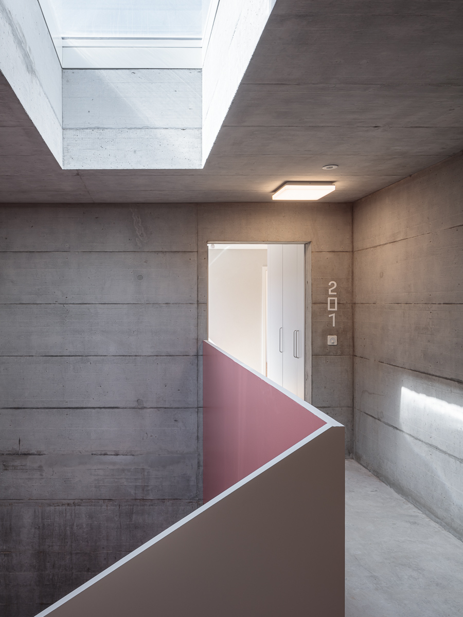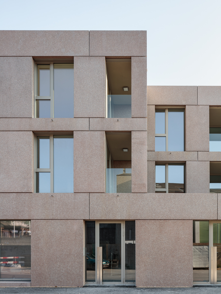 Relativement bas (deux niveaux sur rez), le projet travaille une nappe minérale solide, percée de vitrages toute hauteur, de retraits créant des terrasses sur rue, et d’un patio central permettant de diversifier les vues et les ambiances au sein des logements. Le système constructif, une structure porteuse en béton armé tramée avec rationalité, associée à une façade en béton préfabriqué ocre teinté dans la masse, assure la durabilité de la construction et son ancrage dans le paysage local, marqué par le dialogue rationnel entre minéral et végétal.