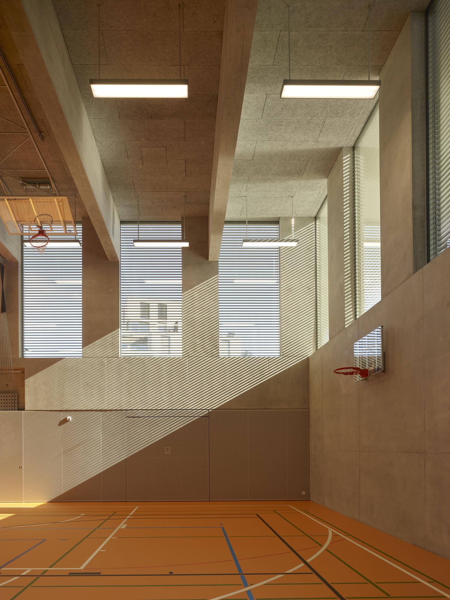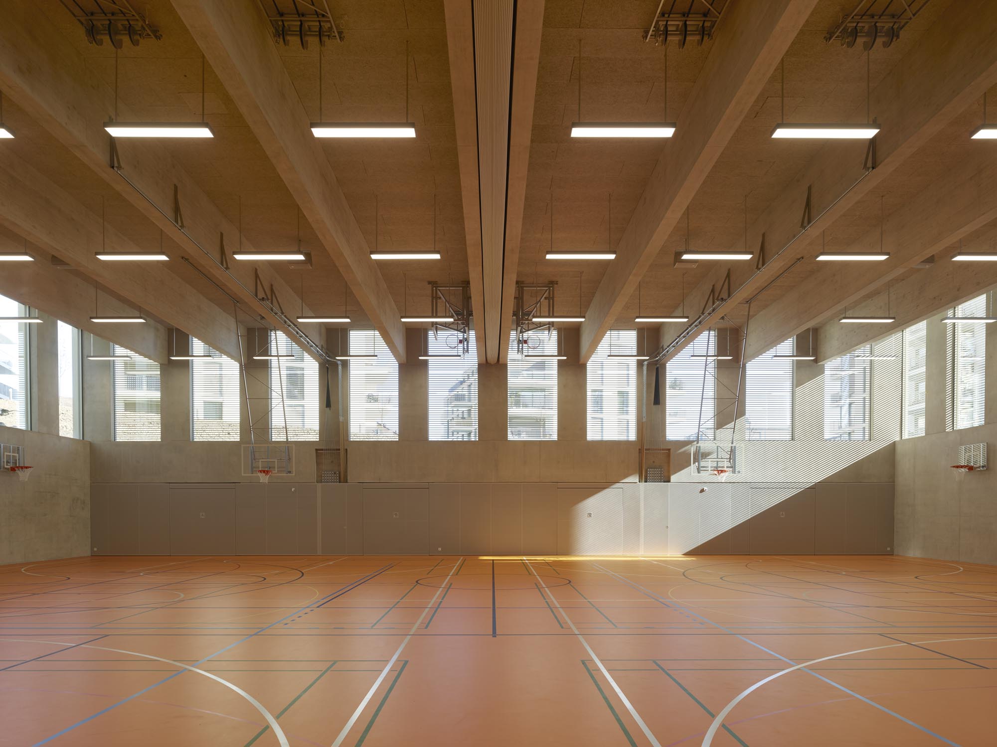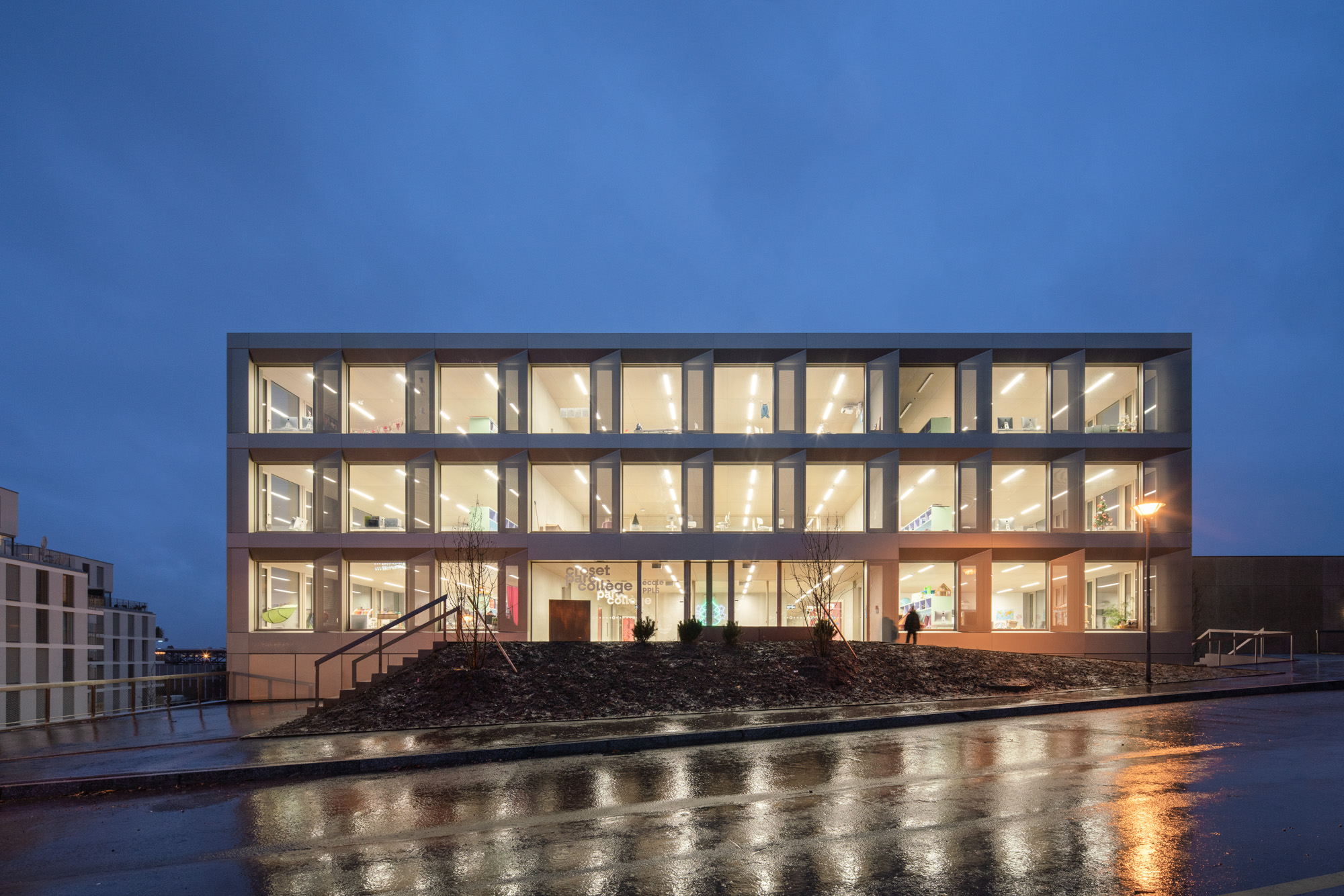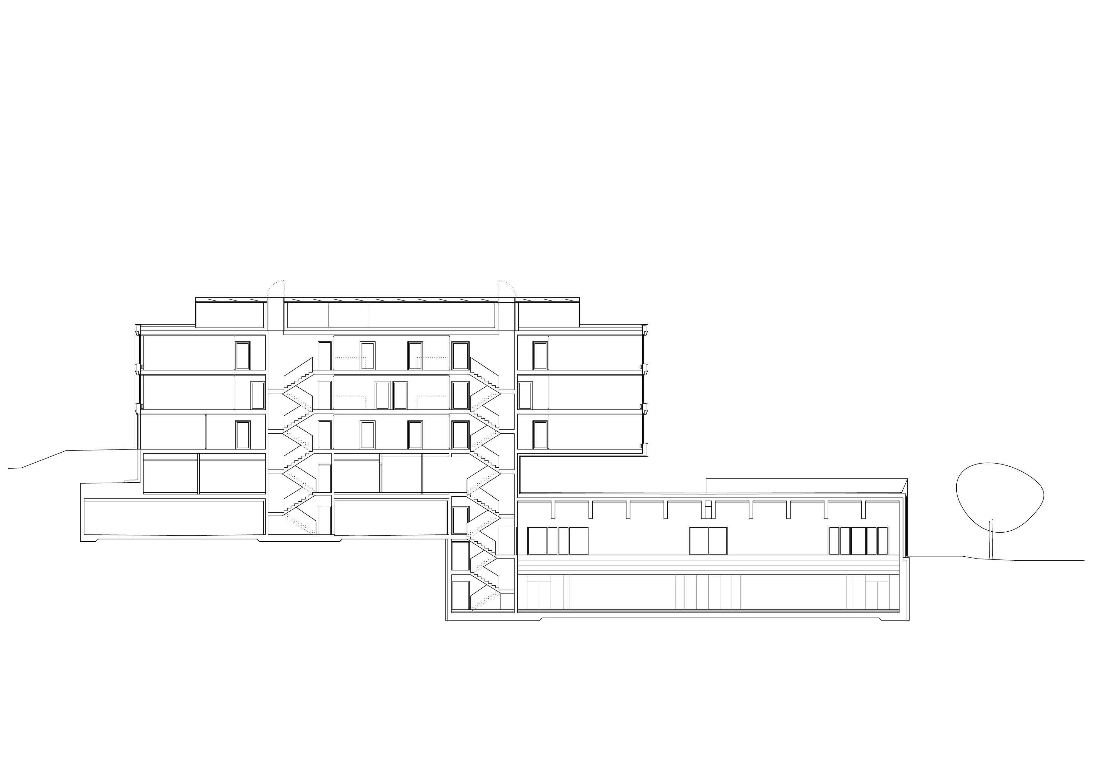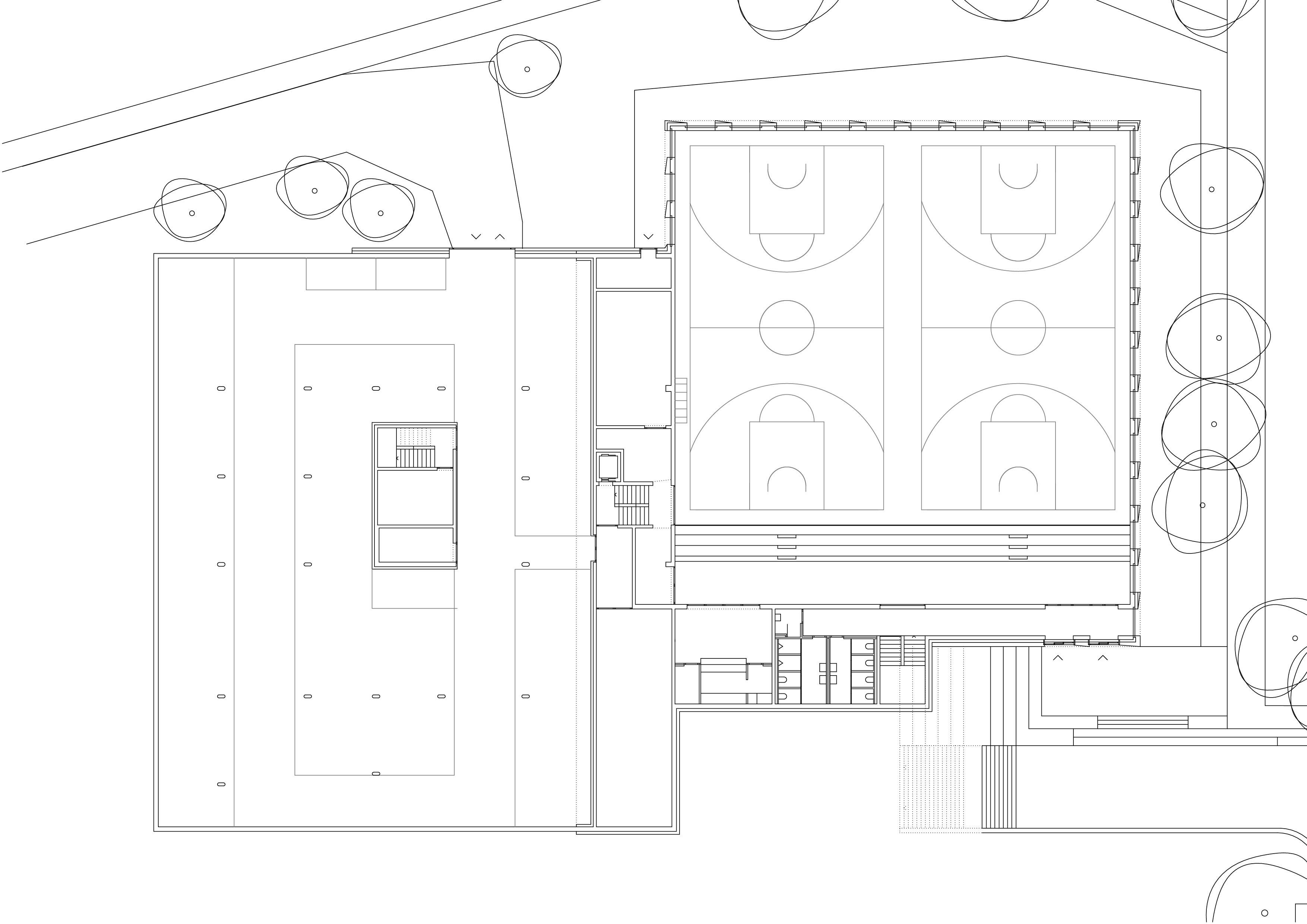 Le décalage des deux volumes en plan permet de dégager des surfaces généreuses de préau. La morphologie du nouveau collège affirme son contenu programmatique. Le volume principal de quatre niveaux contenant le programme scolaire et parascolaire occupe la frange nord du périmètre d’implantation. Le volume accolé et décalé en aval contenant la salle de sport double est enfoncé dans le terrain afin que sa toiture devienne le préau d’école. La rencontre des deux volumes est articulée par le préau couvert, logé sous le porte-à-faux. L’organisation intérieure tire parti de la pente pour offrir plusieurs entrées. L’école présente deux niveaux en contact avec le sol. Le rez inférieur s’ouvre sur le préau. Il reçoit l’accueil parascolaire. Le rez supérieur comporte une entrée sur rue. Il comporte les espaces PPLS et une aile de classes. La salle de sport a son entrée face au terrain de sport. Deux cages d’escaliers relient les différents programmes superposés.