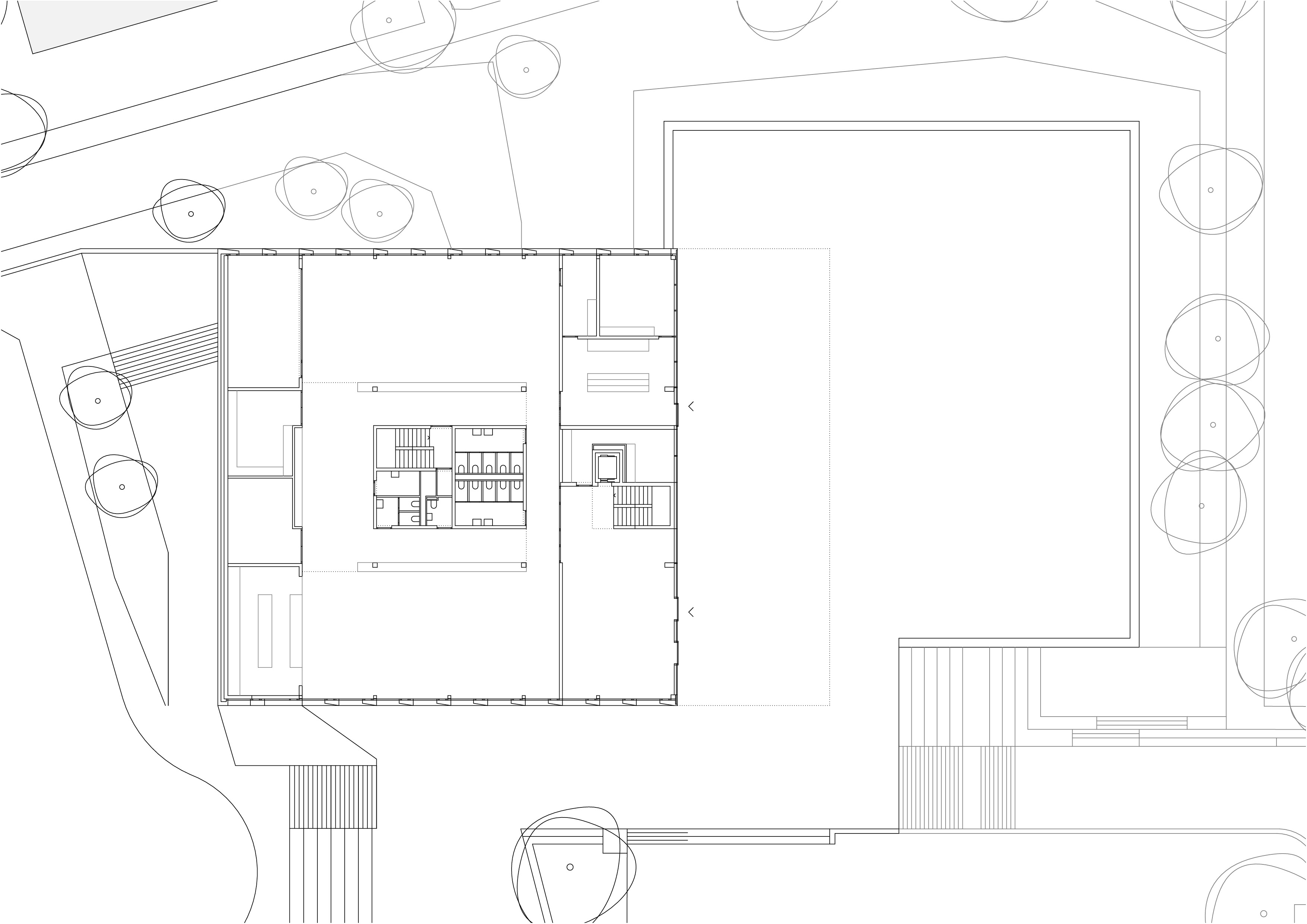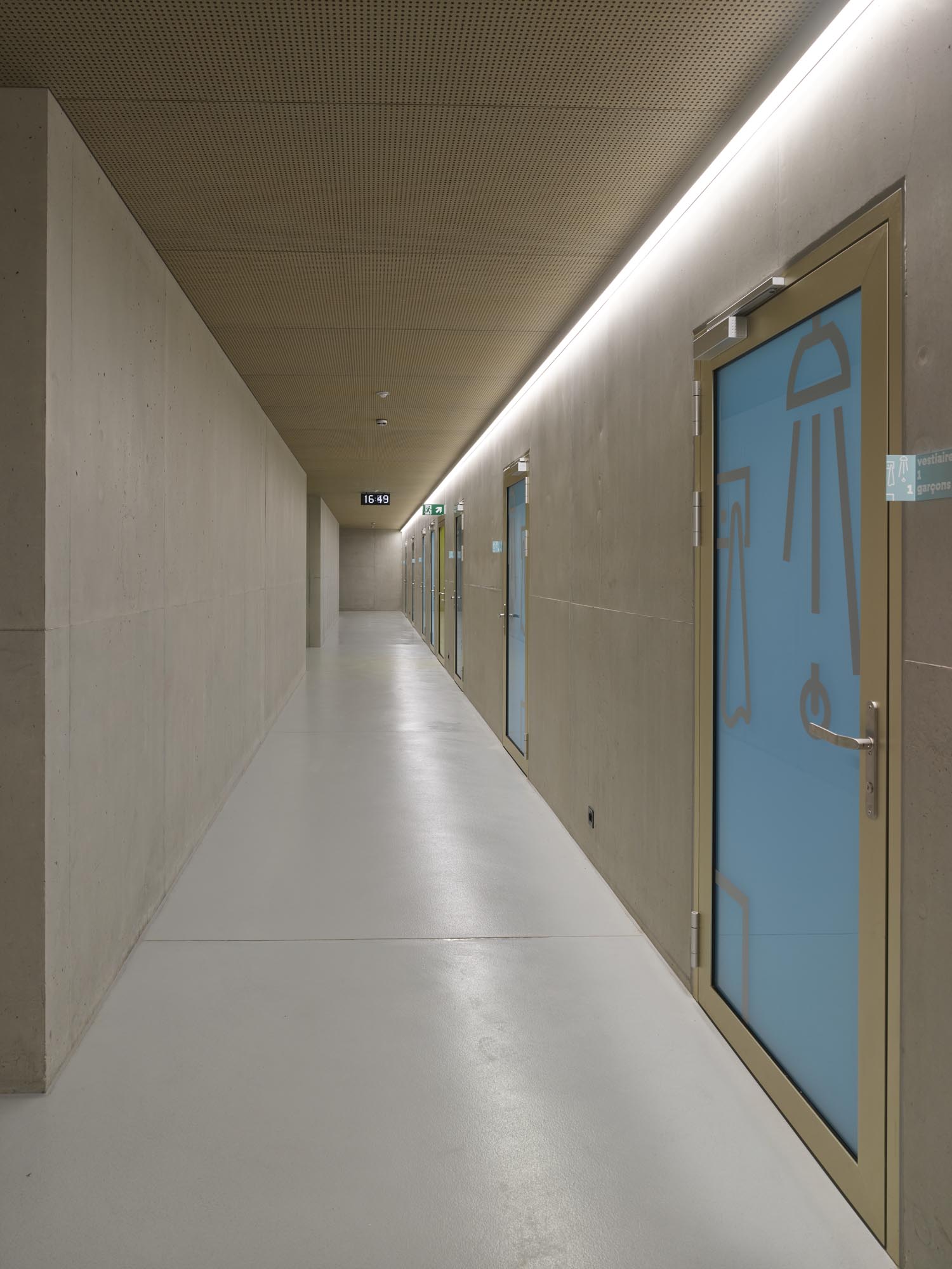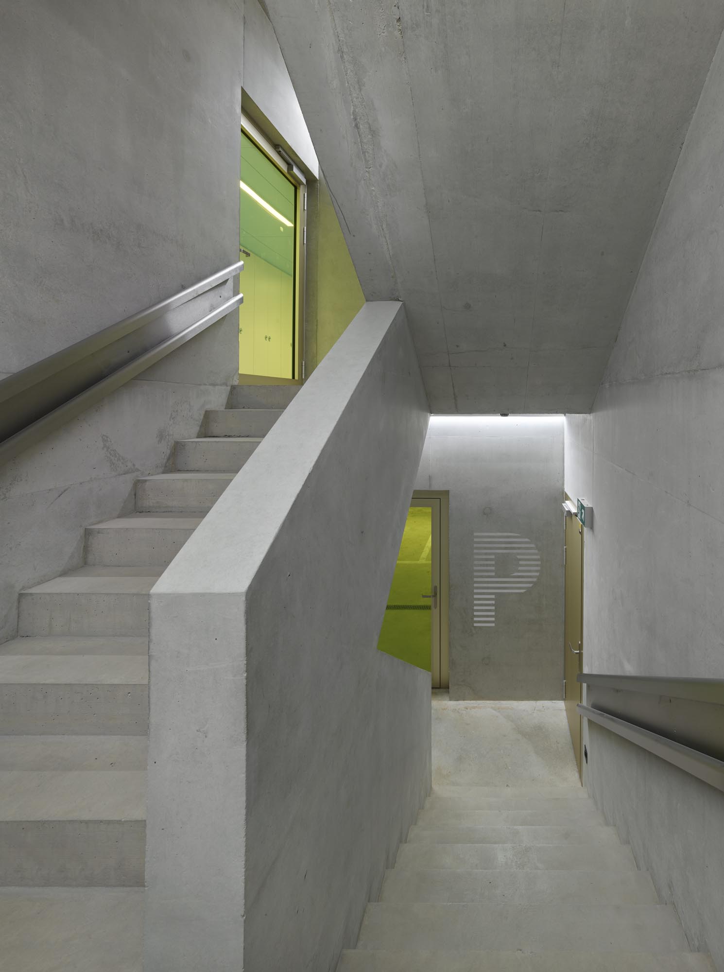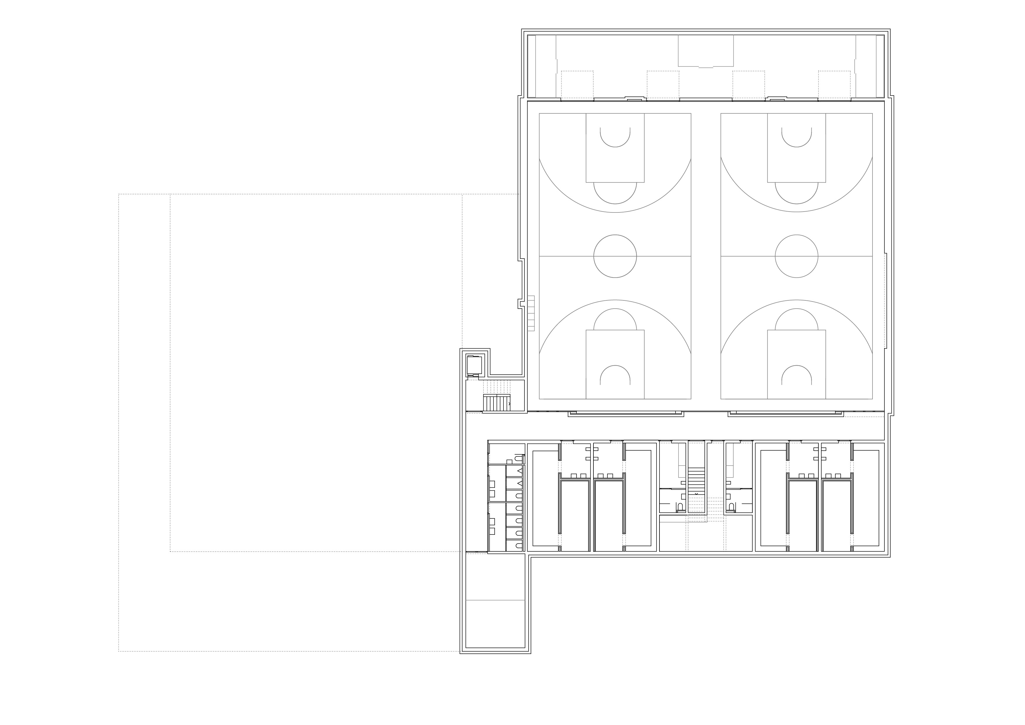Le décalage des deux volumes en plan permet de dégager des surfaces généreuses de préau. La morphologie du nouveau collège affirme son contenu programmatique. Le volume principal de quatre niveaux contenant le programme scolaire et parascolaire occupe la frange nord du périmètre d’implantation. Le volume accolé et décalé en aval contenant la salle de sport double est enfoncé dans le terrain afin que sa toiture devienne le préau d’école. La rencontre des deux volumes est articulée par le préau couvert, logé sous le porte-à-faux. L’organisation intérieure tire parti de la pente pour offrir plusieurs entrées. L’école présente deux niveaux en contact avec le sol. Le rez inférieur s’ouvre sur le préau. Il reçoit l’accueil parascolaire. Le rez supérieur comporte une entrée sur rue. Il comporte les espaces PPLS et une aile de classes. La salle de sport a son entrée face au terrain de sport. Deux cages d’escaliers relient les différents programmes superposés.