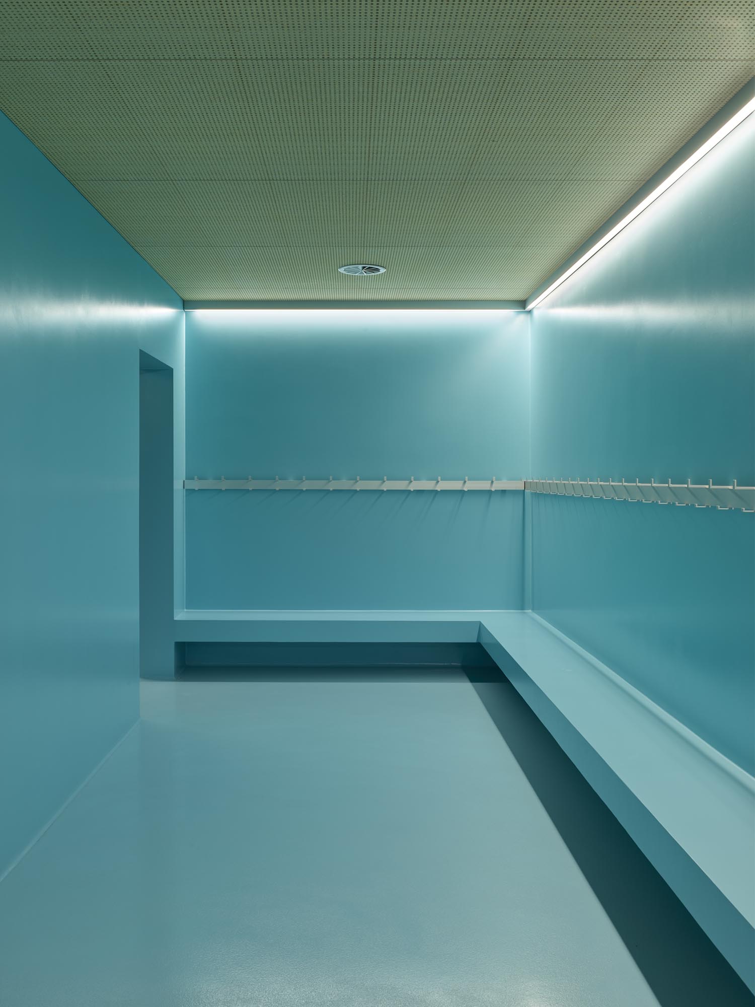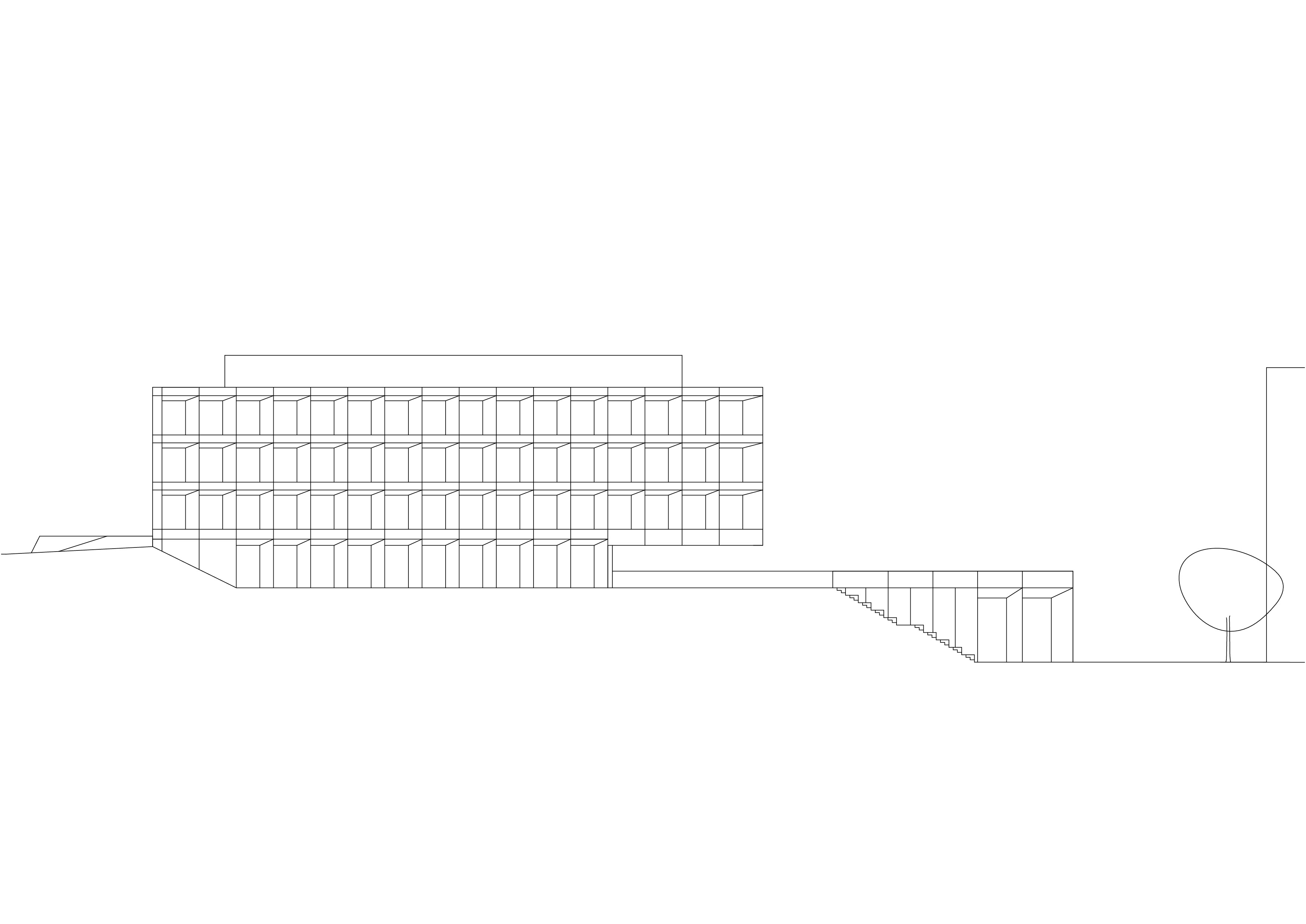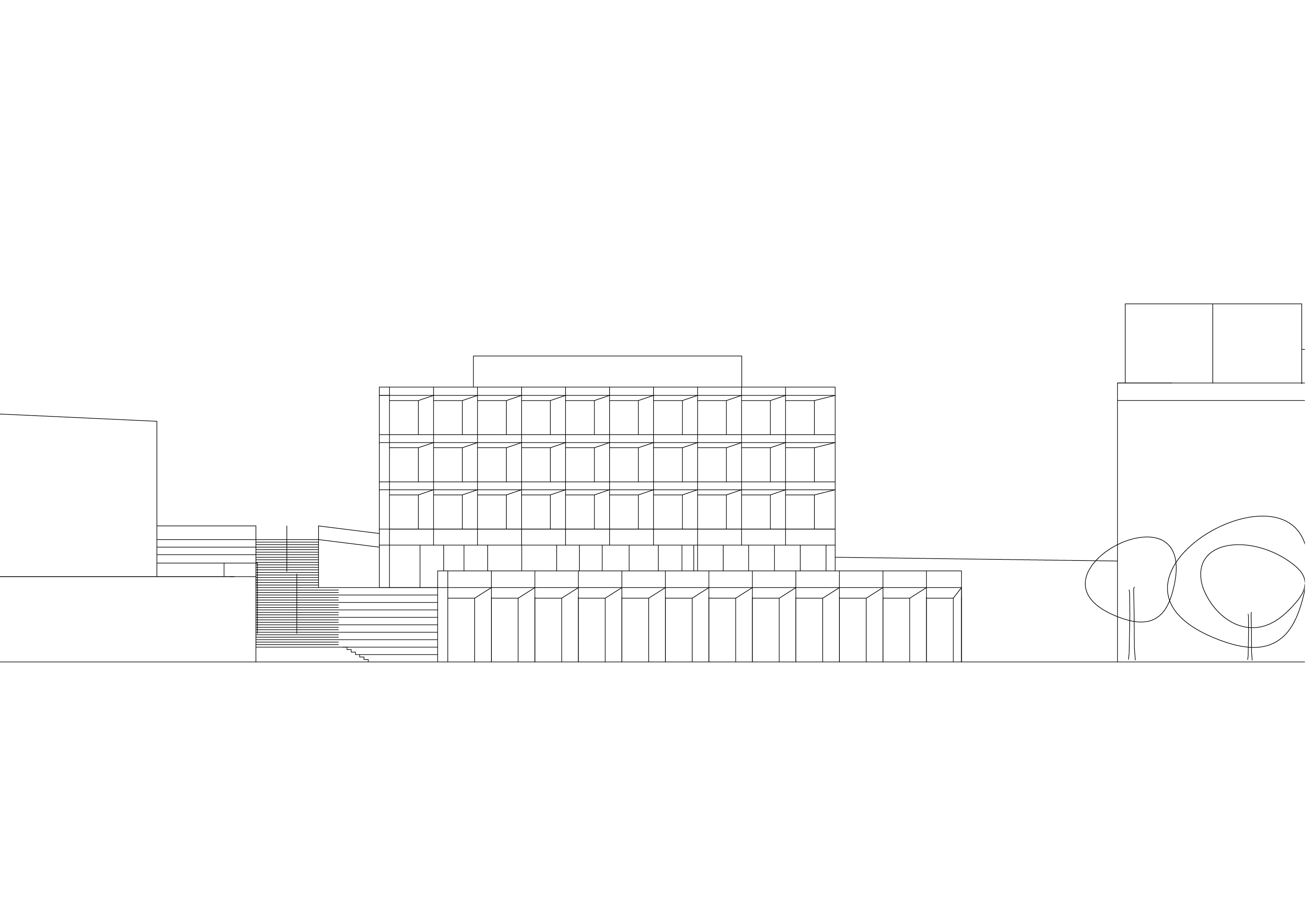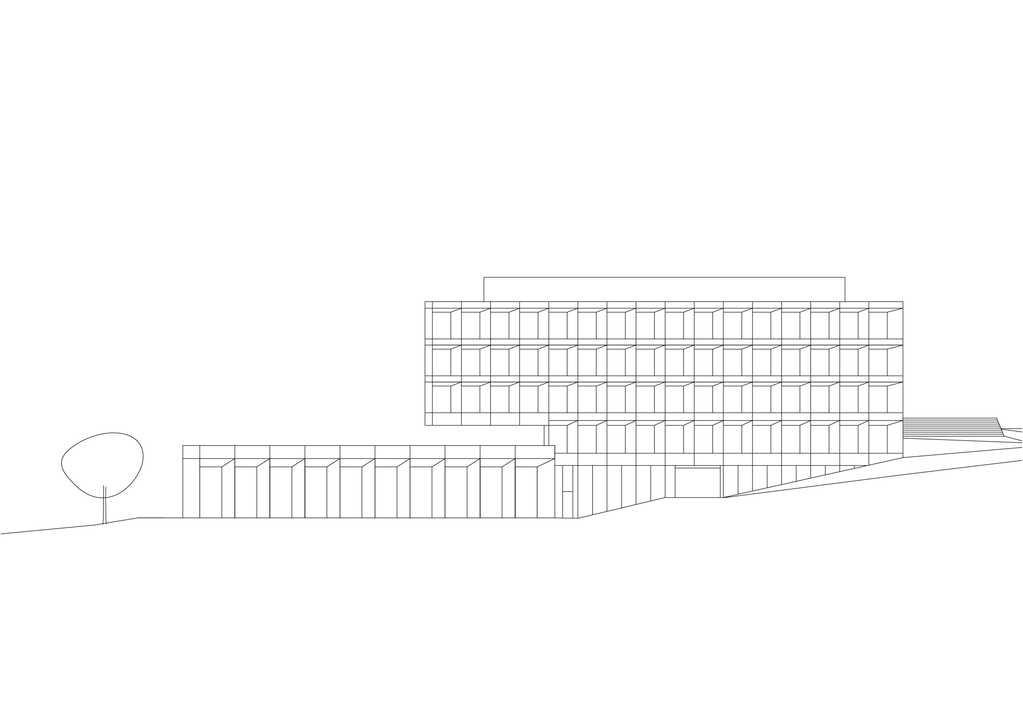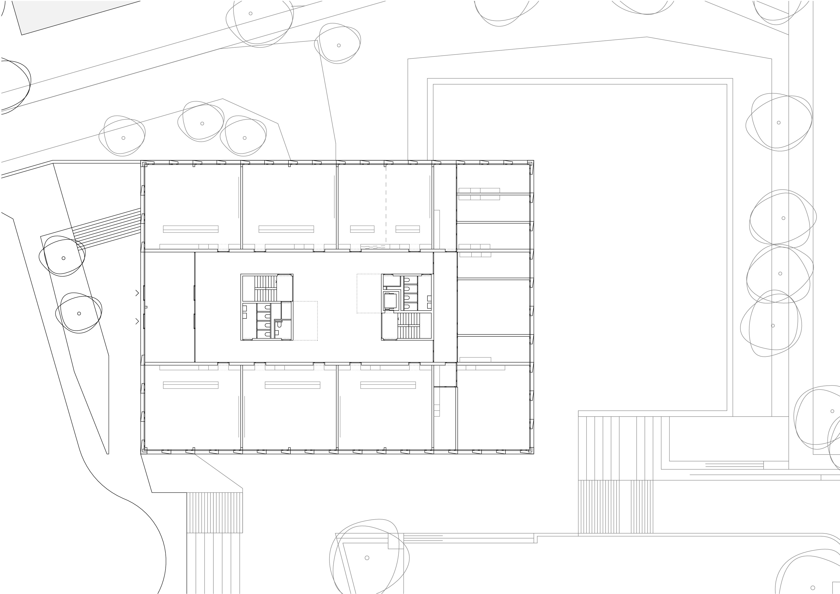 Le décalage des deux volumes en plan permet de dégager des surfaces généreuses de préau. La morphologie du nouveau collège affirme son contenu programmatique. Le volume principal de quatre niveaux contenant le programme scolaire et parascolaire occupe la frange nord du périmètre d’implantation. Le volume accolé et décalé en aval contenant la salle de sport double est enfoncé dans le terrain afin que sa toiture devienne le préau d’école. La rencontre des deux volumes est articulée par le préau couvert, logé sous le porte-à-faux. L’organisation intérieure tire parti de la pente pour offrir plusieurs entrées. L’école présente deux niveaux en contact avec le sol. Le rez inférieur s’ouvre sur le préau. Il reçoit l’accueil parascolaire. Le rez supérieur comporte une entrée sur rue. Il comporte les espaces PPLS et une aile de classes. La salle de sport a son entrée face au terrain de sport. Deux cages d’escaliers relient les différents programmes superposés.