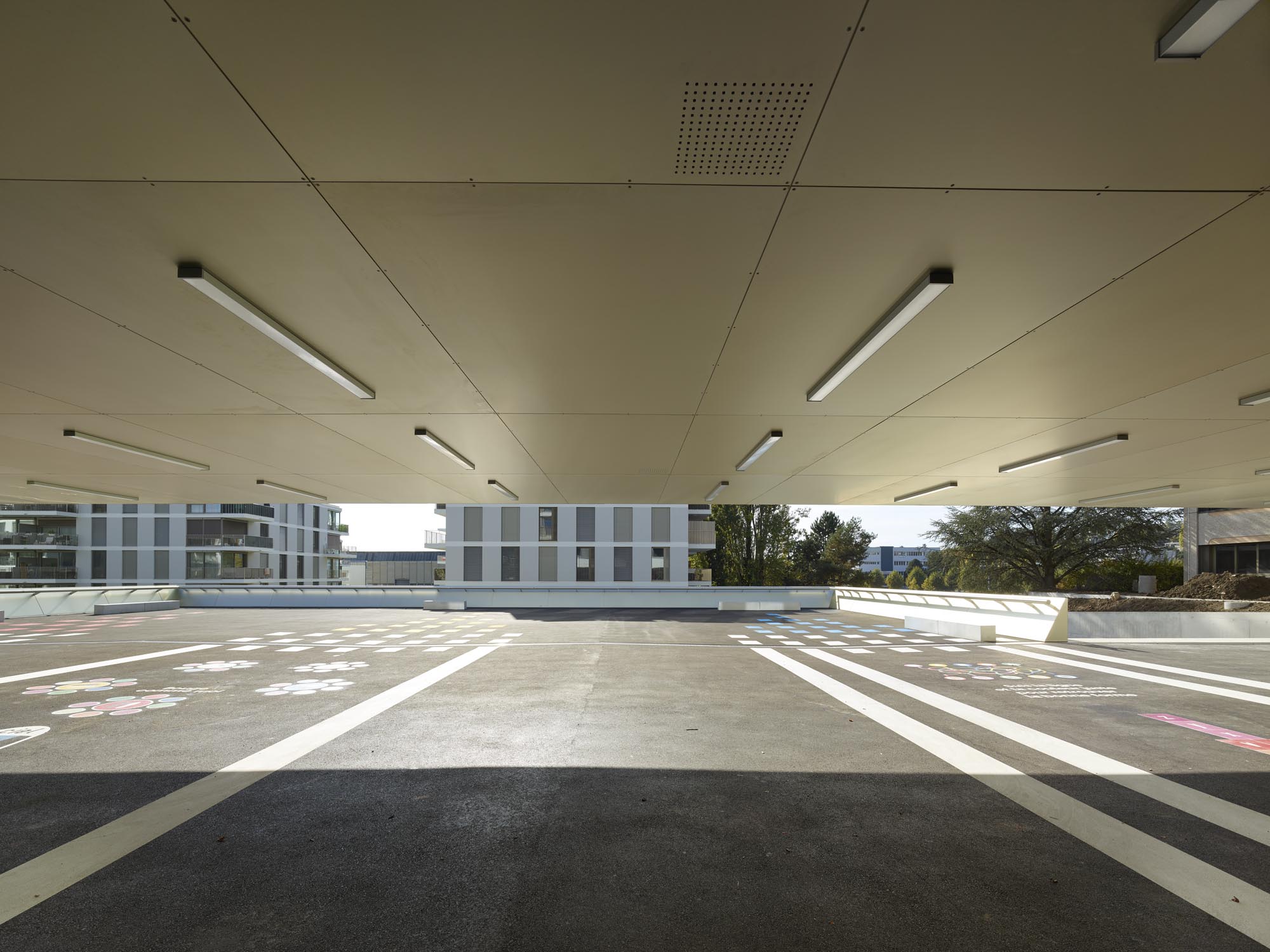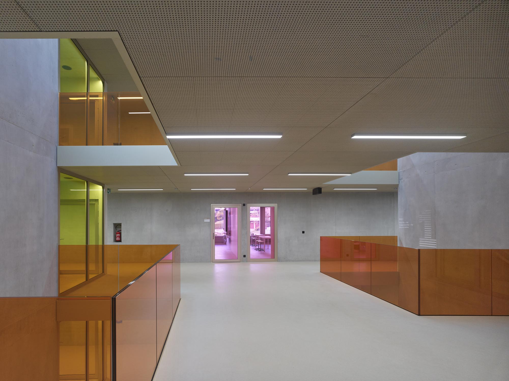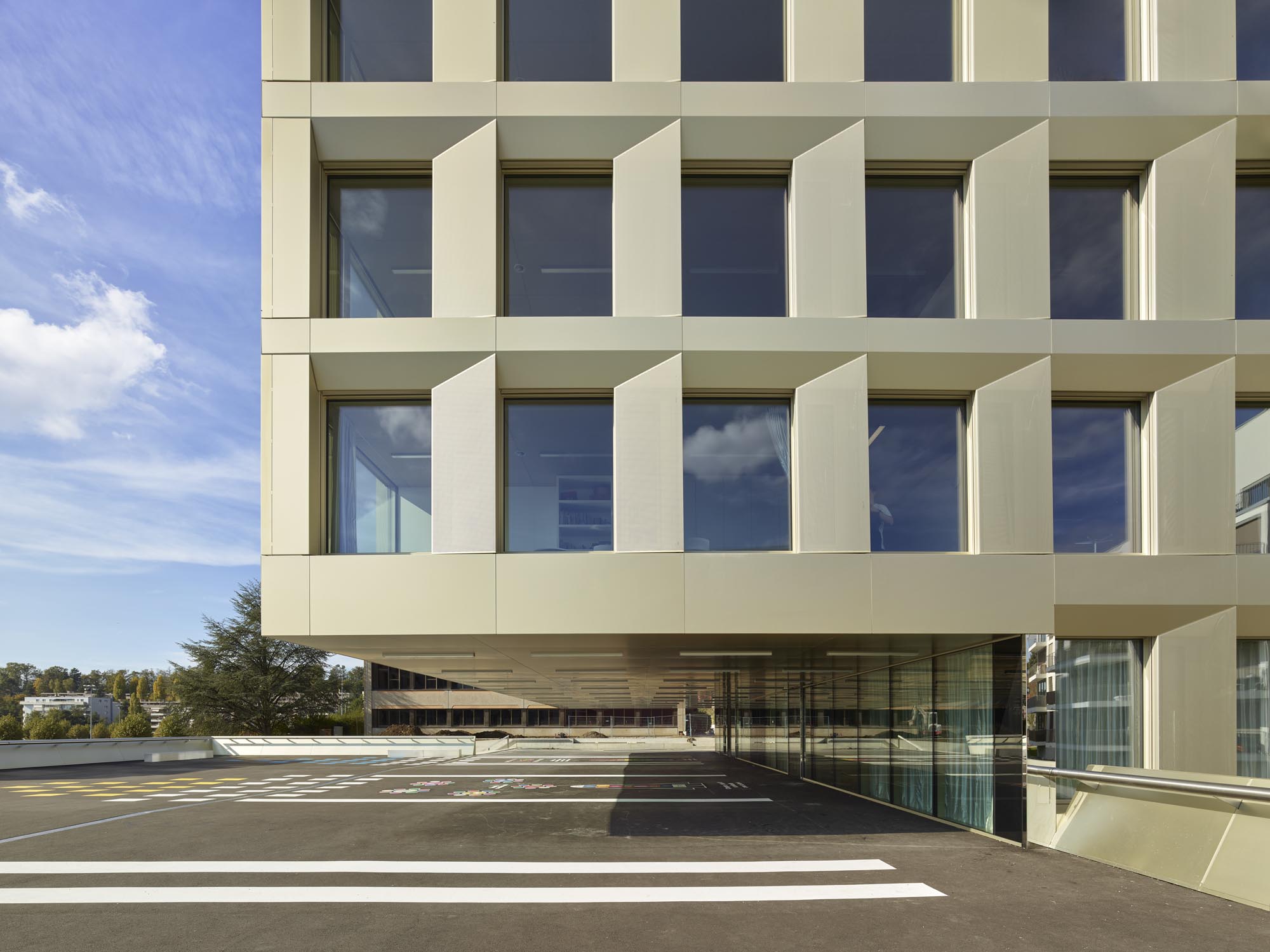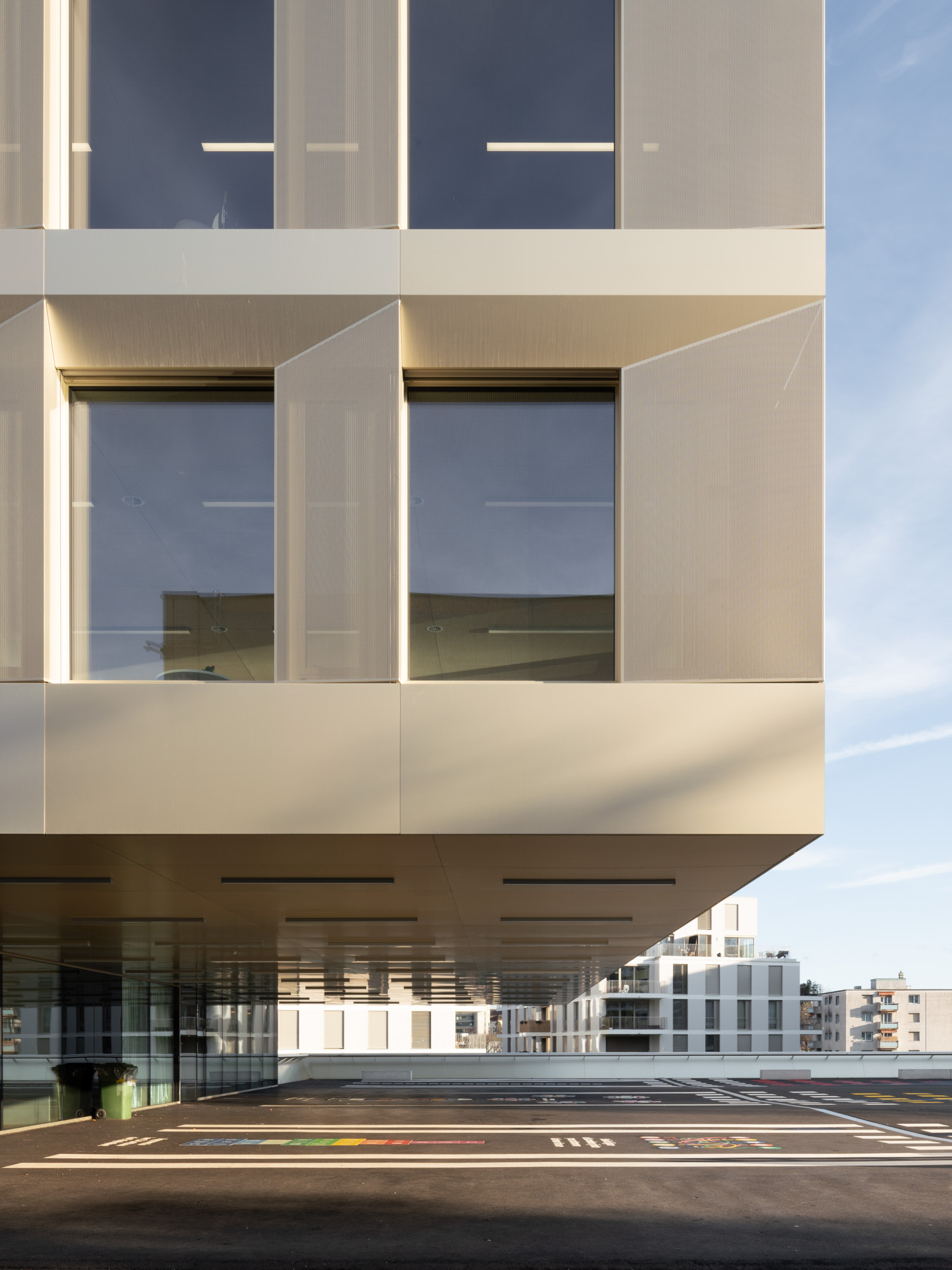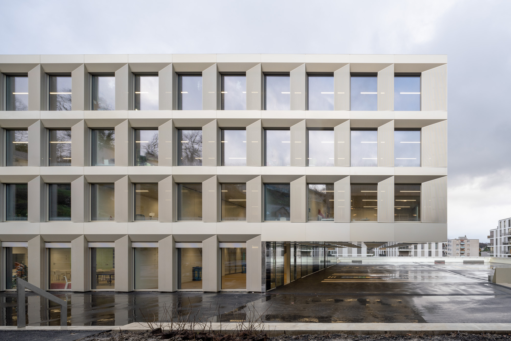 La typologie de l’école présente trois travées : les salles de classe s’ouvrent en façades est et ouest alors que le hall central jouit d’une transparence nord sud, rendue possible par l’implantation des salles spéciales : maîtres, acm/act et dégagement. Un vide central éclairé par une lumière zénithale relie spatialement les trois niveaux de l’école. La structure est en béton. Les deux voiles définissant les travées longitudinales permettent la descente des charges statiques sans appui sur la dalle de la salle de sport, créant ainsi un espace du préau couvert sans entrave. La façade est composée de modules préfabriqués, intégrant le vitrage fixe et sa partie ouvrante, le store et le capot de finition aluminium.