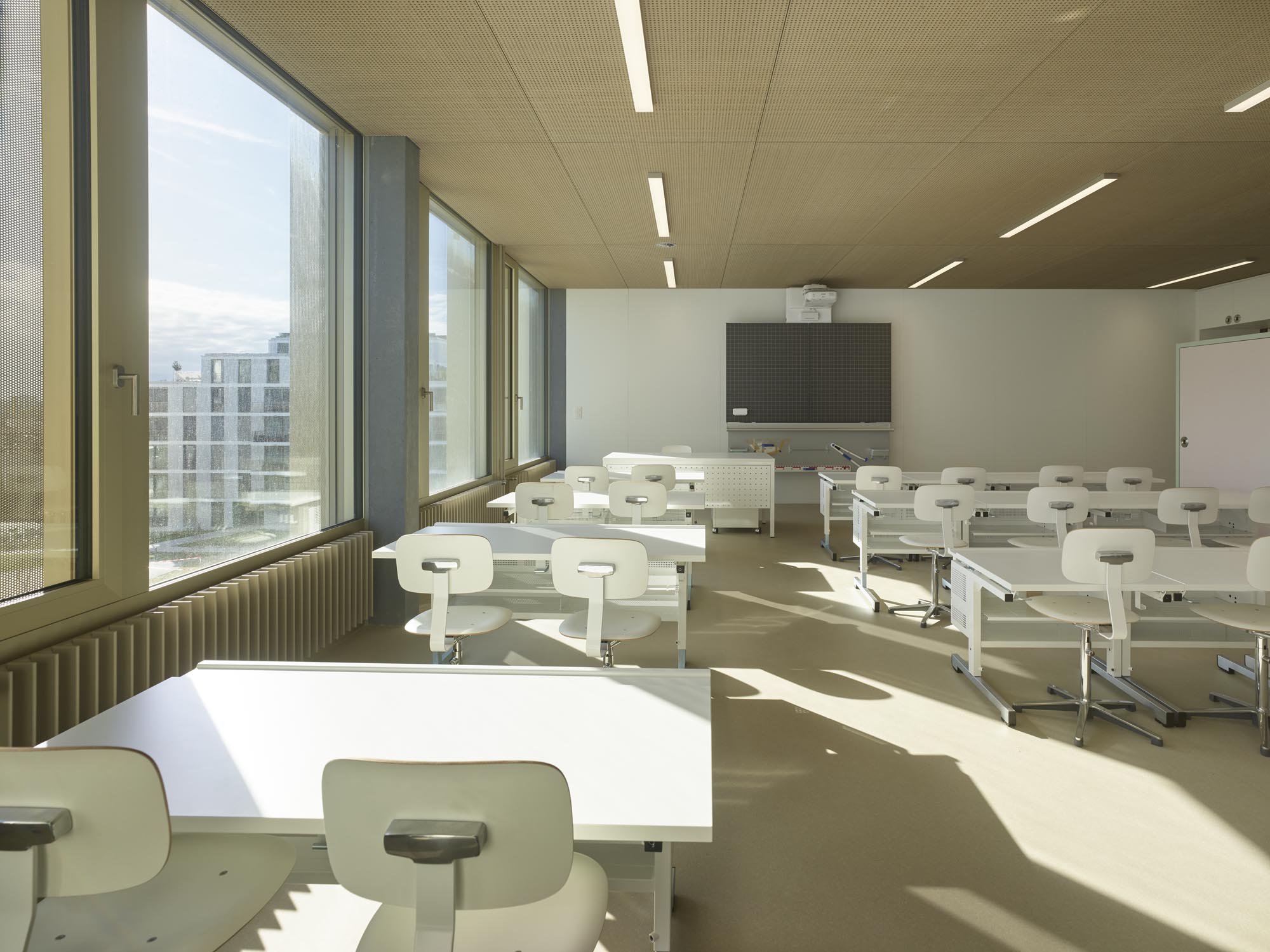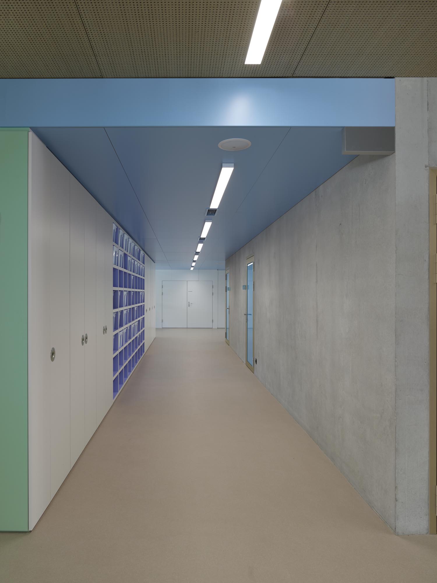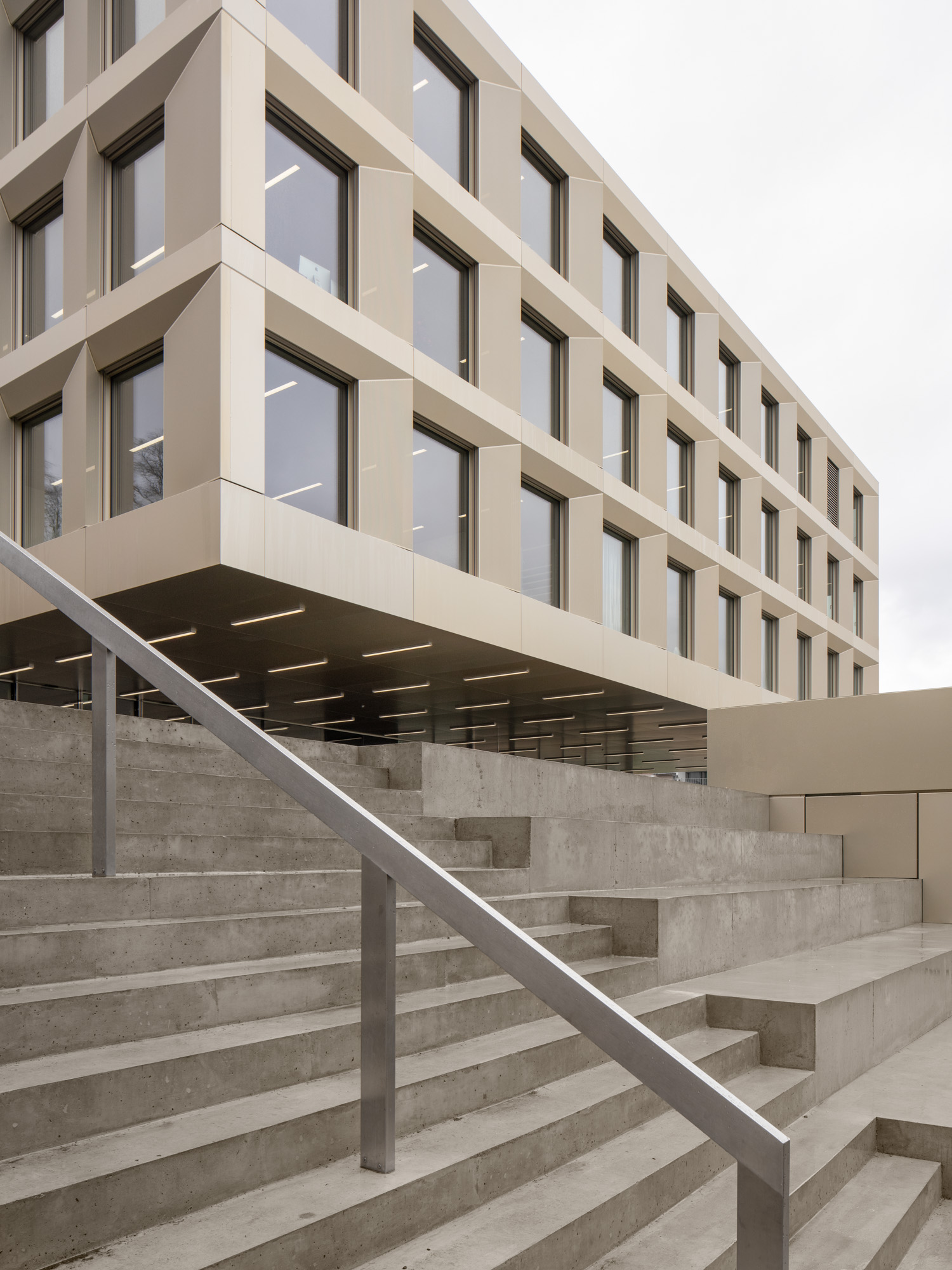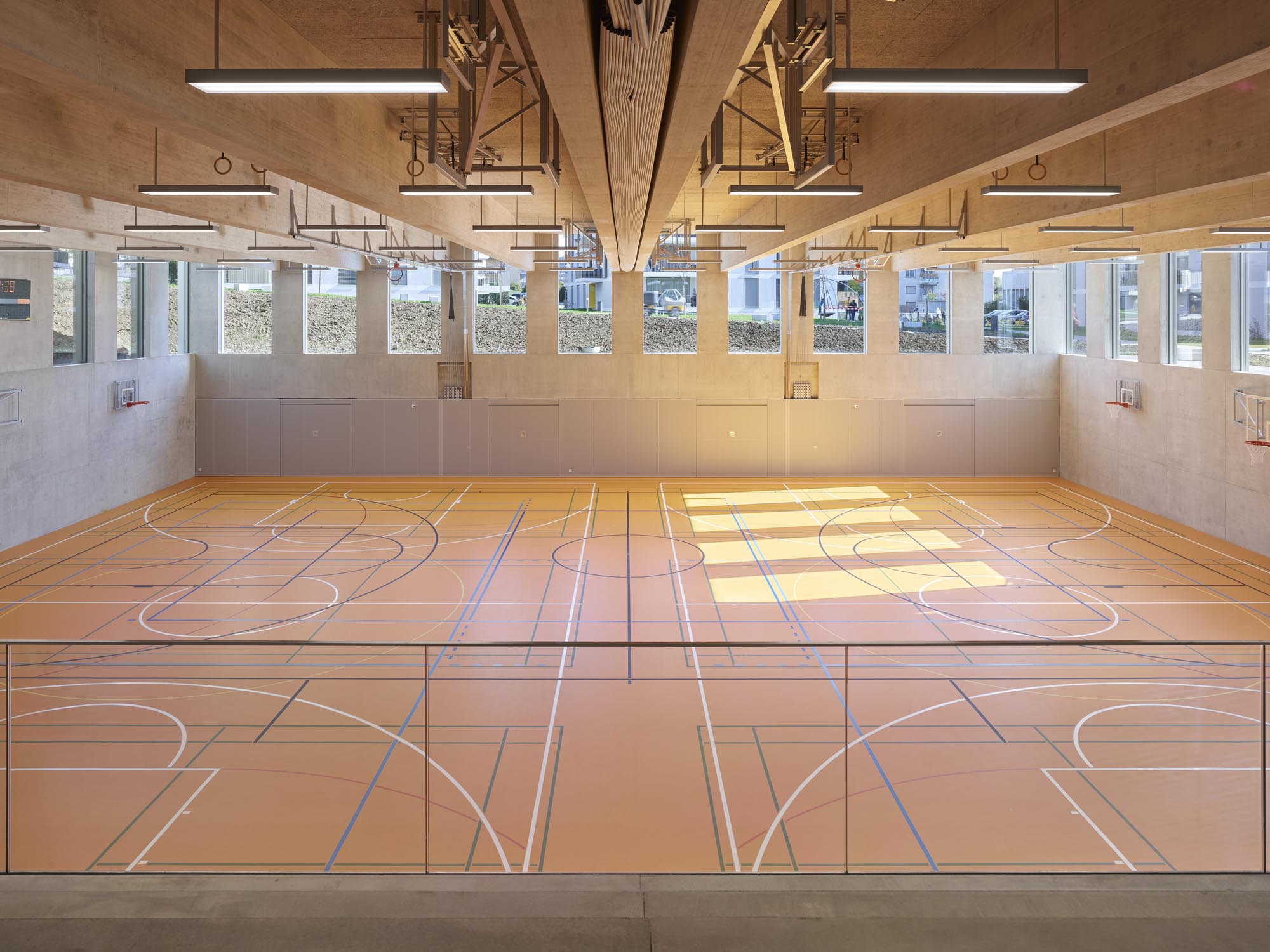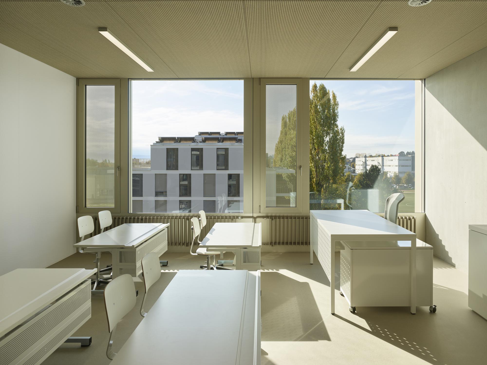 La typologie de l’école présente trois travées : les salles de classe s’ouvrent en façades est et ouest alors que le hall central jouit d’une transparence nord sud, rendue possible par l’implantation des salles spéciales : maîtres, acm/act et dégagement. Un vide central éclairé par une lumière zénithale relie spatialement les trois niveaux de l’école. La structure est en béton. Les deux voiles définissant les travées longitudinales permettent la descente des charges statiques sans appui sur la dalle de la salle de sport, créant ainsi un espace du préau couvert sans entrave. La façade est composée de modules préfabriqués, intégrant le vitrage fixe et sa partie ouvrante, le store et le capot de finition aluminium.