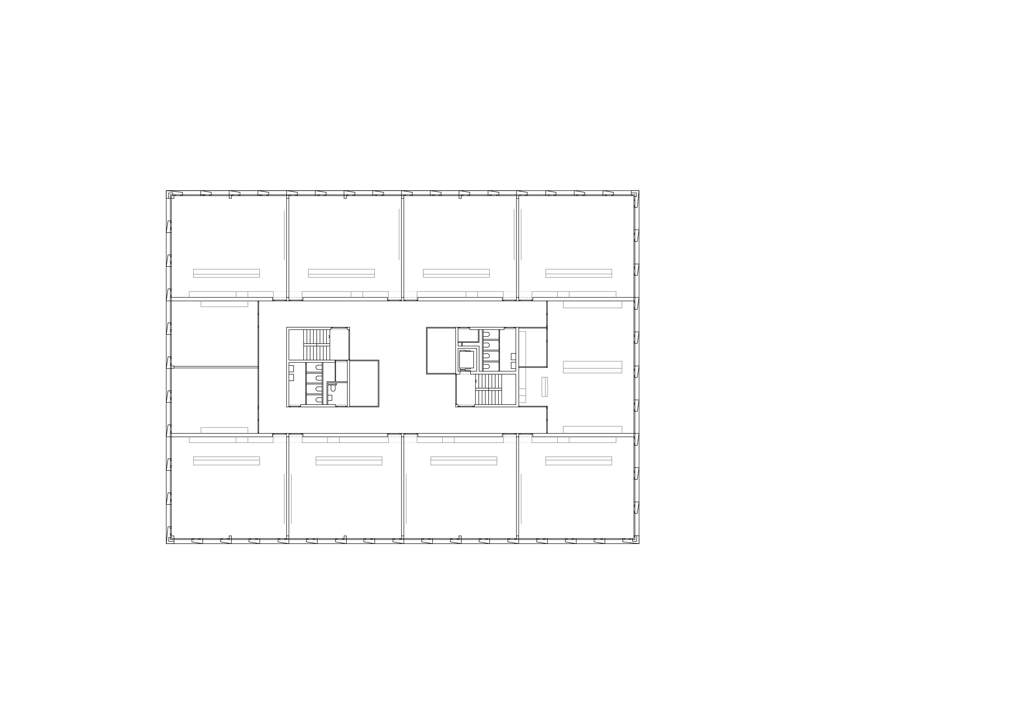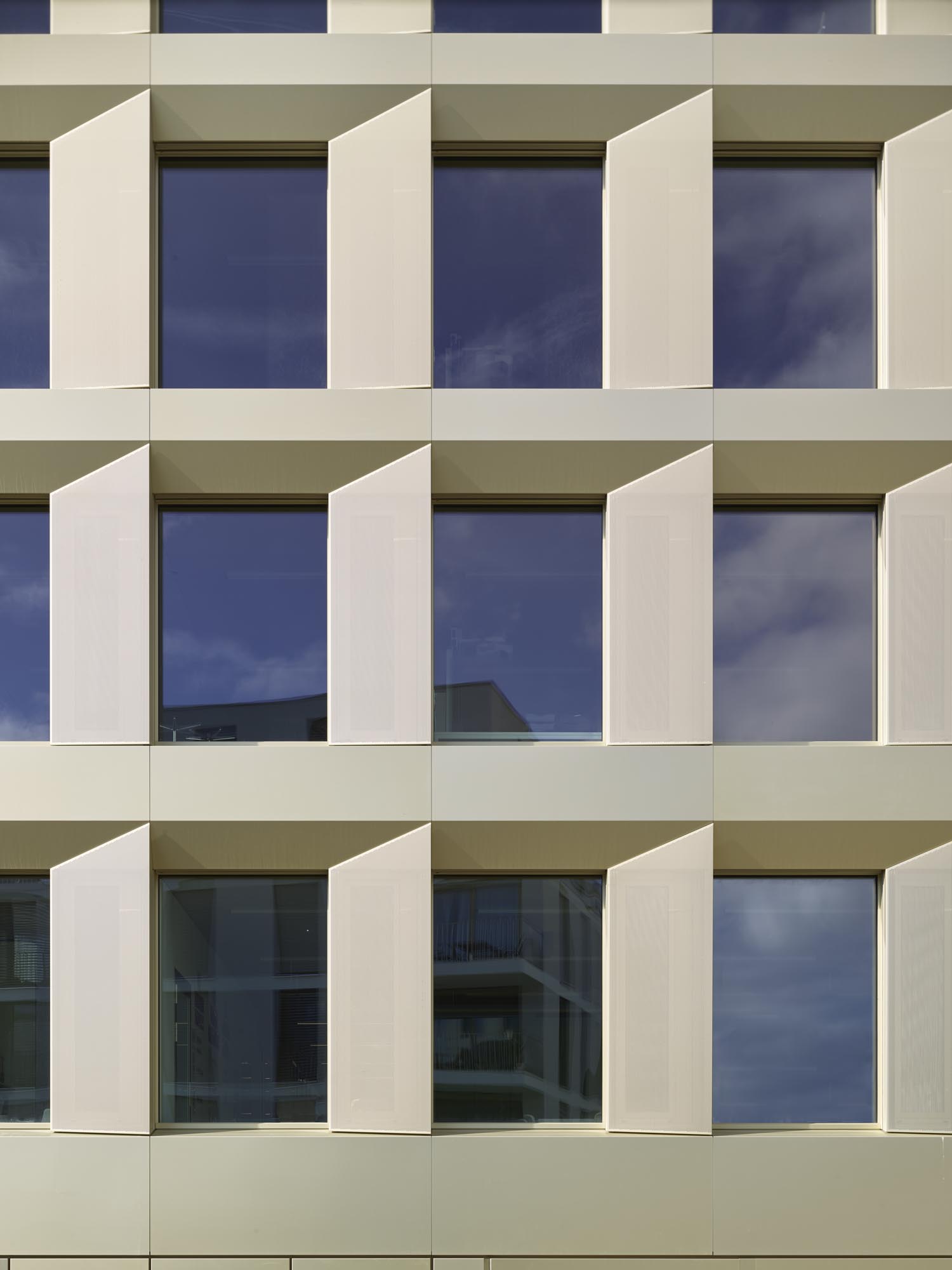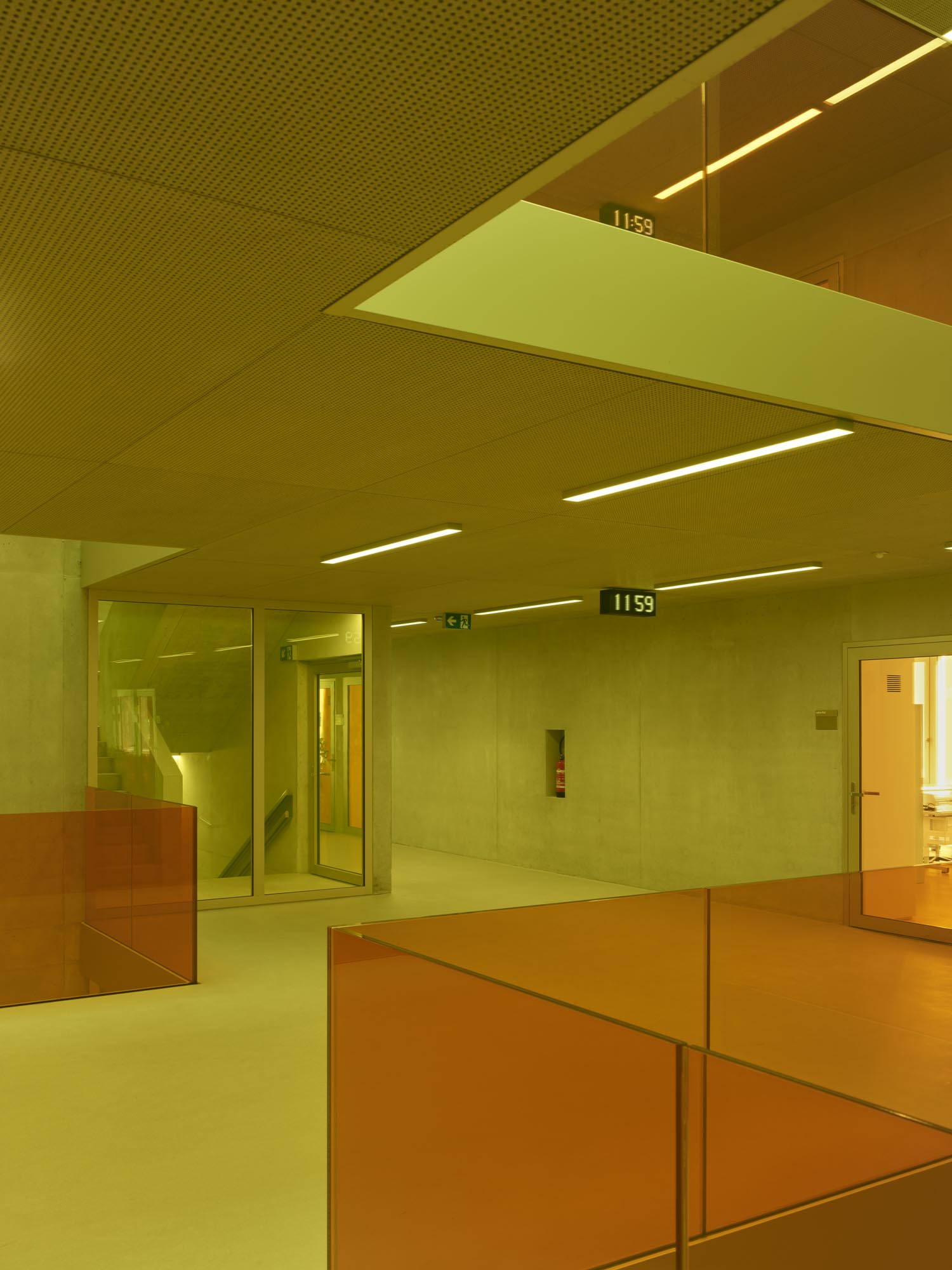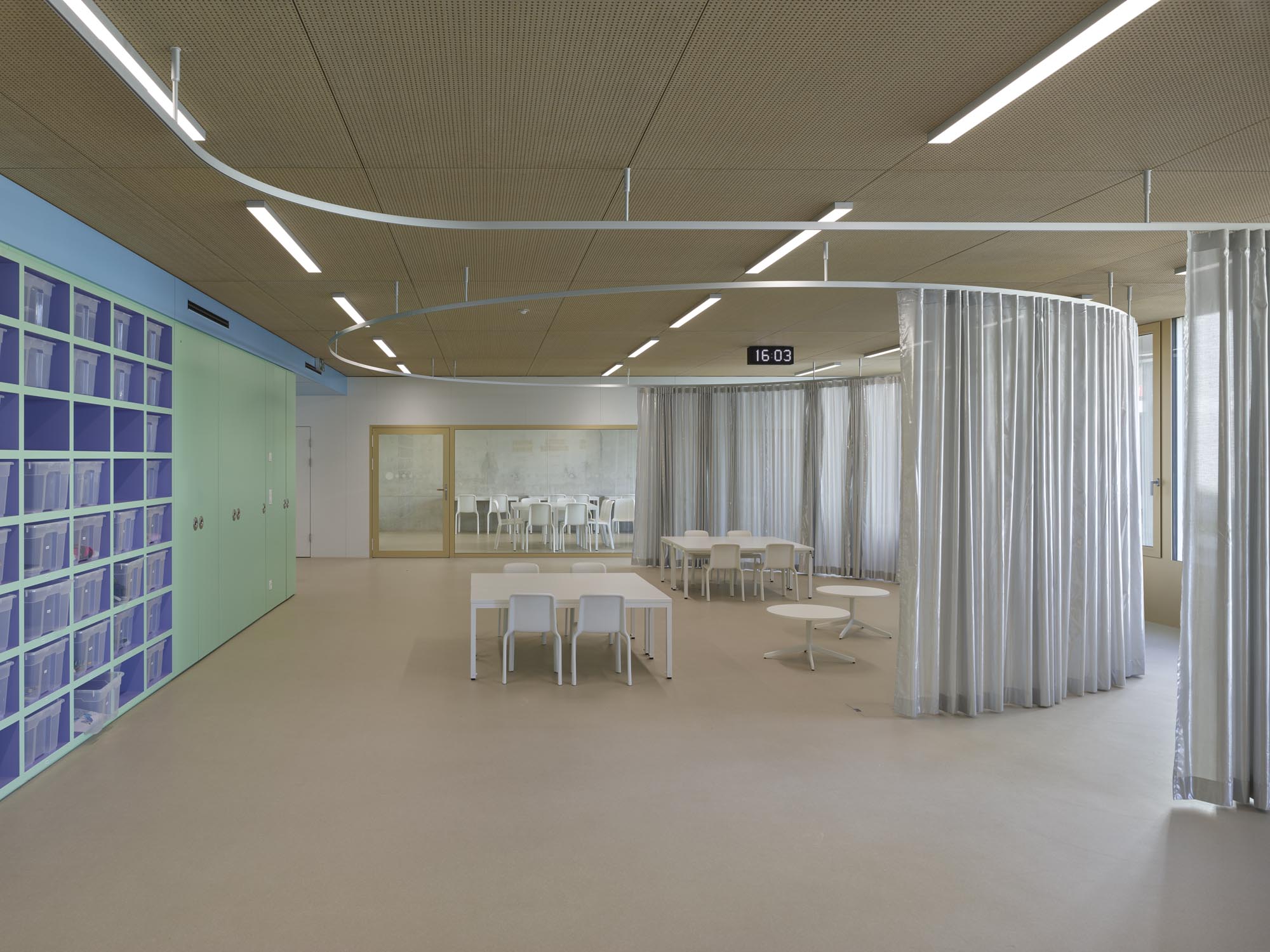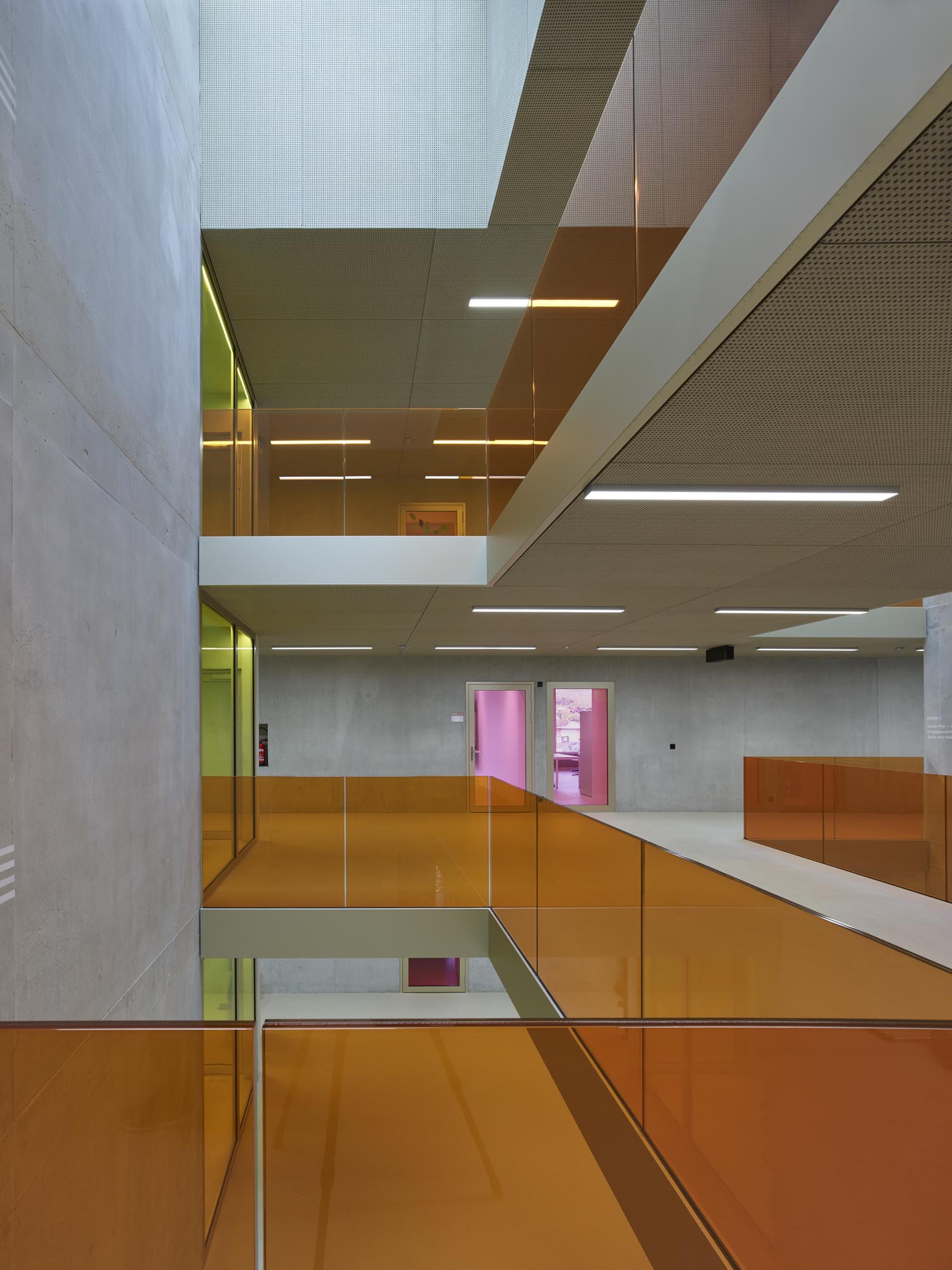 La typologie de l’école présente trois travées : les salles de classe s’ouvrent en façades est et ouest alors que le hall central jouit d’une transparence nord sud, rendue possible par l’implantation des salles spéciales : maîtres, acm/act et dégagement. Un vide central éclairé par une lumière zénithale relie spatialement les trois niveaux de l’école. La structure est en béton. Les deux voiles définissant les travées longitudinales permettent la descente des charges statiques sans appui sur la dalle de la salle de sport, créant ainsi un espace du préau couvert sans entrave. La façade est composée de modules préfabriqués, intégrant le vitrage fixe et sa partie ouvrante, le store et le capot de finition aluminium.