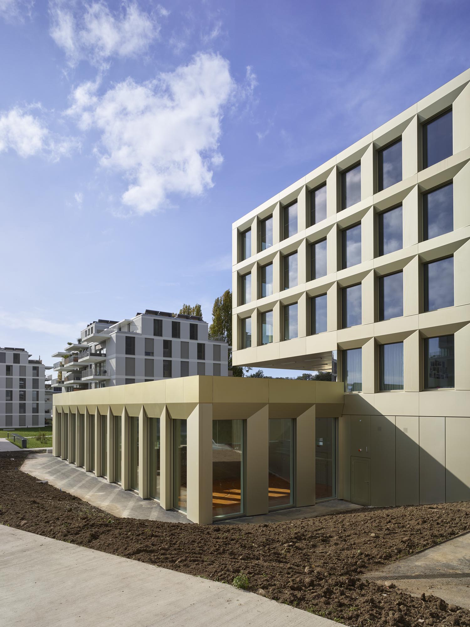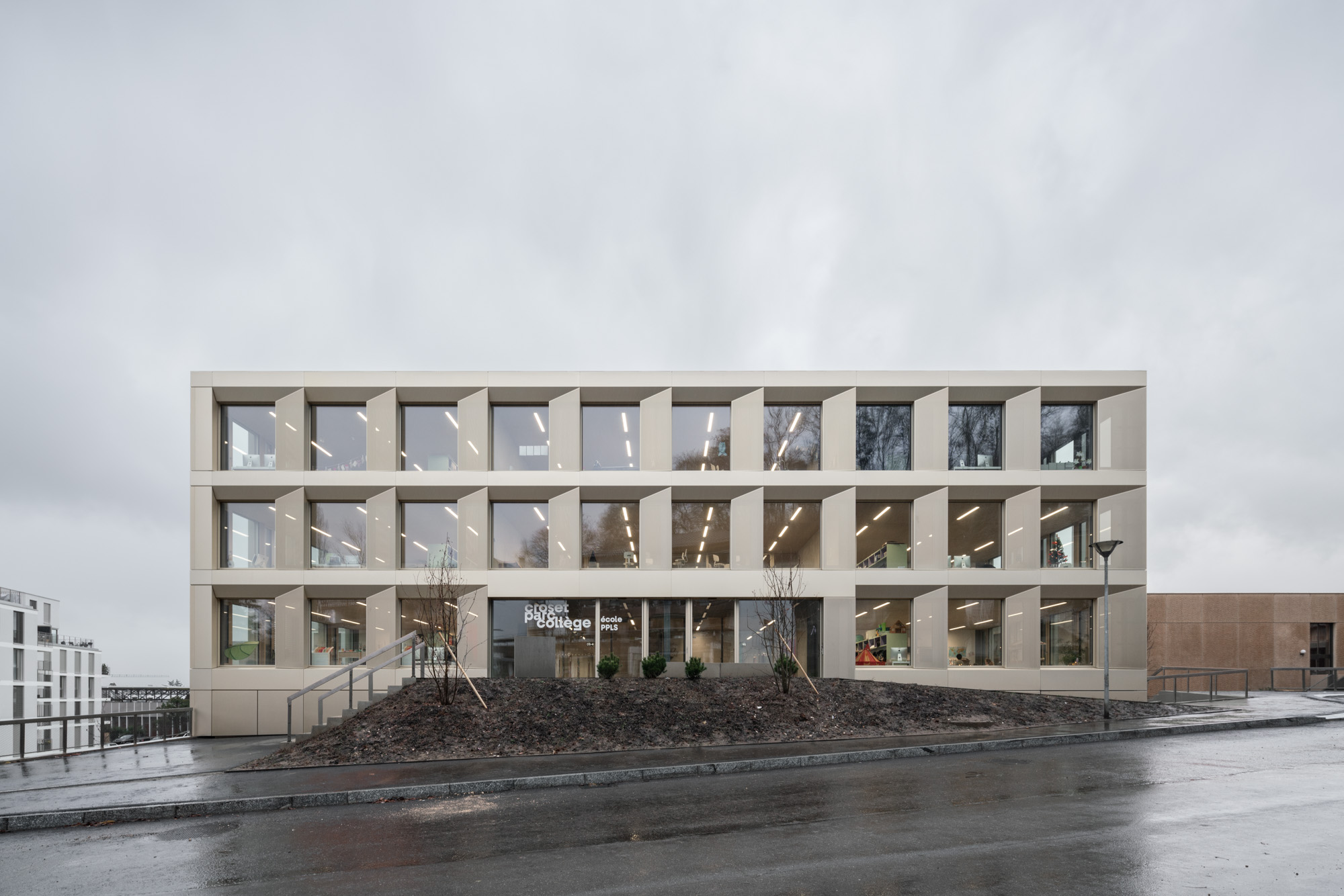 Le nouveau collège Croset-Parc vient compléter la structure scolaire existante dans un contexte en pleine mutation, futur quartier de logements remplaçant un site industriel désaffecté. A cette densification, le projet du collège répond par deux volumes compacts déboîtés en plan comme en coupe. Par le choix d’une figure géométrique simple, le rectangle, le projet affirme son appartenance à la structure scolaire voisine et à la morphologie générale du quartier composée de parallélépipèdes solitaires.