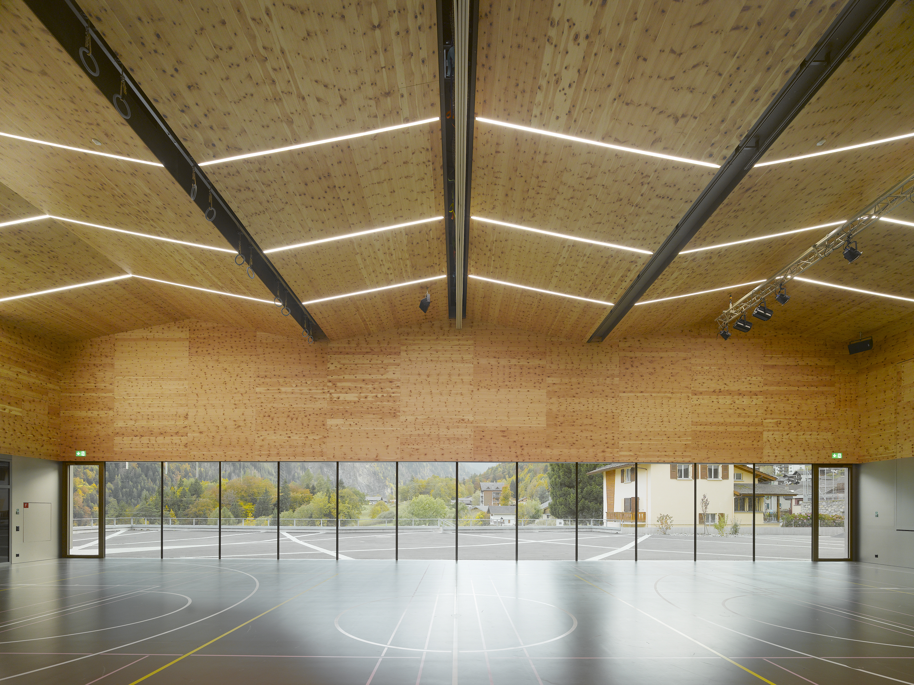 Afin de renforcer l’accrochage à l’identité du lieu, la pierre issue de la carrière de Salvan, de teinte vert émeraude, est intégrée à la composition du béton sablé des façades, le sablage révélant la couleur de l’agrégat. La pierre de Salvan revêt le sol des distributions. Associée aux revêtements des parois et plafonds en panneaux d’arolle, elle confère au bâtiment un caractère d’école de montagne.