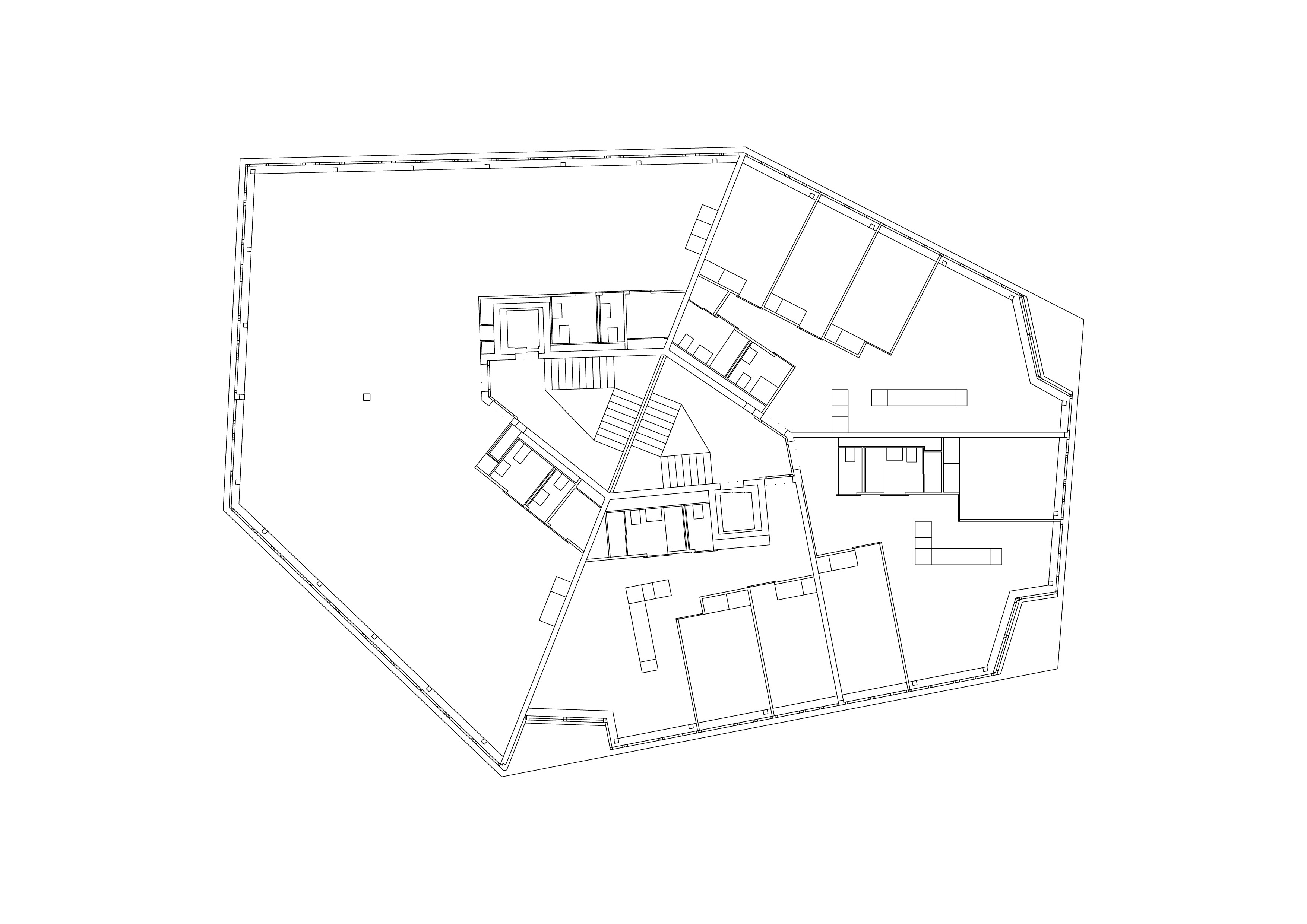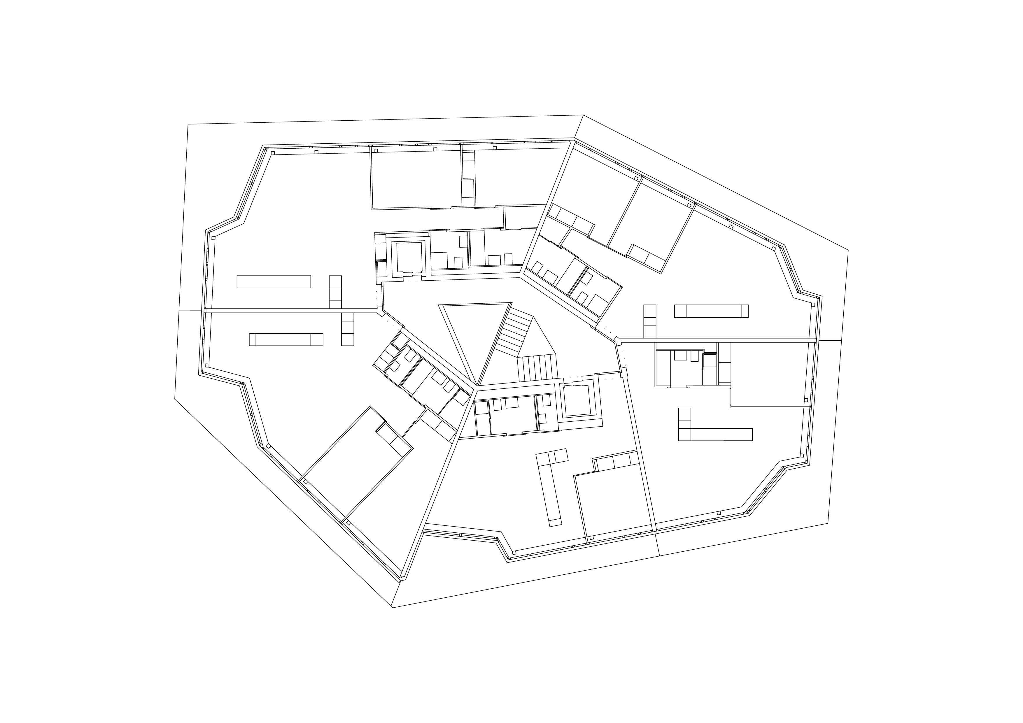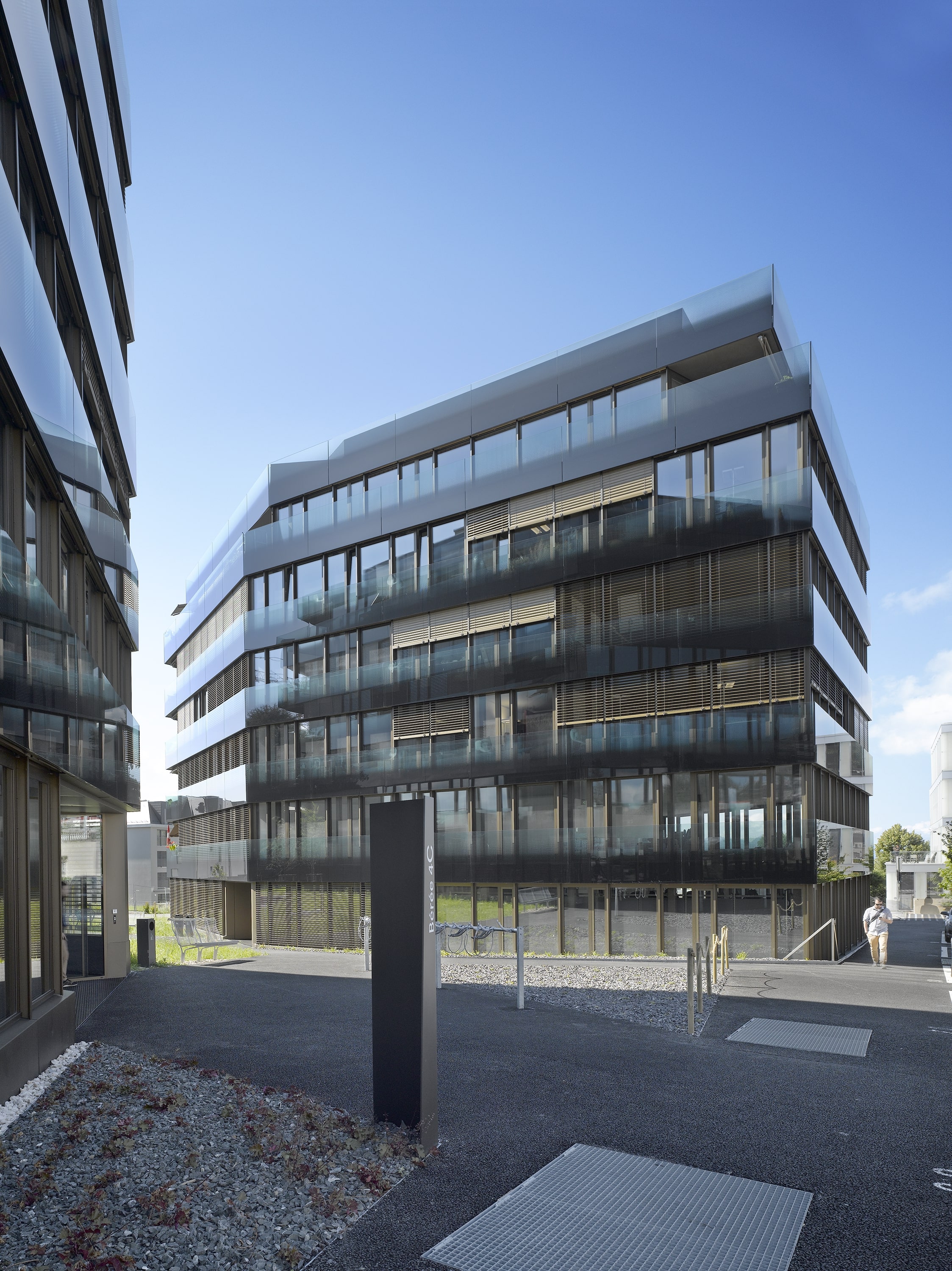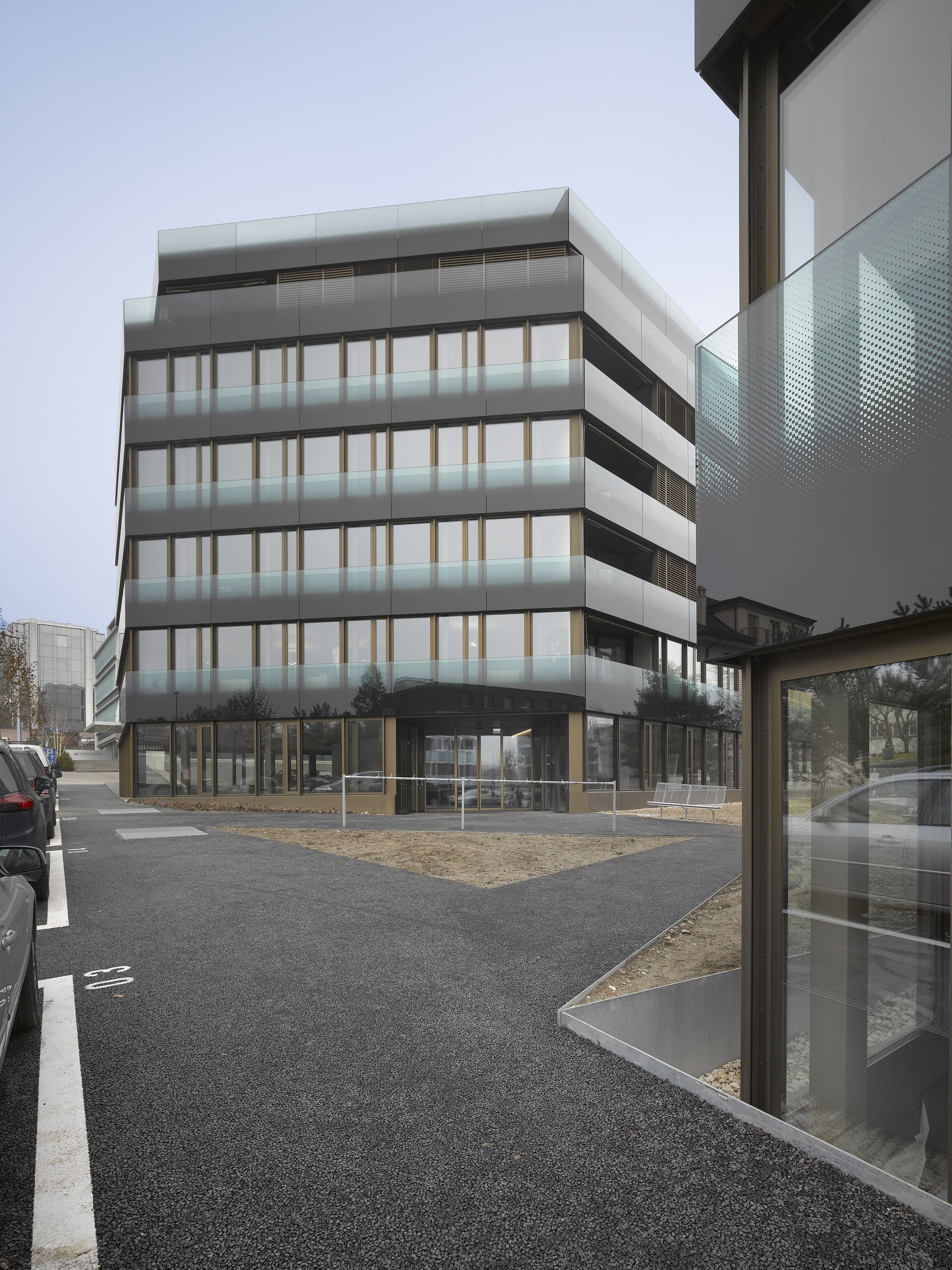 Les deux immeubles sont identiques. Leur forme en hexagone irrégulier leur confère un caractère particulier. La séparation entre les surfaces dévolues au tertiaire et celle des logements se fait sur la ligne médiane du plan hexagonal. Les bureaux sont orientés au nord ouest sur le quartier d’affaires, alors que les logements jouissent de l’ensoleillement sud est, avec vue panoramique sur le lac Léman et les Alpes. La caractéristique morphologique permet de répondre à une forte densité tout en évitant les vis à vis proches. La séparation et l’indépendance des deux affectations sont assurées par des entrées opposées donnant accès à deux cages d’escalier adossées l’une à l’autre, cloisonnée d’une paroi de verre coloré, mettant en scène de manière spectaculaire la séparation entre les parcours privés et publics.
