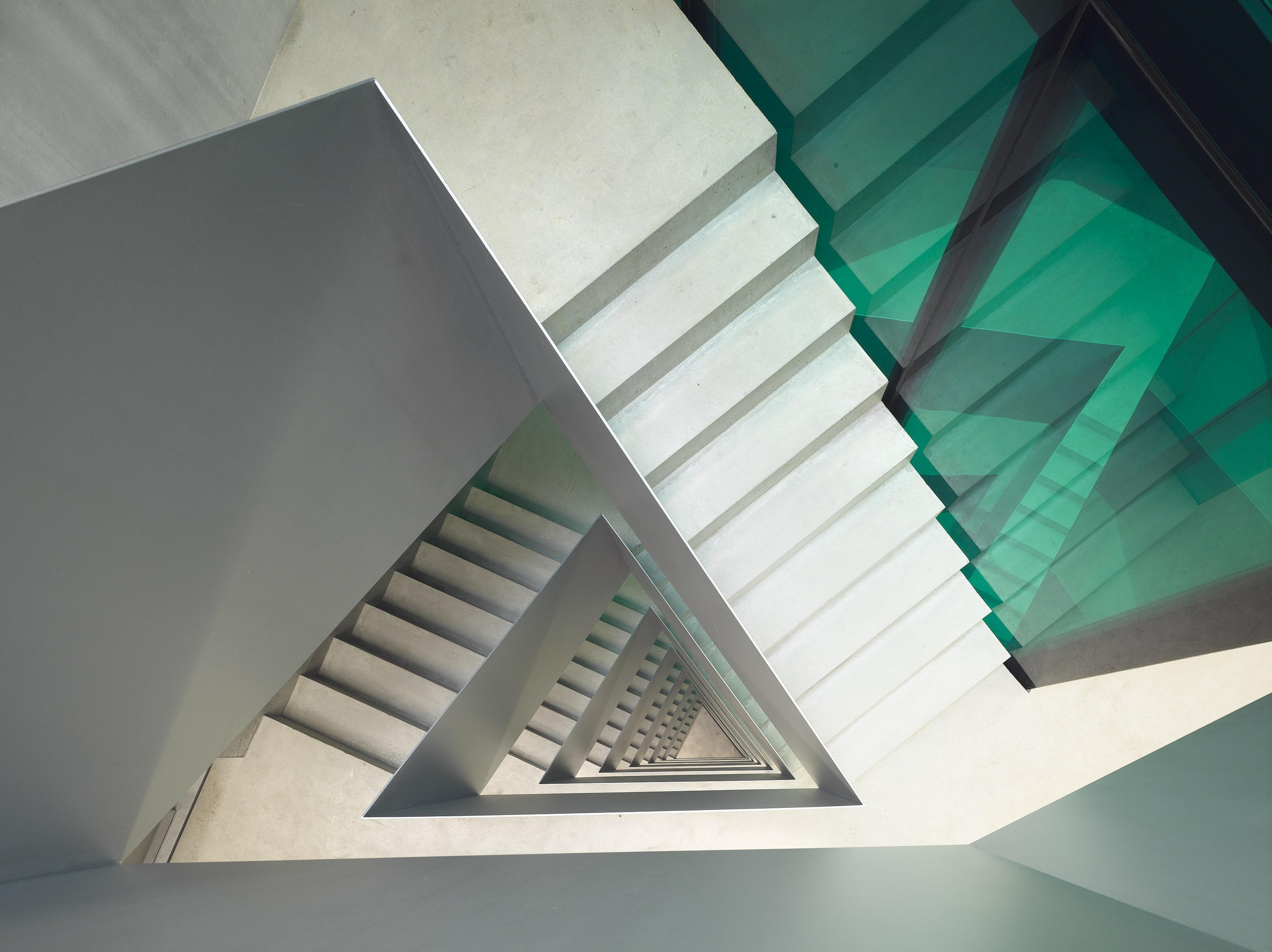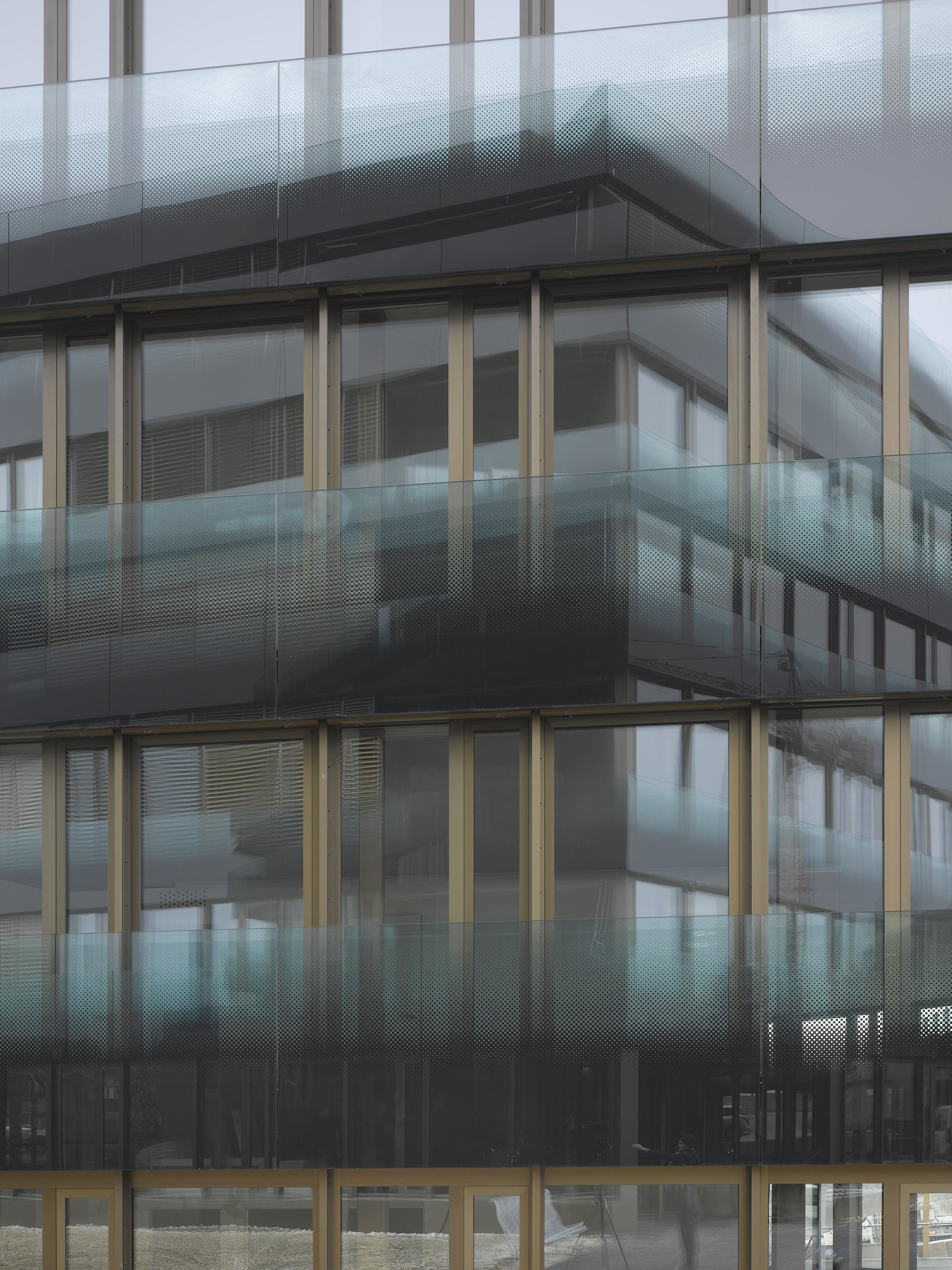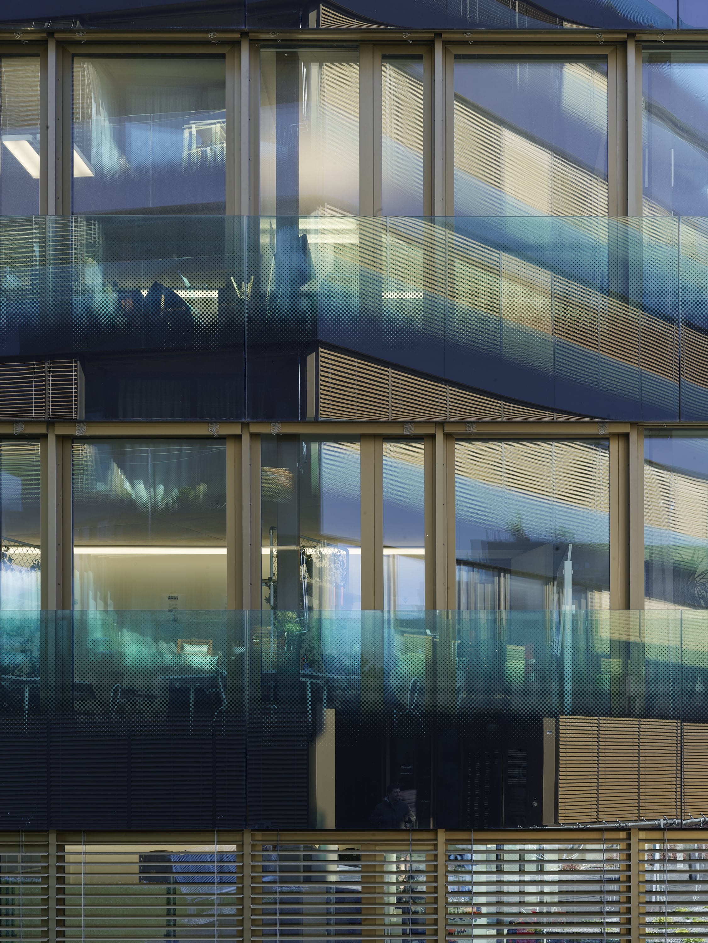 La typologie des appartements tire parti de la forme hexagonale, les séjours profitent des dilatations géométriques alors que les chambres adoptent l‘orthogonalité. Pour répondre aux deux affectations, l’expression des façades intègre la transparence d’une façade rideau bureautique et la protection d’un garde corps de verre agrémenté d’une sérigraphie en motif dégradé, ceinturant sans discontinuité le bâtiment. La matérialité mariant le verre transparent avec le verre teinté légèrement turquoise, habillant une serrurerie bronze, confère à l’ensemble une forte identité, jouant des reflets de la ville et du paysage.
