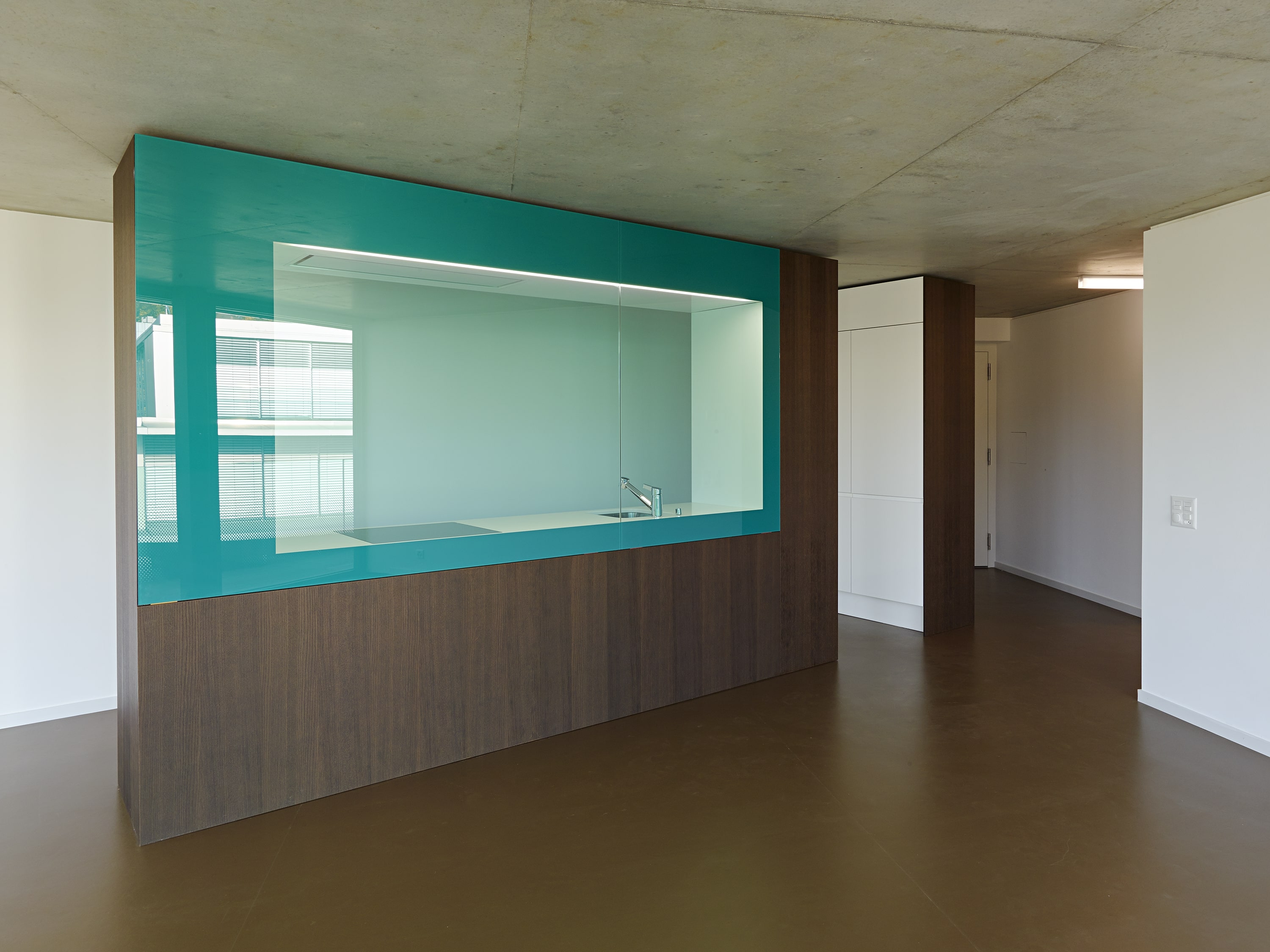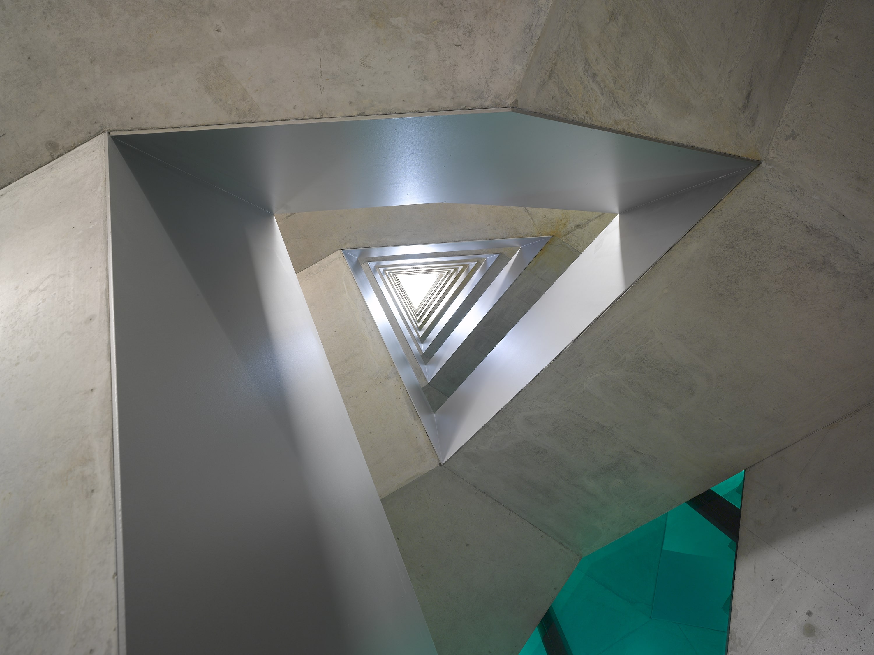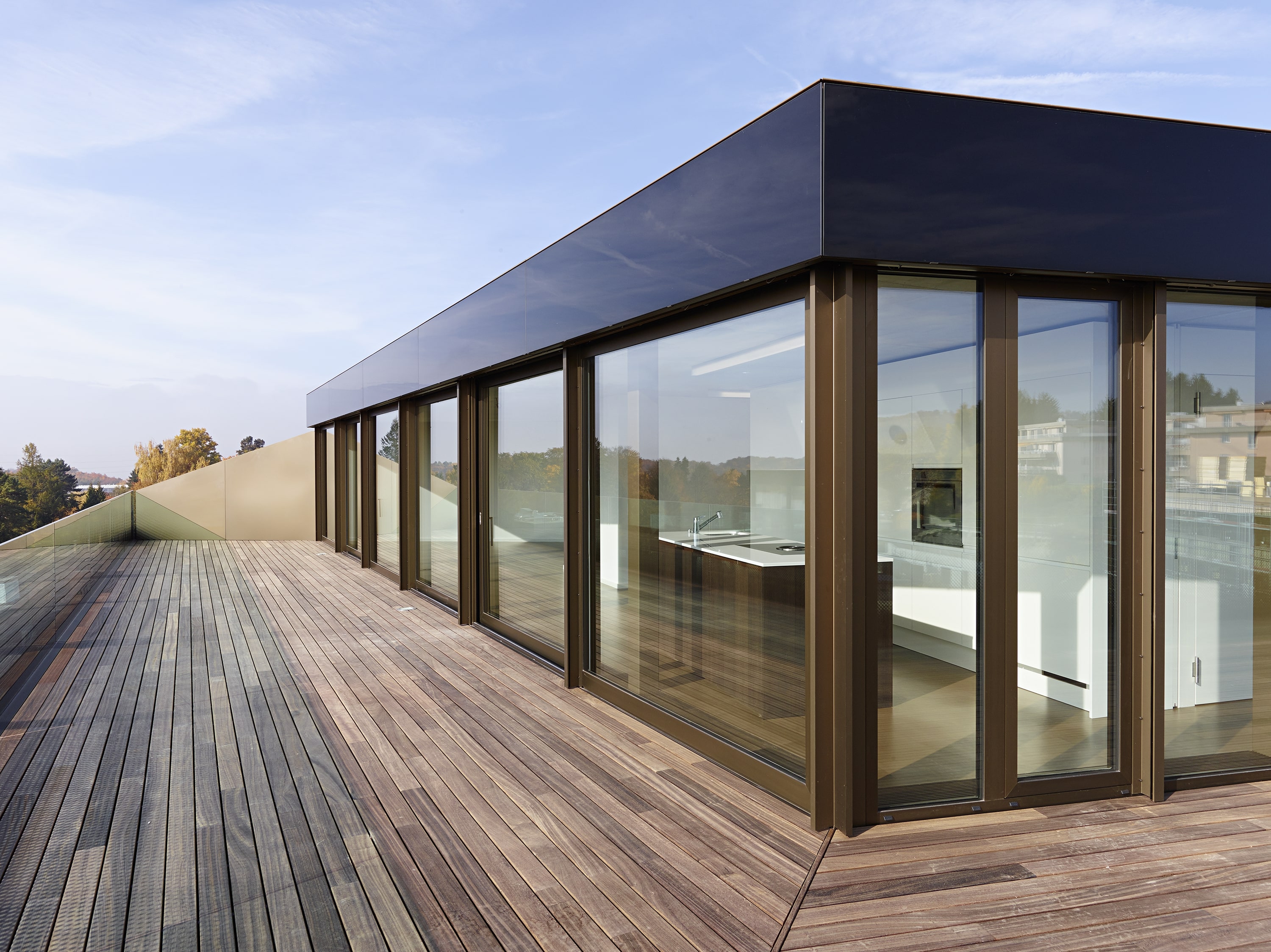 La typologie des appartements tire parti de la forme hexagonale, les séjours profitent des dilatations géométriques alors que les chambres adoptent l‘orthogonalité. Pour répondre aux deux affectations, l’expression des façades intègre la transparence d’une façade rideau bureautique et la protection d’un garde corps de verre agrémenté d’une sérigraphie en motif dégradé, ceinturant sans discontinuité le bâtiment. La matérialité mariant le verre transparent avec le verre teinté légèrement turquoise, habillant une serrurerie bronze, confère à l’ensemble une forte identité, jouant des reflets de la ville et du paysage.