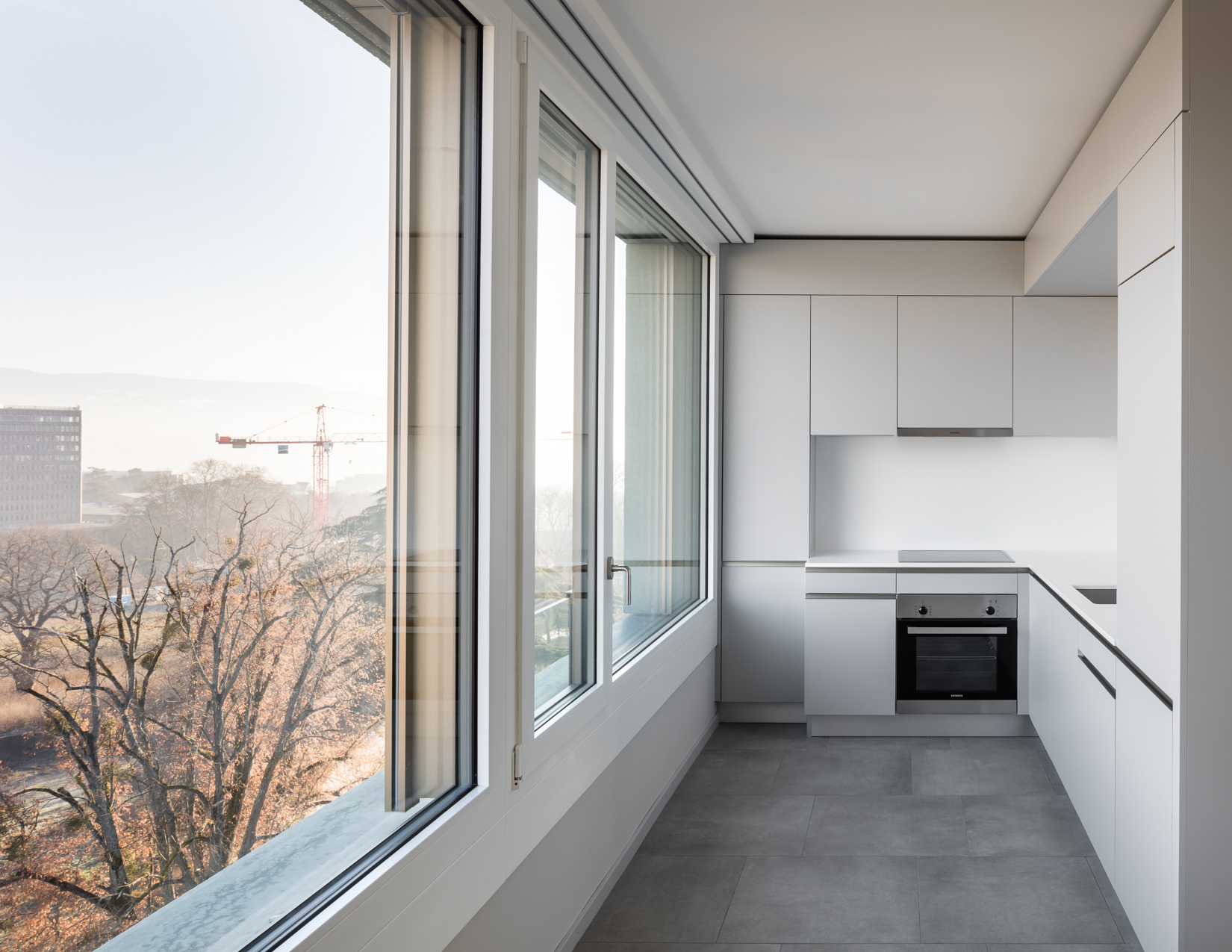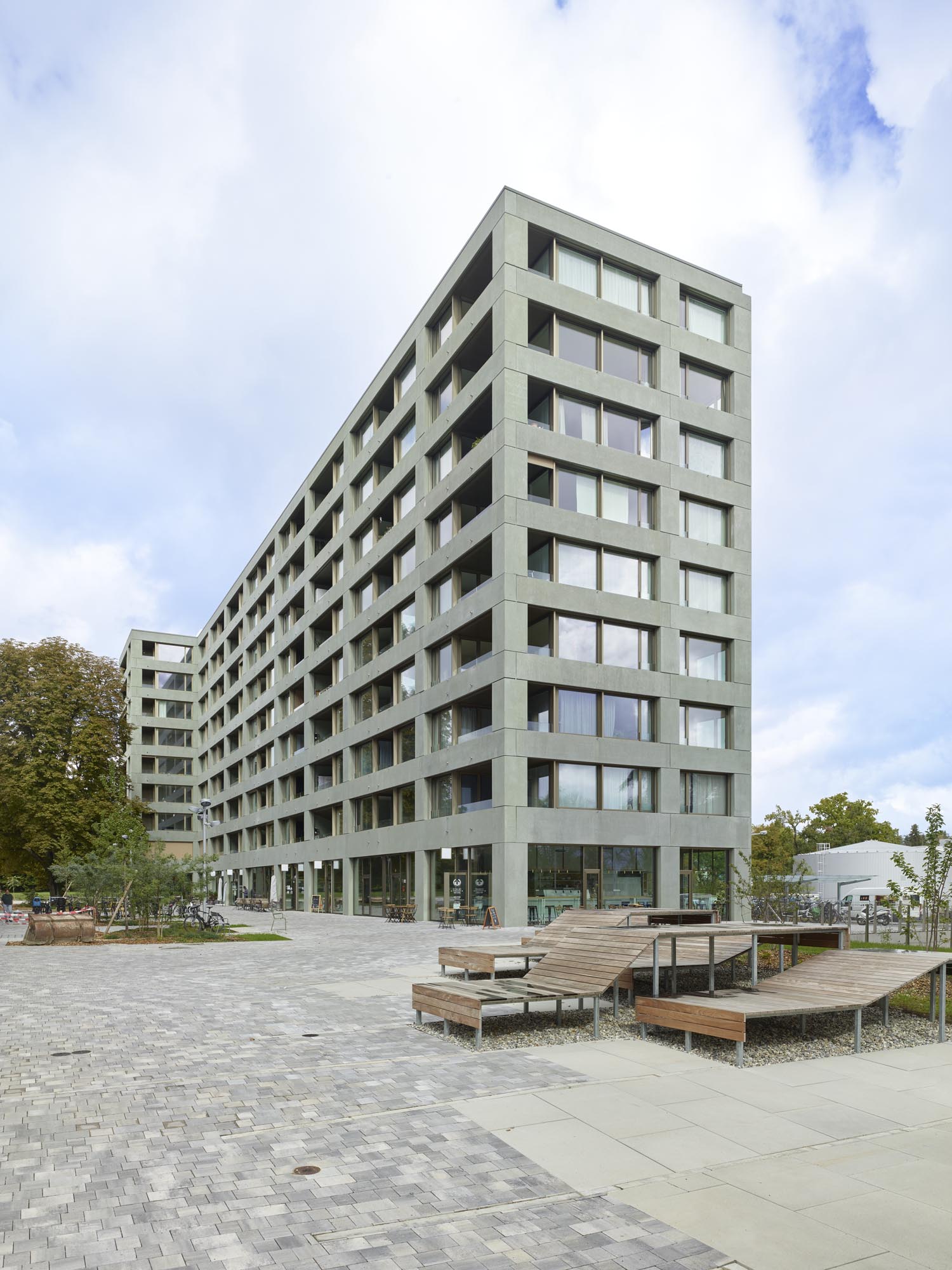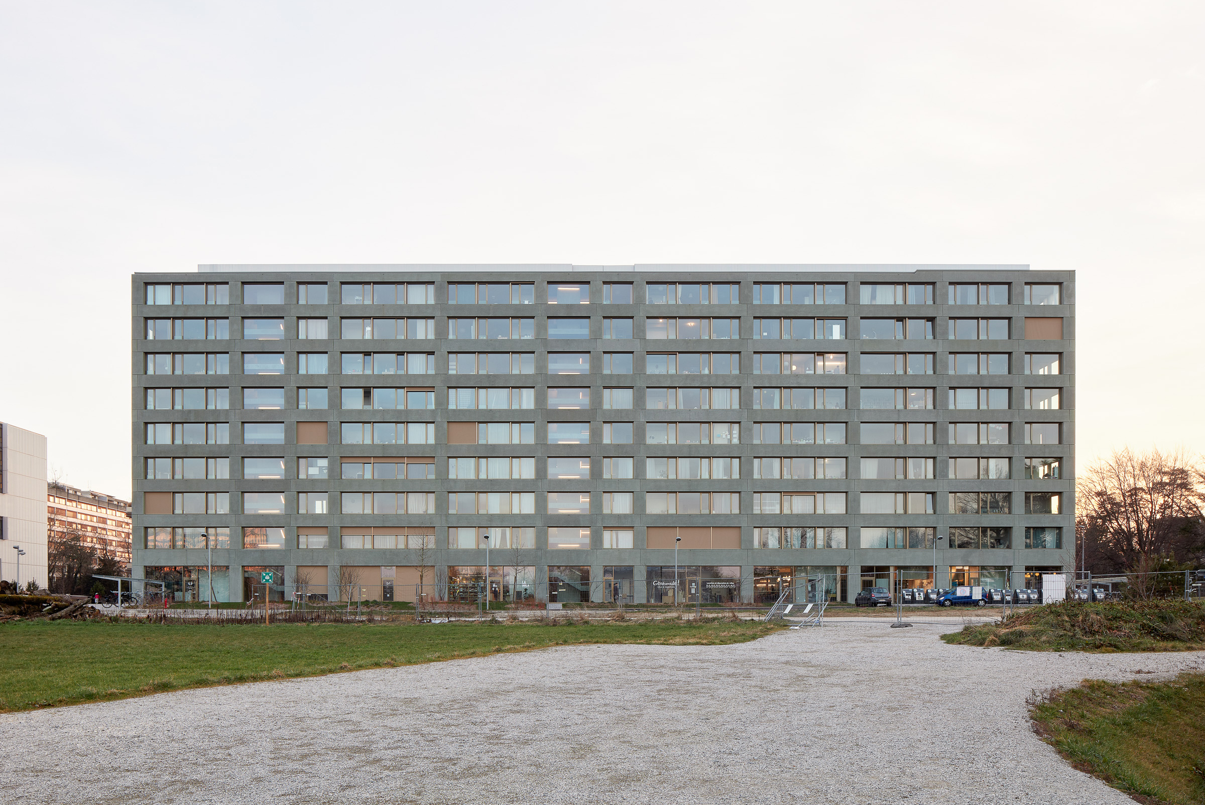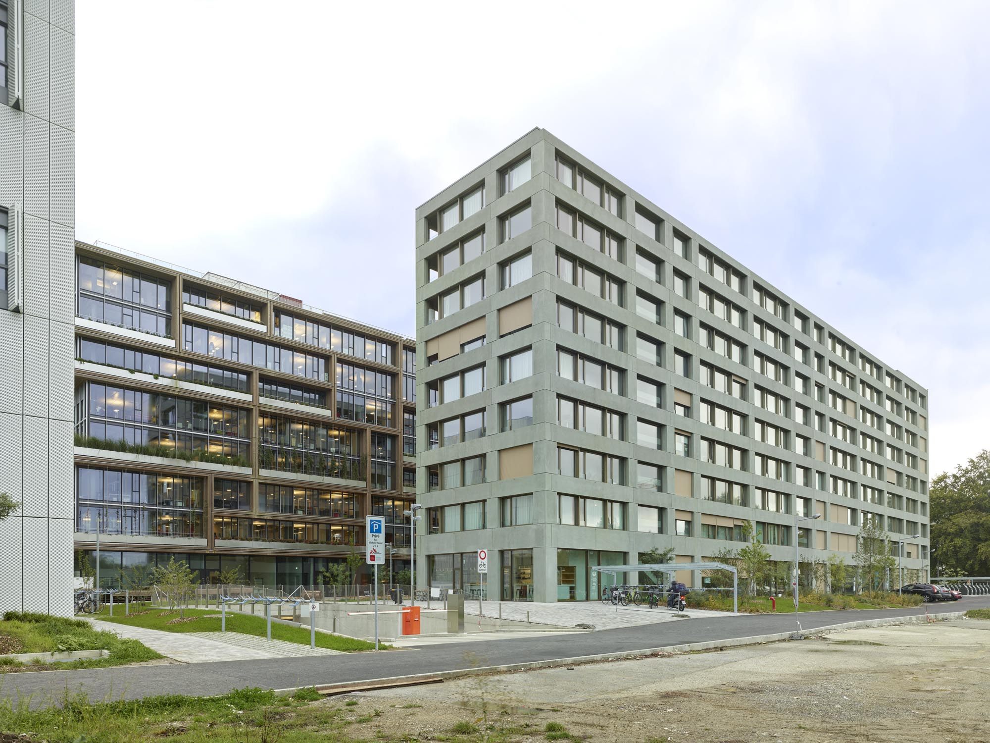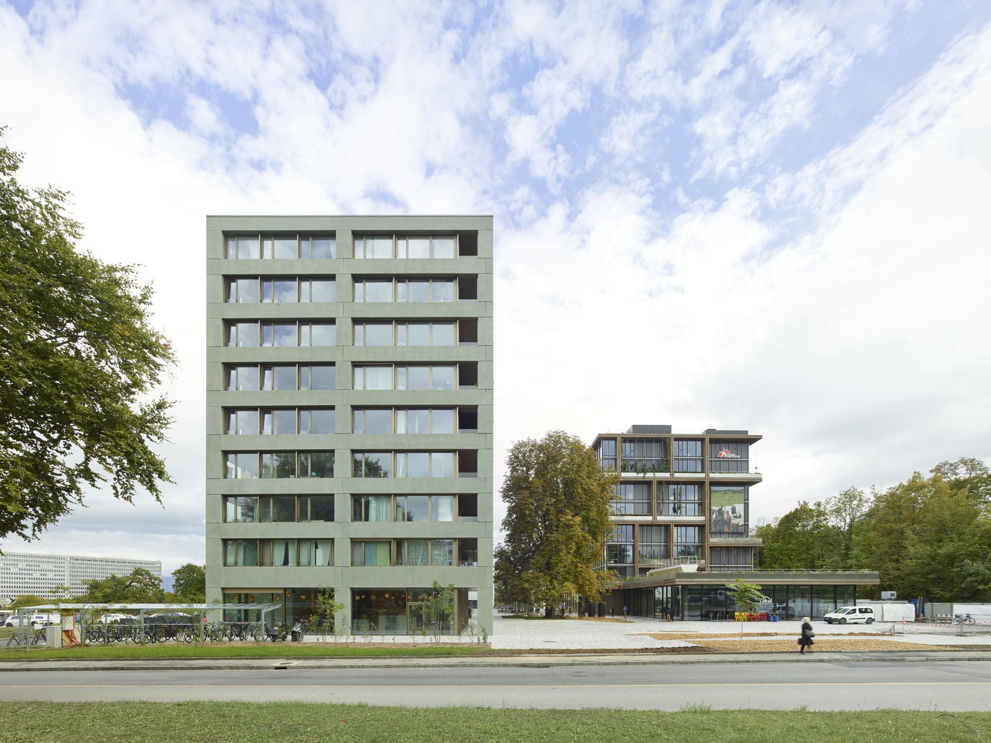 Dans le nord-ouest Genevois, à deux pas du Parc des Nations et du siège européen de l’ONU, le bâtiment de logements de la Fondation Terra & Casa constitue, avec la résidence étudiante voisine et le siège de l'ONG Médecins Sans Frontières, le nouveau quartier de la Cité Internationale du Grand Morillon. Ses logements et son socle commerçant s’articulent en une barre longiligne de 12m de large par 80m de long pour 8 étages sur rez-de-chaussée. La linéarité de celle-ci dialogue avec le large mail public la longeant, et avec les formes géométriques simples des bâtiments à proximité. Le pignon nord du bâtiment, donnant sur la route des Morillons, s’élargit pour marquer la tête du quartier et affirmer son rapport à la ville.