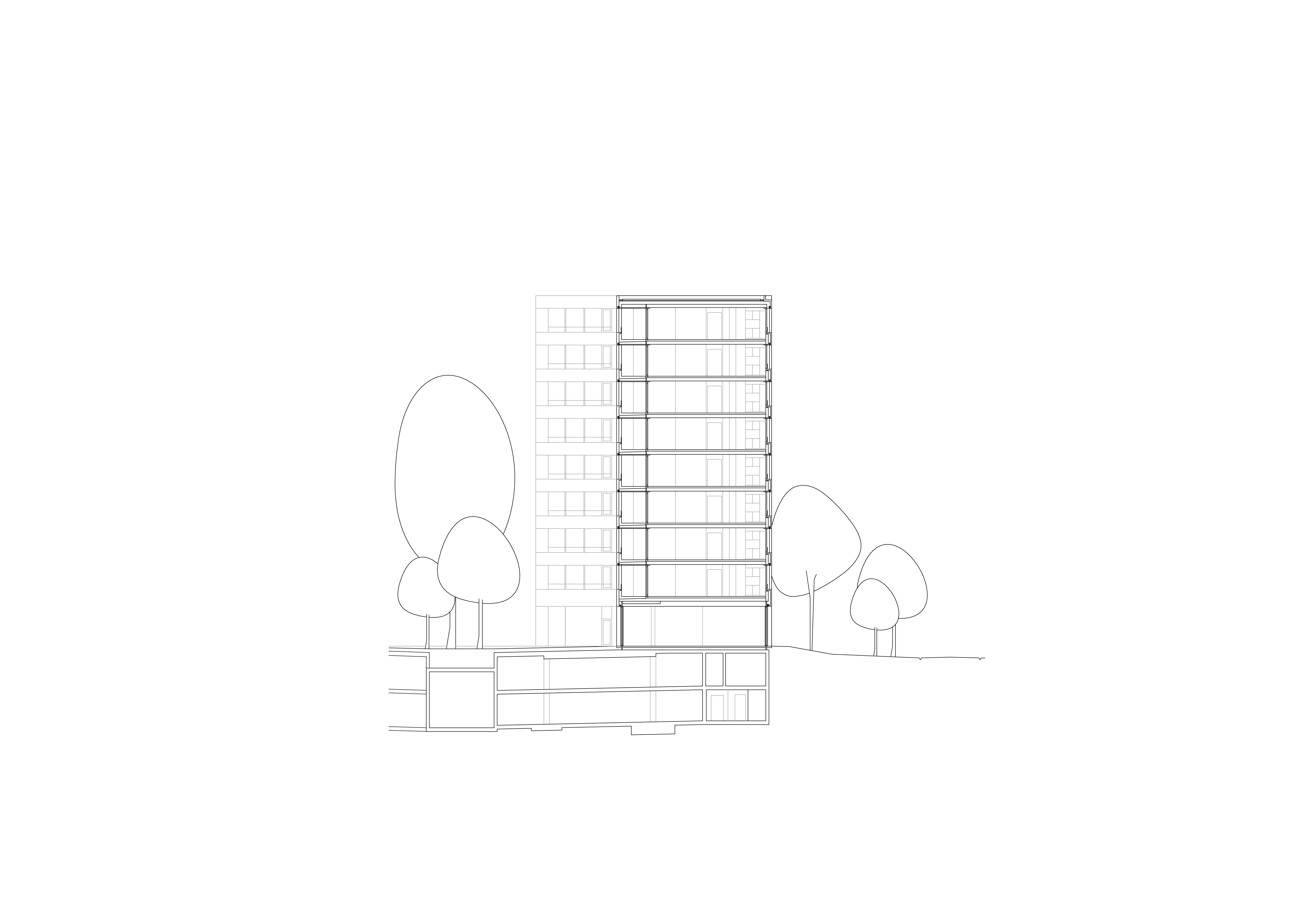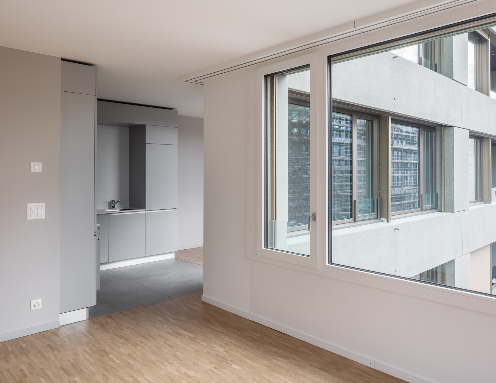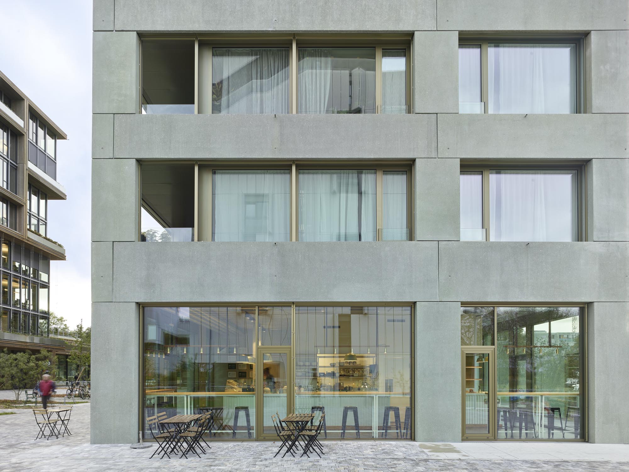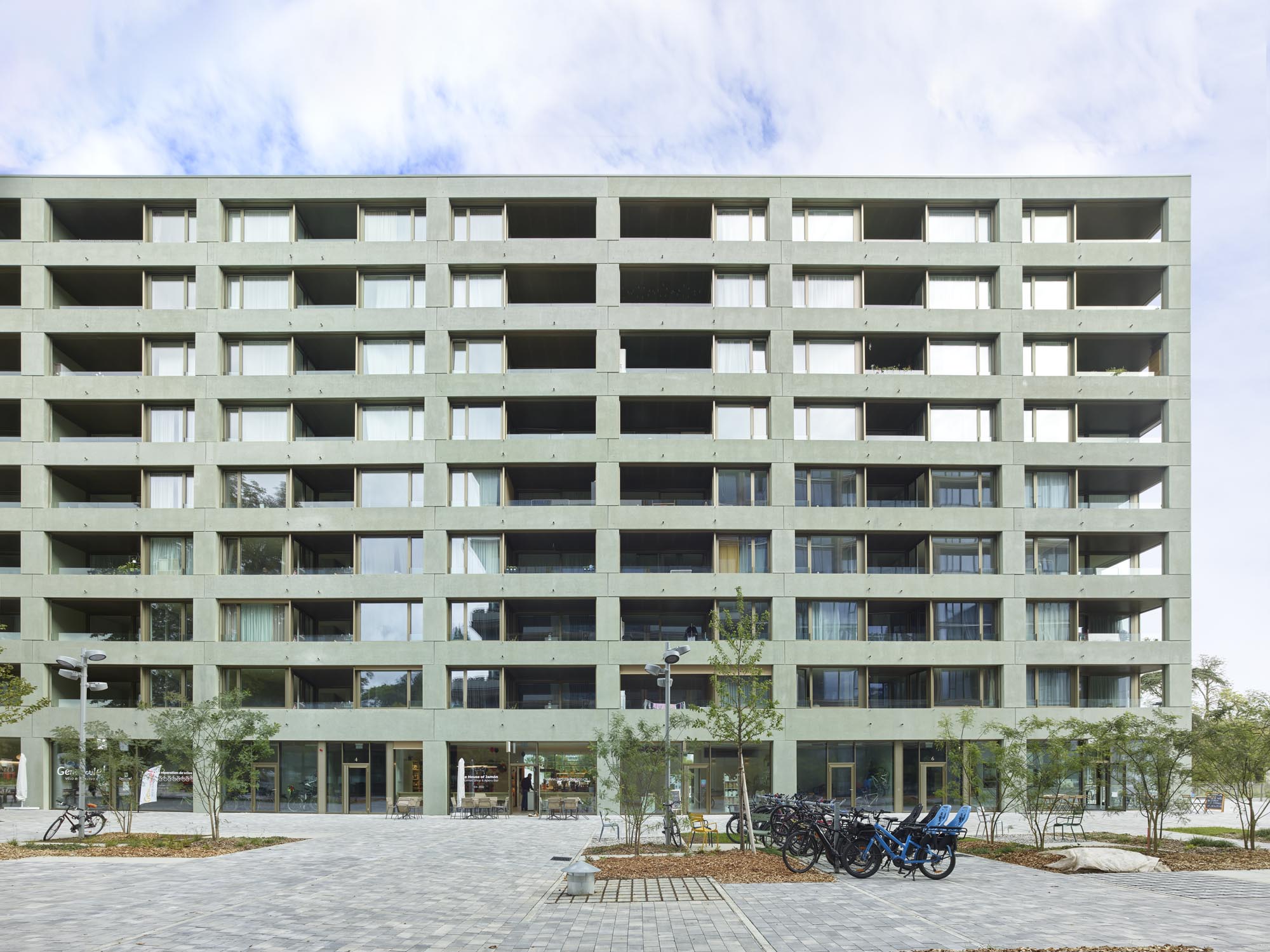 Le projet comprend 88 appartements, dont la typologie permet des pièces de tailles généreuses et similaires. Les portes de communication intérieures sont doublées d’un panneau coulissant, permettant différentes utilisations et liaisons entre pièces. Les espaces intérieurs peuvent ainsi répondre à des usages et pratiques variés. Le rez-de-chaussée offre des surfaces commerciales desservies par des halls d’entrée généreux, couplés aux locaux vélos et poussettes. Le bâtiment est complété par un parking souterrain dont la configuration permet la mutualisation de l'accès avec les autres aires.