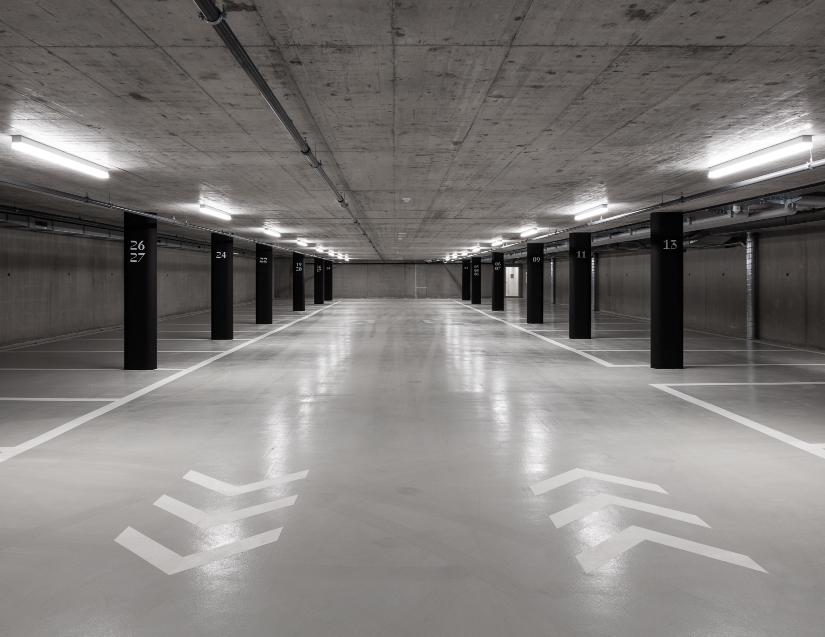 La modénature des façades est composée d’une grille exprimant les différentes travées. Réalisée en éléments préfabriqués béton, elle assure la longévité de l’ouvrage et les faibles coûts d’entretien. Les grands percements offrent un apport généreux en lumière naturelle, que les menuiseries en aluminium divisent aux rythmes des cloisons intérieures. La rationalité formelle, typologique et constructive assure au projet une grande économicité tant à la réalisation qu’à l’exploitation. Son expression épurée permet une lisibilité des procédés constructifs, ainsi que du fonctionnement du bâtiment.