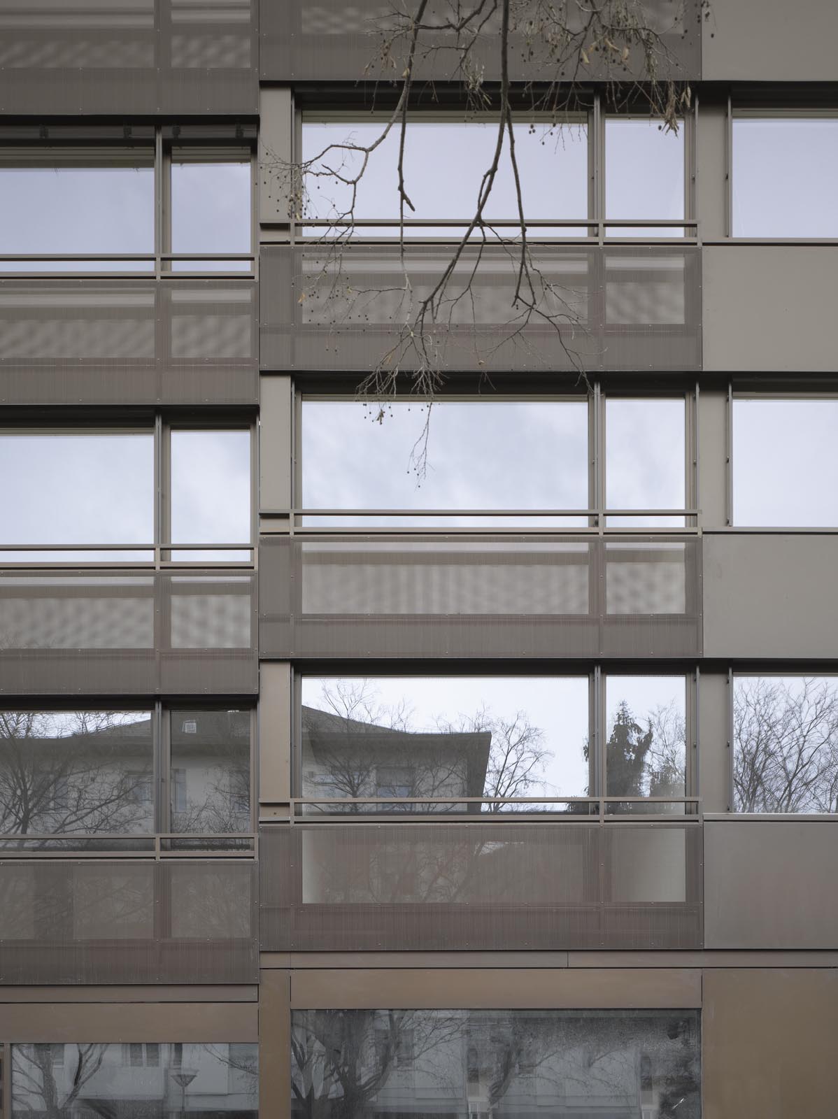 A l’intérieur de l’îlot, les différences de niveaux et le dialogue des balcons en saillie irrégulière introduisent un jeu plastique. Les parties pleines des façades sont revêtues d’un bardage en tôles pleines aluminium de couleur bronze. Une teinte qui contraste avec la peau plus claire, également en aluminium, côté cour. Les lignes des bandeaux de fenêtres expriment les différences de niveaux selon la pente des rues. Les toitures des trois bâtiments sont couvertes de tôles d’aluminium de couleur bronze côté rues et de couleur plus claire côté cour.