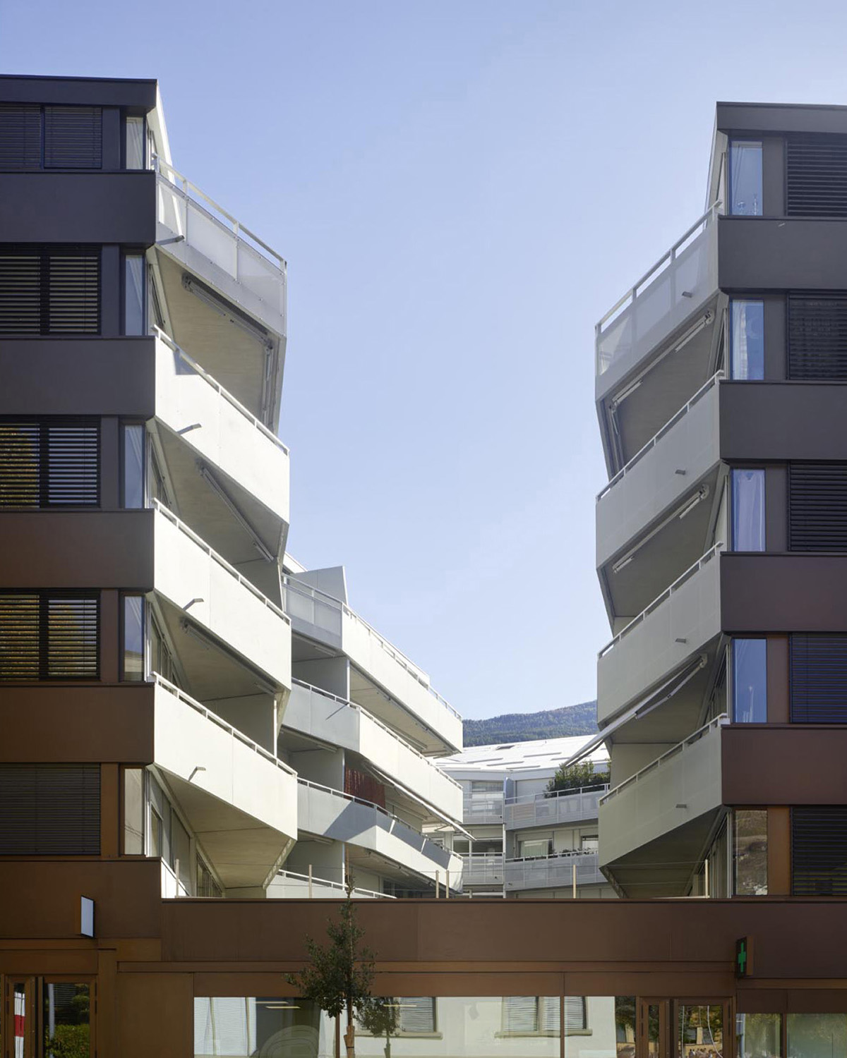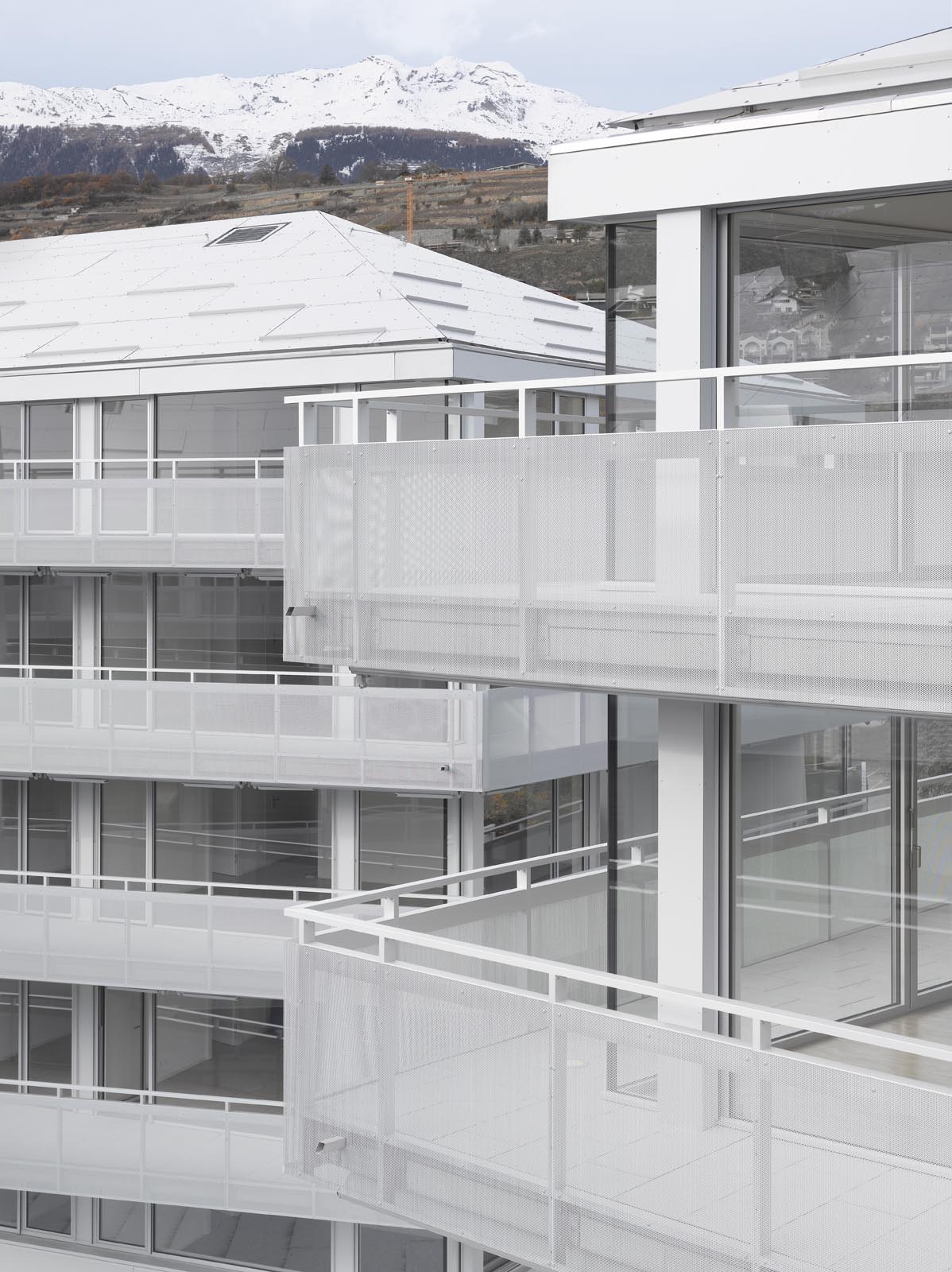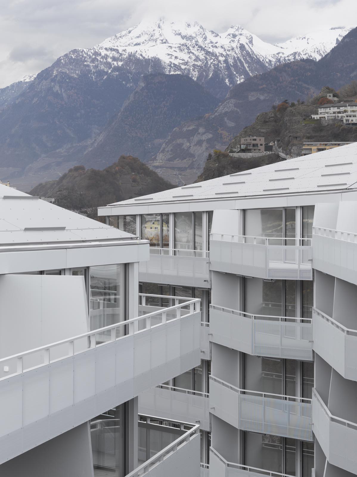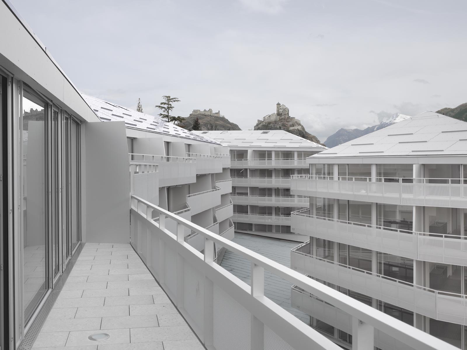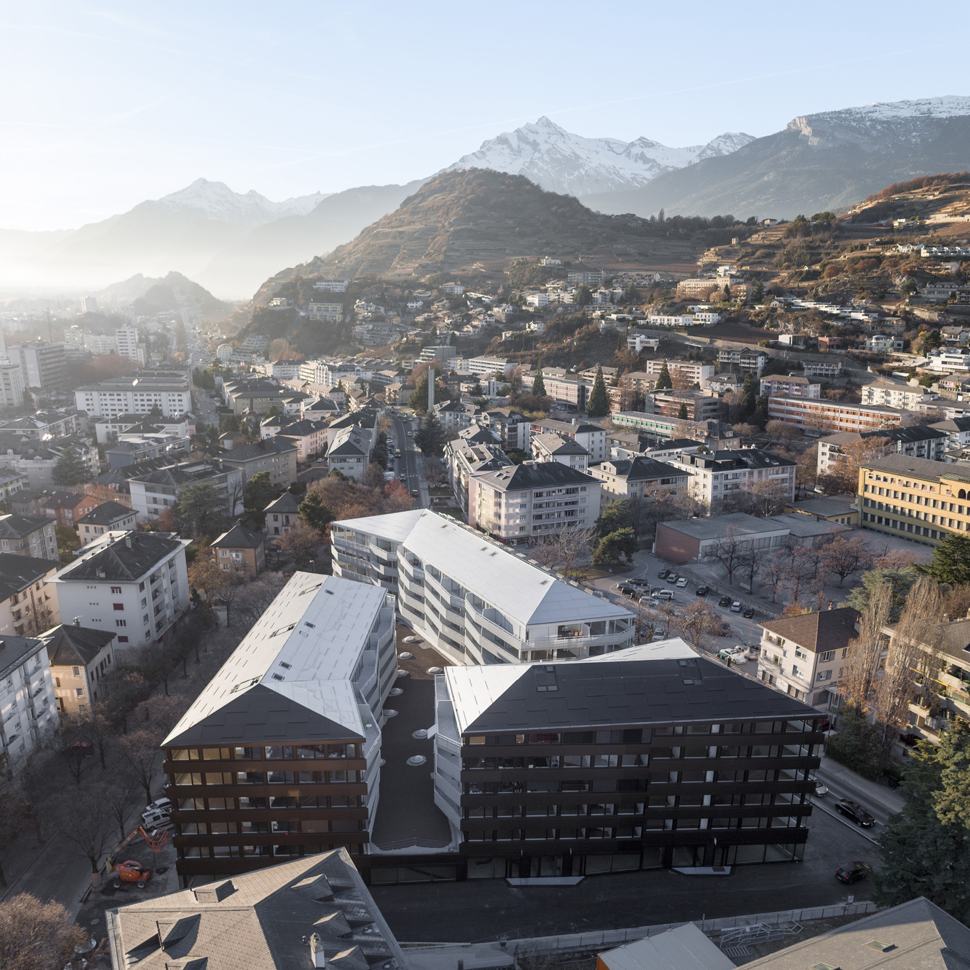 Situé à proximité du centre historique de Sion, l’îlot de la Matze remplace un ensemble de bâtiments construits des années cinquantes. Nouvelle porte d’entrée du cœur de la cité, le complexe est en lien direct et en axe avec la place du Midi et ses zones de rencontres. Il se caractérise par trois immeubles de cent vingt logements sur cinq étages s’articulant autour d’une cour et reposant sur un socle commun dédié aux activités commerciales et tertiaires. Les trois bâtiments de l’îlot de la Matze répondent à une logique formelle identique, barres aux façades longitudinales parallèles aux extrémités biaisées, et sont coiffées de toitures à quatre pans. Le gabarit du socle commun épouse la géométrie de la parcelle. La discontinuité du bâti est fidèle à la morphologie de ce quartier caractérisé par ses immeubles en ordre dispersé, une conception qui privilégie des dégagements de vues par les interstices entre les bâtiments.