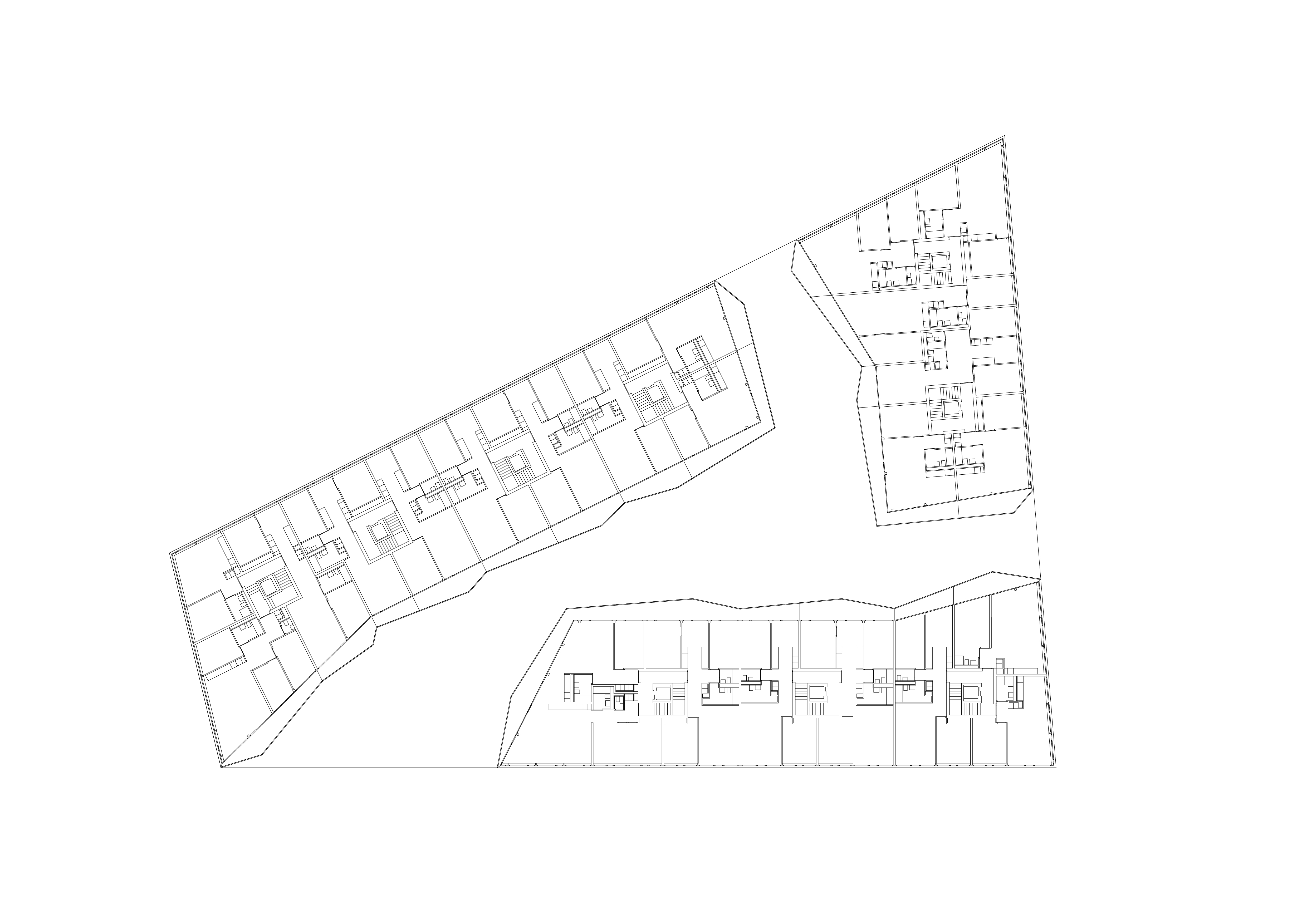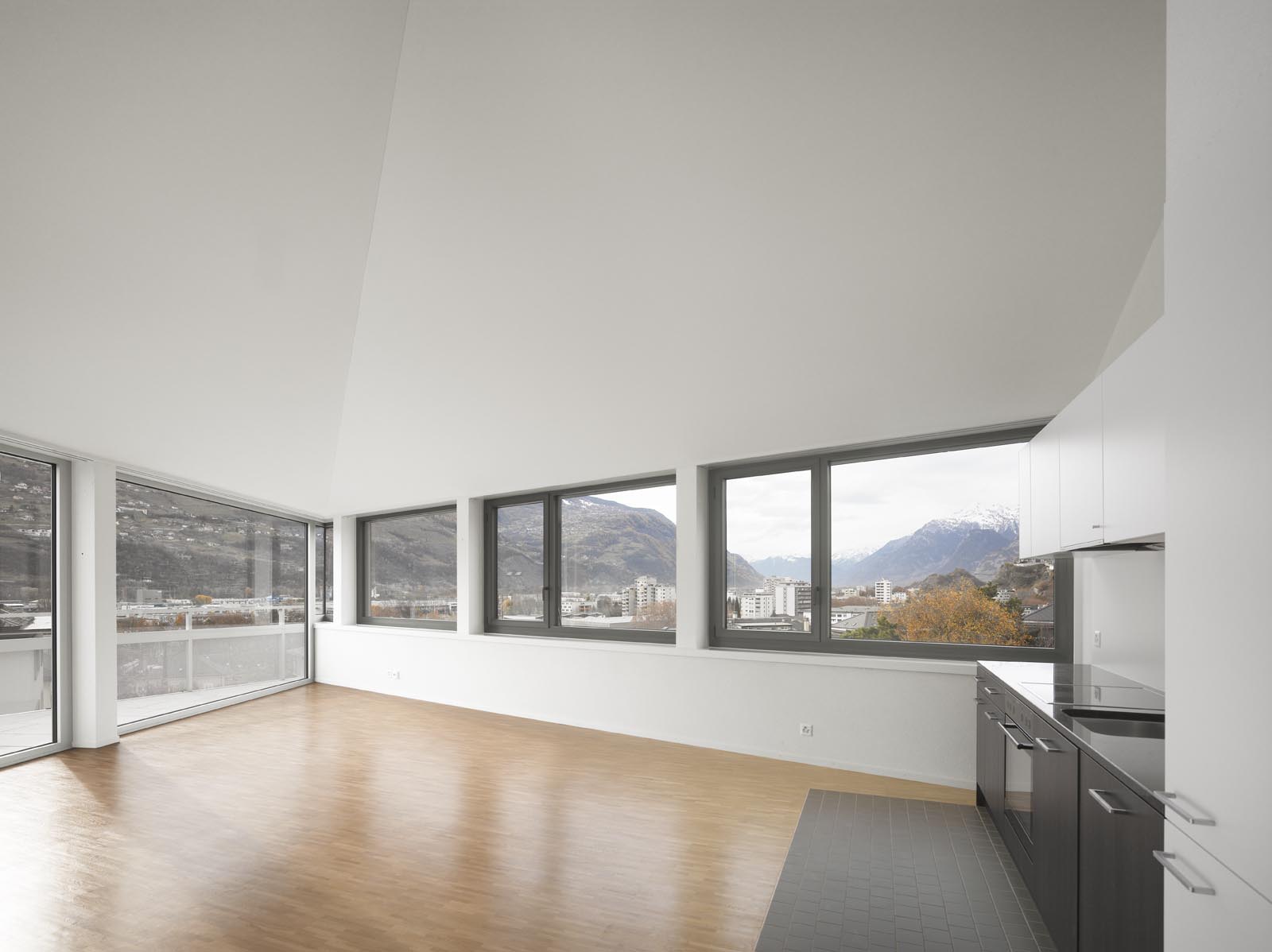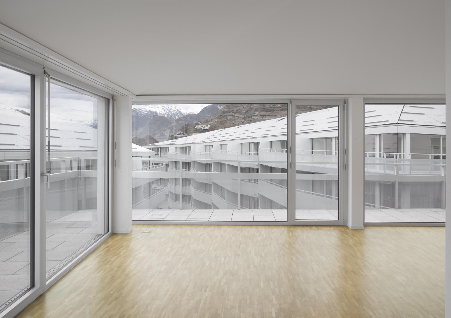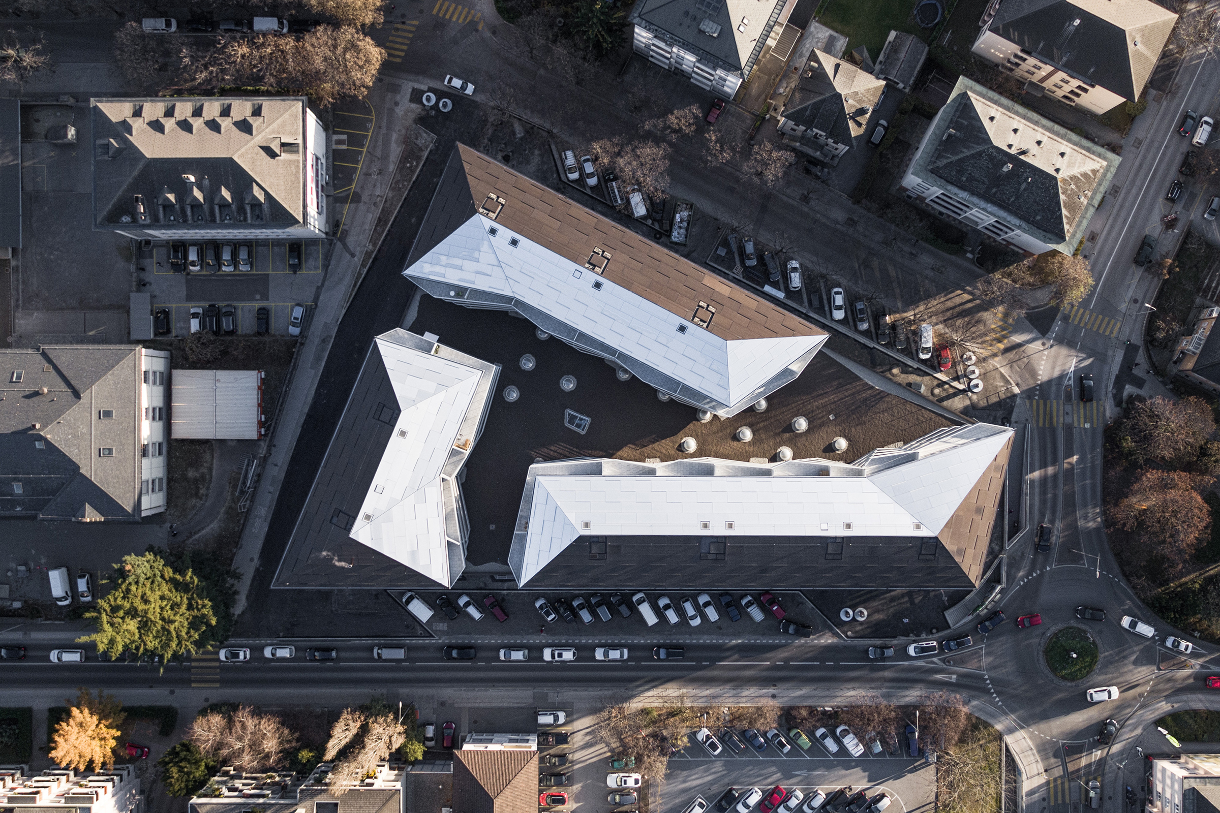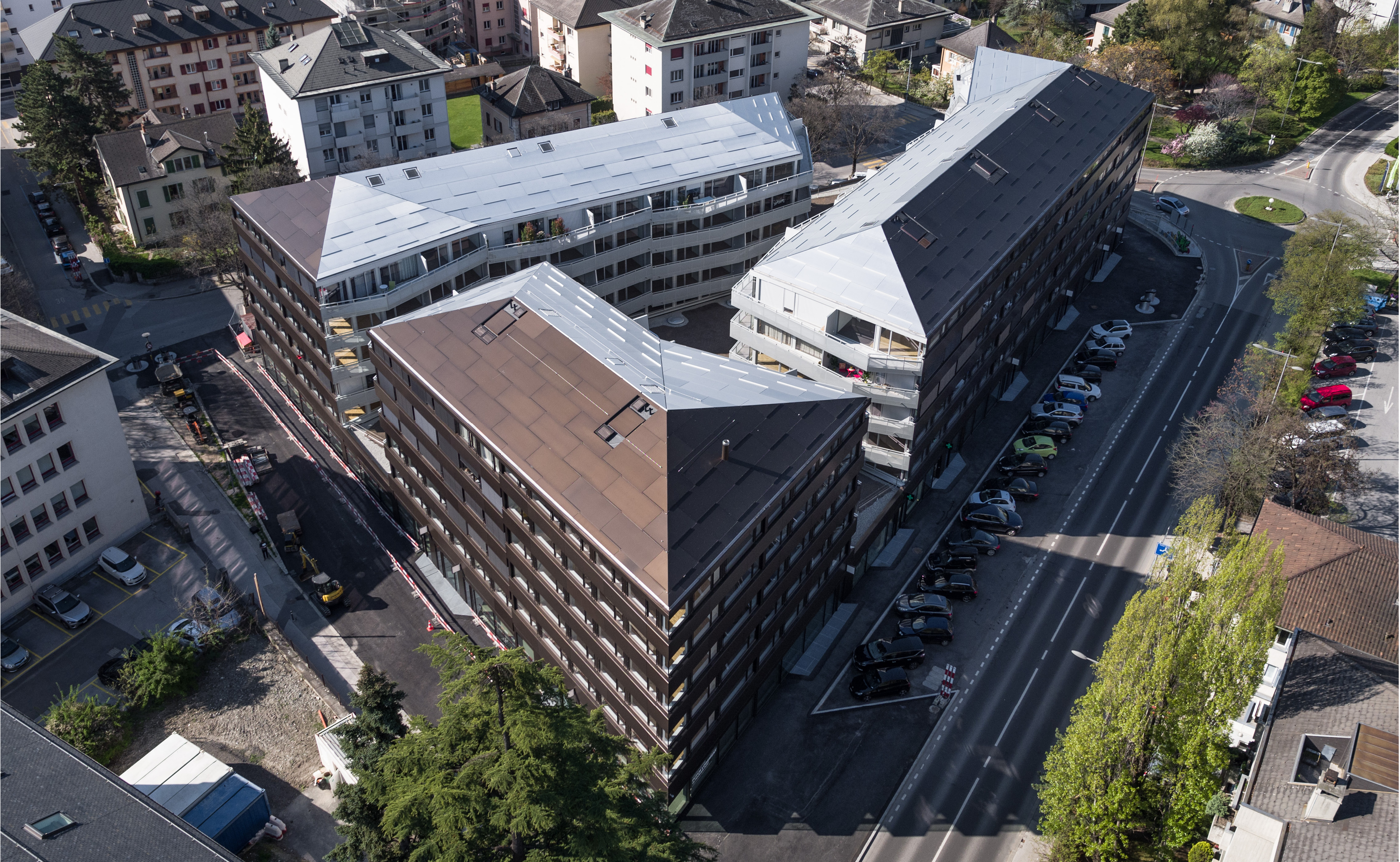 Situé à proximité du centre historique de Sion, l’îlot de la Matze remplace un ensemble de bâtiments construits des années cinquantes. Nouvelle porte d’entrée du cœur de la cité, le complexe est en lien direct et en axe avec la place du Midi et ses zones de rencontres. Il se caractérise par trois immeubles de cent vingt logements sur cinq étages s’articulant autour d’une cour et reposant sur un socle commun dédié aux activités commerciales et tertiaires. Les trois bâtiments de l’îlot de la Matze répondent à une logique formelle identique, barres aux façades longitudinales parallèles aux extrémités biaisées, et sont coiffées de toitures à quatre pans. Le gabarit du socle commun épouse la géométrie de la parcelle. La discontinuité du bâti est fidèle à la morphologie de ce quartier caractérisé par ses immeubles en ordre dispersé, une conception qui privilégie des dégagements de vues par les interstices entre les bâtiments.