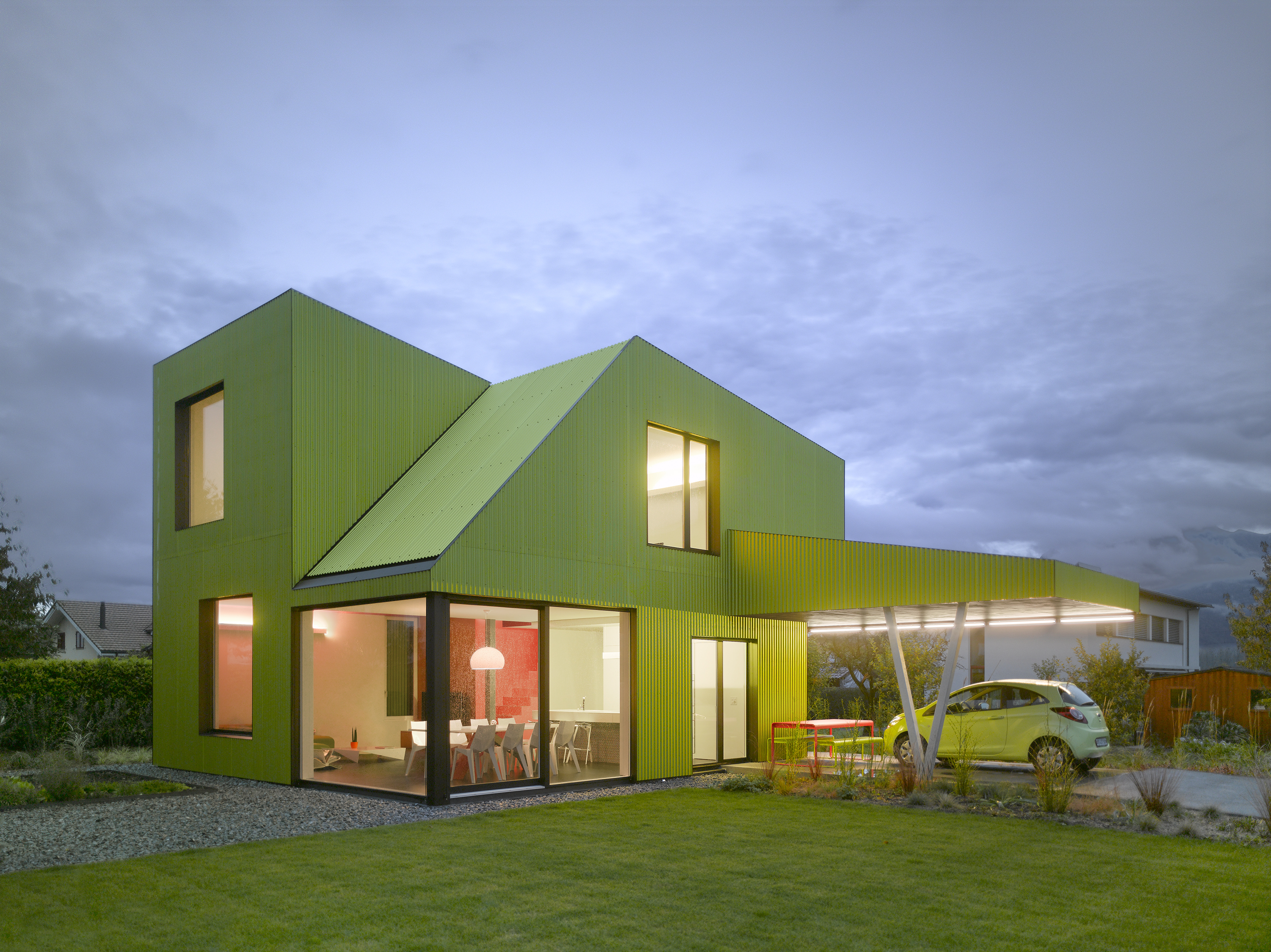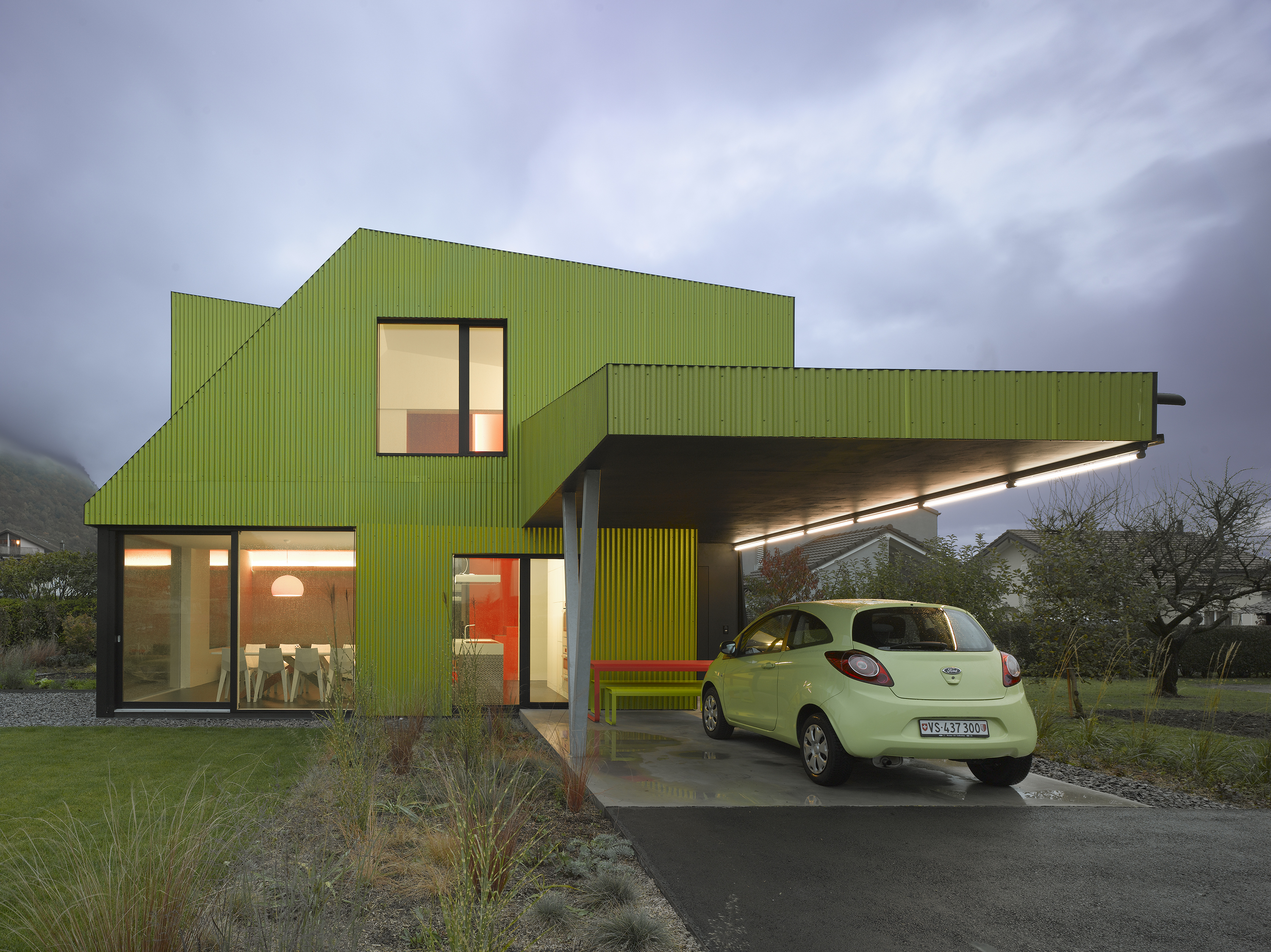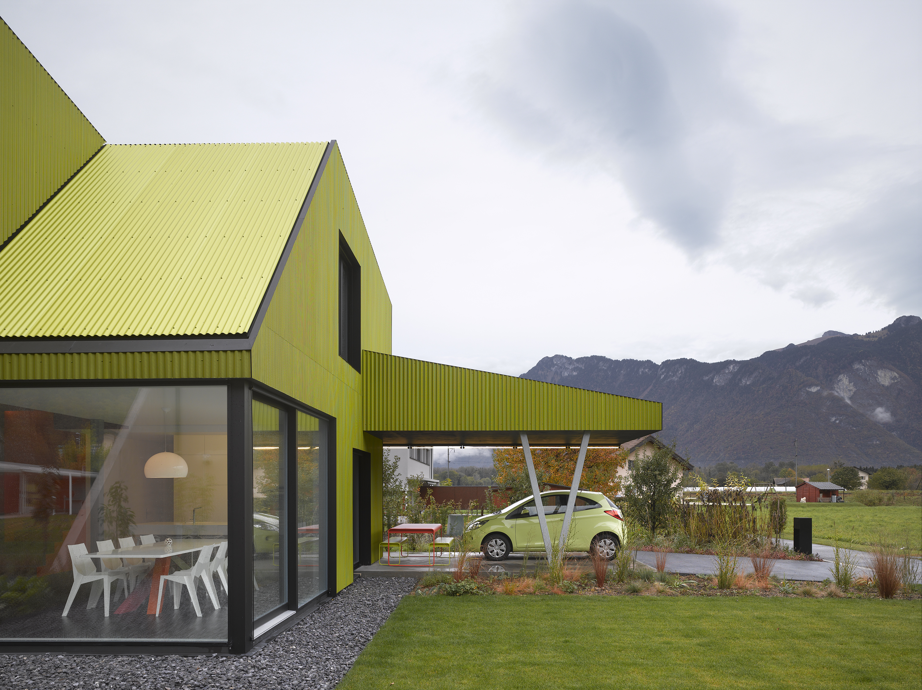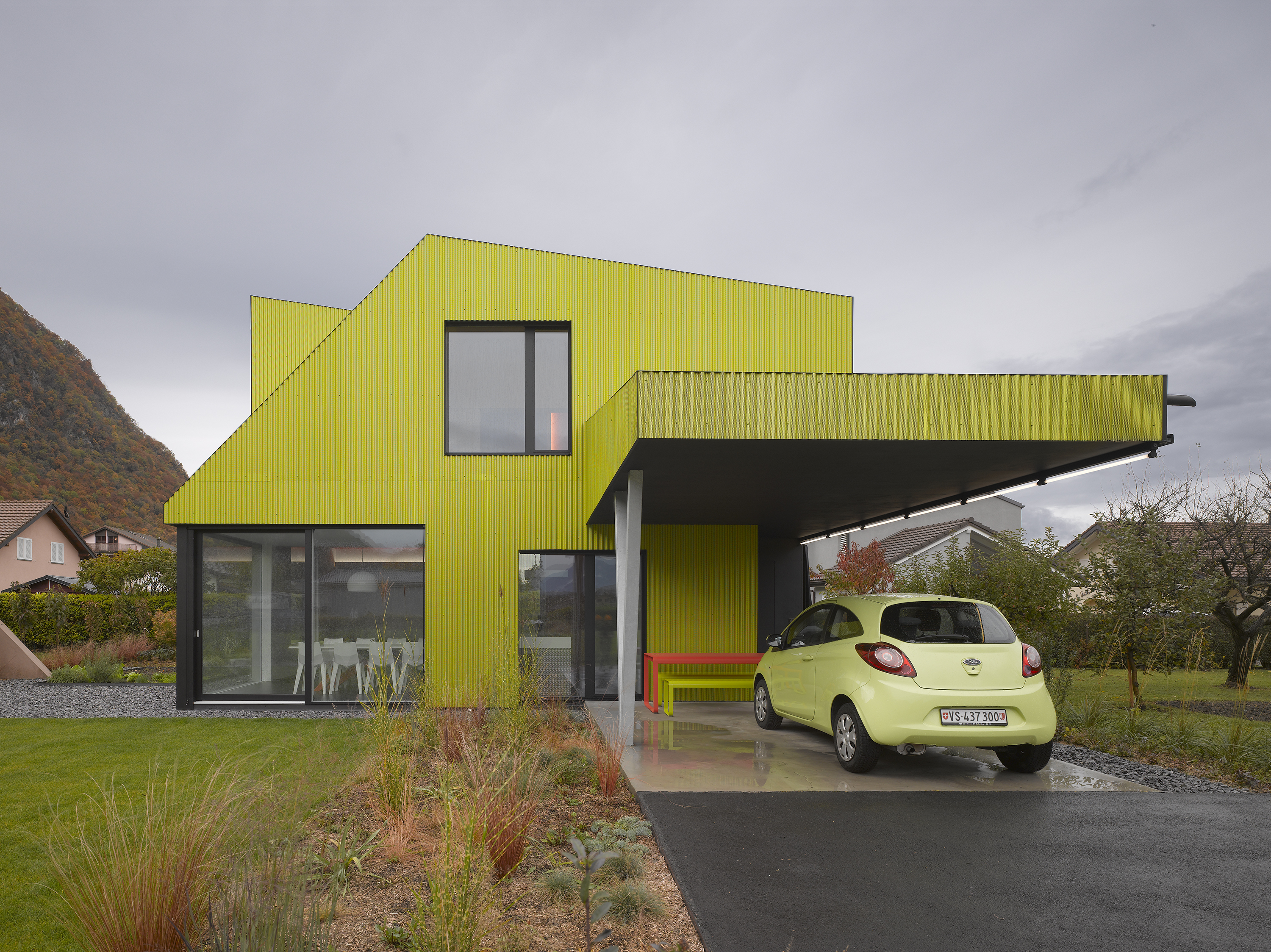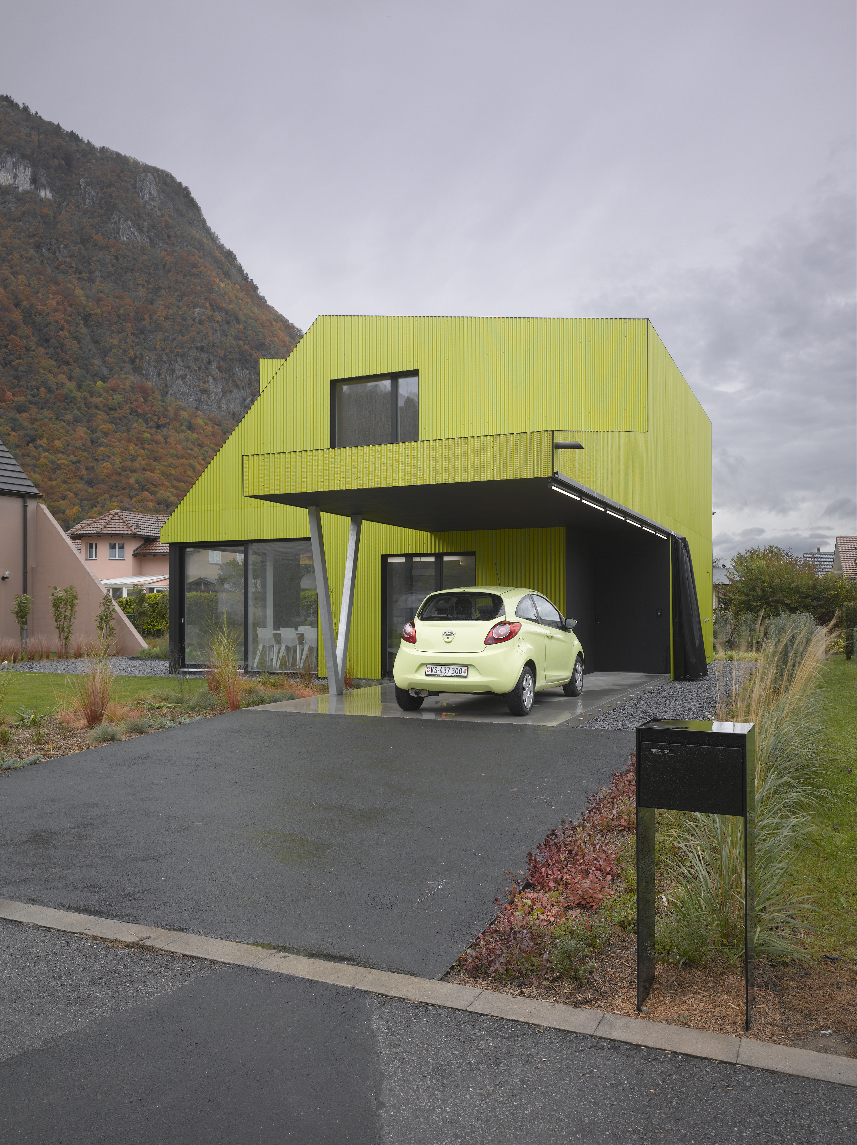 Cet espace couvert répond à plusieurs destinations : il est l’espace d’accueil d’entrée dans la maison, en hiver il abrite la voiture, en été il sert de terrasse couverte, protégée d’un rideau en bâche de camion. L’espace jour occupe le rez : les fonctions cuisiner, manger, se reposer, sont définies spatialement de manière simple : la cuisine et le coin repas sont en contact avec le jardin par le vitrage en angle, le séjour jouit d’une hauteur accrue. L’étage reçoit l’espace nuit. La chambre à coucher regarde par une haute fenêtre le Grammont, sommet marquant l’entrée de la Vallée du Rhône. Une paroi coulissante permet de convertir le coin bureau en chambre d’amis. A l’image d’une cabane dans le jardin, la maison est bâtie en ossature bois sur un radier béton. Sa peau est un bardage d’aluminium ondulé éloxé et perforé en façade, pour permettre une pose continue devant les fenêtres des espaces de services.