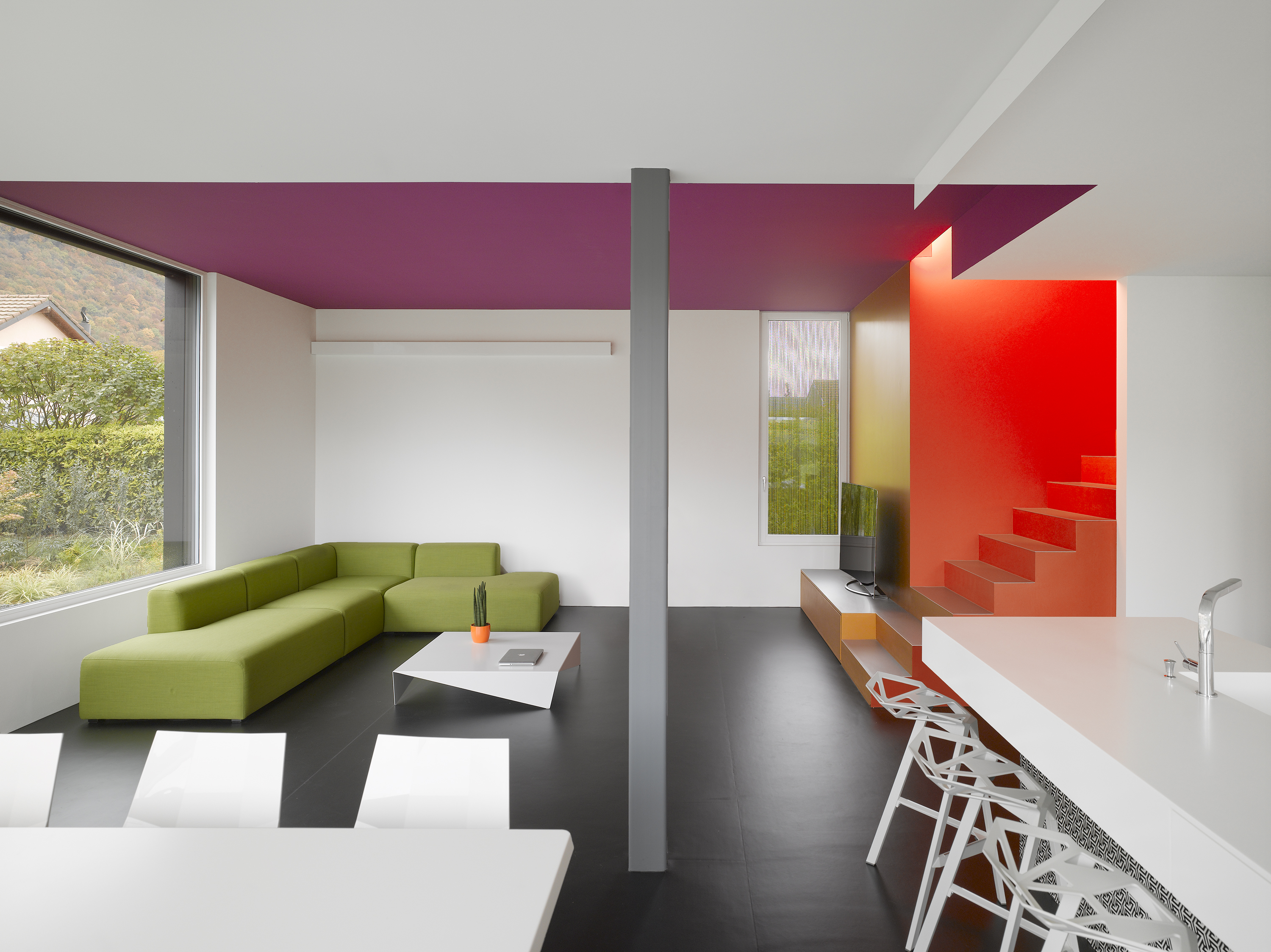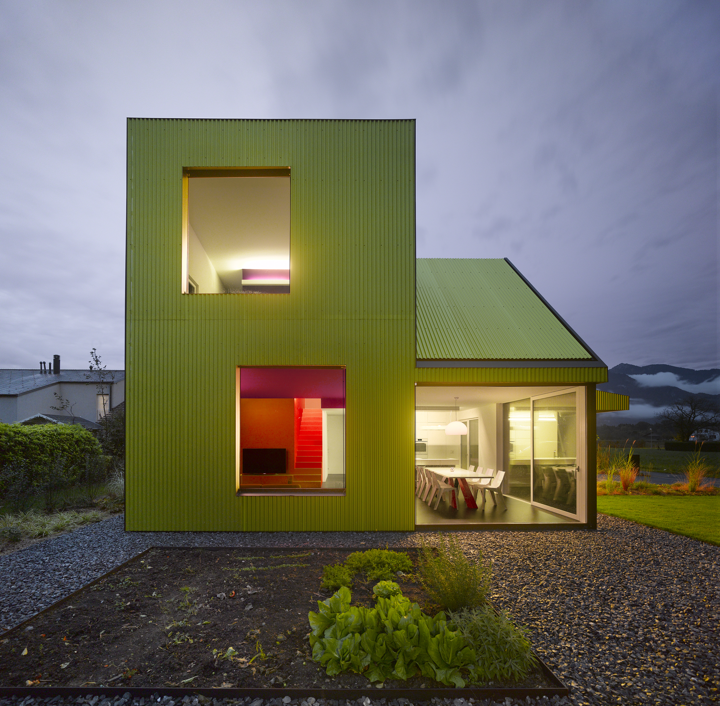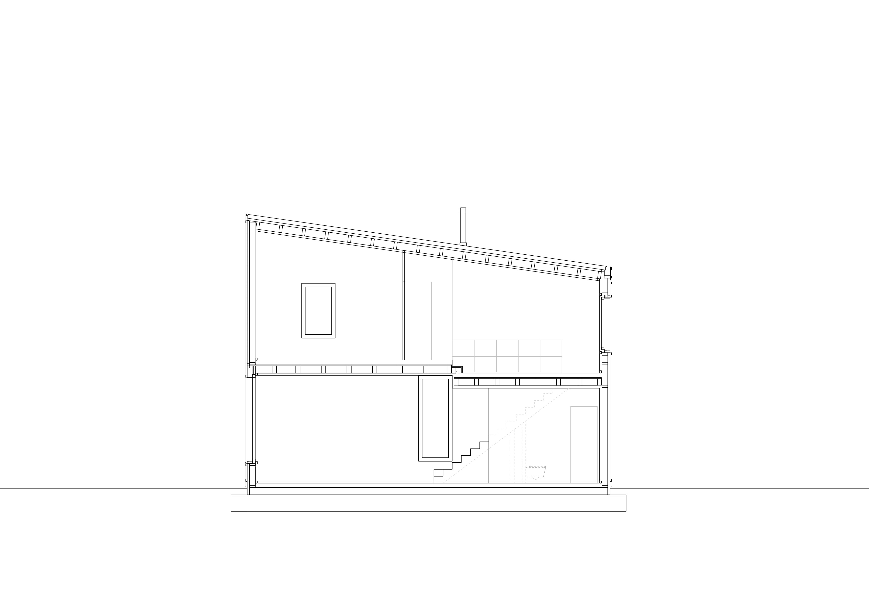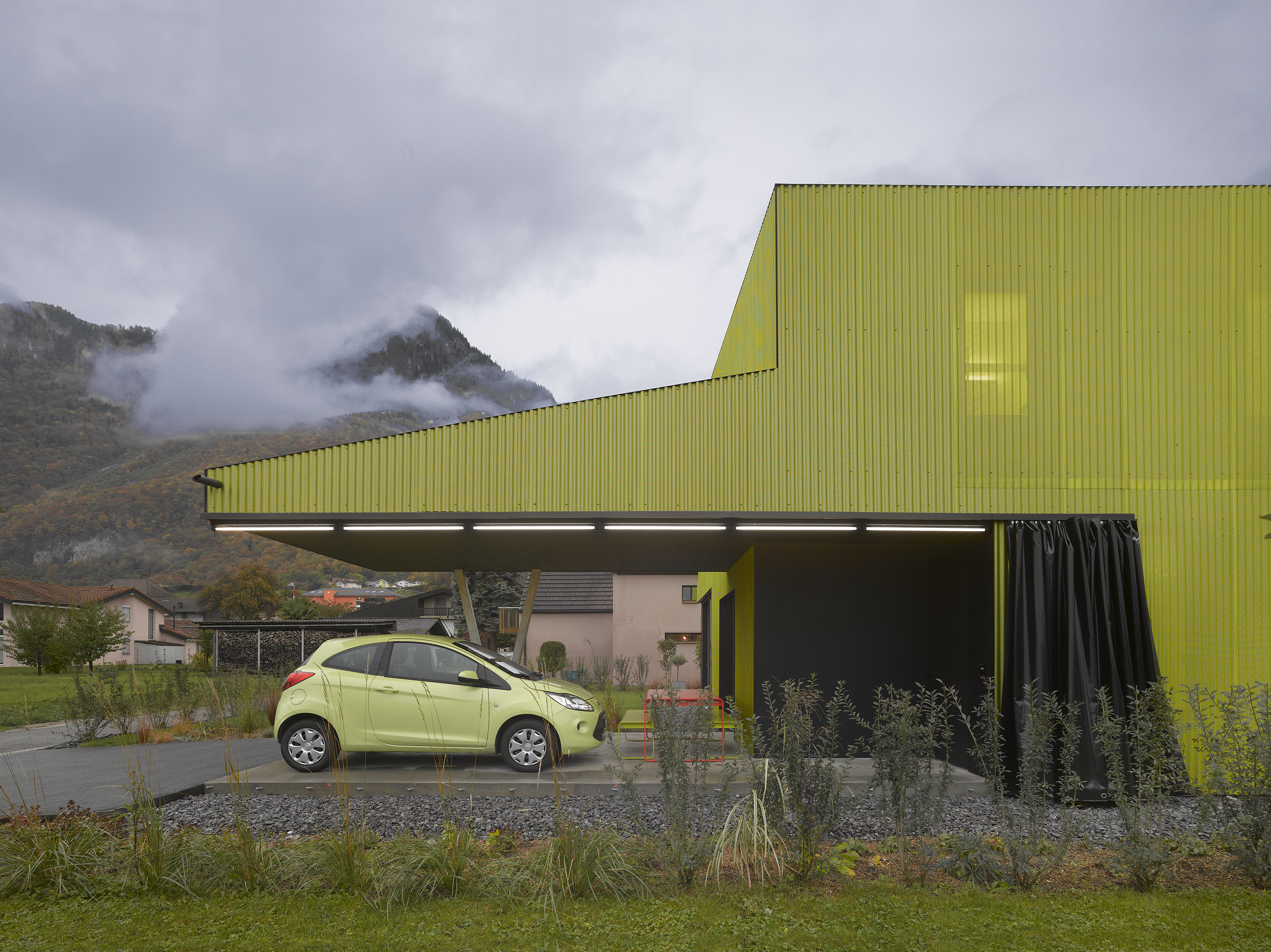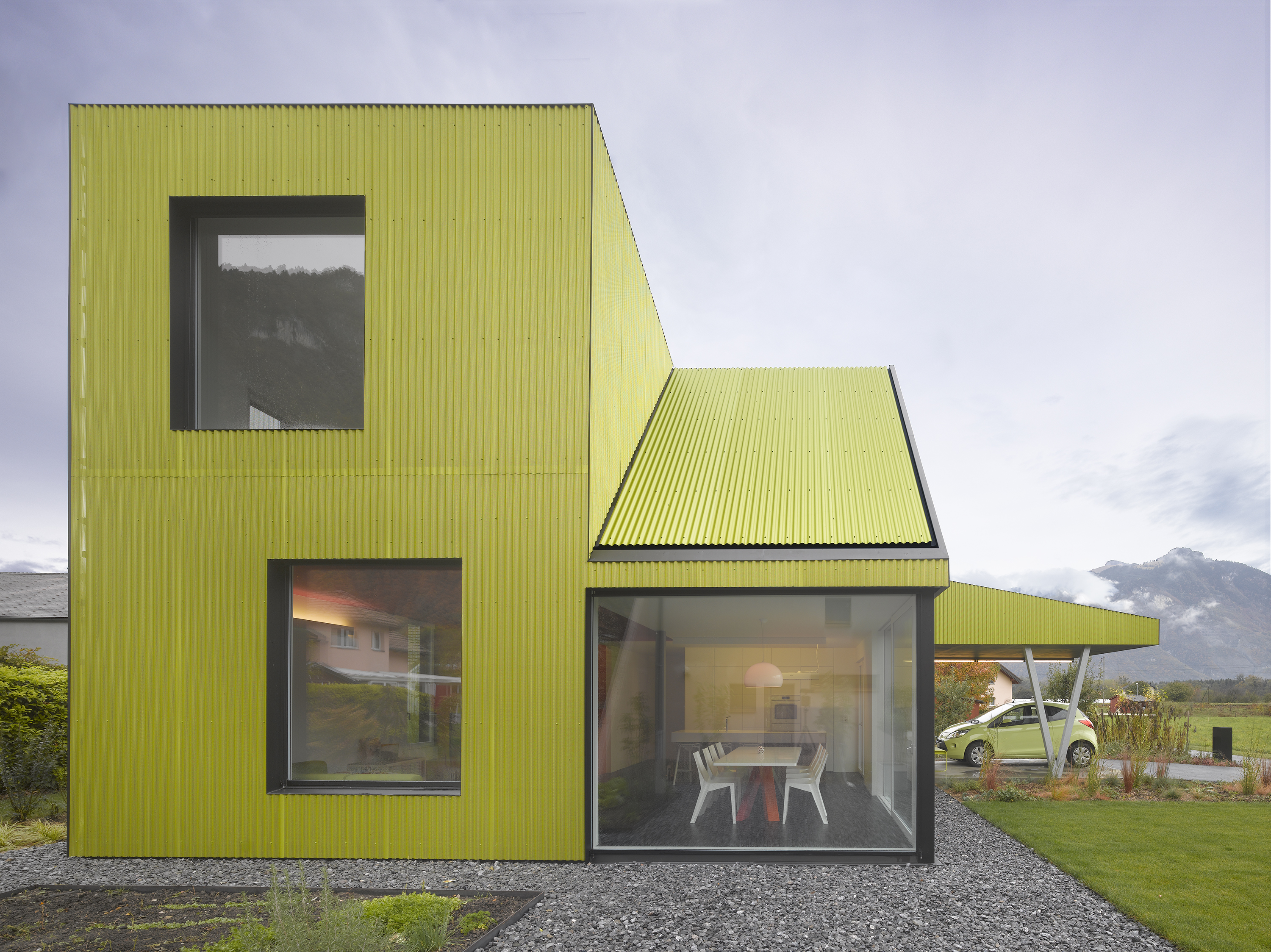 Cet espace couvert répond à plusieurs destinations : il est l’espace d’accueil d’entrée dans la maison, en hiver il abrite la voiture, en été il sert de terrasse couverte, protégée d’un rideau en bâche de camion. L’espace jour occupe le rez : les fonctions cuisiner, manger, se reposer, sont définies spatialement de manière simple : la cuisine et le coin repas sont en contact avec le jardin par le vitrage en angle, le séjour jouit d’une hauteur accrue. L’étage reçoit l’espace nuit. La chambre à coucher regarde par une haute fenêtre le Grammont, sommet marquant l’entrée de la Vallée du Rhône. Une paroi coulissante permet de convertir le coin bureau en chambre d’amis. A l’image d’une cabane dans le jardin, la maison est bâtie en ossature bois sur un radier béton. Sa peau est un bardage d’aluminium ondulé éloxé et perforé en façade, pour permettre une pose continue devant les fenêtres des espaces de services.