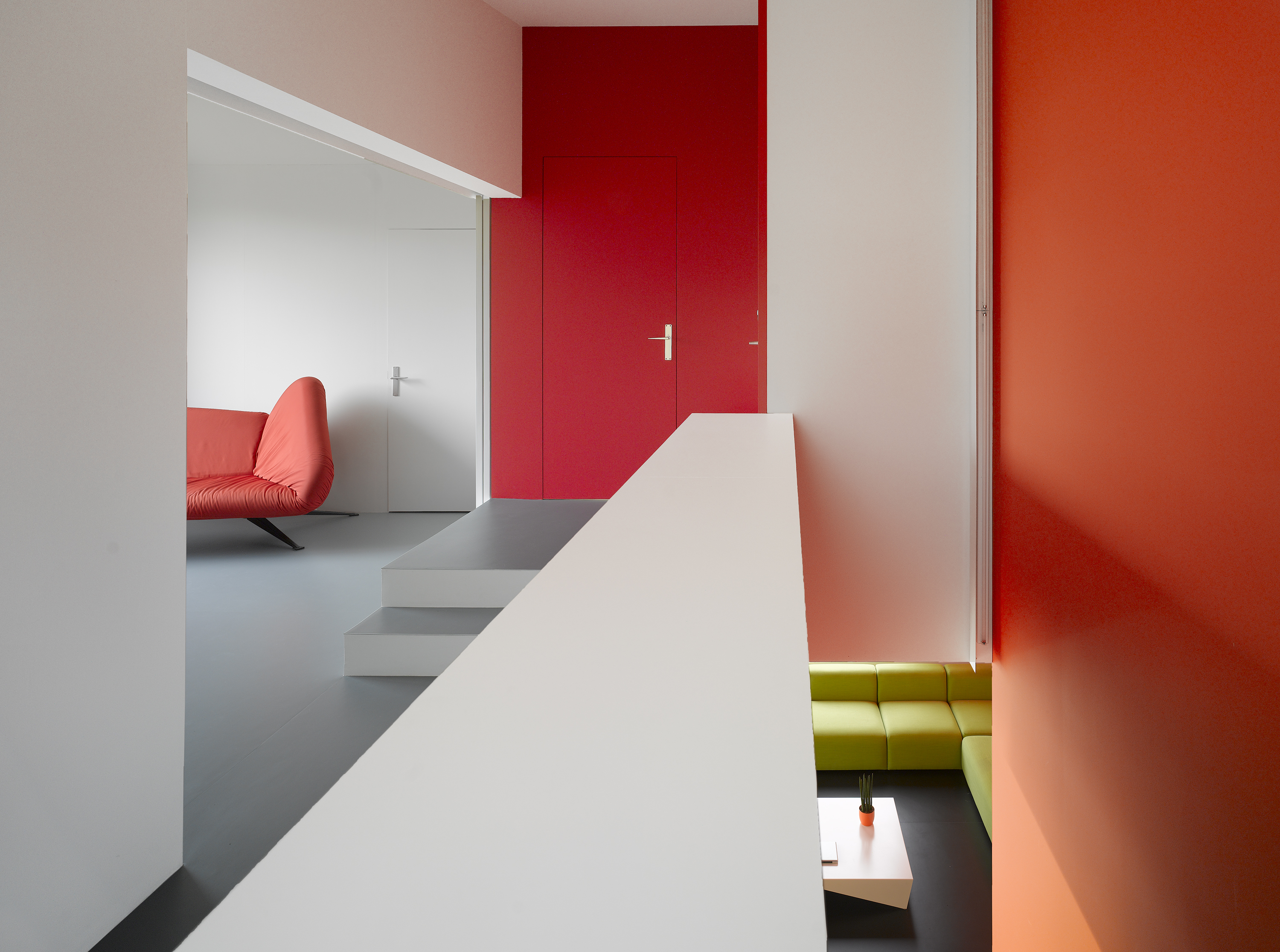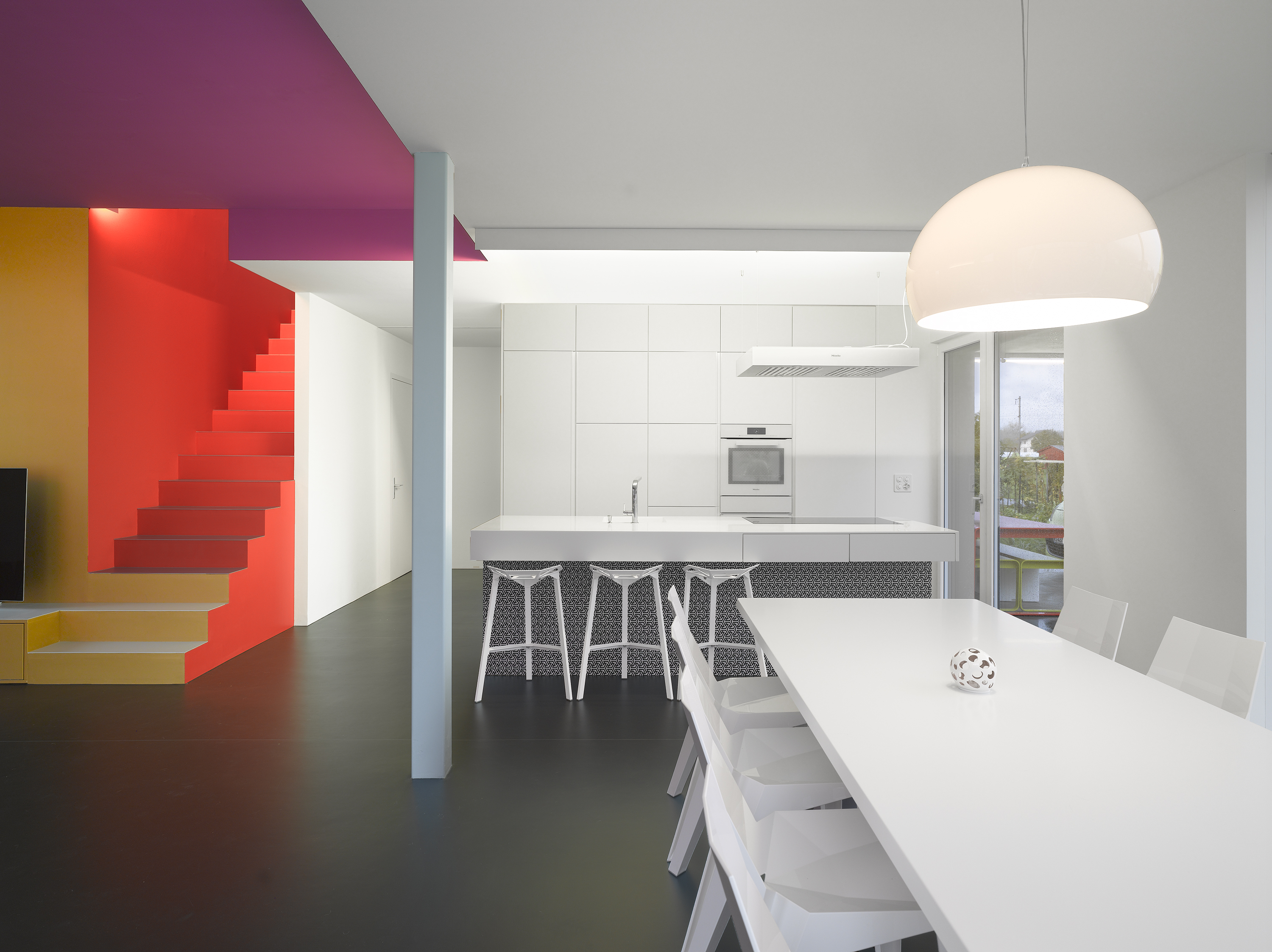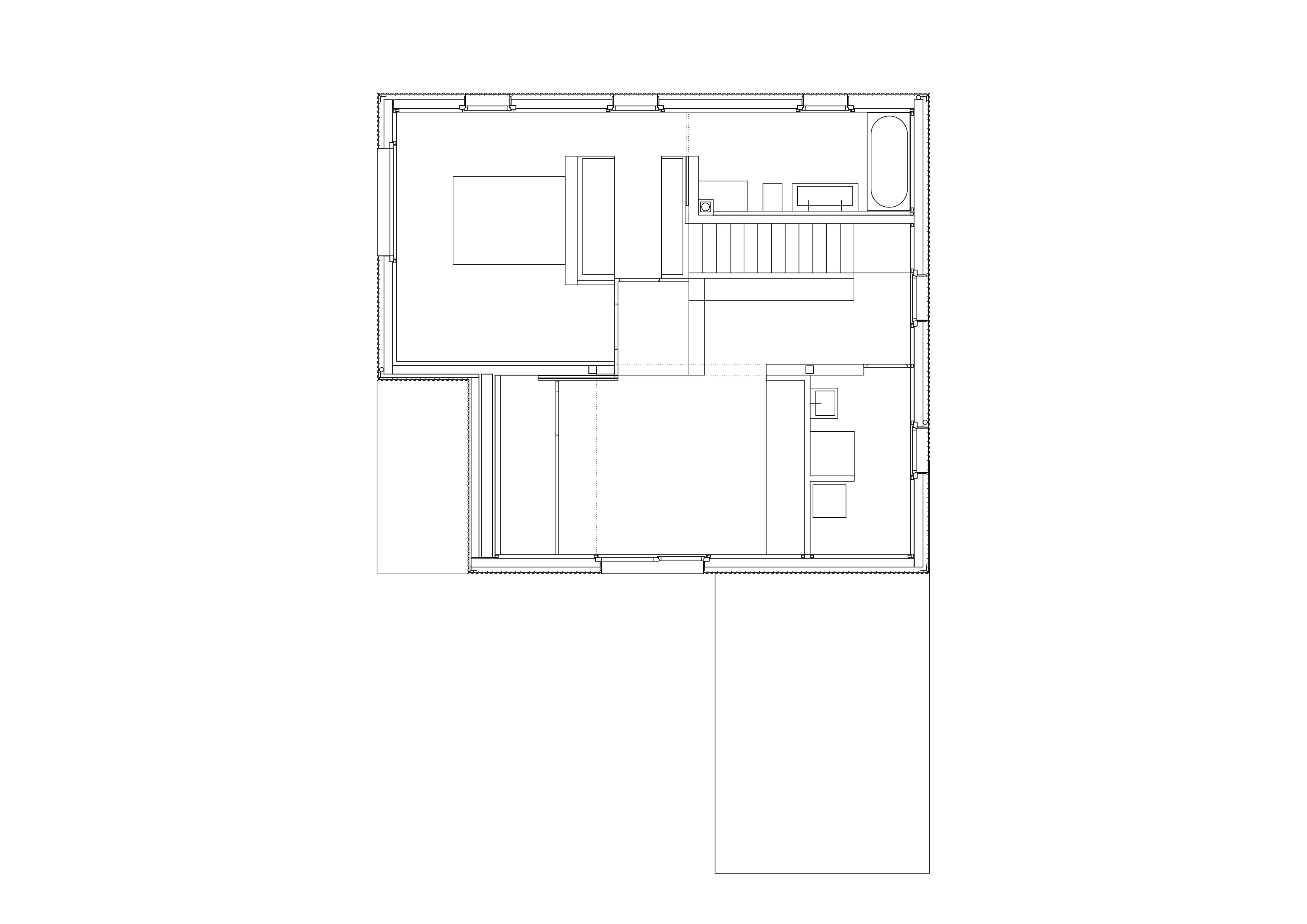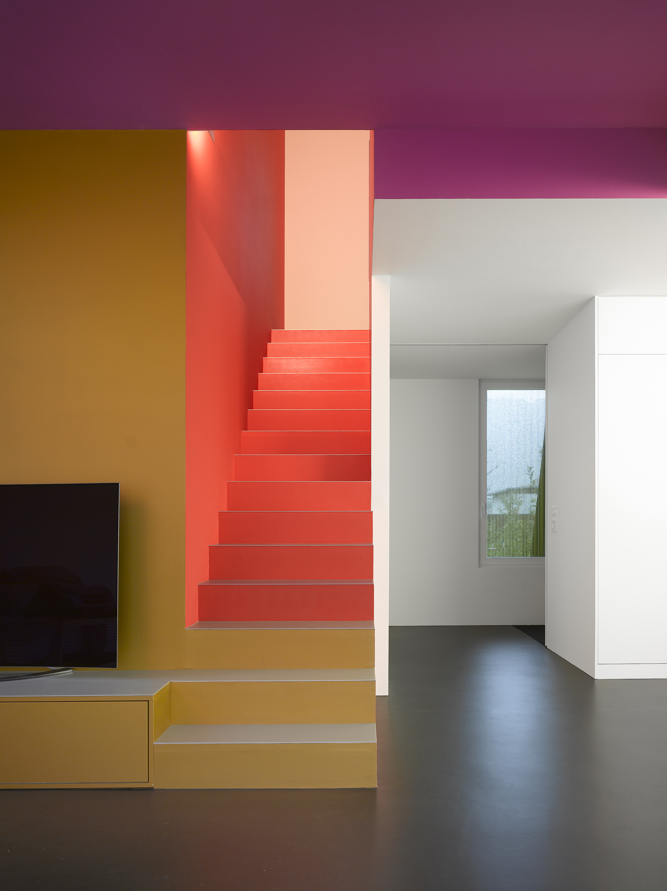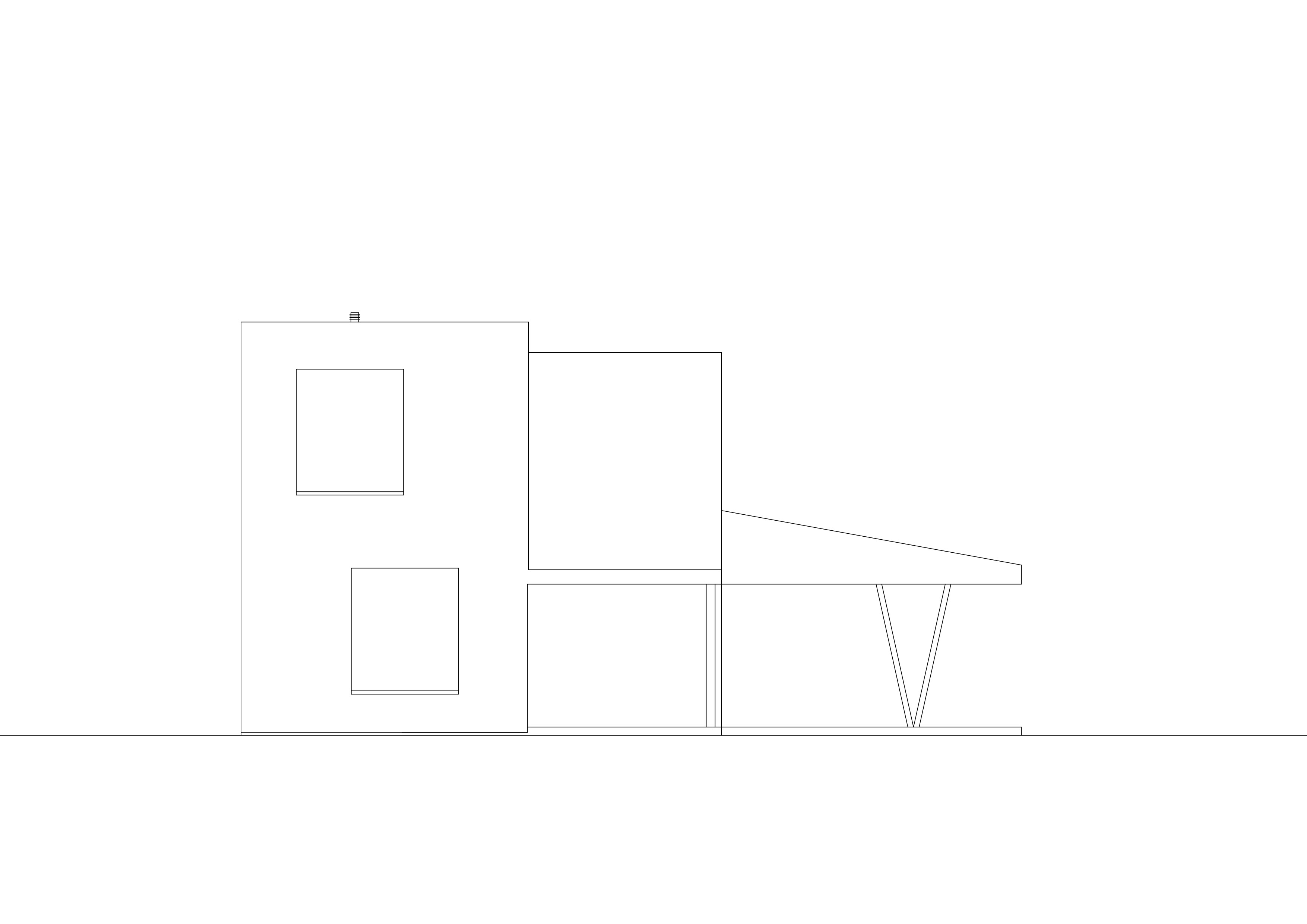 Cet espace couvert répond à plusieurs destinations : il est l’espace d’accueil d’entrée dans la maison, en hiver il abrite la voiture, en été il sert de terrasse couverte, protégée d’un rideau en bâche de camion. L’espace jour occupe le rez : les fonctions cuisiner, manger, se reposer, sont définies spatialement de manière simple : la cuisine et le coin repas sont en contact avec le jardin par le vitrage en angle, le séjour jouit d’une hauteur accrue. L’étage reçoit l’espace nuit. La chambre à coucher regarde par une haute fenêtre le Grammont, sommet marquant l’entrée de la Vallée du Rhône. Une paroi coulissante permet de convertir le coin bureau en chambre d’amis. A l’image d’une cabane dans le jardin, la maison est bâtie en ossature bois sur un radier béton. Sa peau est un bardage d’aluminium ondulé éloxé et perforé en façade, pour permettre une pose continue devant les fenêtres des espaces de services.