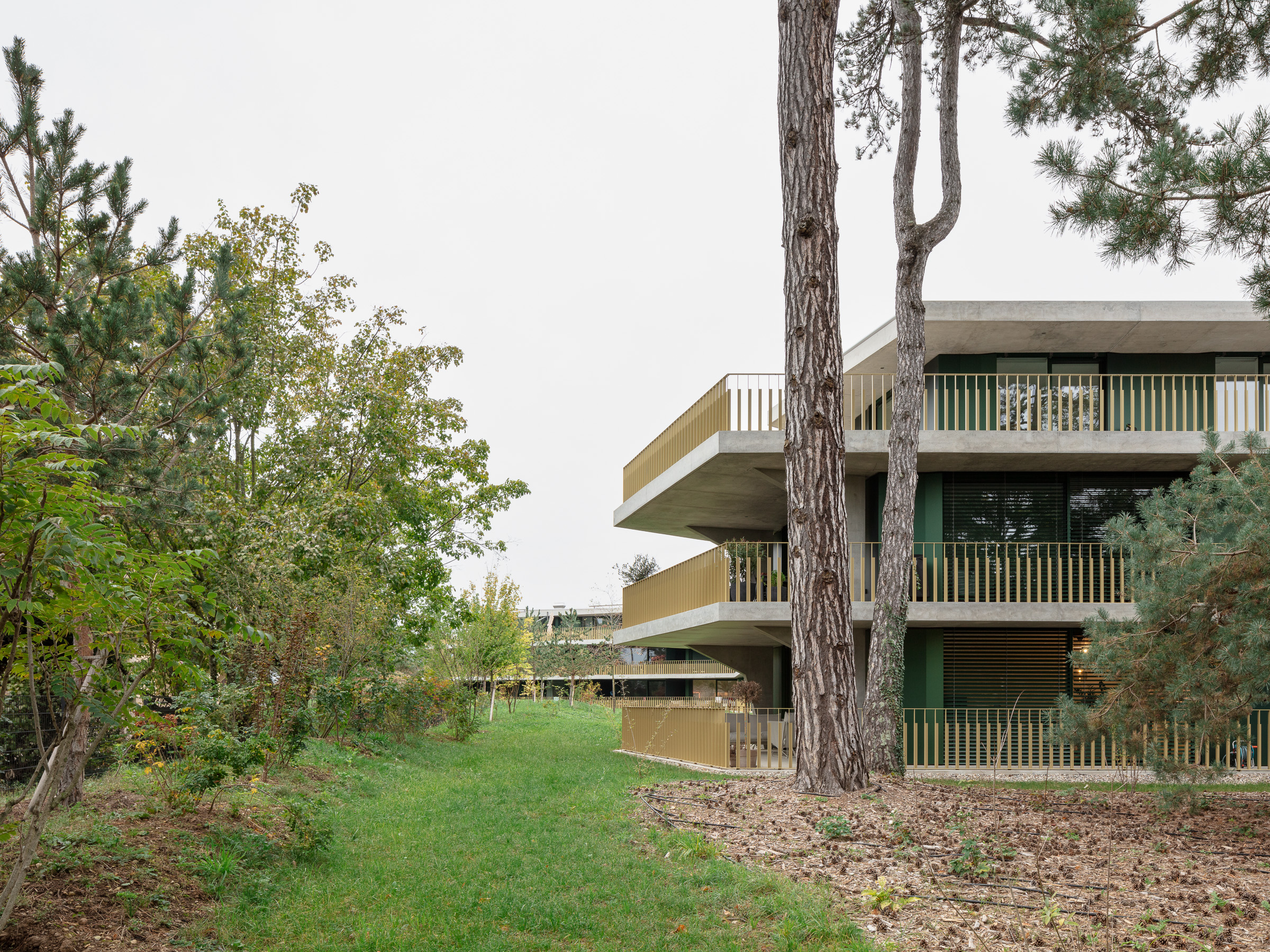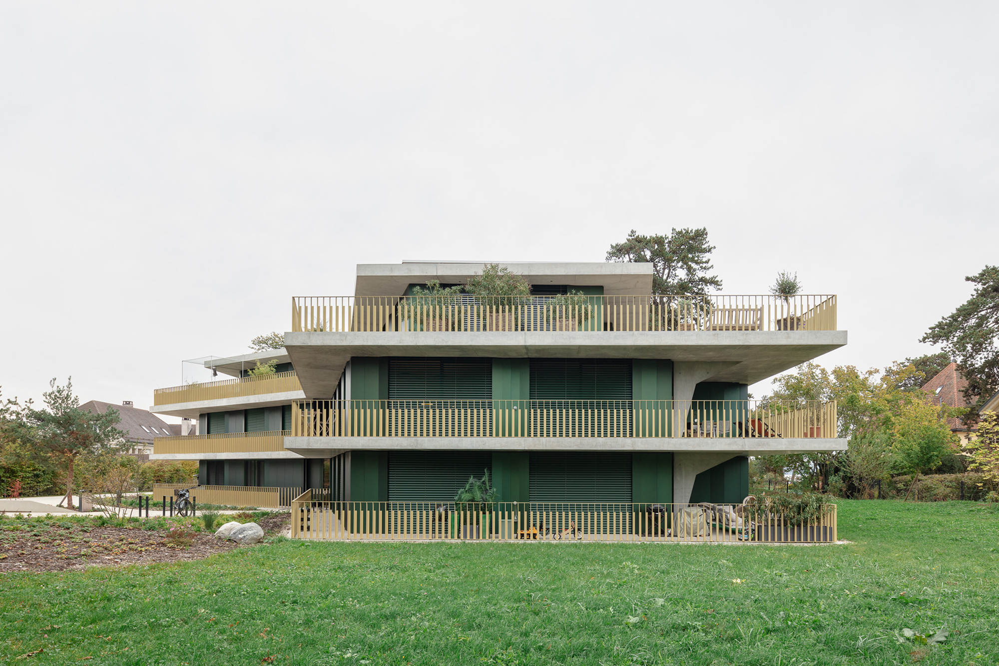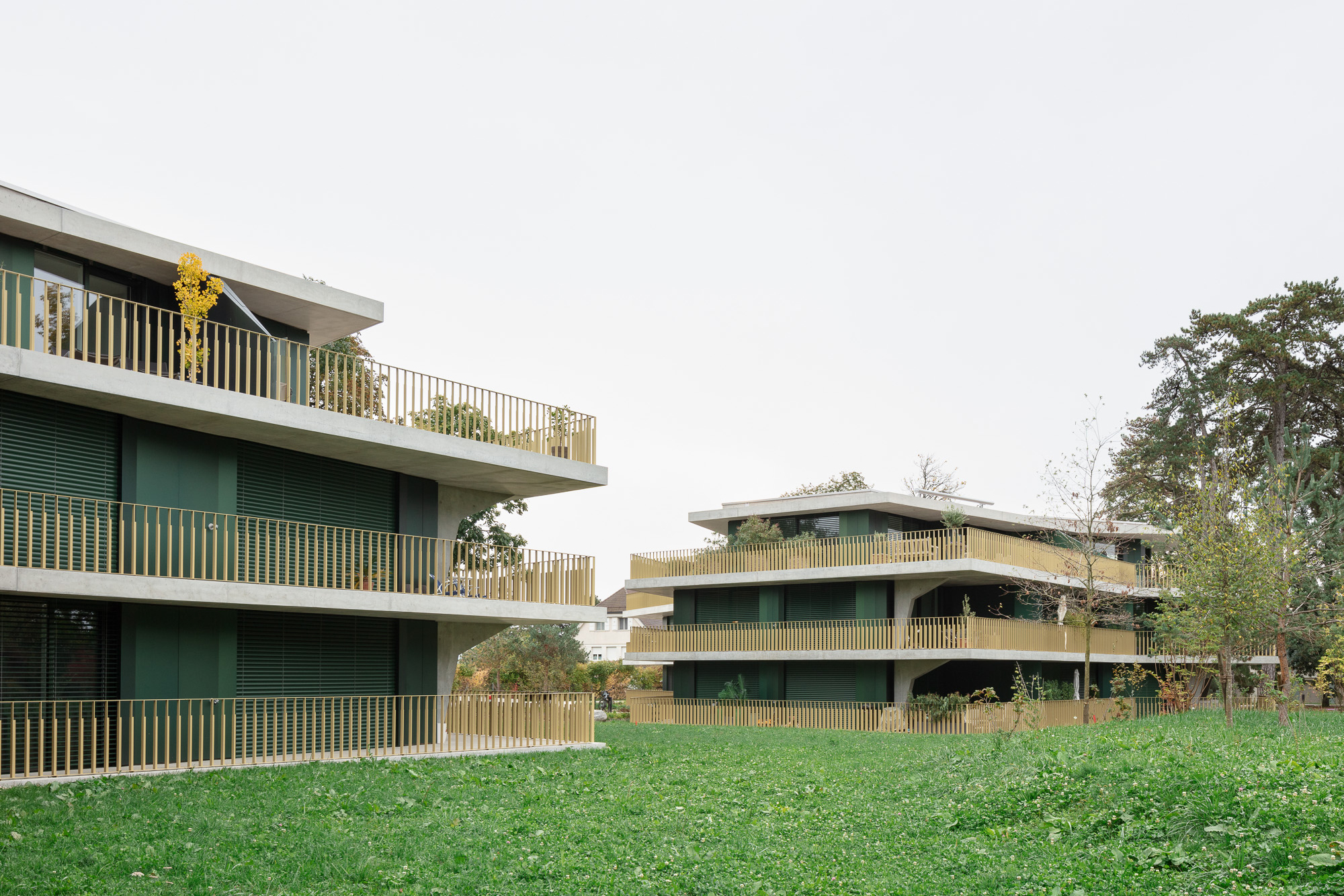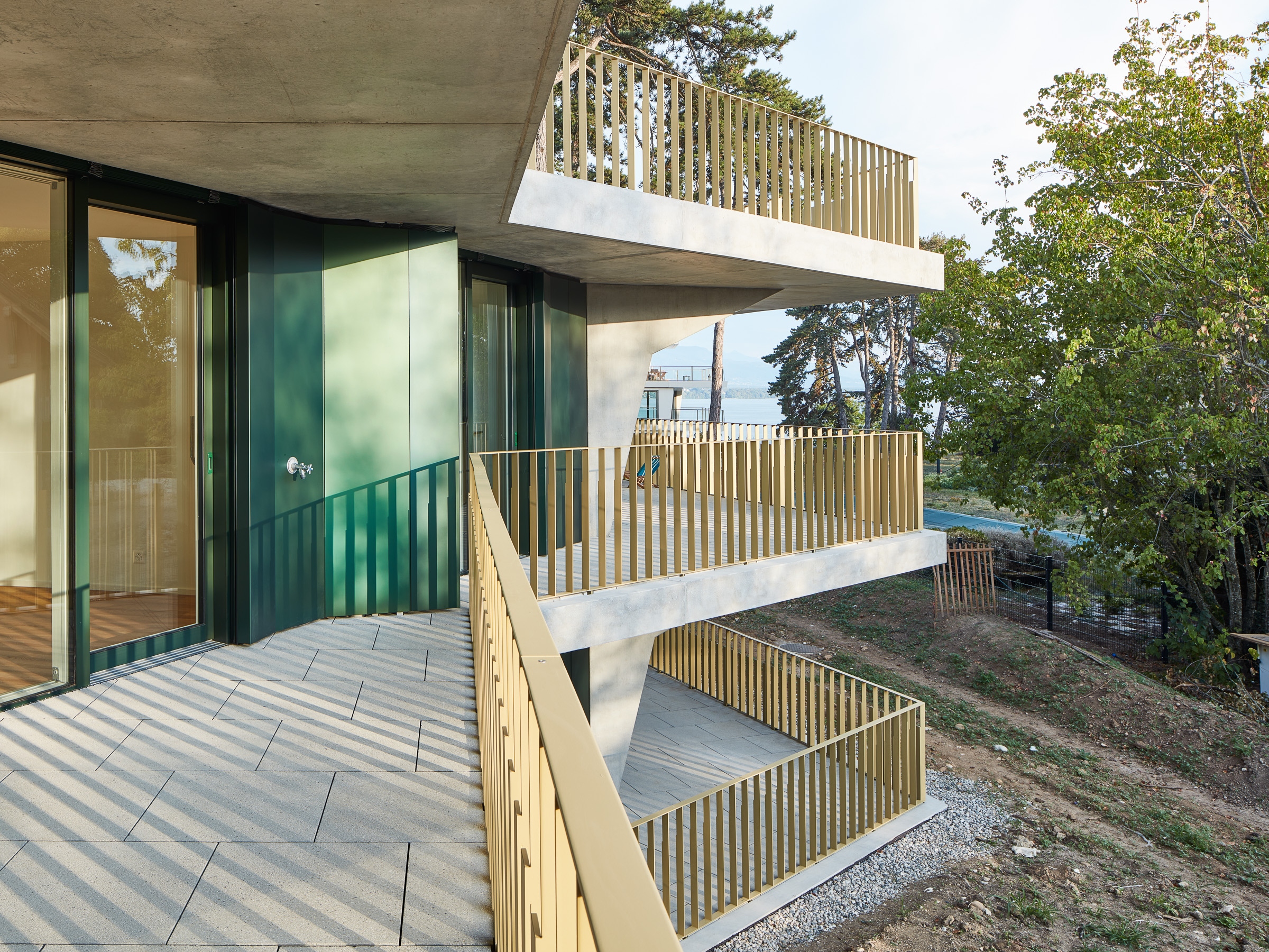Les deux bâtiments situés au nord de la parcelle sont organisés sur trois niveaux hors sol et un sous-sol. Trois cages d’escaliers, de forme trapézoïdale dictée par les choix morphologiques, distribuent par étage entre deux et cinq appartements. Les typologies d’appartements varient selon leur emplacement, allant de mono-orienté à traversant. Toutes les zones de jour bénéficient d’une double orientation vers le lac, tandis que les espaces de nuit profitent de la lumière douce du nord. Ceinturant les volumes, des dalles en béton offrent de généreux balcons-terrasses, prolongeant vers l’extérieur l’espace d’appropriation des appartements. L’utilisation du béton, laissé apparent dans les cages d’escalier, sur les balcons-coursives, ainsi que son système de poteaux inclinés, dévoile la structure et accentue l'horizontalité de la façade.