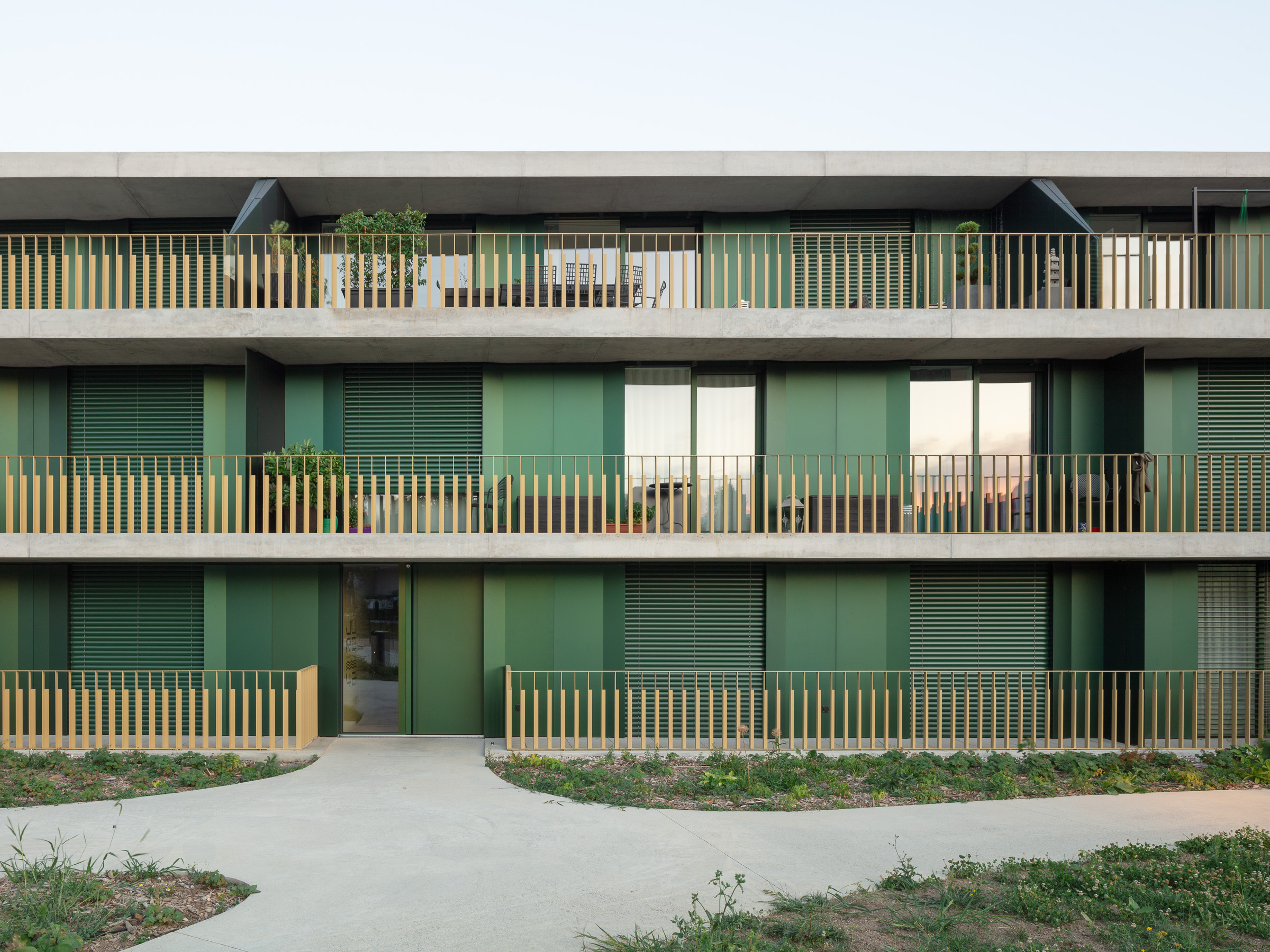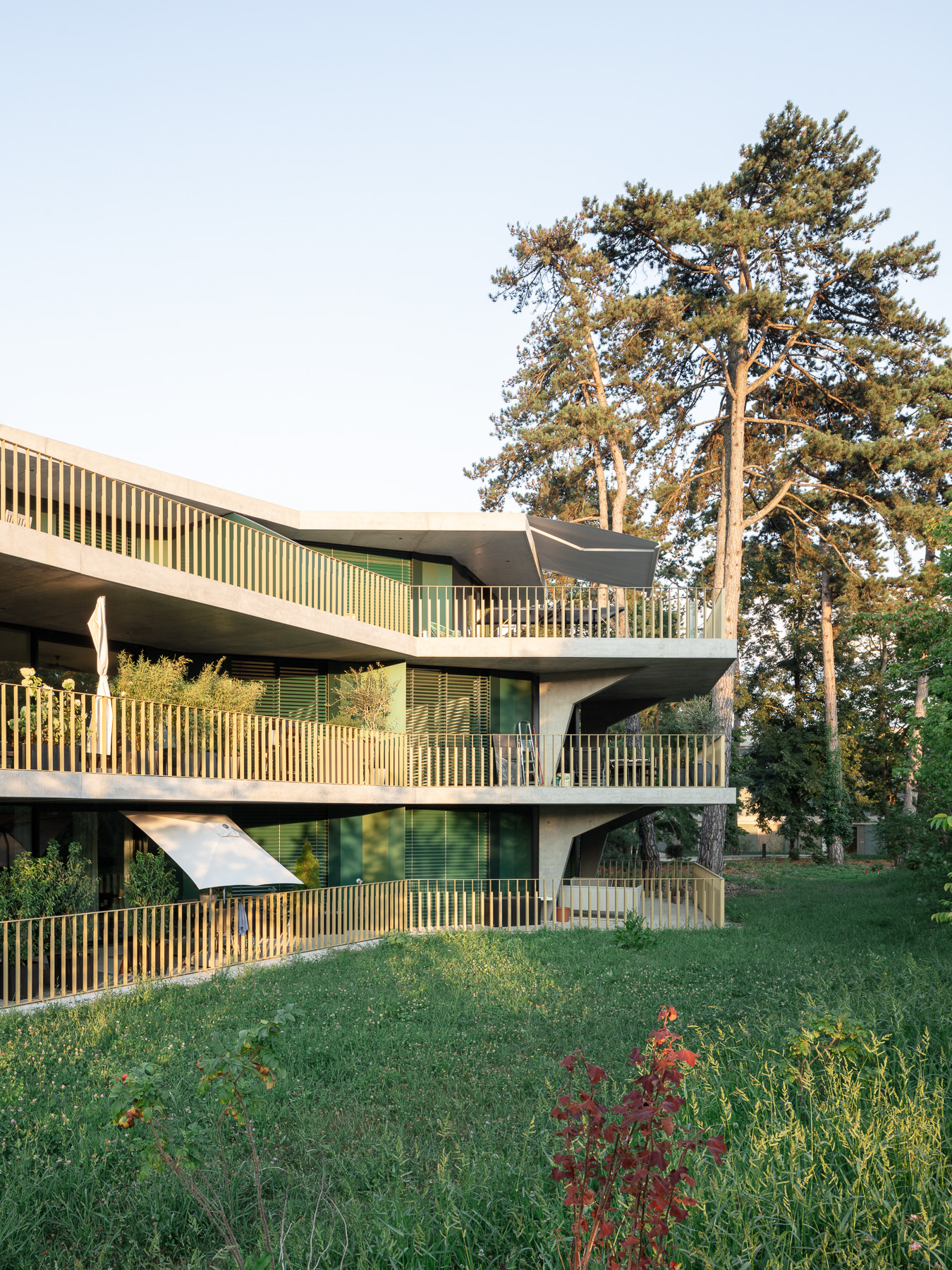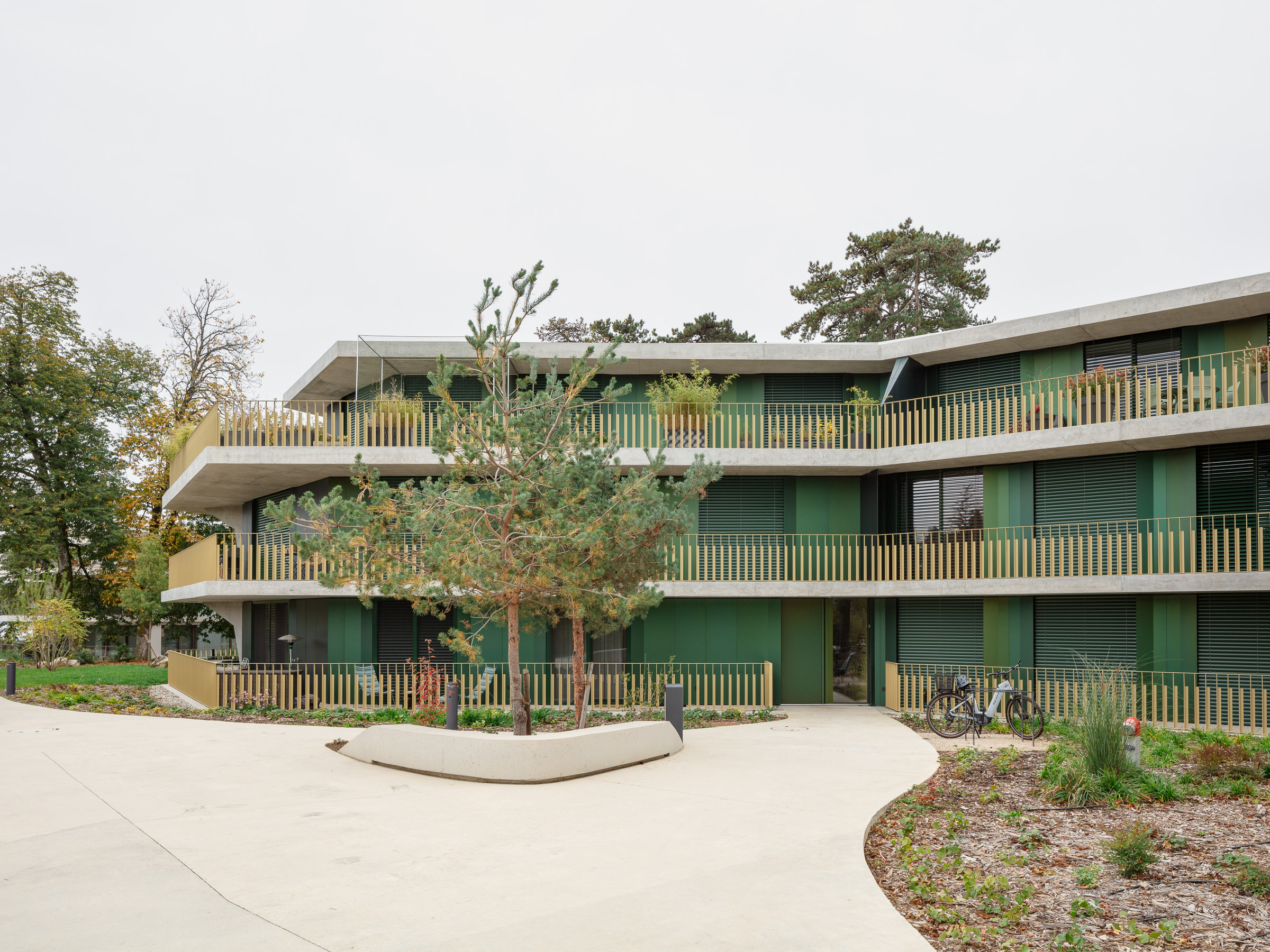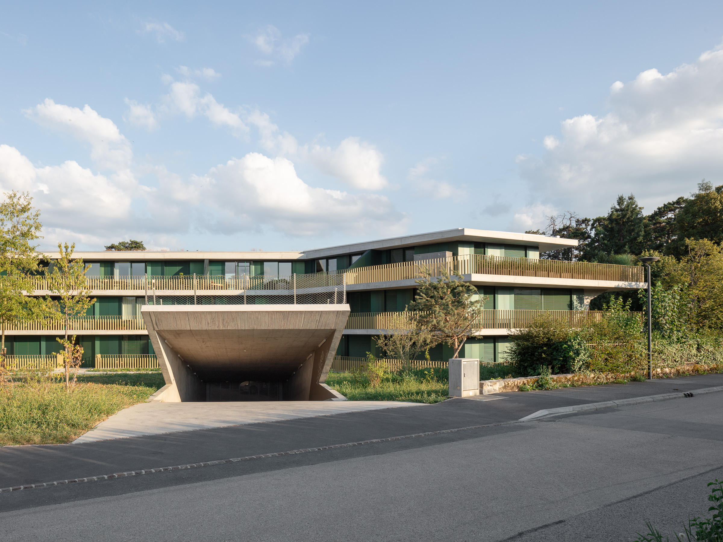 Les deux bâtiments situés au nord de la parcelle sont organisés sur trois niveaux hors sol et un sous-sol. Trois cages d’escaliers, de forme trapézoïdale dictée par les choix morphologiques, distribuent par étage entre deux et cinq appartements. Les typologies d’appartements varient selon leur emplacement, allant de mono-orienté à traversant. Toutes les zones de jour bénéficient d’une double orientation vers le lac, tandis que les espaces de nuit profitent de la lumière douce du nord. Ceinturant les volumes, des dalles en béton offrent de généreux balcons-terrasses, prolongeant vers l’extérieur l’espace d’appropriation des appartements. L’utilisation du béton, laissé apparent dans les cages d’escalier, sur les balcons-coursives, ainsi que son système de poteaux inclinés, dévoile la structure et accentue l'horizontalité de la façade.