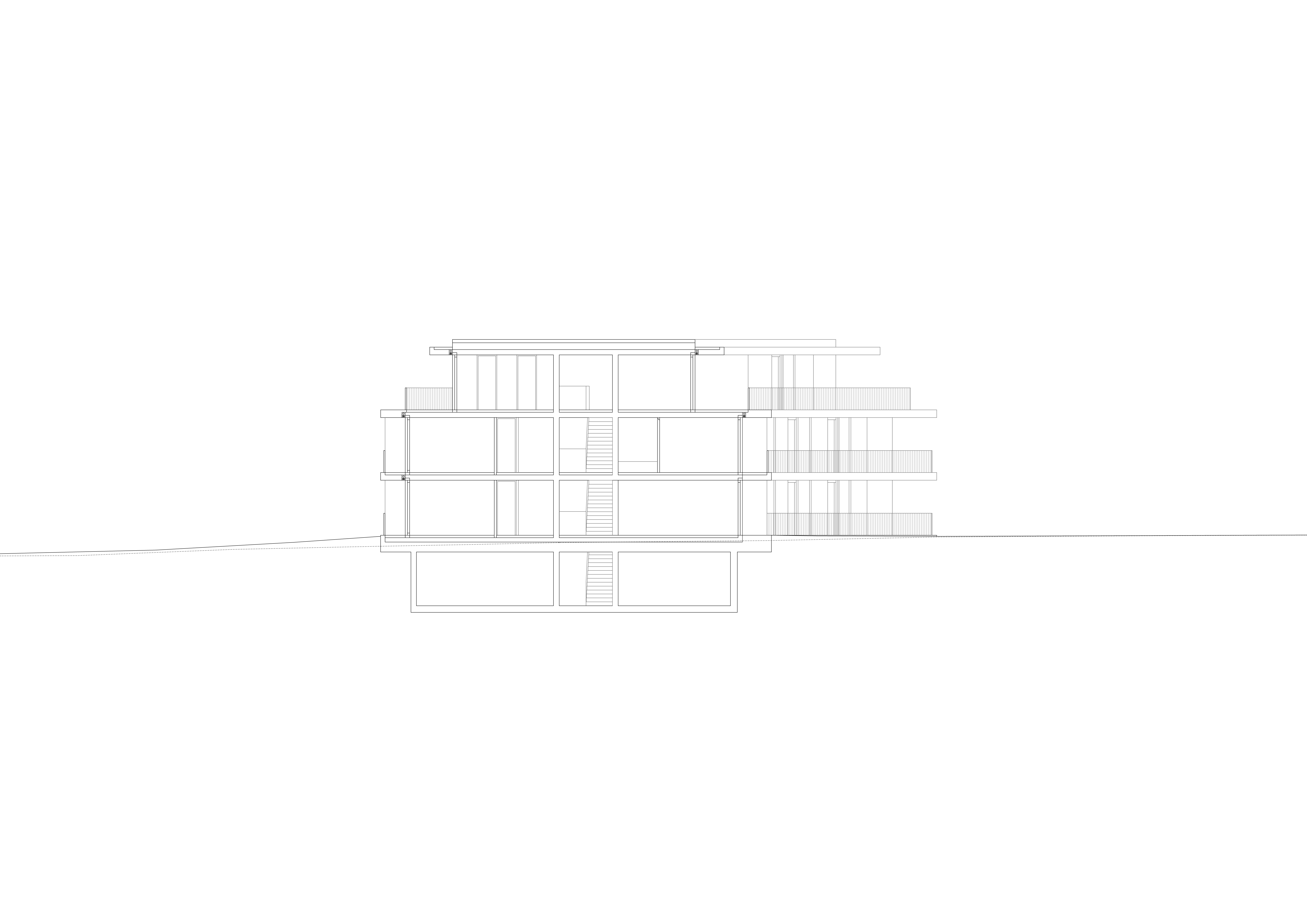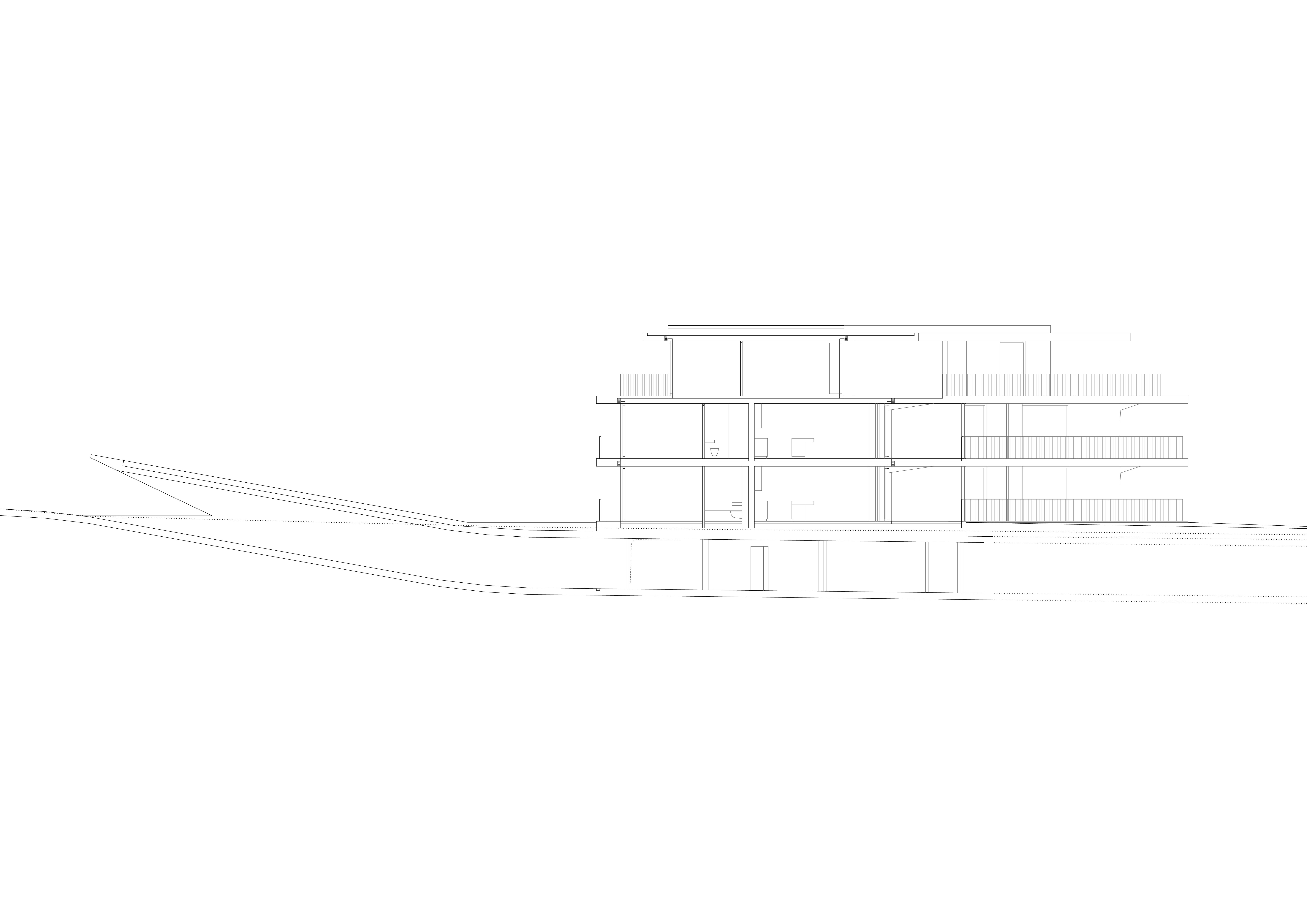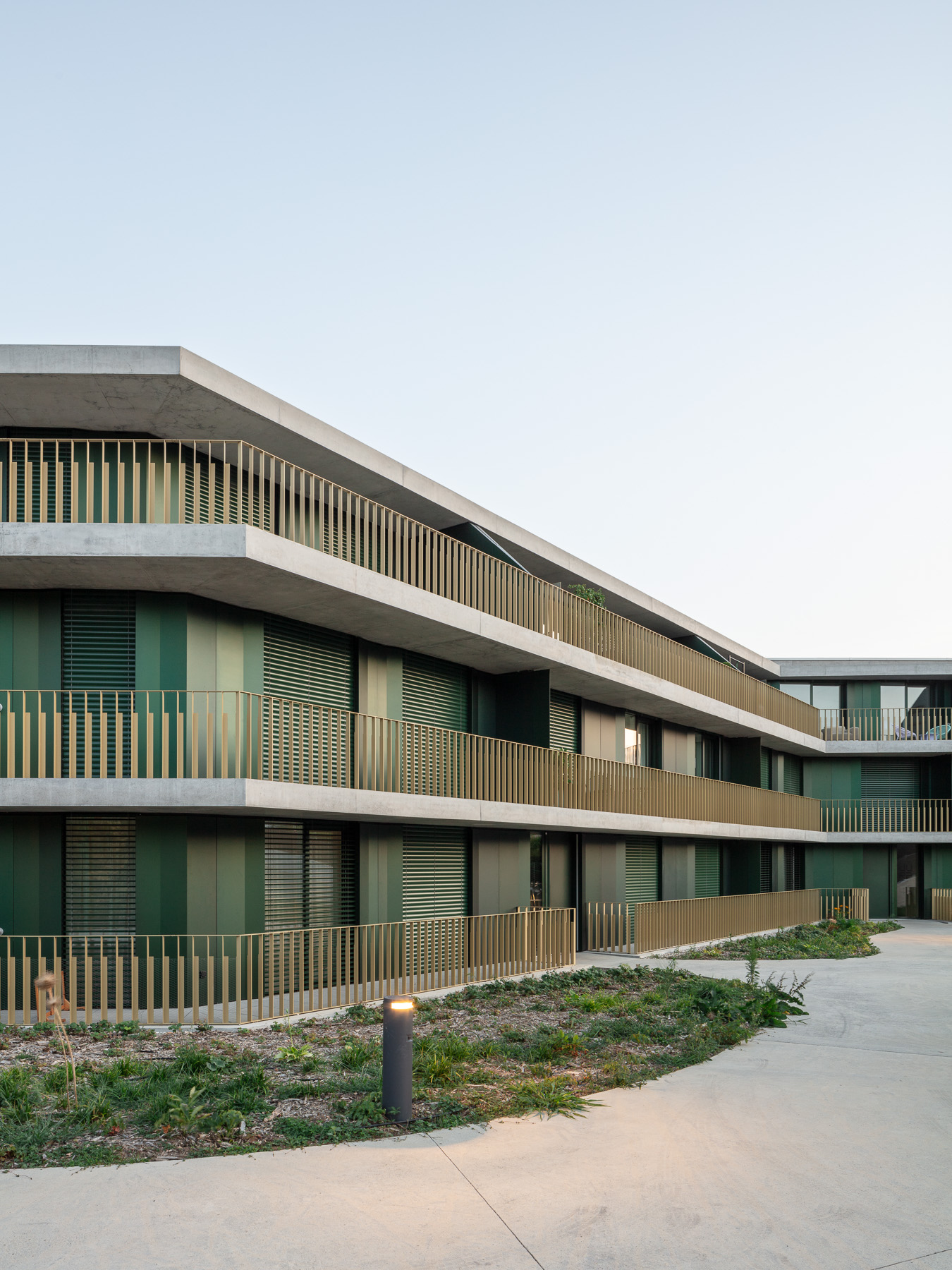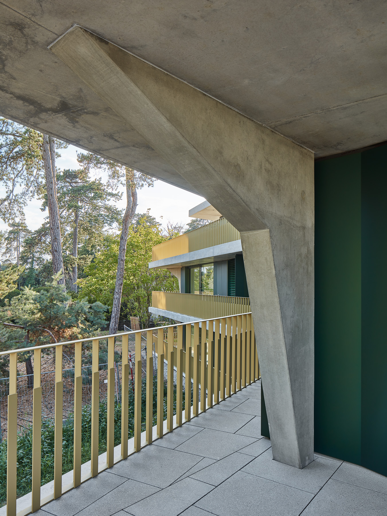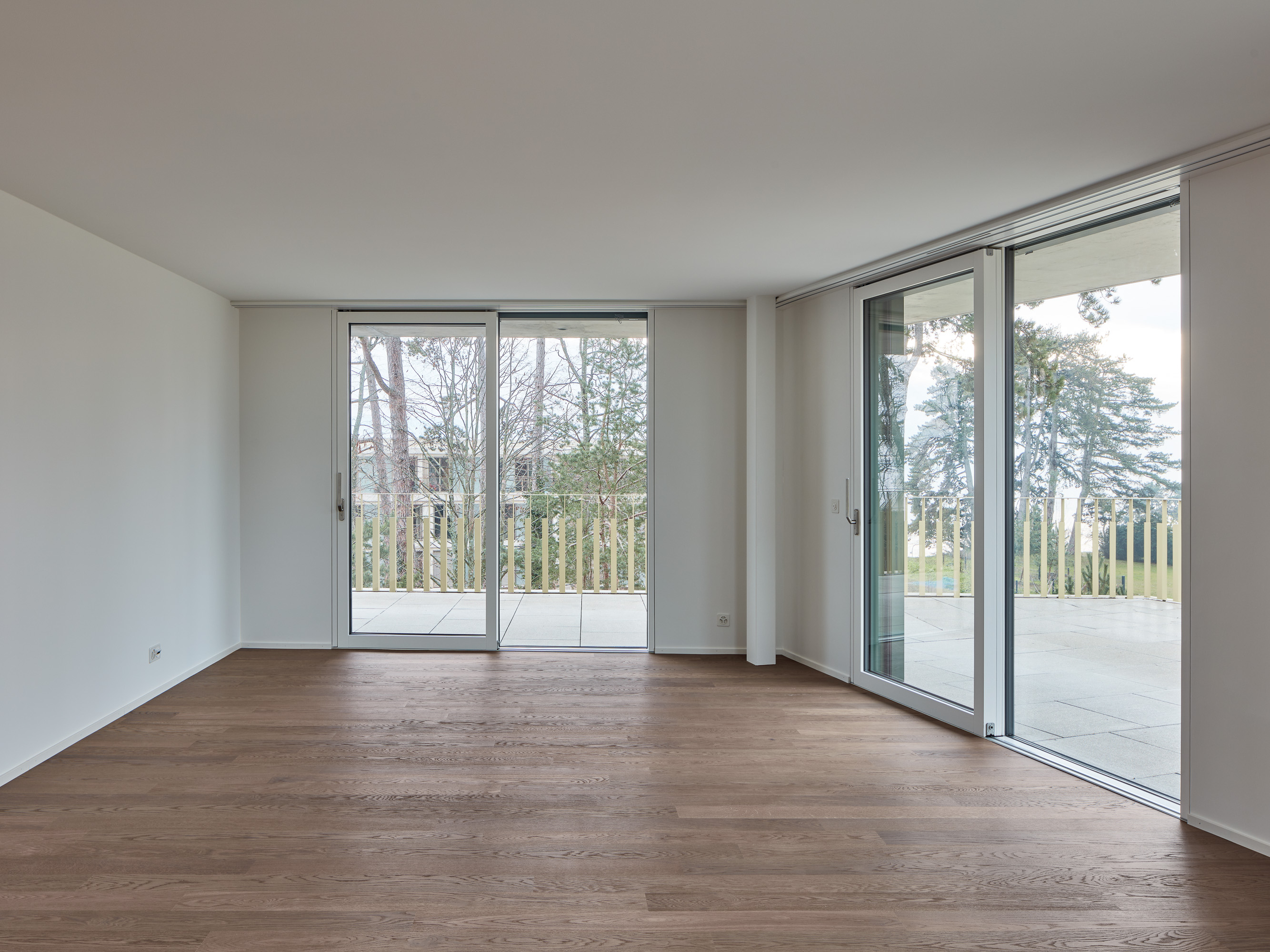 Les deux bâtiments situés au nord de la parcelle sont organisés sur trois niveaux hors sol et un sous-sol. Trois cages d’escaliers, de forme trapézoïdale dictée par les choix morphologiques, distribuent par étage entre deux et cinq appartements. Les typologies d’appartements varient selon leur emplacement, allant de mono-orienté à traversant. Toutes les zones de jour bénéficient d’une double orientation vers le lac, tandis que les espaces de nuit profitent de la lumière douce du nord. Ceinturant les volumes, des dalles en béton offrent de généreux balcons-terrasses, prolongeant vers l’extérieur l’espace d’appropriation des appartements. L’utilisation du béton, laissé apparent dans les cages d’escalier, sur les balcons-coursives, ainsi que son système de poteaux inclinés, dévoile la structure et accentue l'horizontalité de la façade.