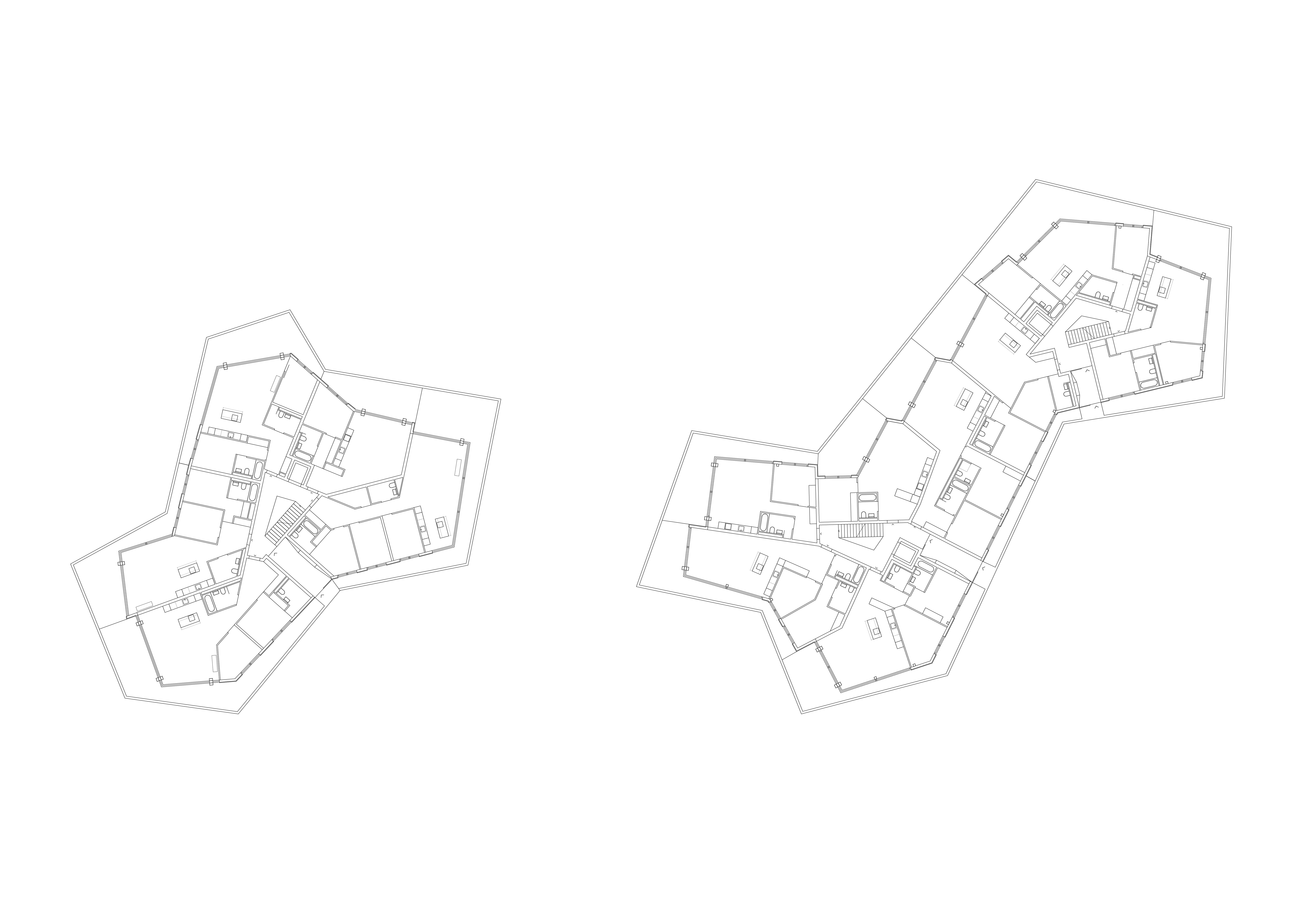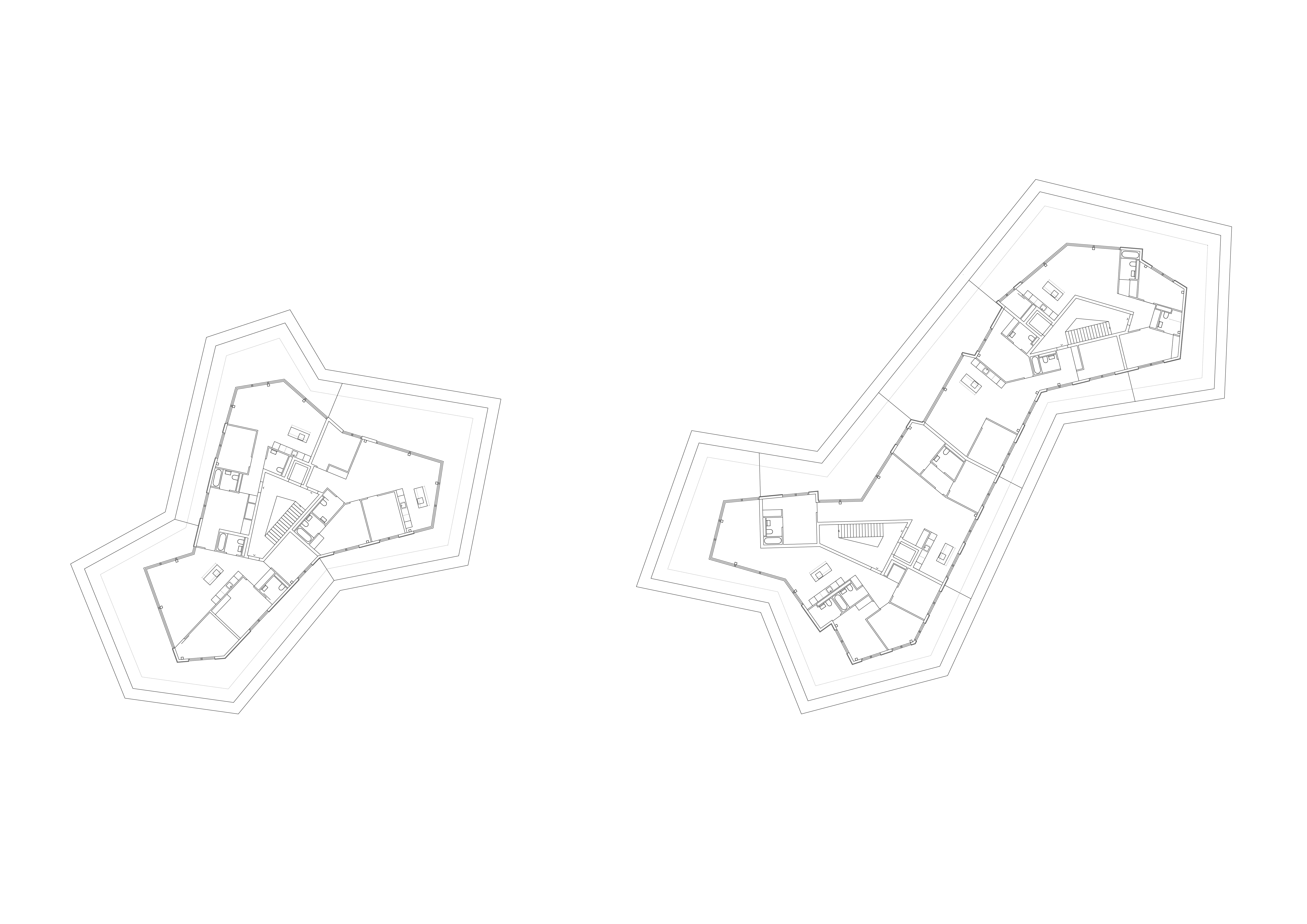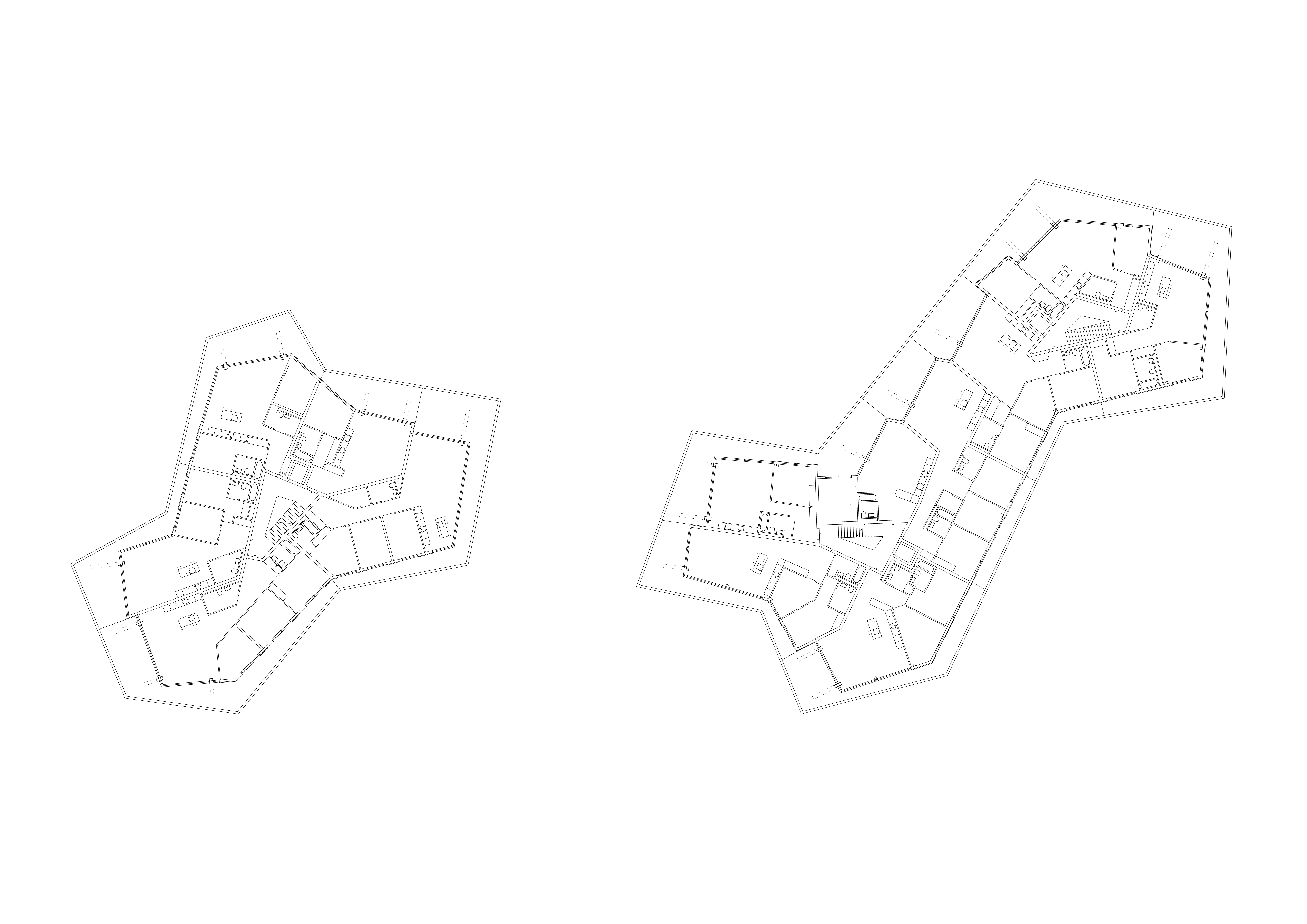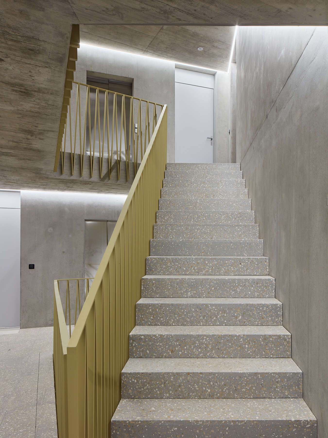 Les deux bâtiments situés au nord de la parcelle sont organisés sur trois niveaux hors sol et un sous-sol. Trois cages d’escaliers, de forme trapézoïdale dictée par les choix morphologiques, distribuent par étage entre deux et cinq appartements. Les typologies d’appartements varient selon leur emplacement, allant de mono-orienté à traversant. Toutes les zones de jour bénéficient d’une double orientation vers le lac, tandis que les espaces de nuit profitent de la lumière douce du nord. Ceinturant les volumes, des dalles en béton offrent de généreux balcons-terrasses, prolongeant vers l’extérieur l’espace d’appropriation des appartements. L’utilisation du béton, laissé apparent dans les cages d’escalier, sur les balcons-coursives, ainsi que son système de poteaux inclinés, dévoile la structure et accentue l'horizontalité de la façade.