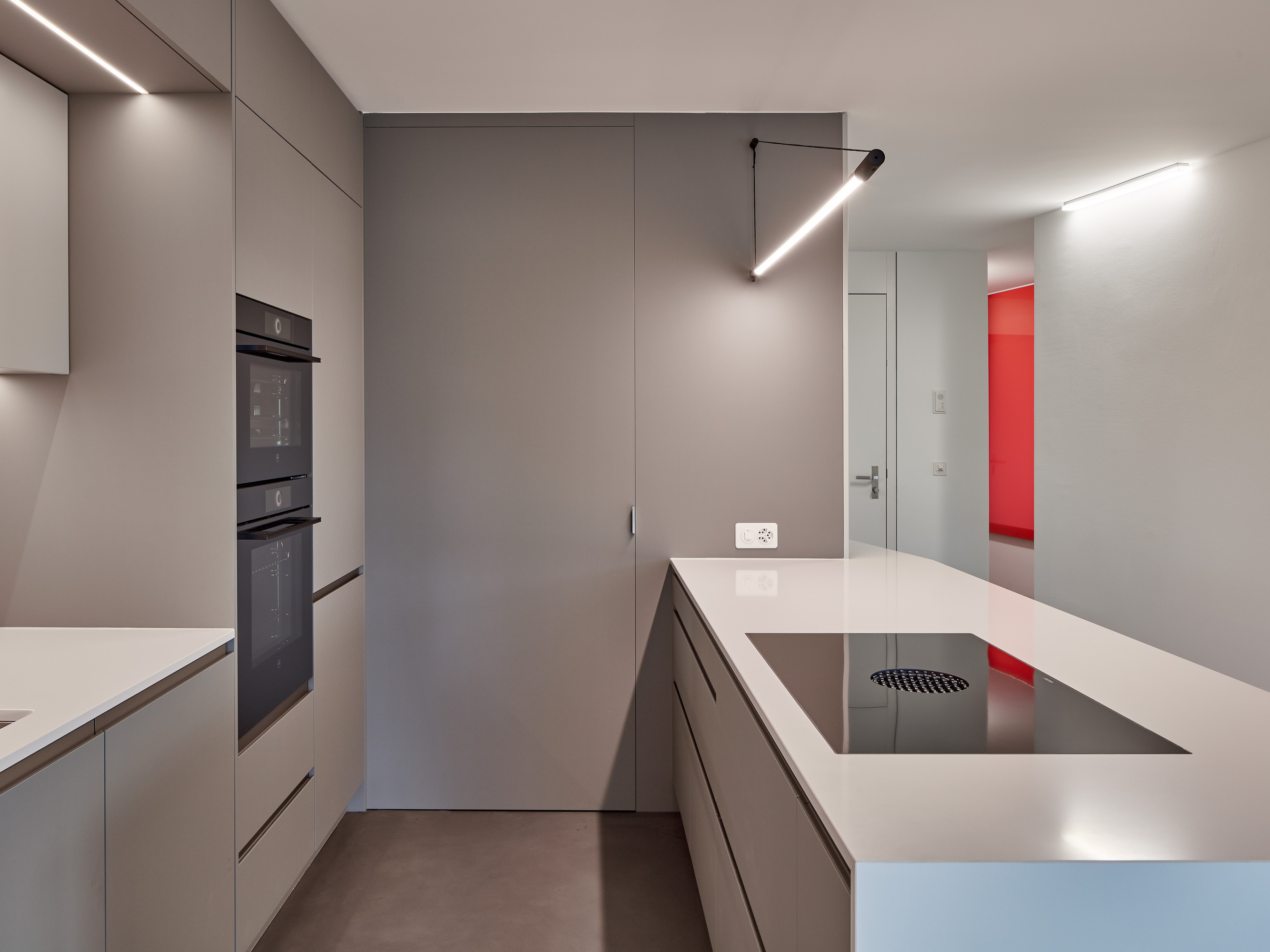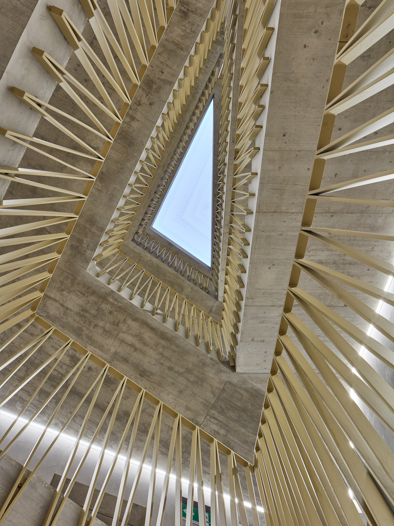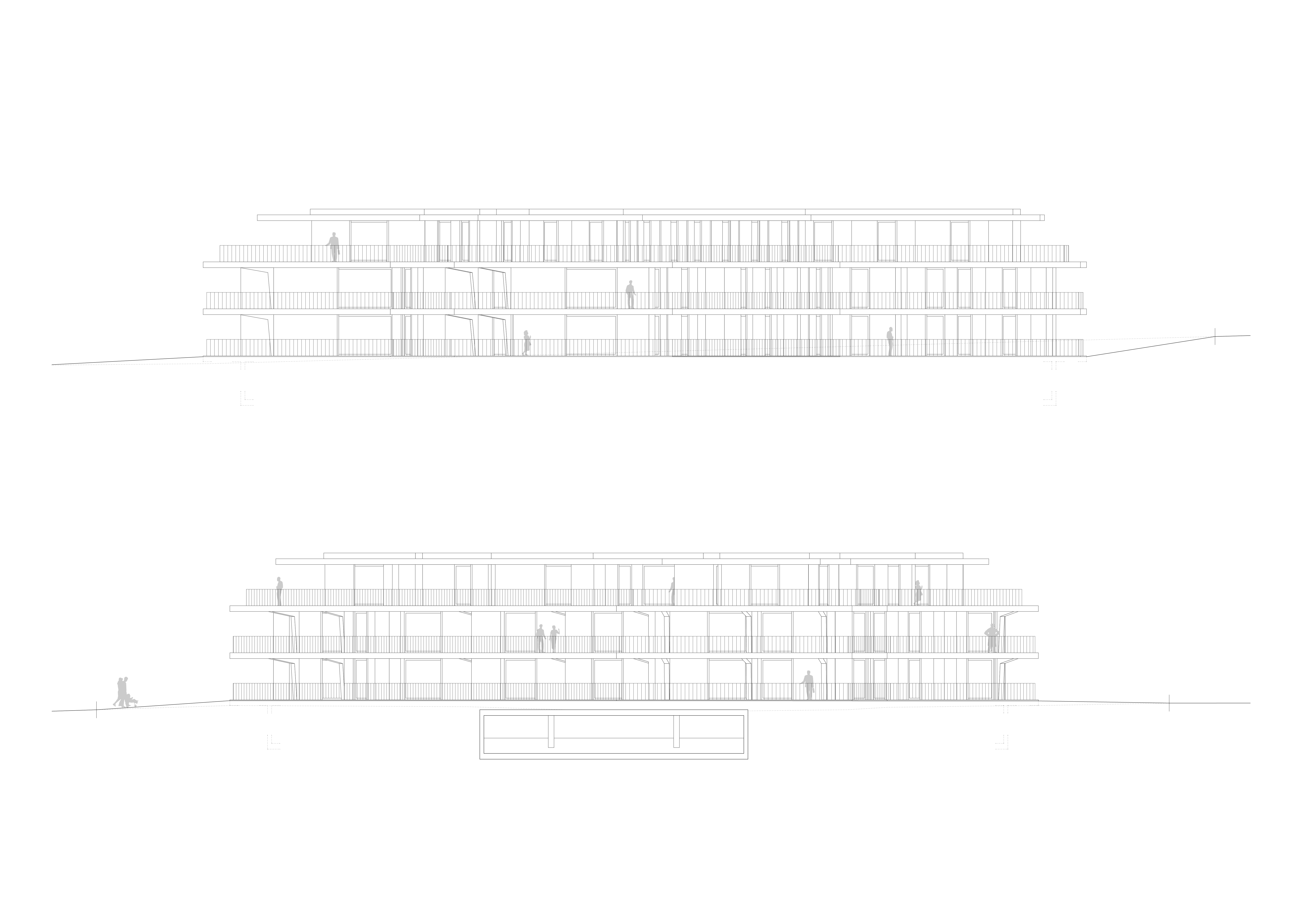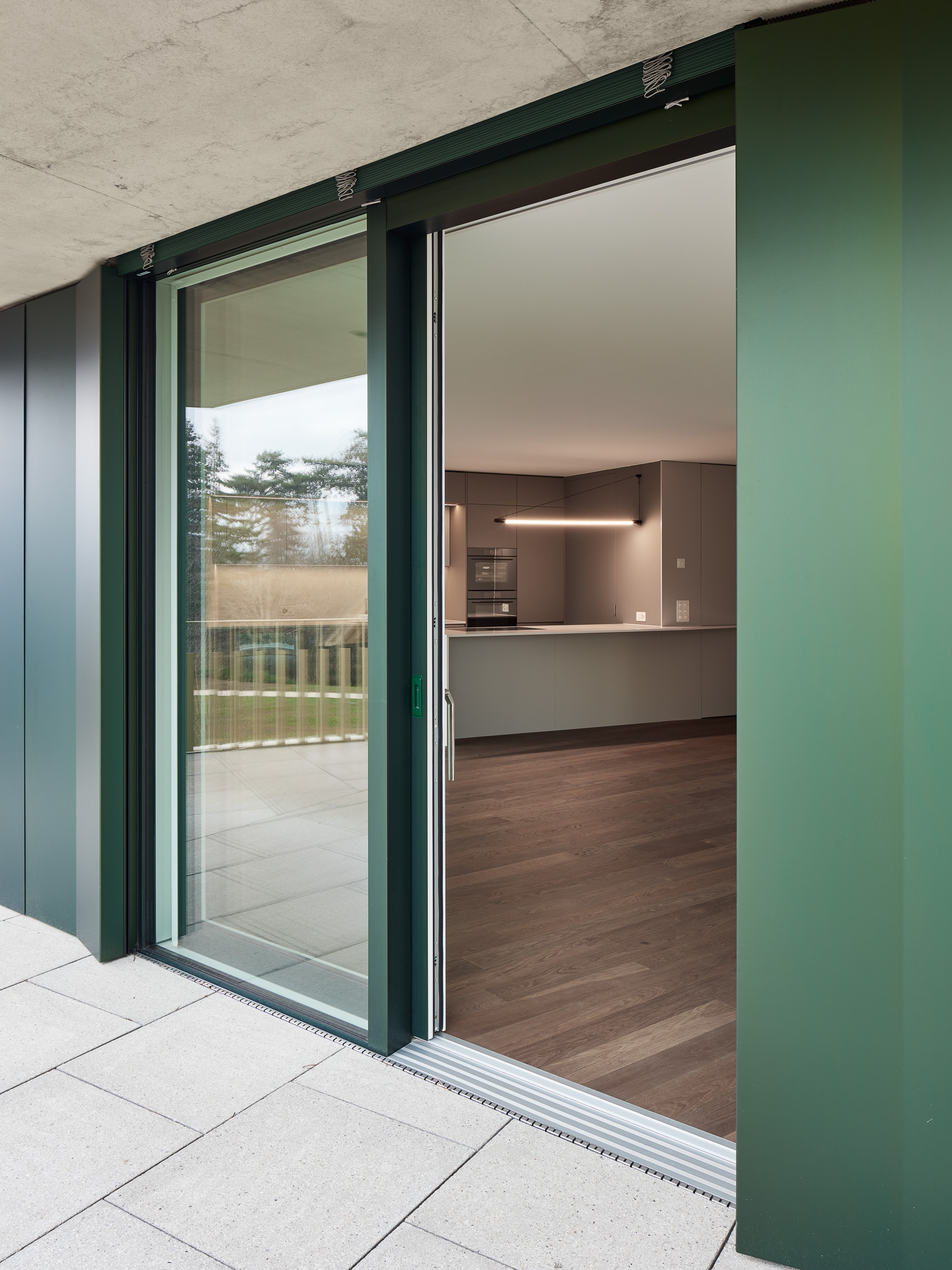 Les deux bâtiments situés au nord de la parcelle sont organisés sur trois niveaux hors sol et un sous-sol. Trois cages d’escaliers, de forme trapézoïdale dictée par les choix morphologiques, distribuent par étage entre deux et cinq appartements. Les typologies d’appartements varient selon leur emplacement, allant de mono-orienté à traversant. Toutes les zones de jour bénéficient d’une double orientation vers le lac, tandis que les espaces de nuit profitent de la lumière douce du nord. Ceinturant les volumes, des dalles en béton offrent de généreux balcons-terrasses, prolongeant vers l’extérieur l’espace d’appropriation des appartements. L’utilisation du béton, laissé apparent dans les cages d’escalier, sur les balcons-coursives, ainsi que son système de poteaux inclinés, dévoile la structure et accentue l'horizontalité de la façade.