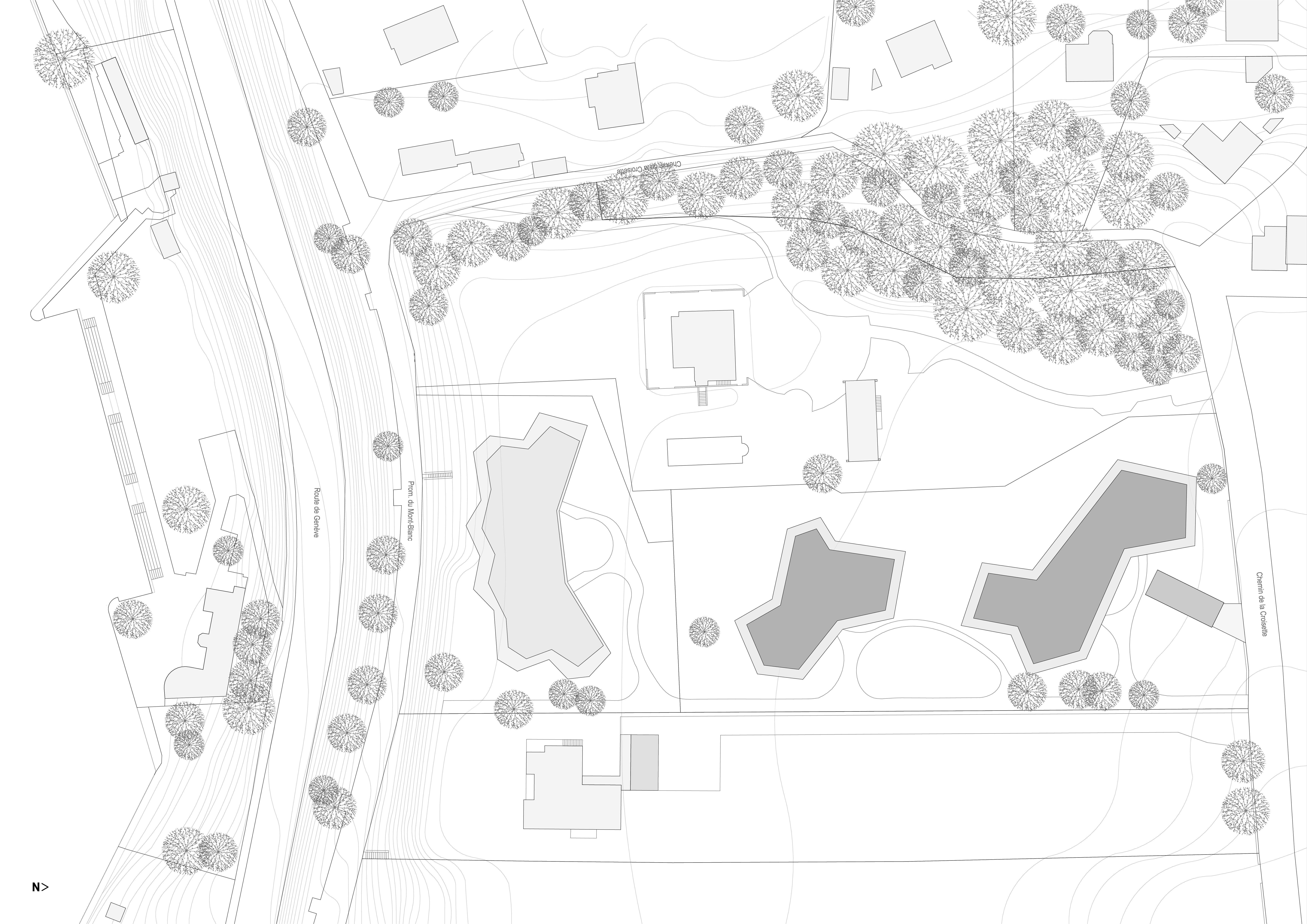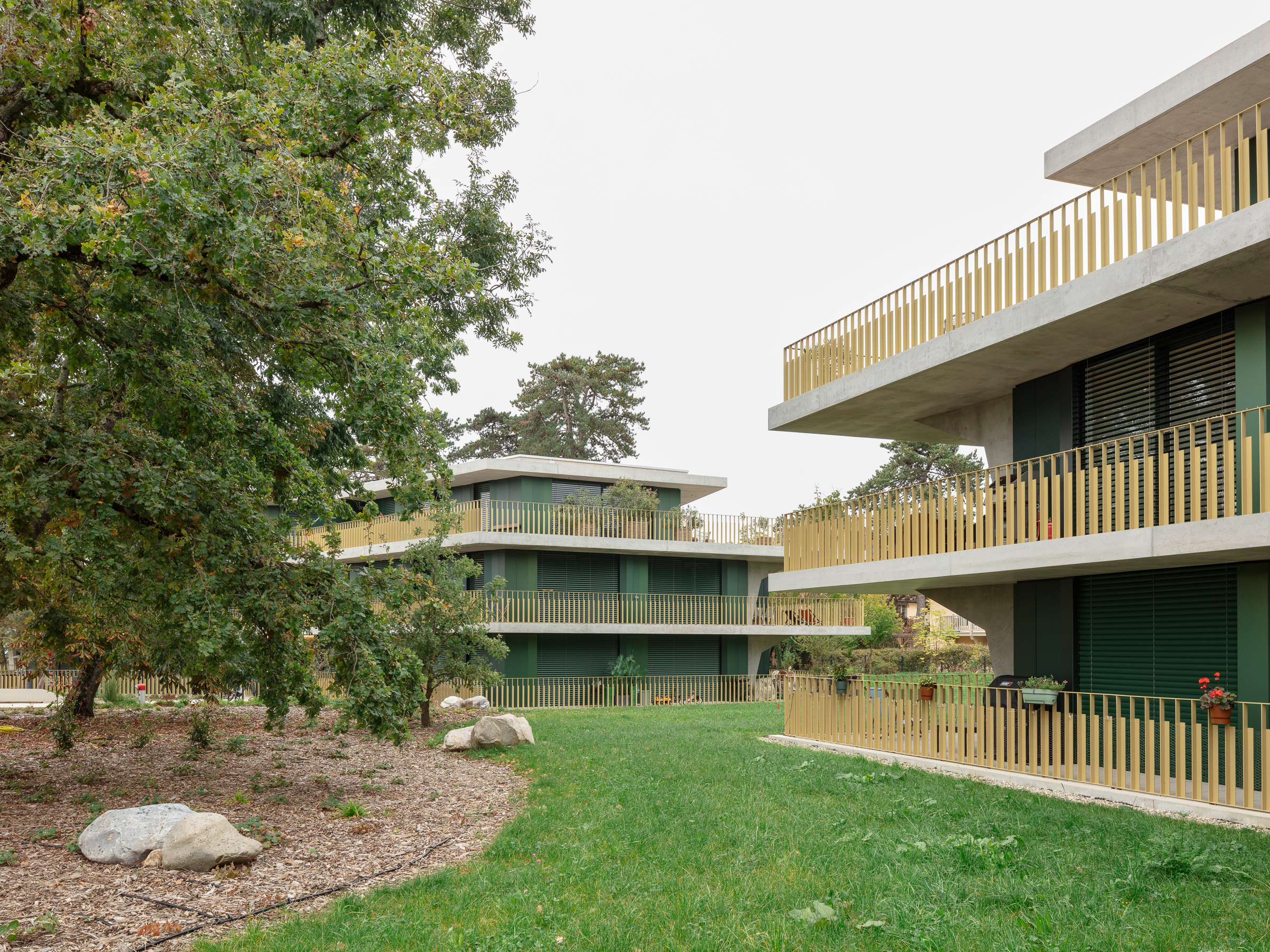 Sur le bord du lac Léman à Nyon, l’ancienne propriété de la maison de maître voisine a été découpée pour laisser place à une nouvelle parcelle en vue d’une densification raisonnable. En collaboration avec le bureau d'architecture Lacroix Chessex, l’aménagement paysager exceptionnel, avec ses arbres majestueux et sa vue imprenable sur le lac, a été au cœur de la conception du plan masse. Trois immeubles ont été soigneusement intégrés au sein de ce cadre naturel, s’articulant avec fluidité entre les arbres et les espaces ouverts. Ces géométries audacieuses maximisent l’ouverture sur le paysage et les vues sur le lac. Ce projet ambitieux accueille 49 nouveaux appartements en PPE.