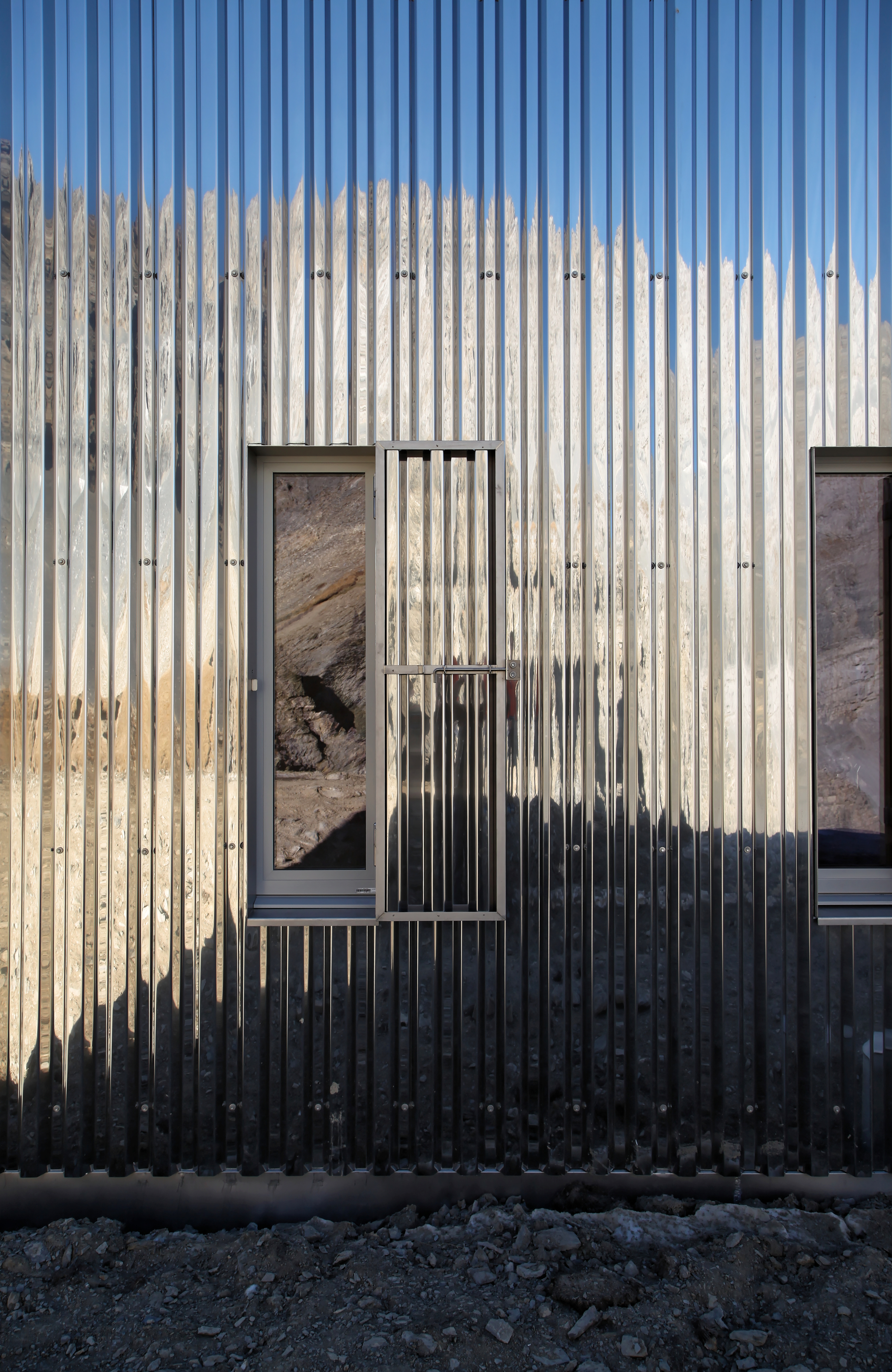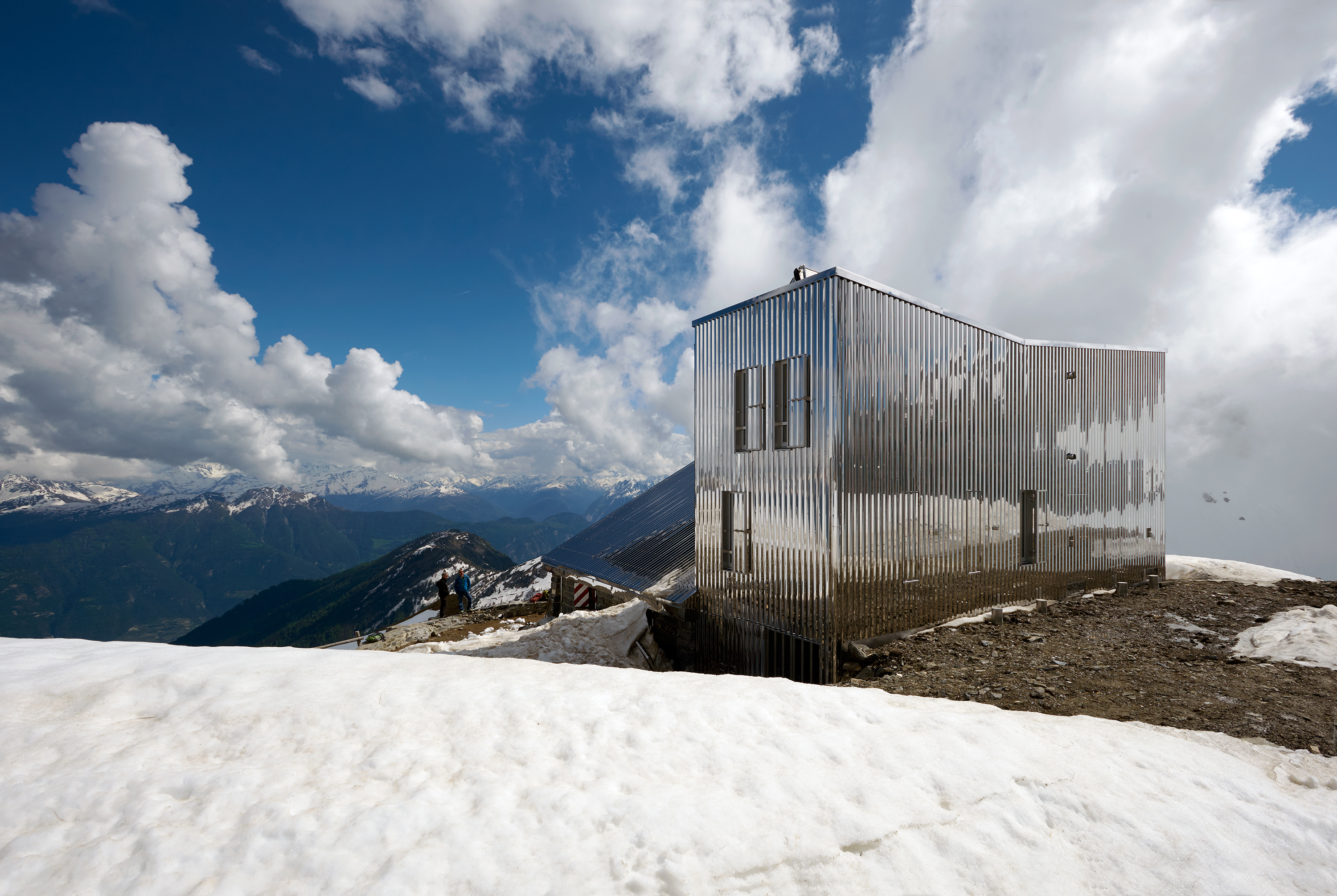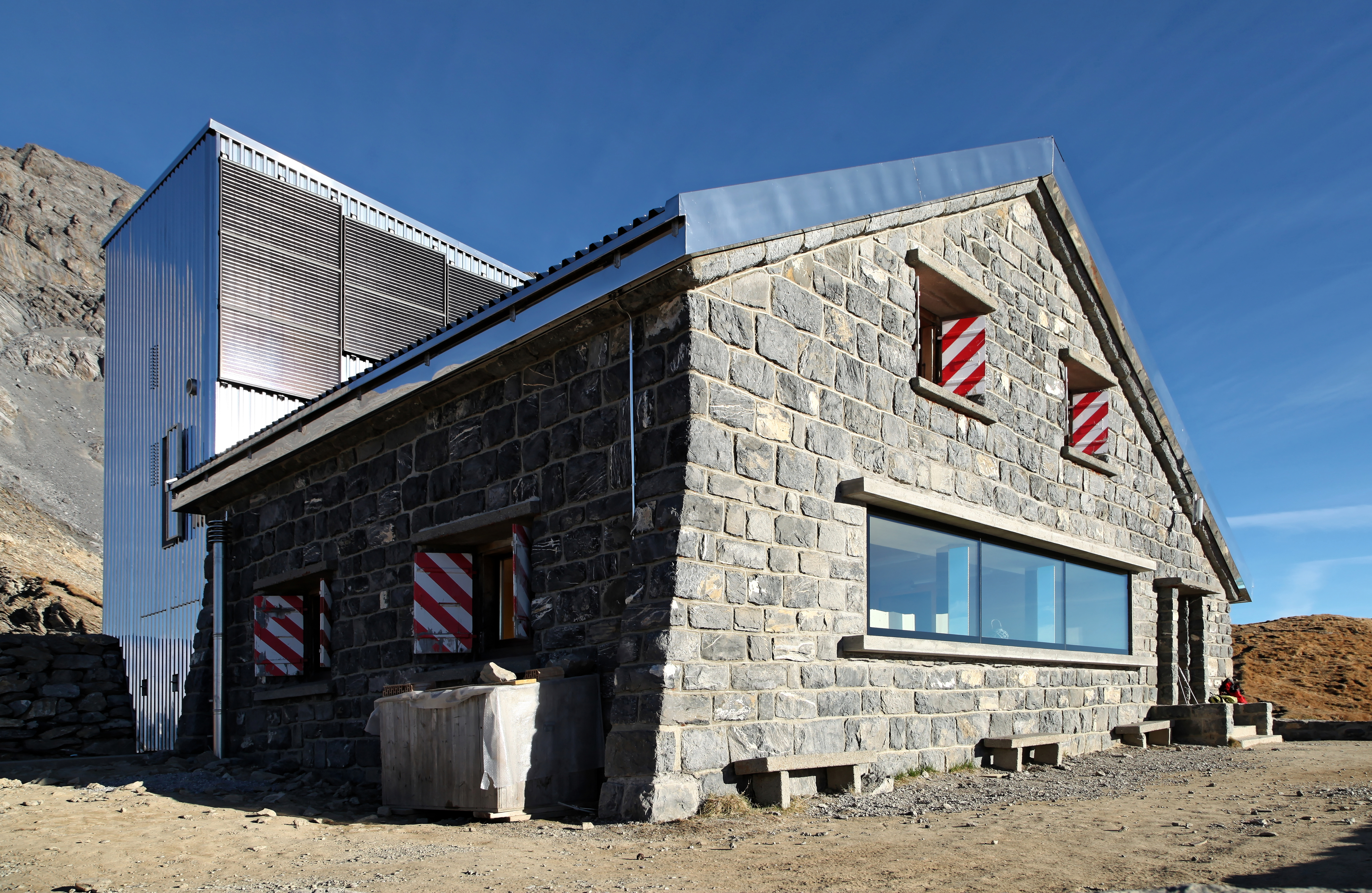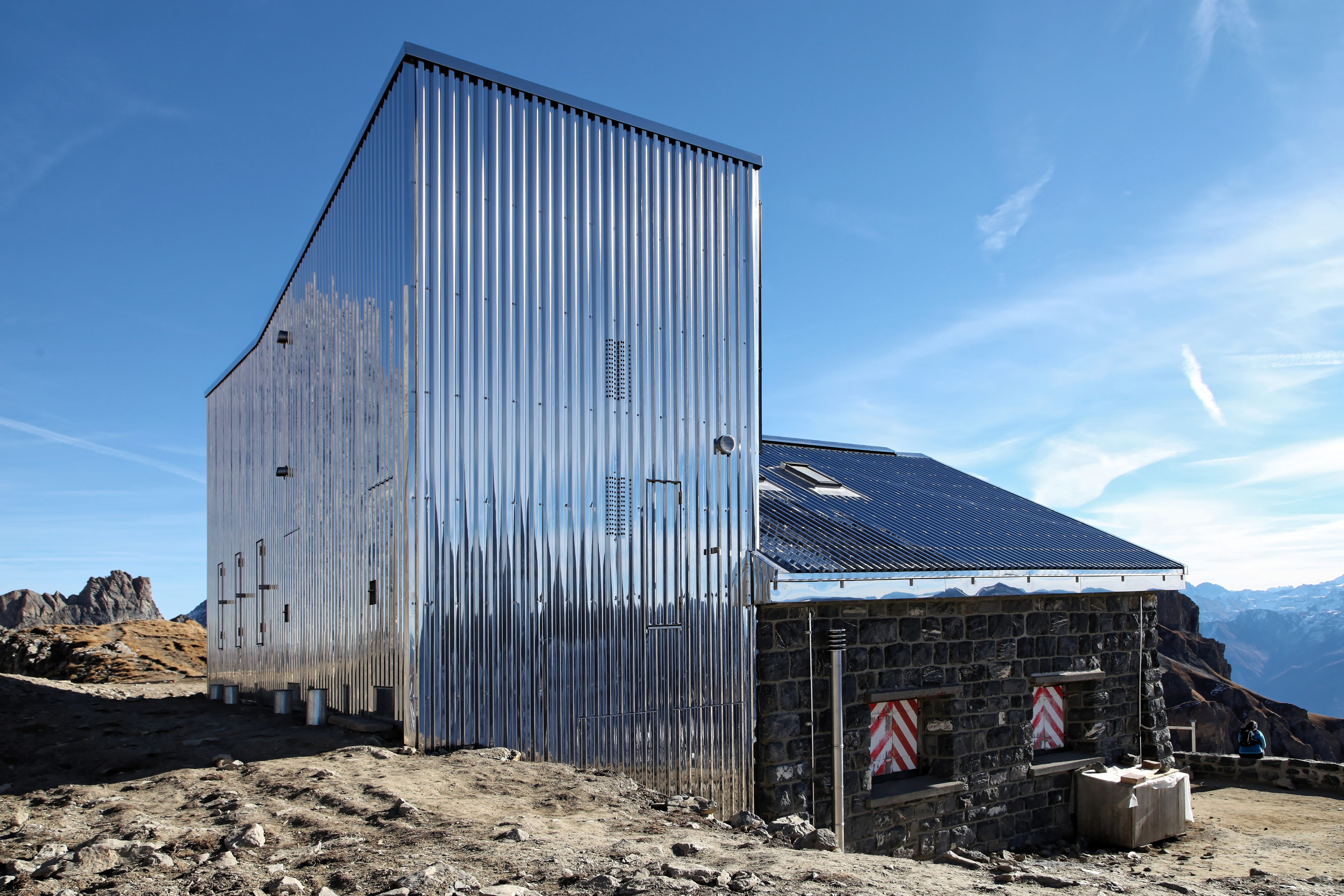Un bardage en tôle inox profilée et polie recouvre les deux toits et enveloppe l’extension sur toutes ses faces, englobant les portes et les volets. Sa toiture sert au captage de l’eau, récoltée dans des citernes logées au niveau supérieur. La nouvelle annexe supporte les panneaux solaires thermiques et photovoltaïques assurant l’autonomie énergétique. Les toilettes sèches répondent aux exigences environnementales. Les différents choix constructifs et les diverses options pour les installations sont dictés par les impératifs d’une réalisation en haute montagne par héliportage et devant résister à des contraintes climatiques extrêmes.