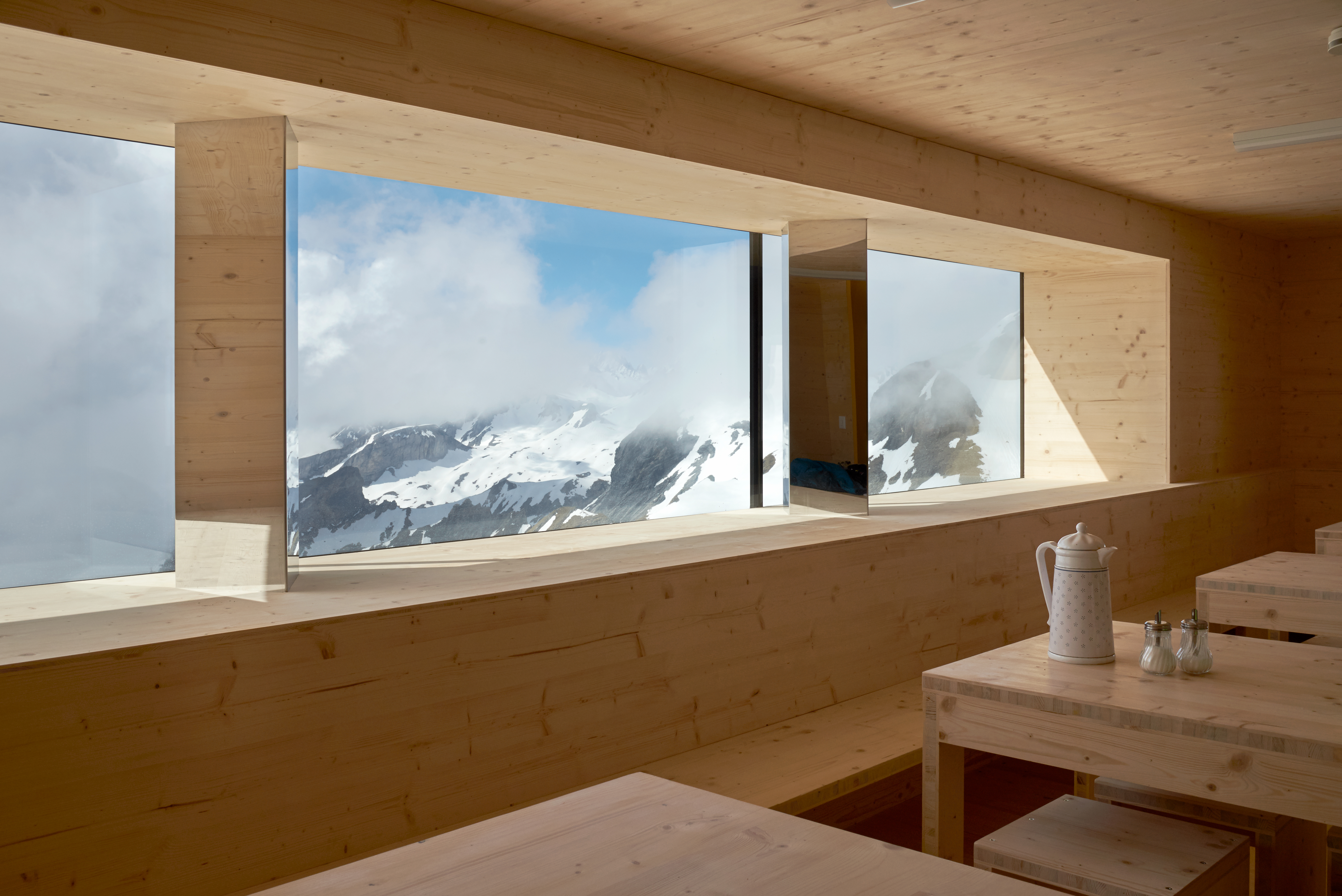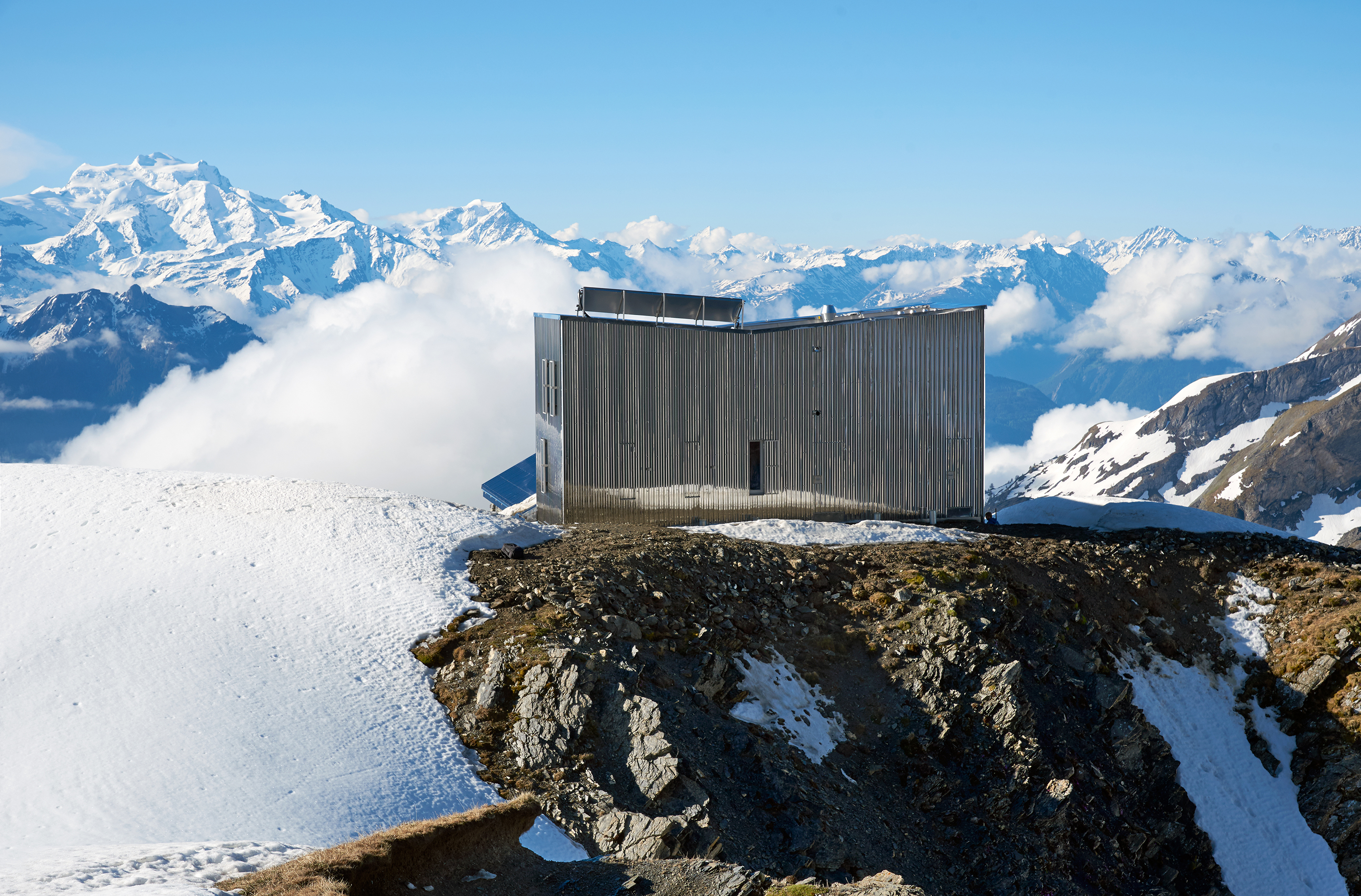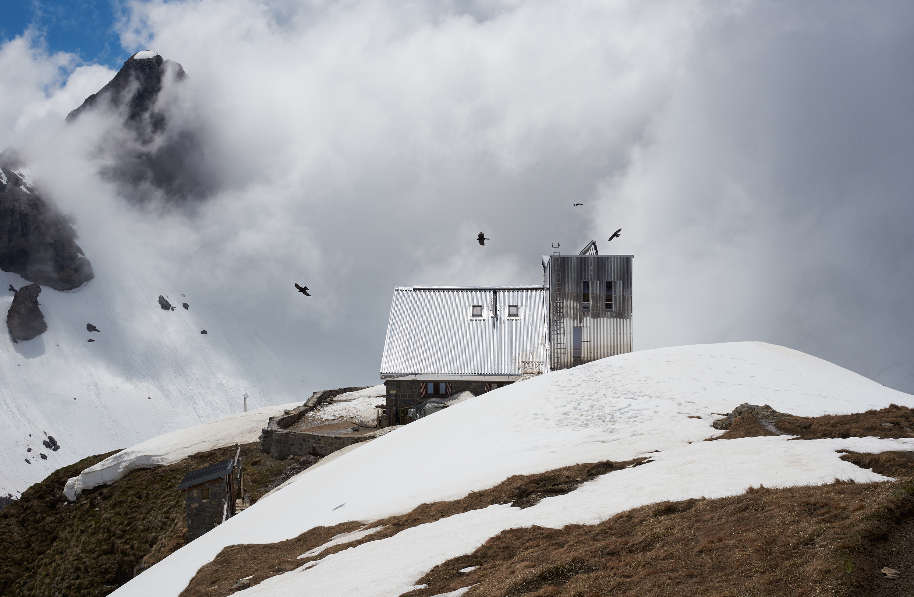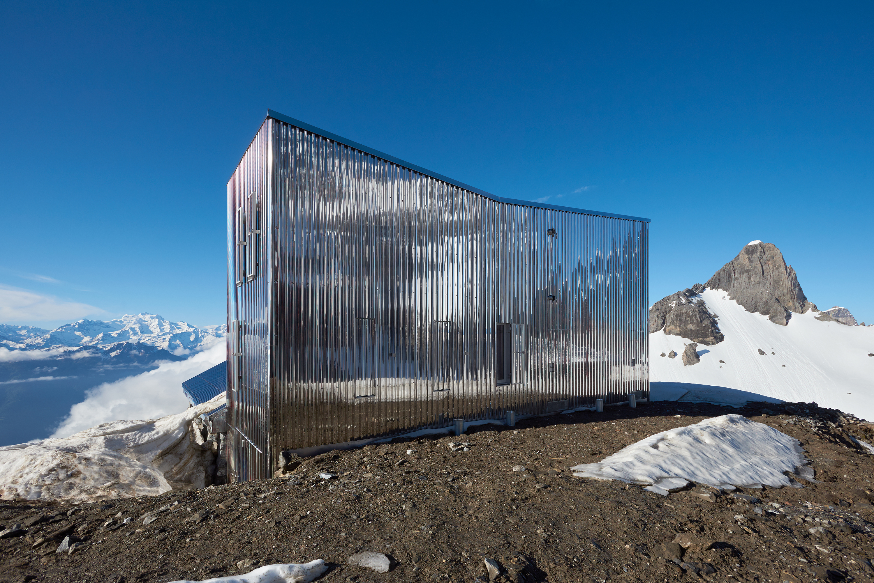 Un bardage en tôle inox profilée et polie recouvre les deux toits et enveloppe l’extension sur toutes ses faces, englobant les portes et les volets. Sa toiture sert au captage de l’eau, récoltée dans des citernes logées au niveau supérieur. La nouvelle annexe supporte les panneaux solaires thermiques et photovoltaïques assurant l’autonomie énergétique. Les toilettes sèches répondent aux exigences environnementales. Les différents choix constructifs et les diverses options pour les installations sont dictés par les impératifs d’une réalisation en haute montagne par héliportage et devant résister à des contraintes climatiques extrêmes.
