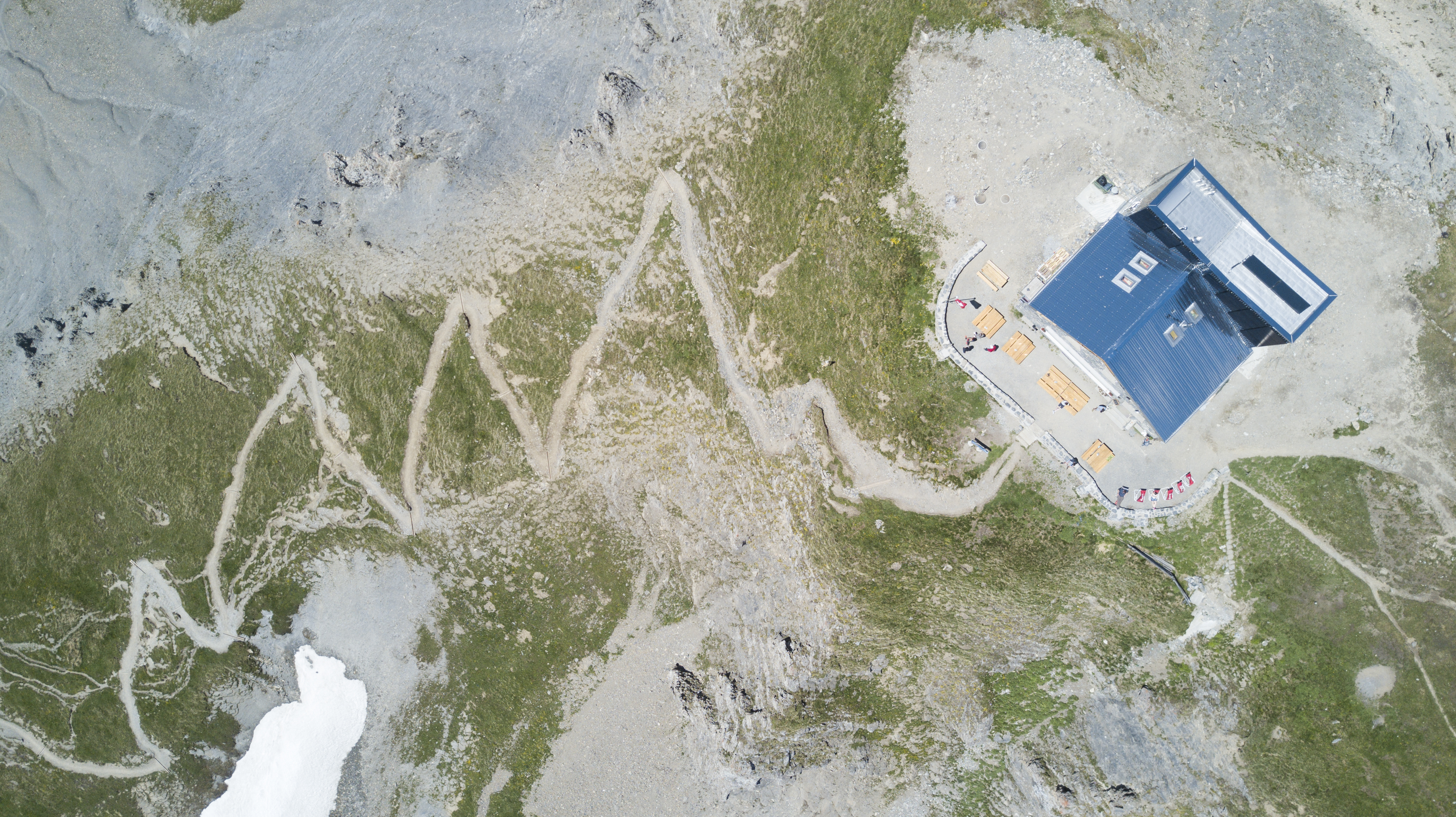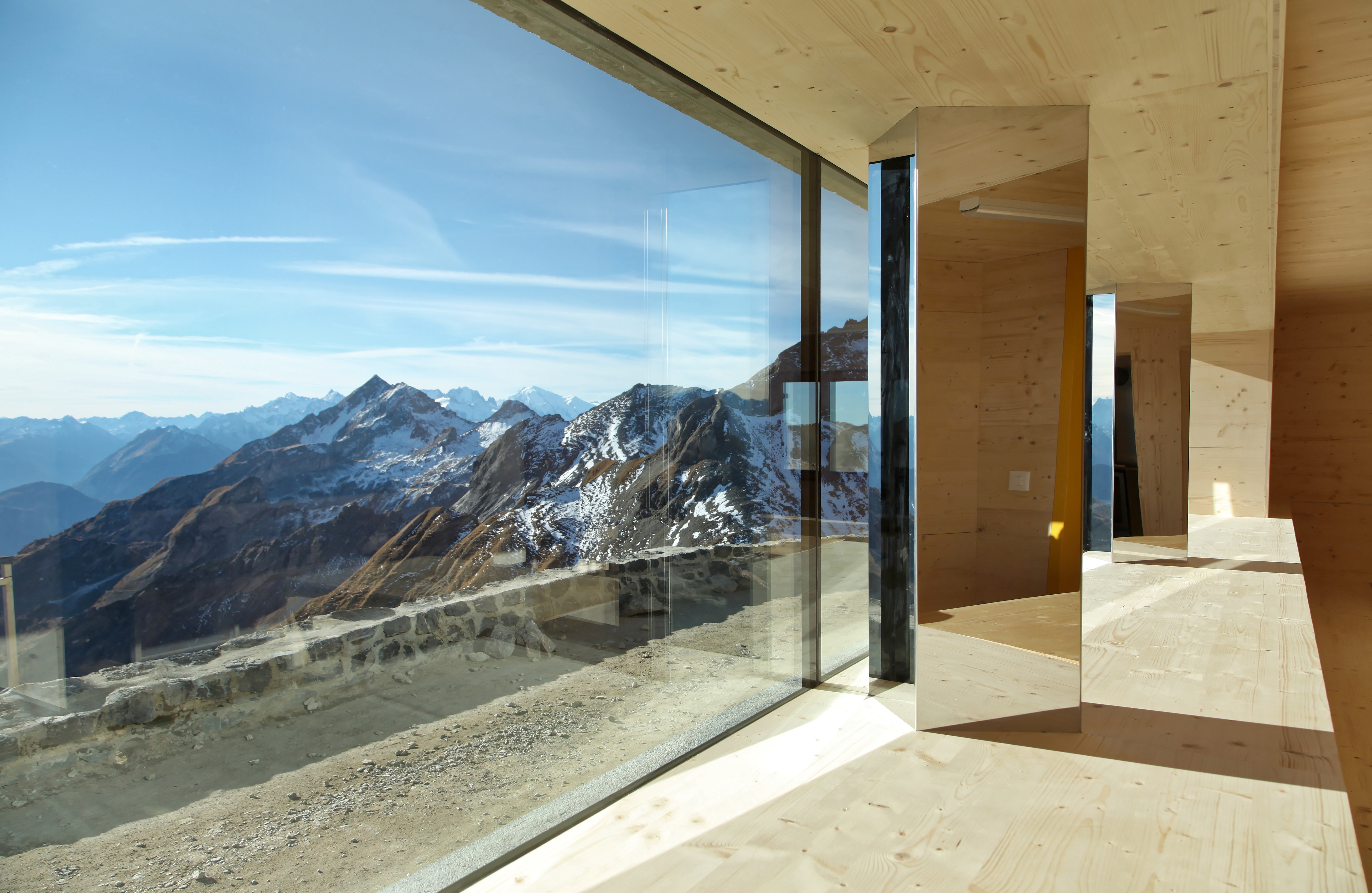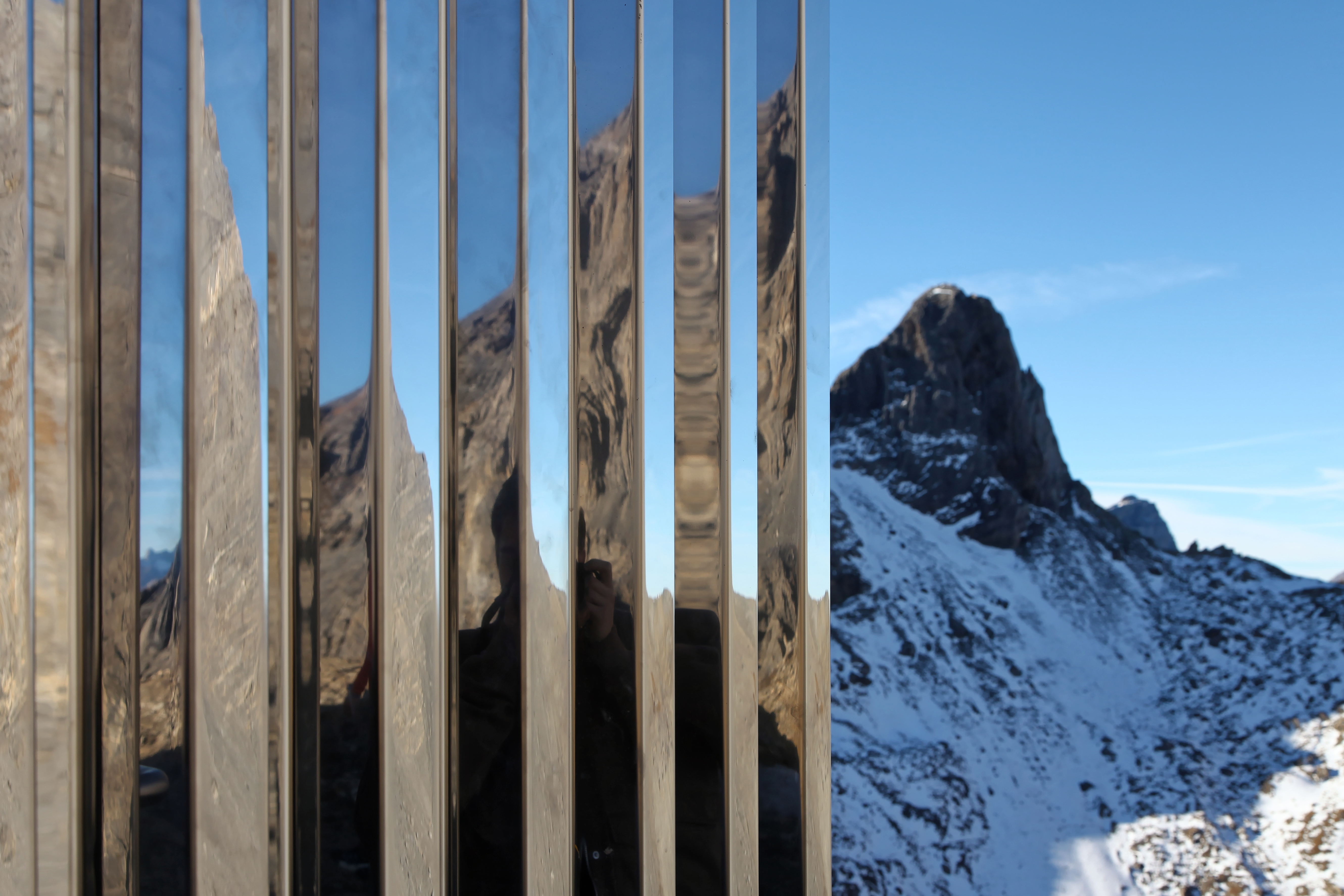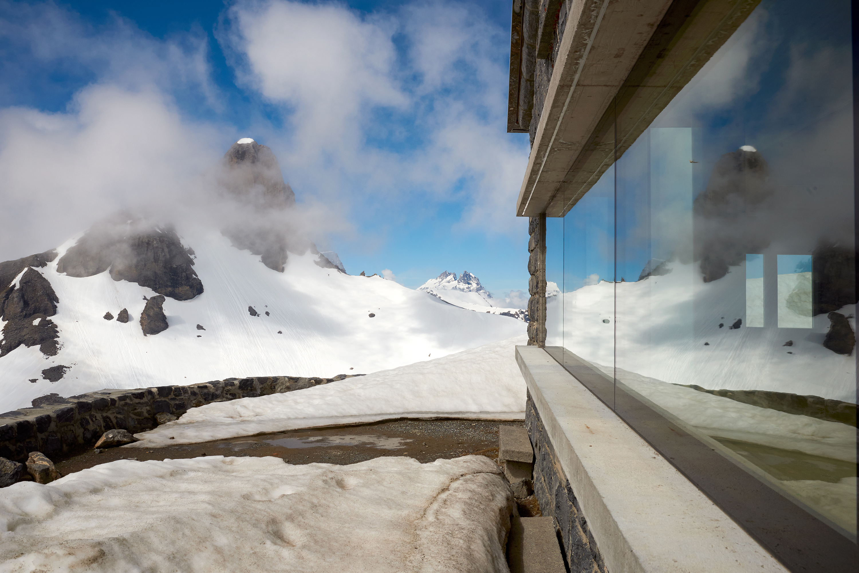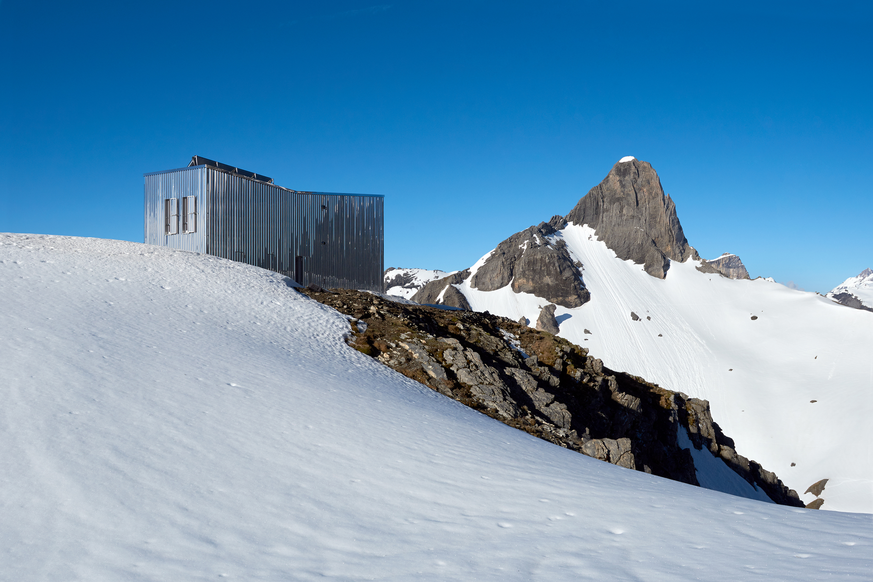 Un bardage en tôle inox profilée et polie recouvre les deux toits et enveloppe l’extension sur toutes ses faces, englobant les portes et les volets. Sa toiture sert au captage de l’eau, récoltée dans des citernes logées au niveau supérieur. La nouvelle annexe supporte les panneaux solaires thermiques et photovoltaïques assurant l’autonomie énergétique. Les toilettes sèches répondent aux exigences environnementales. Les différents choix constructifs et les diverses options pour les installations sont dictés par les impératifs d’une réalisation en haute montagne par héliportage et devant résister à des contraintes climatiques extrêmes.