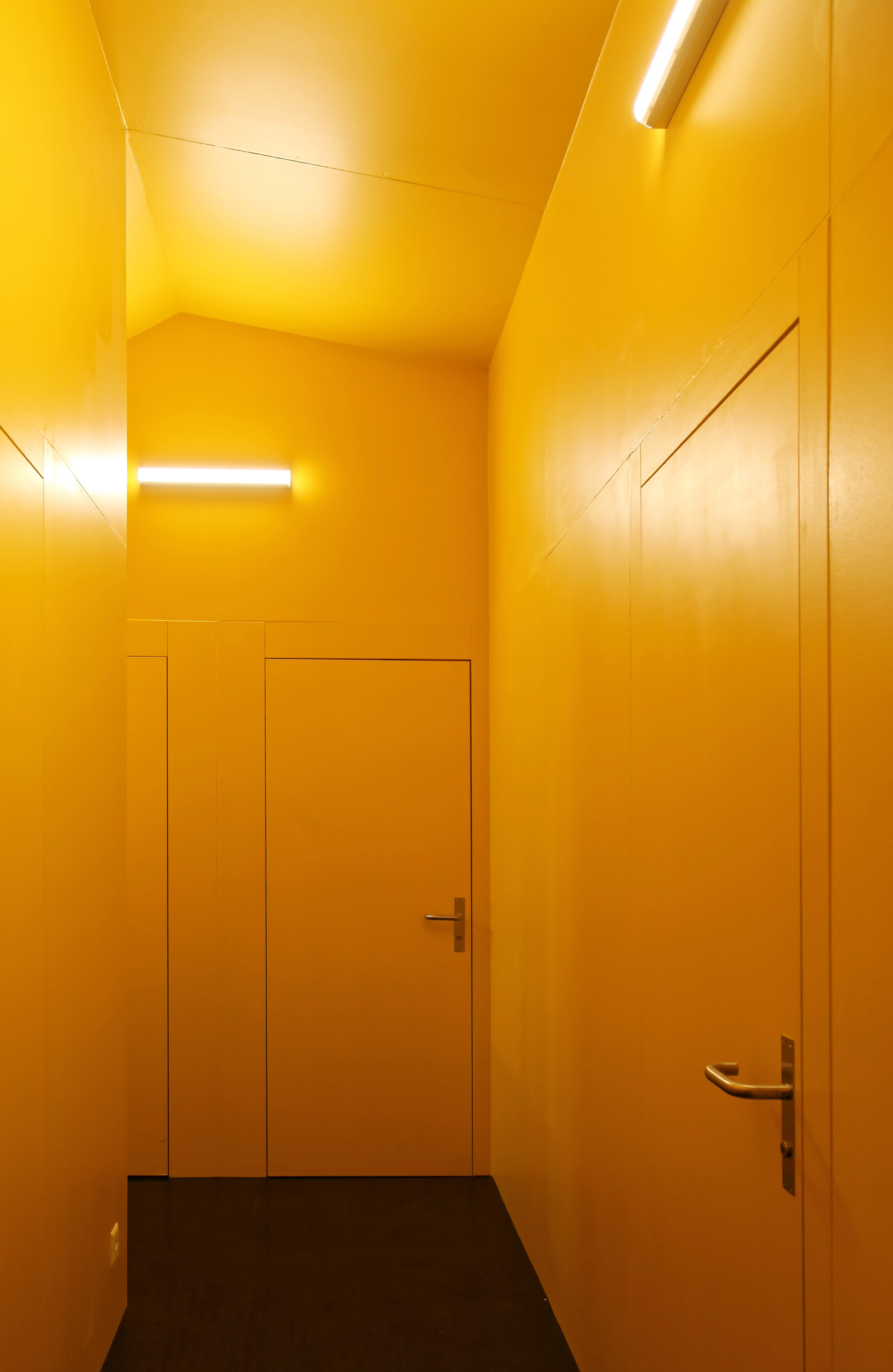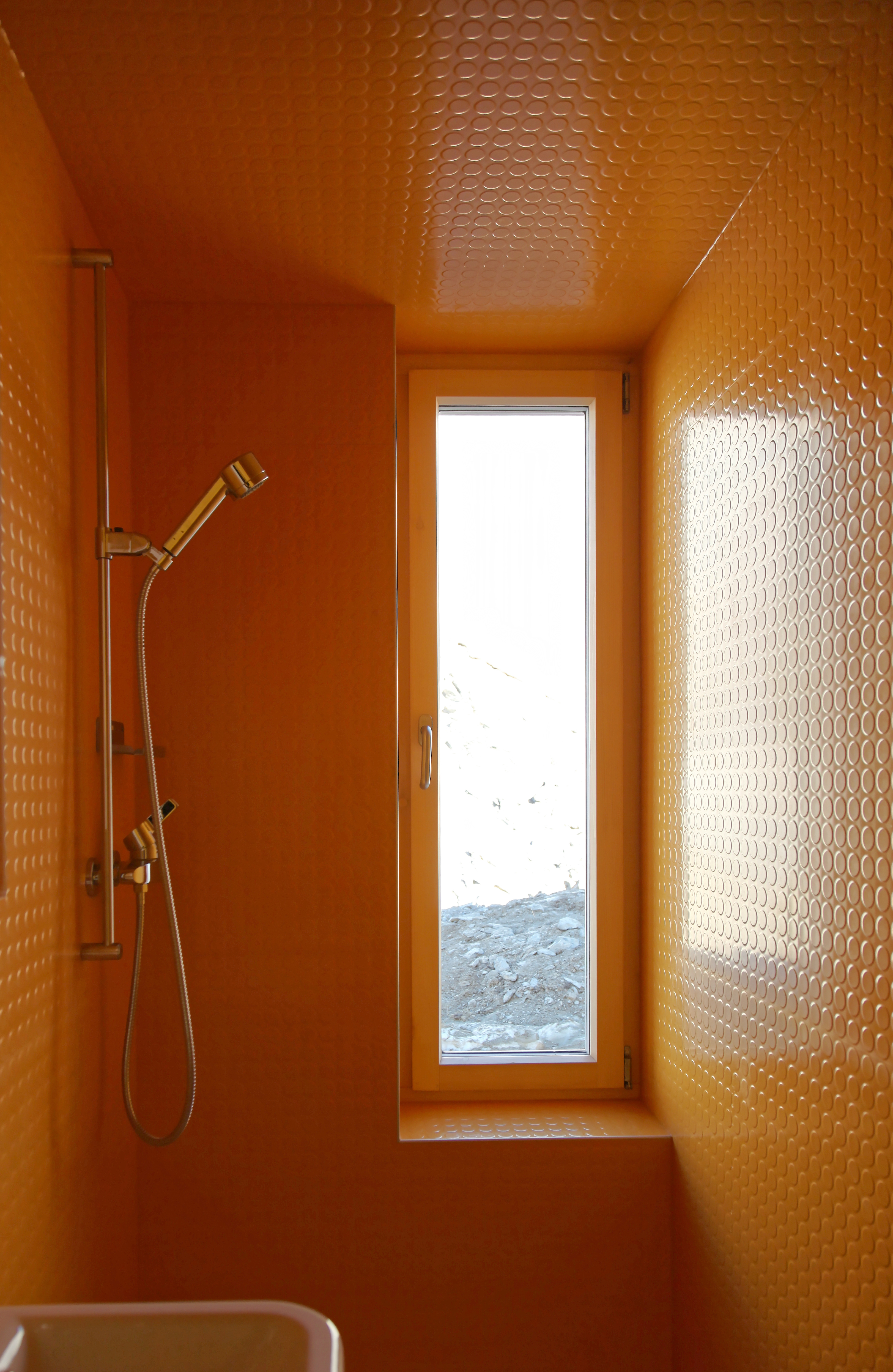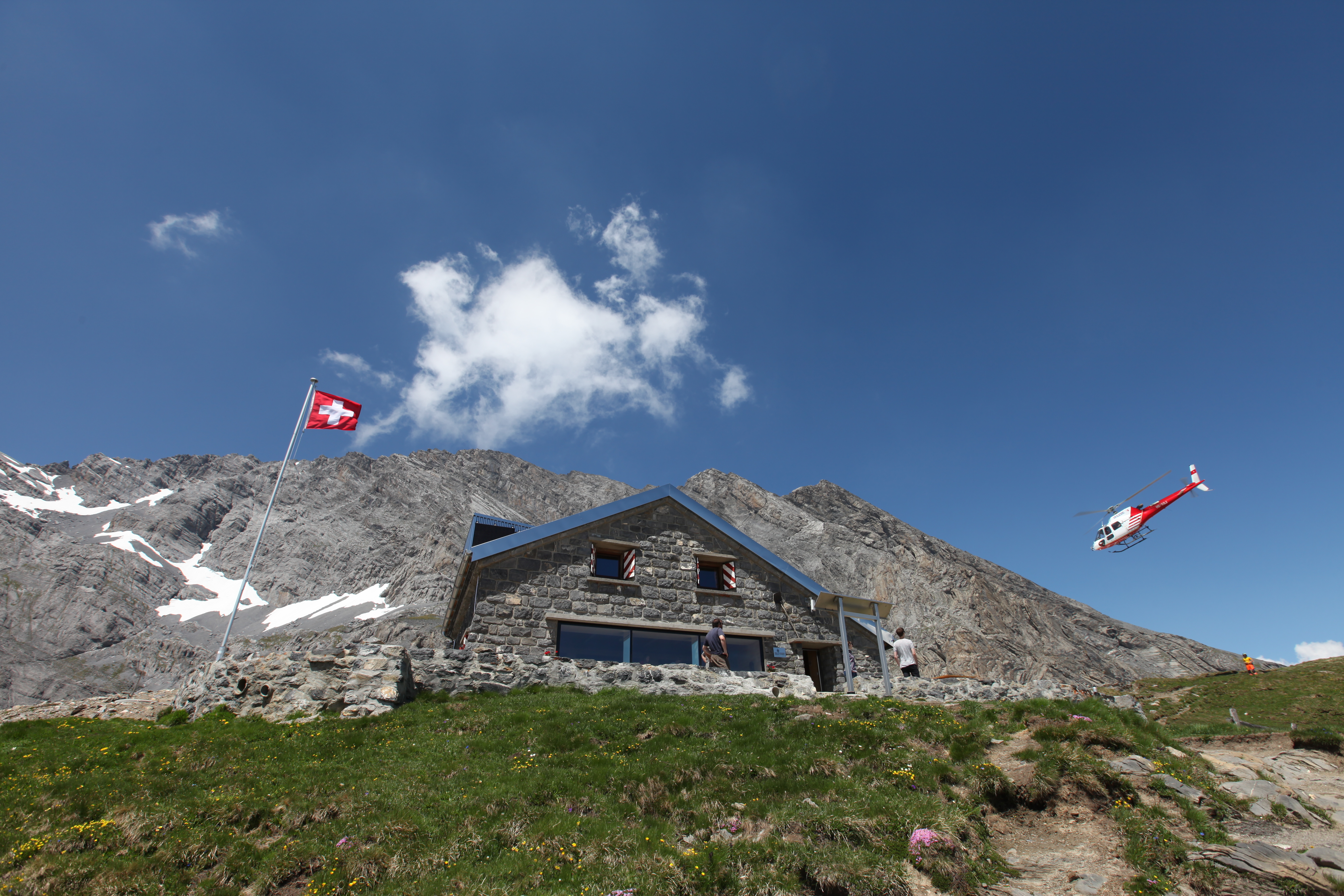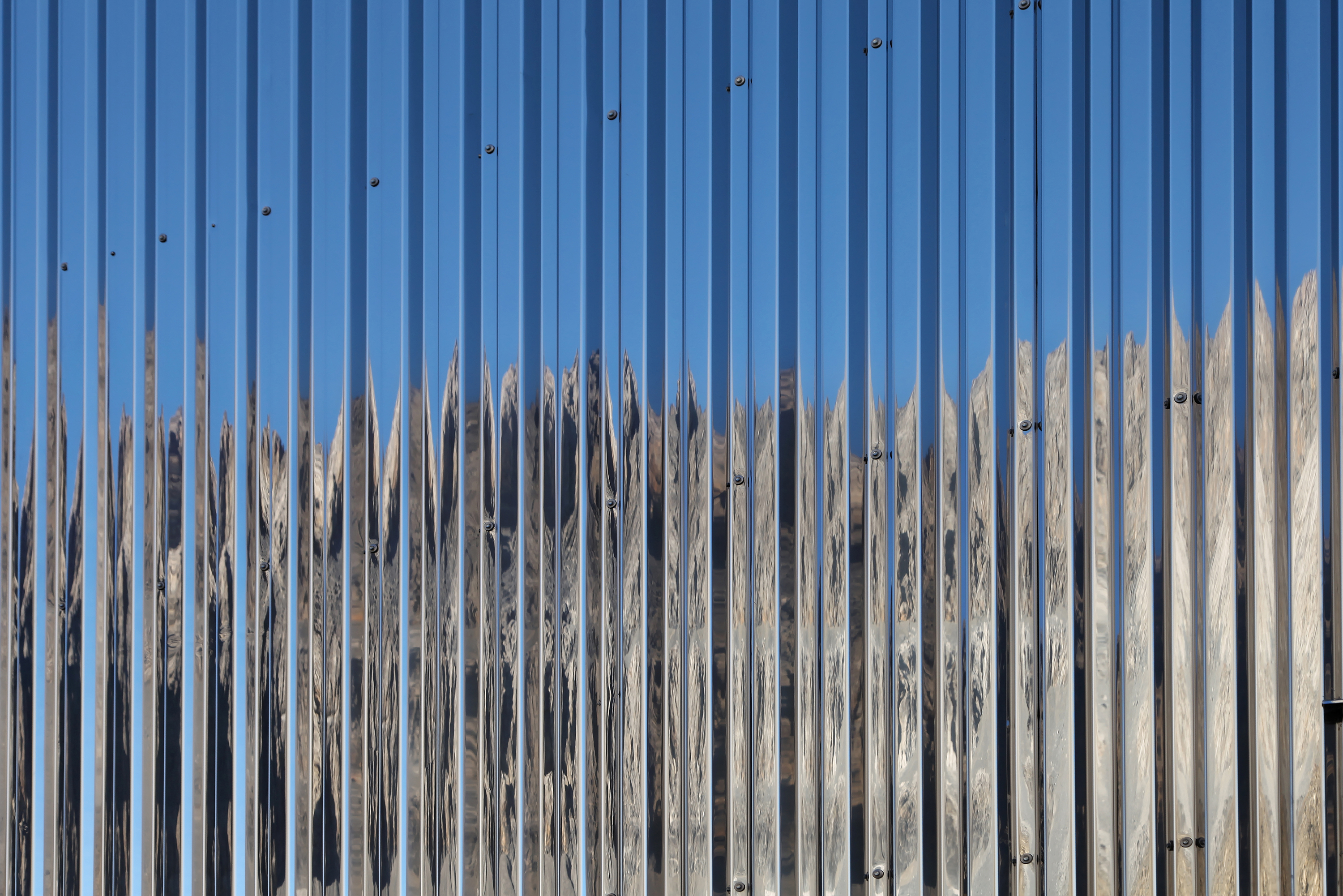 Un bardage en tôle inox profilée et polie recouvre les deux toits et enveloppe l’extension sur toutes ses faces, englobant les portes et les volets. Sa toiture sert au captage de l’eau, récoltée dans des citernes logées au niveau supérieur. La nouvelle annexe supporte les panneaux solaires thermiques et photovoltaïques assurant l’autonomie énergétique. Les toilettes sèches répondent aux exigences environnementales. Les différents choix constructifs et les diverses options pour les installations sont dictés par les impératifs d’une réalisation en haute montagne par héliportage et devant résister à des contraintes climatiques extrêmes.