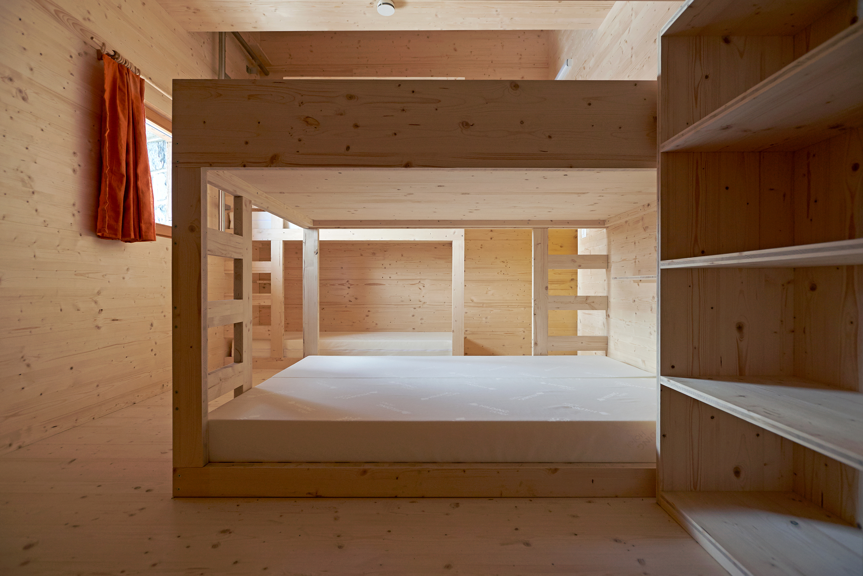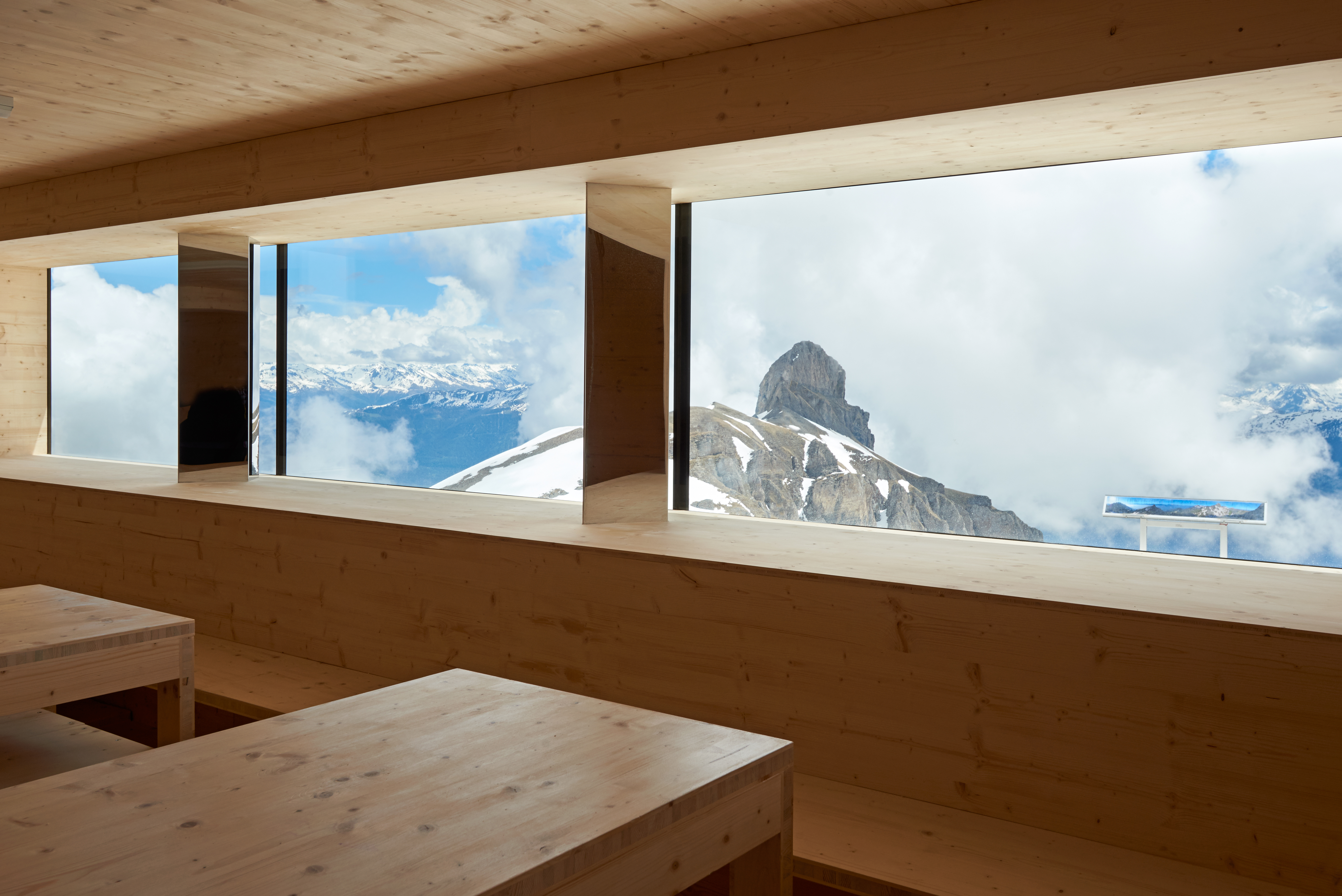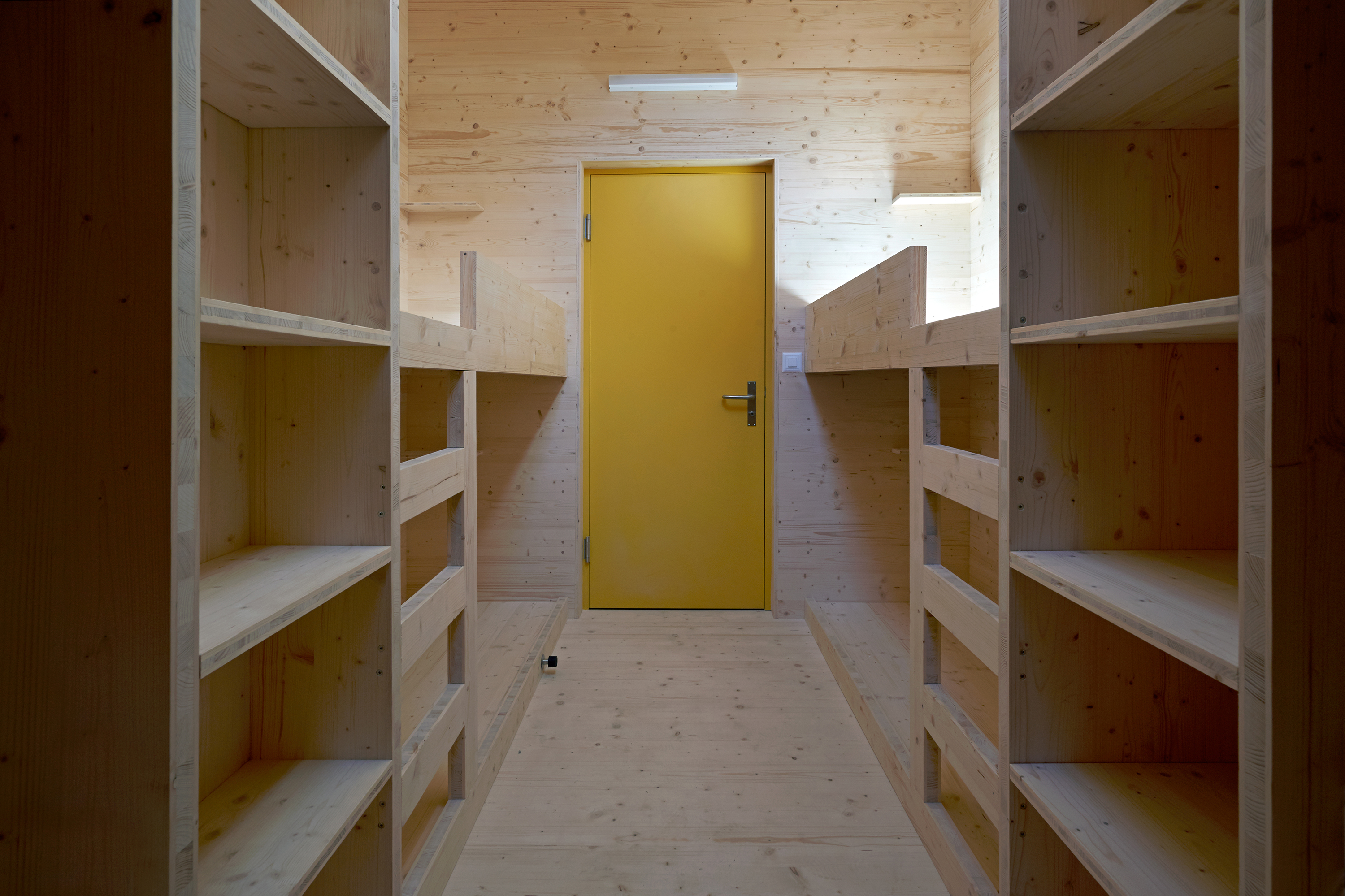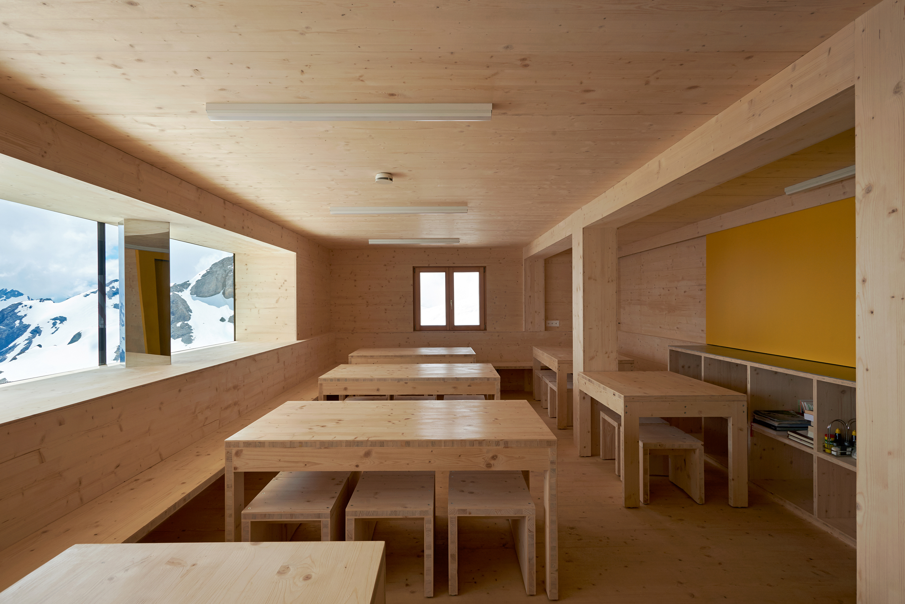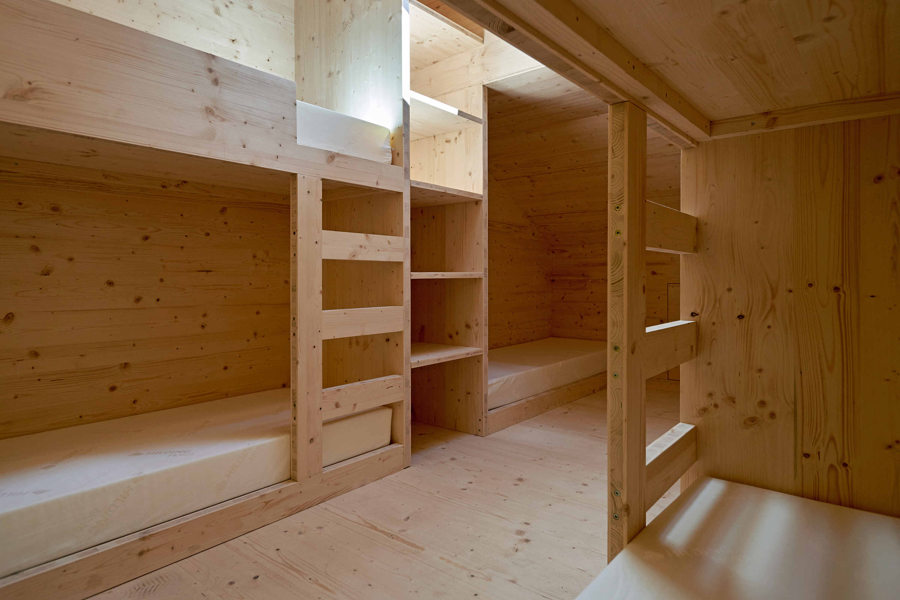 Le réaménagement de l’ancienne cabane permet d’améliorer l’isolation thermique et de renouveler les revêtements en panneaux sapin. Les dortoirs sont réorganisés en lits indépendants pour une meilleure intimité. Le réfectoire est ouvert sur le panorama alpin, par la création d’une grande fenêtre horizontale obtenue par la réunion des trois petites fenêtres existantes, seule intervention contemporaine sur la modénature des façades en pierre.